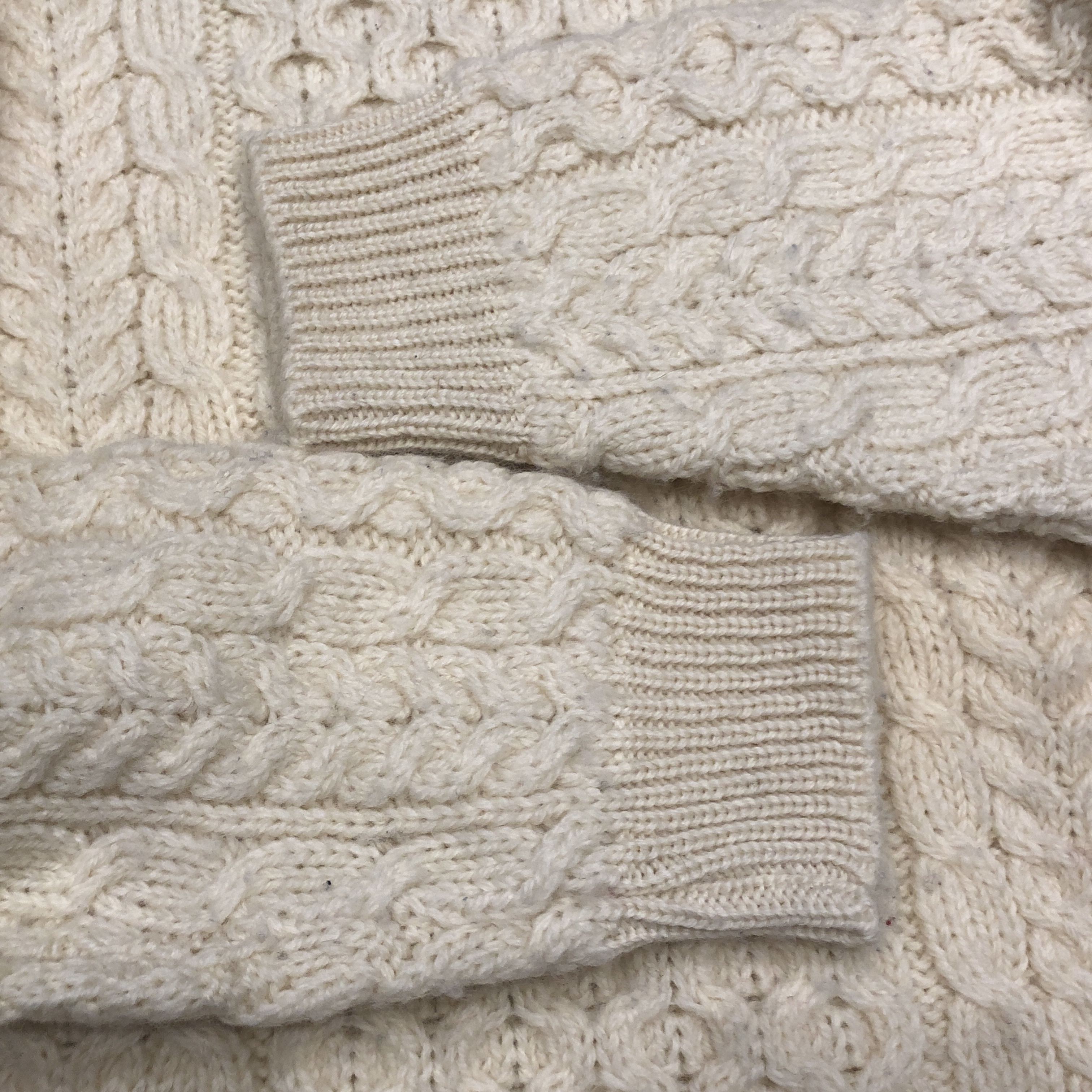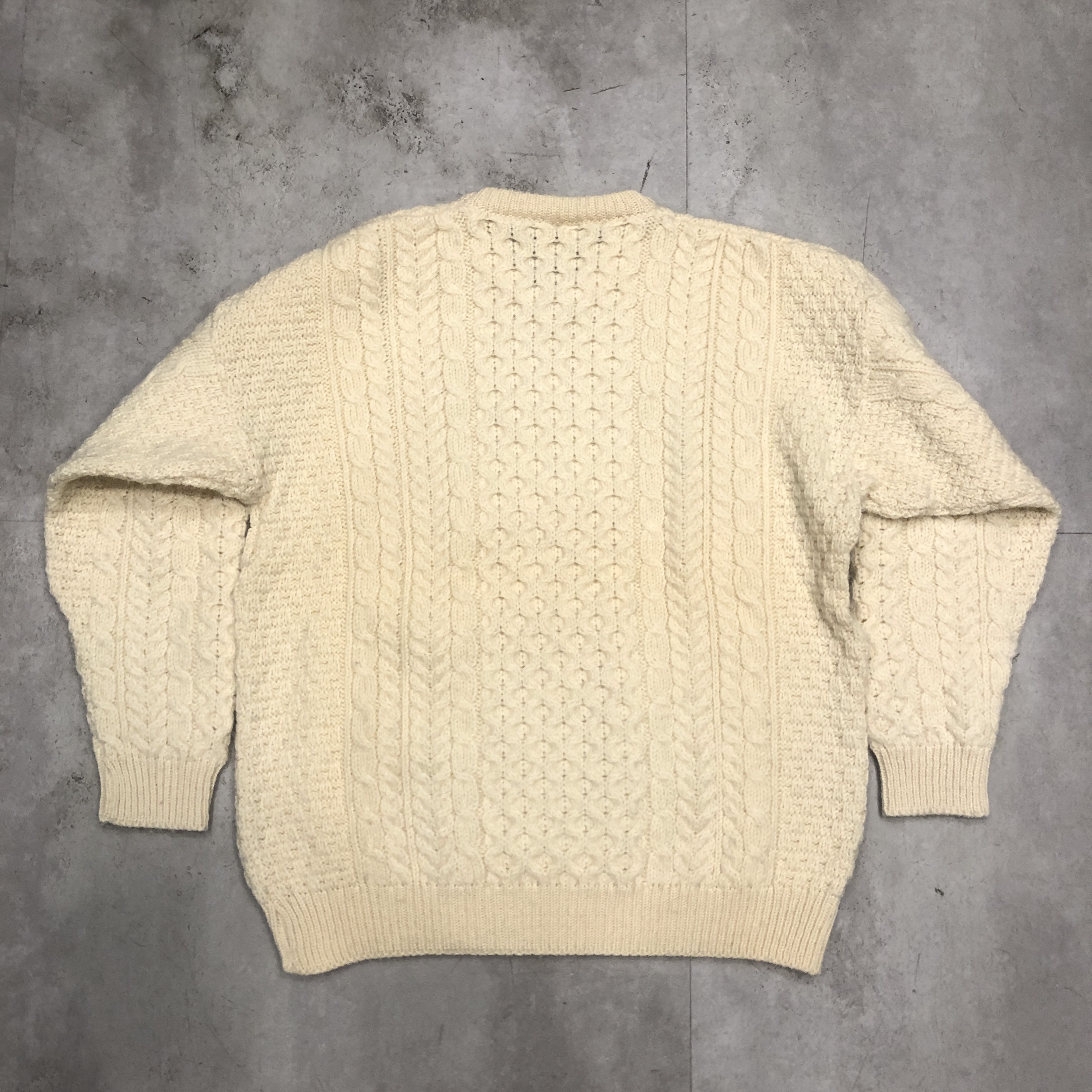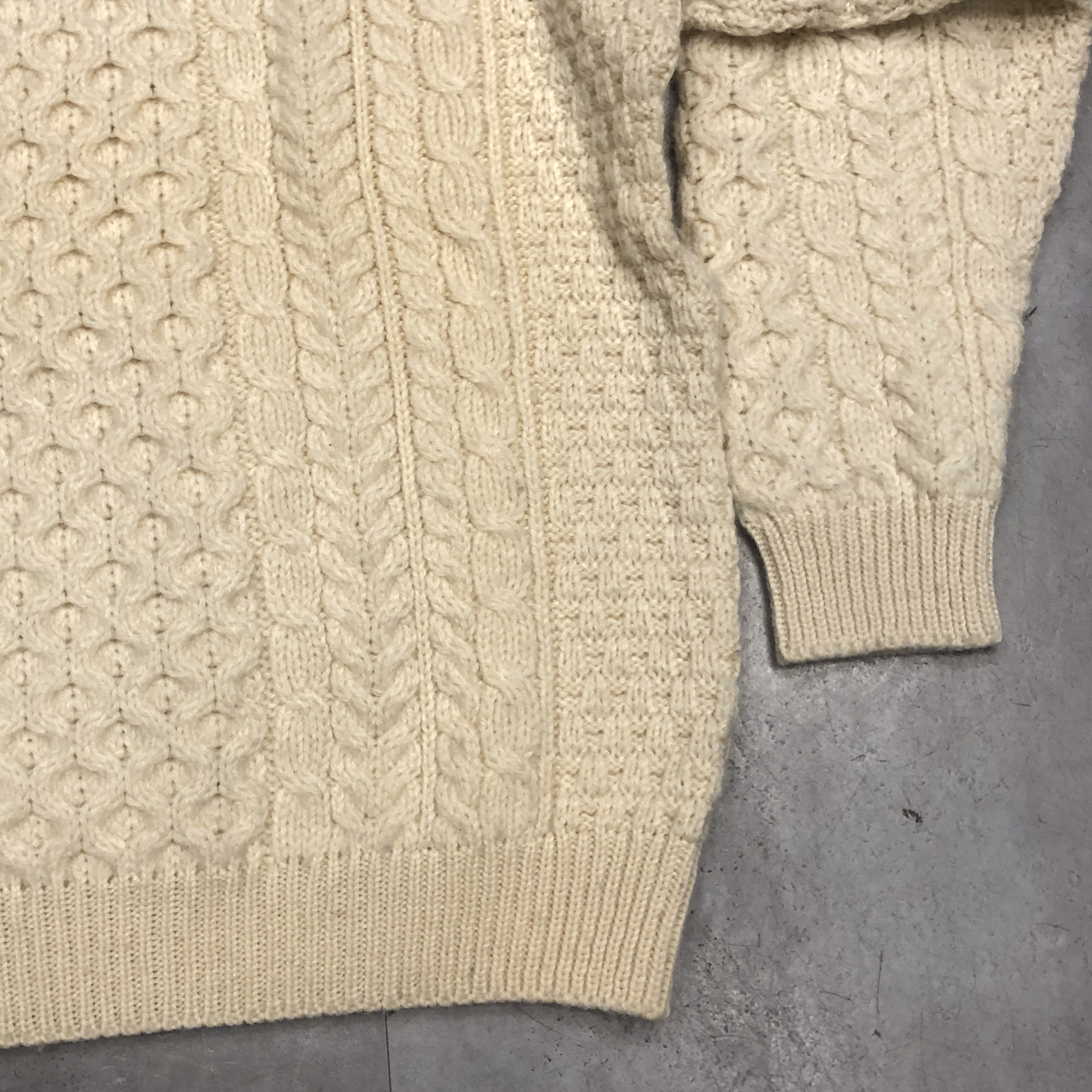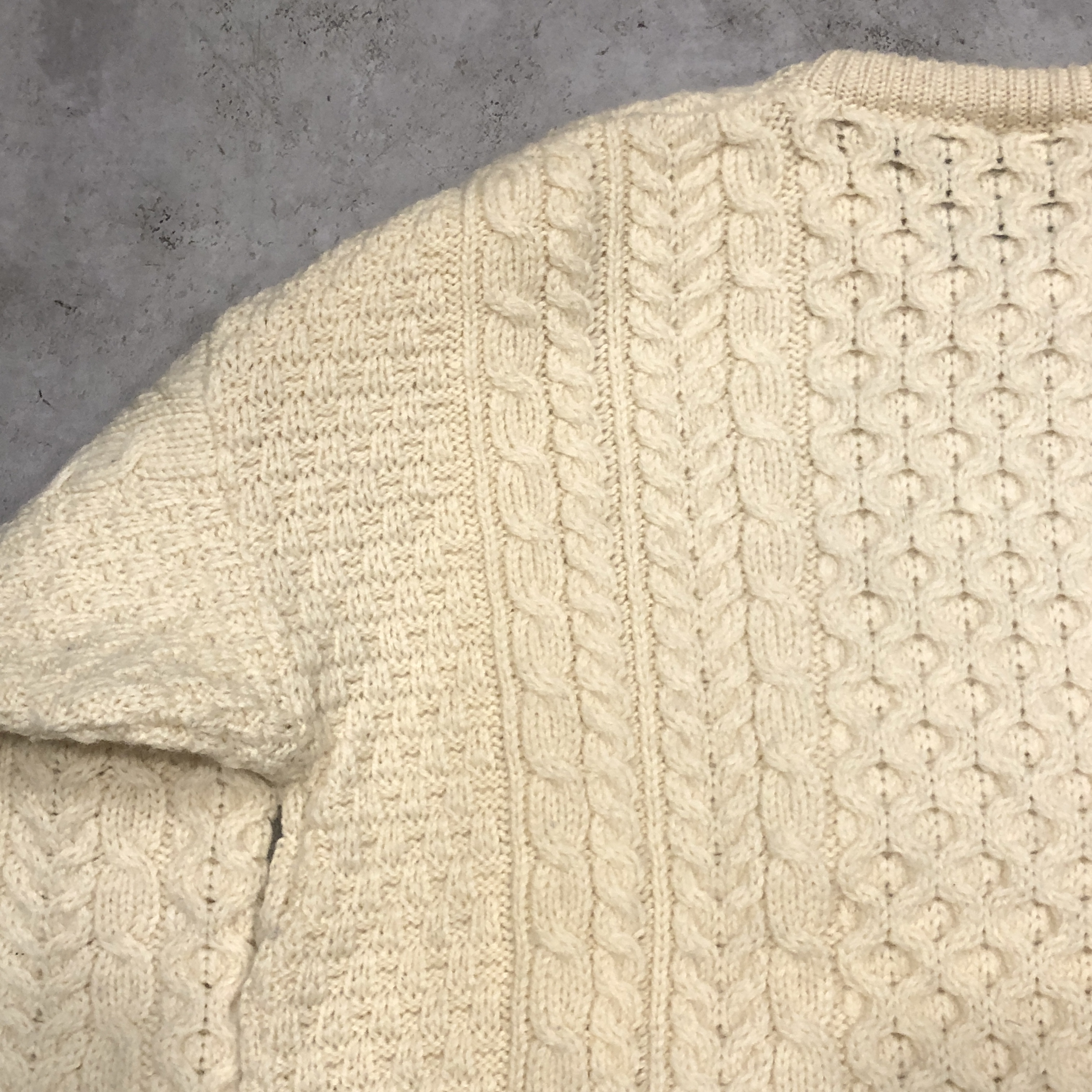 伝統的なアラン編みのパターンを余すところなく配し、柔らかなアイボリーカラーは、ジーンズやチノはもちろん、ホワイトデニムやミリタリーパンツにも好相性。ハンドニット特有のふっくらとした編み目は、着るほどに体に馴染み、長年の愛用でさらに味わいを増していきます。