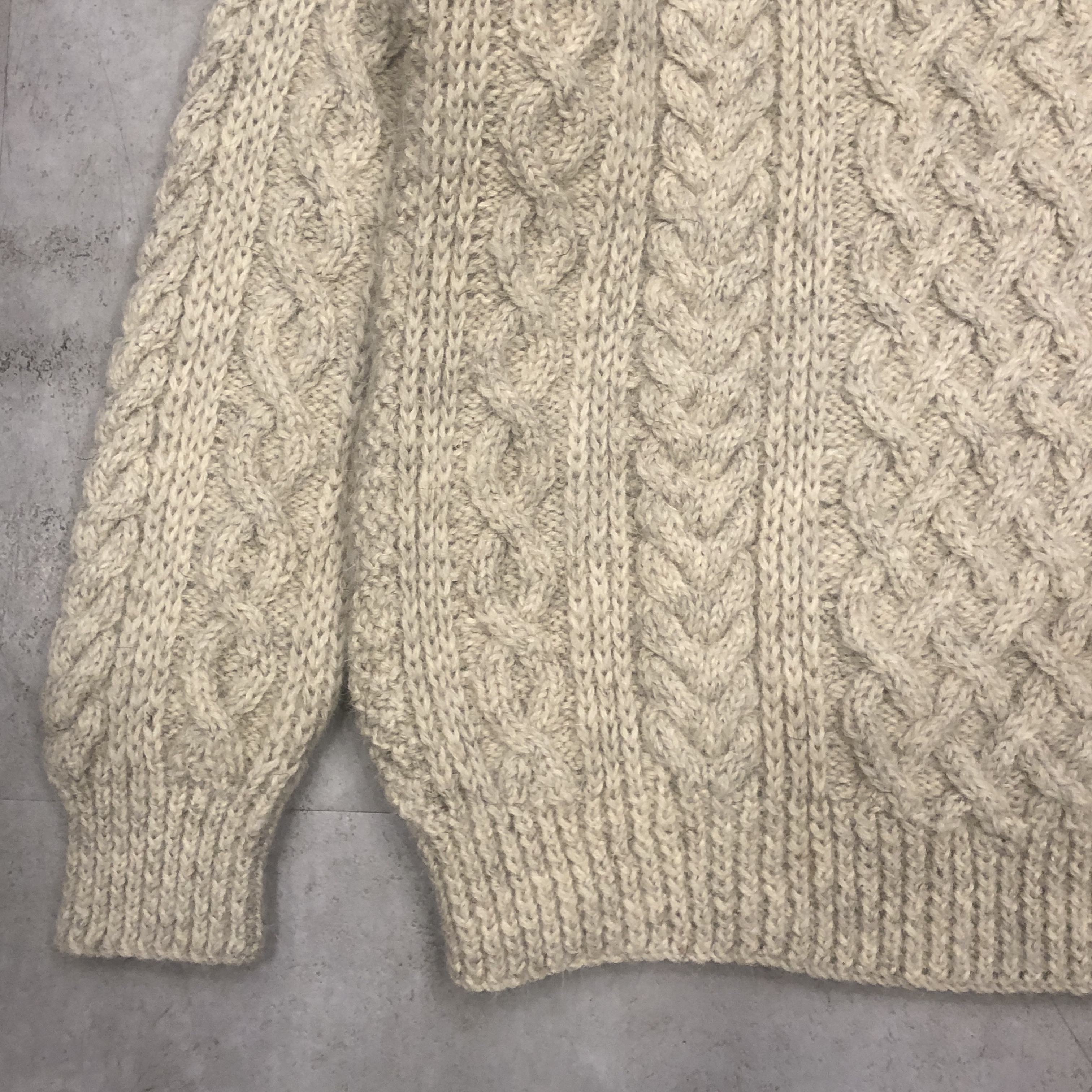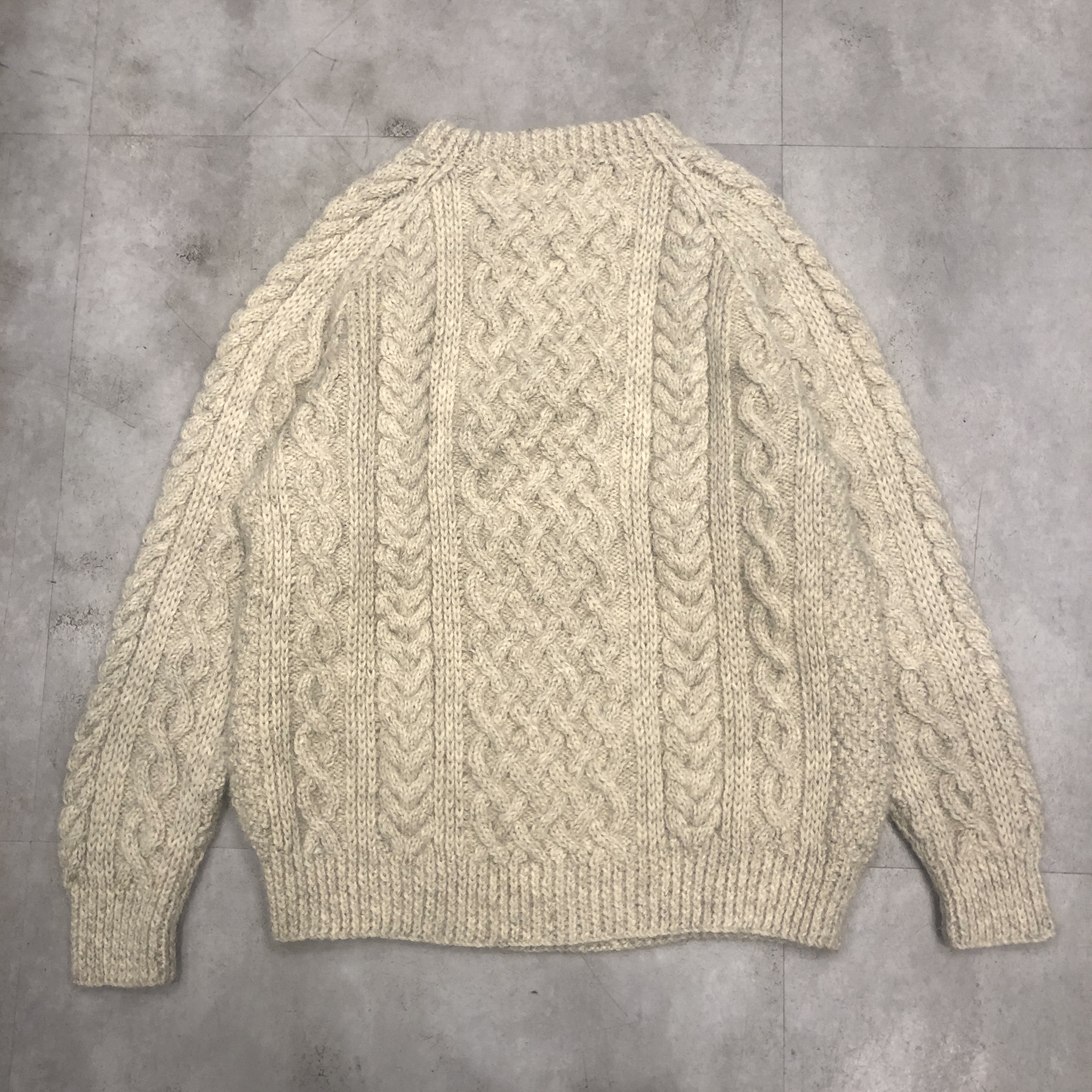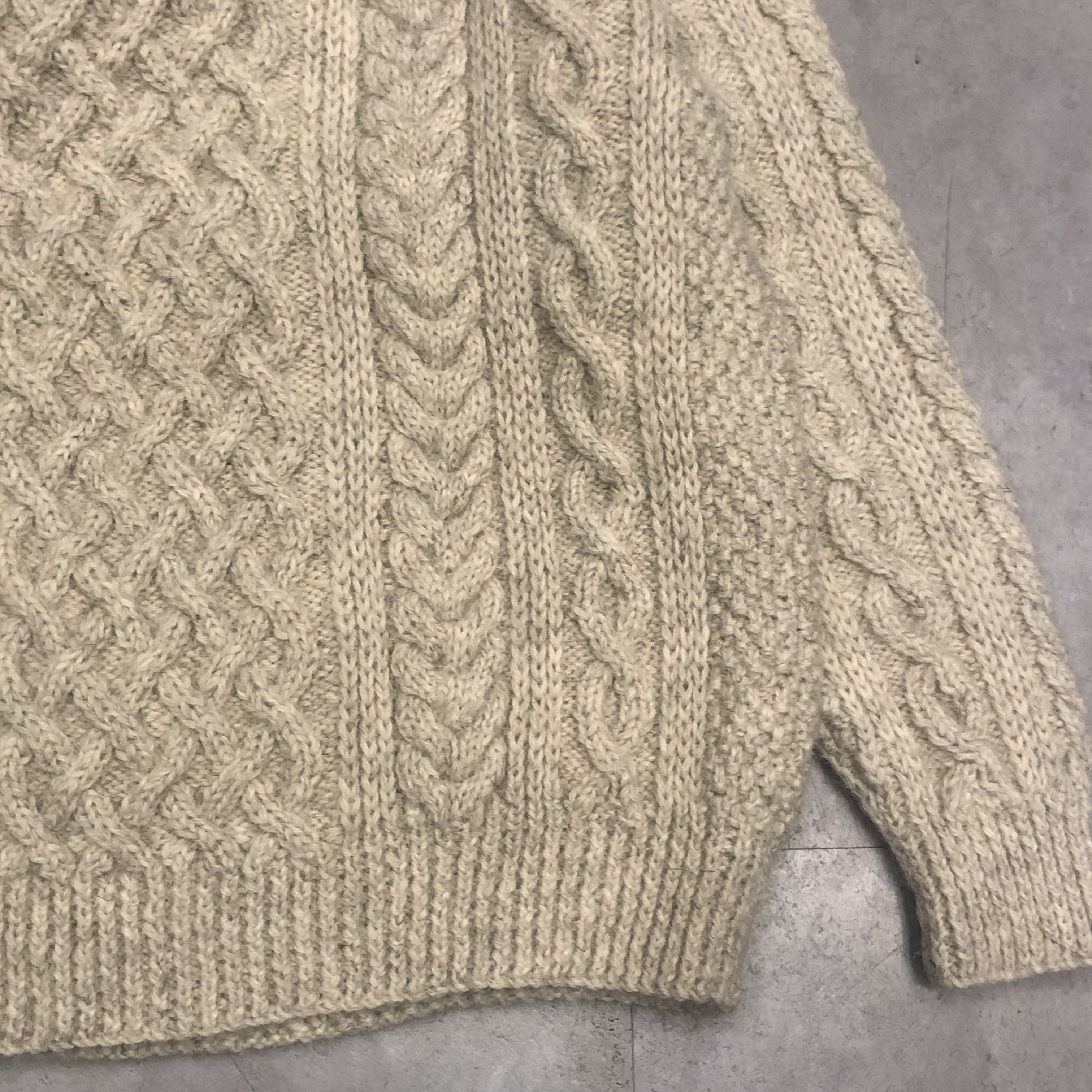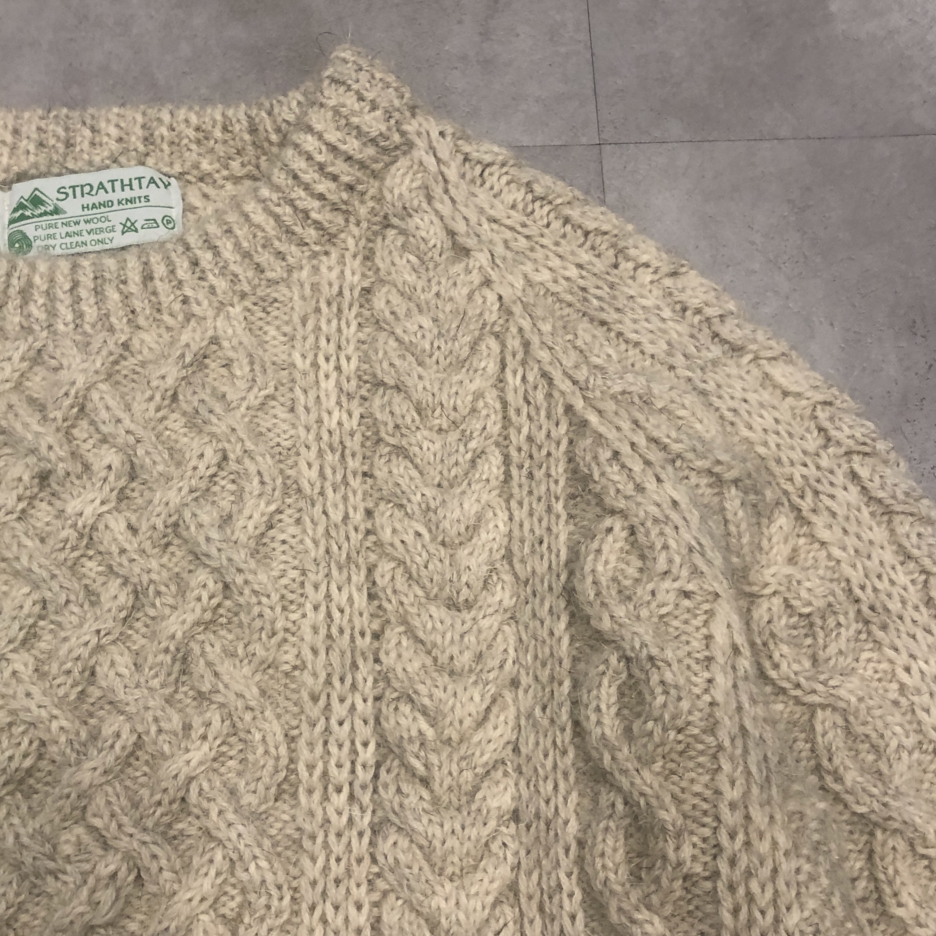 名門INVERALLANの別ラインとしてご存知の方も多い“STRATHTAY”より、ハンドニットのクルーネックセーターのご紹介です。タグからも分かる通りPURE NEW WOOLを贅沢に使用した手編み仕様で、現行のローゲージニットとは根本的に異なる、どこか素朴で原始的な温かみのある表情が魅力の一着。特筆すべきはこの密度の高いケーブル編み。中央には太めのフィッシャーマンズパターン、両サイドにはロープ編みとバスケット編みを交互に配置した非常に凝った構成で、袖にも惜しみなく同様のパターンが入る贅沢仕様です。ラグランスリーブならではの肩に乗る丸みと、ふっくらと膨らむ袖のシルエットが絶妙で、アウターの中に忍ばせても存在感を発揮してくれる頼れる一枚。カラーは生成りに近いナチュラルなオートミールトーンで、デニムや軍パンはもちろん、スラックスの上から合わせても上品にまとまります。このボリューム感と雰囲気をお探しだった方は是非ご検討ください。