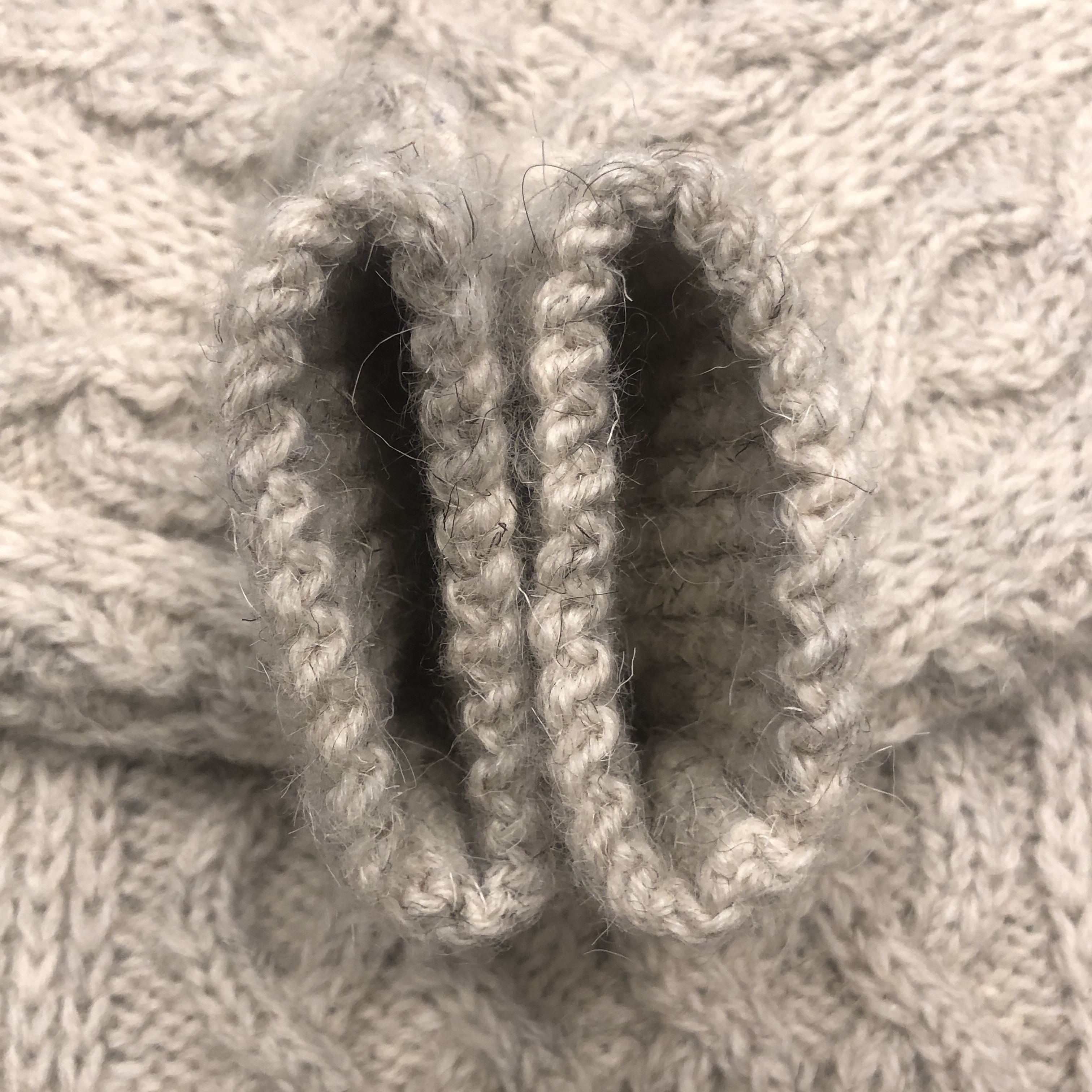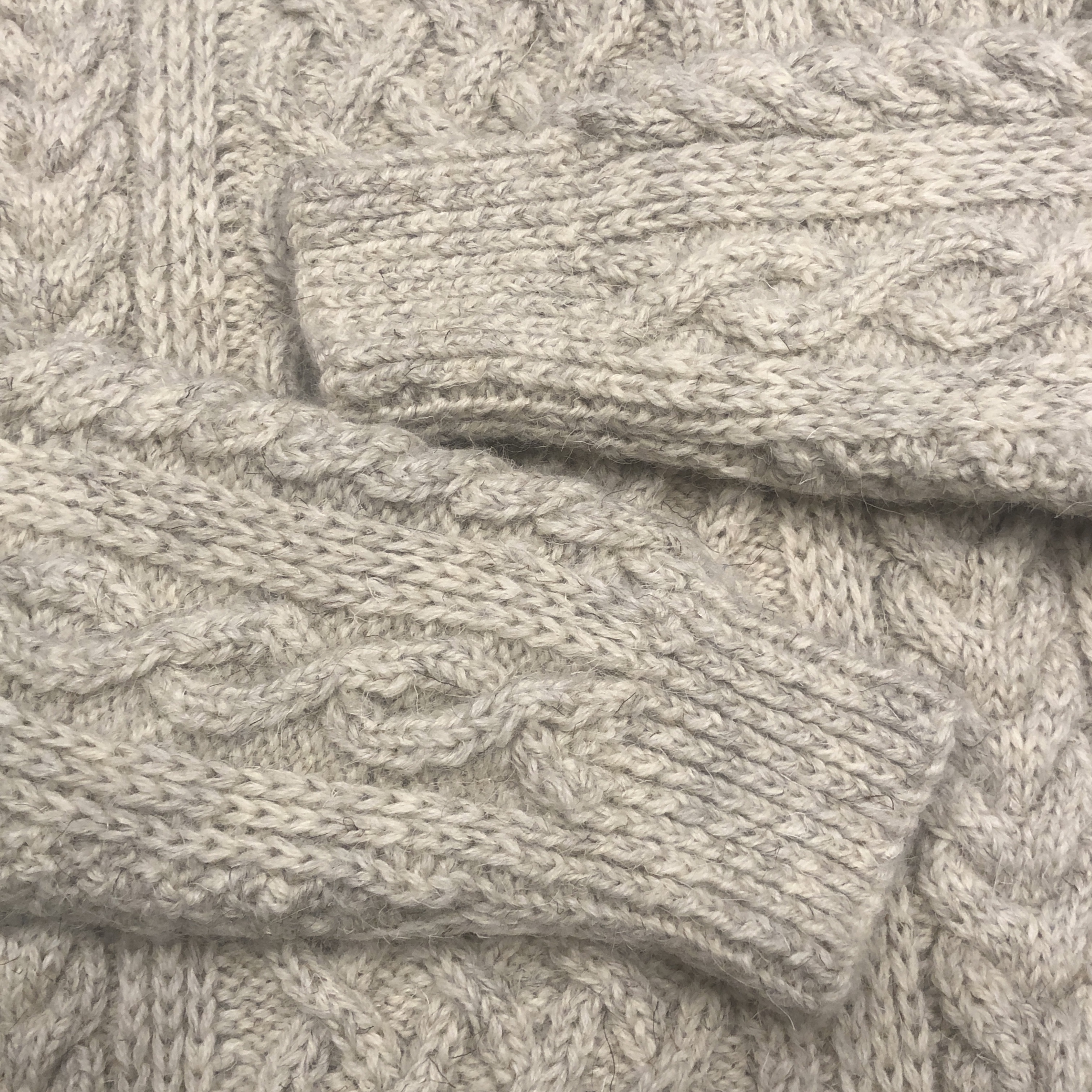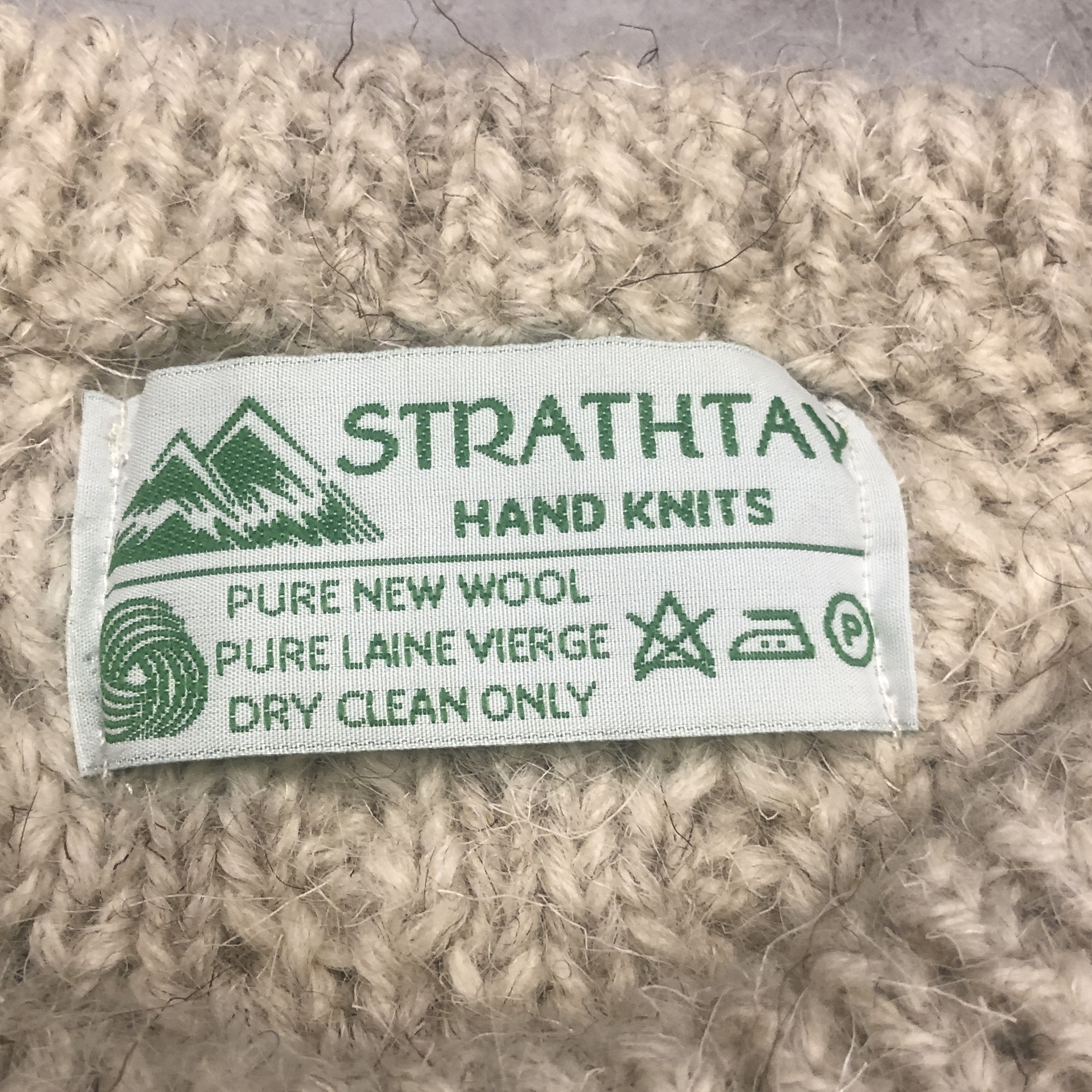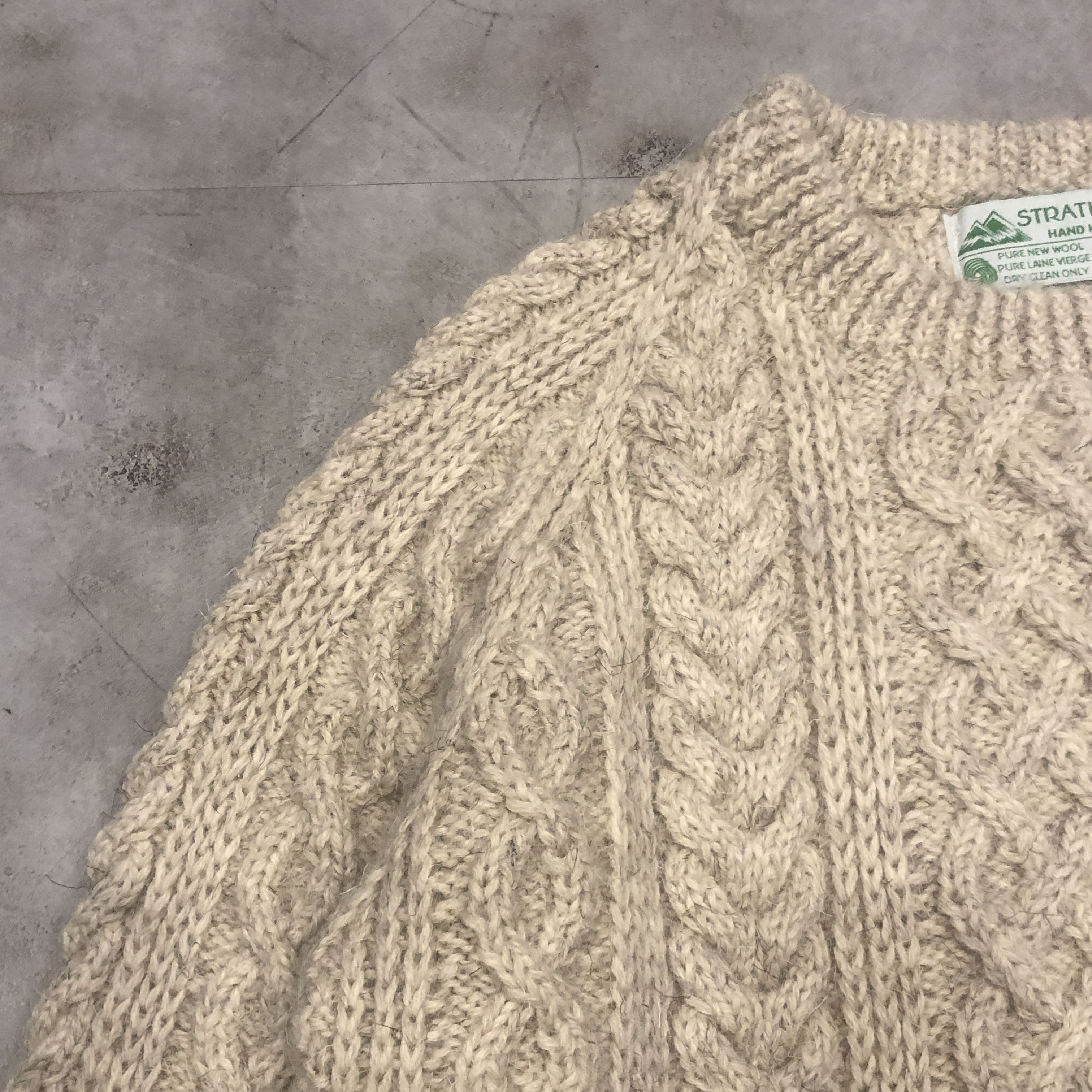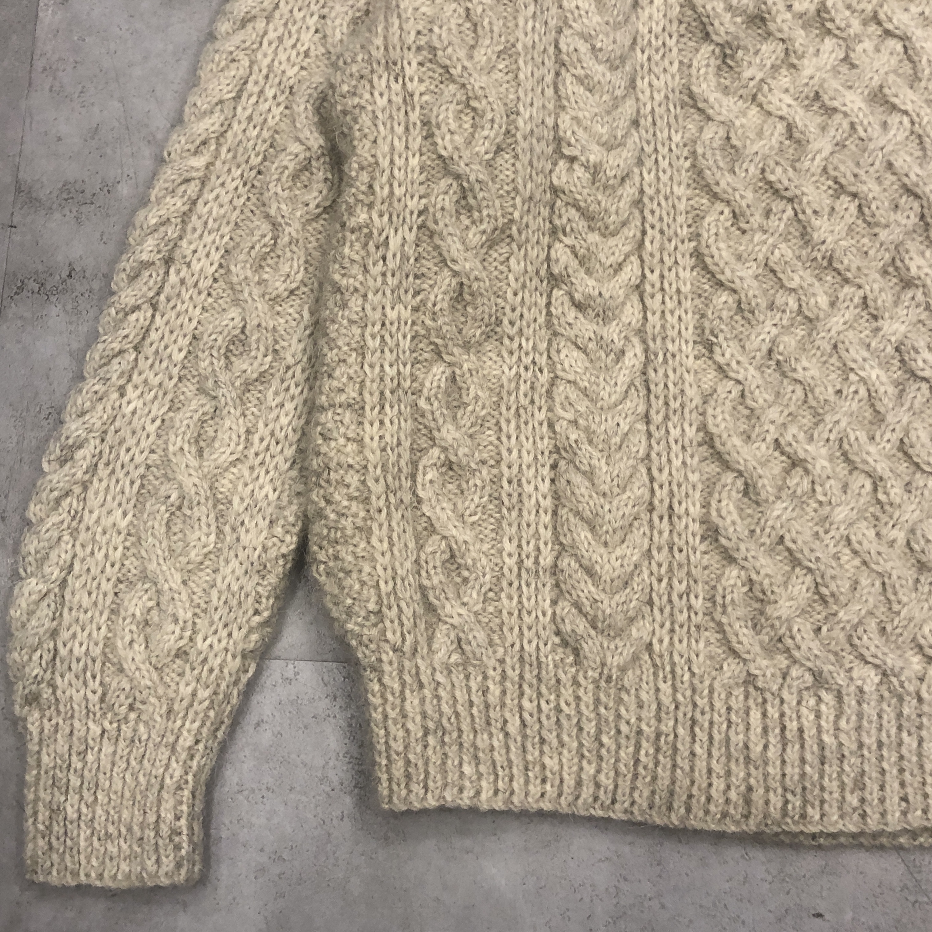 名門INVERALLANの別ラインとしてご存知の方も多い“STRATHTAY”より、ハンドニットのクルーネックセーターのご紹介です。タグからも分かる通りPURE NEW WOOLを贅沢に使用した手編み仕様で、現行のローゲージニットとは根本的に異なる、どこか素朴で原始的な温かみのある表情が魅力の一着。特筆すべきはこの密度の高いケーブル編み。中央には太めのフィッシャーマンズパターン、両サイドにはロープ編みとバスケット編みを交互に配置した非常に凝った構成で、袖にも惜しみなく同様のパターンが入る贅沢仕様です。ラグランスリーブならではの肩に乗る丸みと、ふっくらと膨らむ袖のシルエットが絶妙で、アウターの中に忍ばせても存在感を発揮してくれる頼れる一枚。カラーは生成りに近いナチュラルなオートミールトーンで、デニムや軍パンはもちろん、スラックスの上から合わせても上品にまとまります。このボリューム感と雰囲気をお探しだった方は是非ご検討ください。