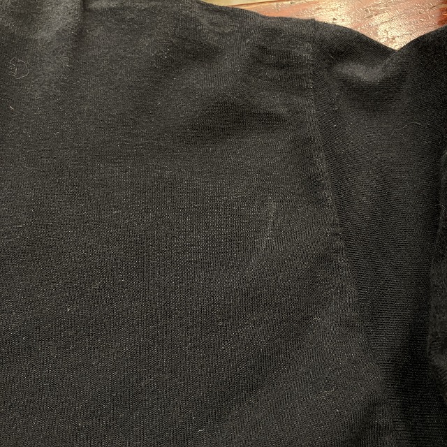 - 左の袖先付近から肘にかけて変色がみられます。また、襟リブ、両肩に若干のヨレがみられます。その他、スレ、アタリ等の着用感ございますが、まだまだ問題なく着用していただけます。