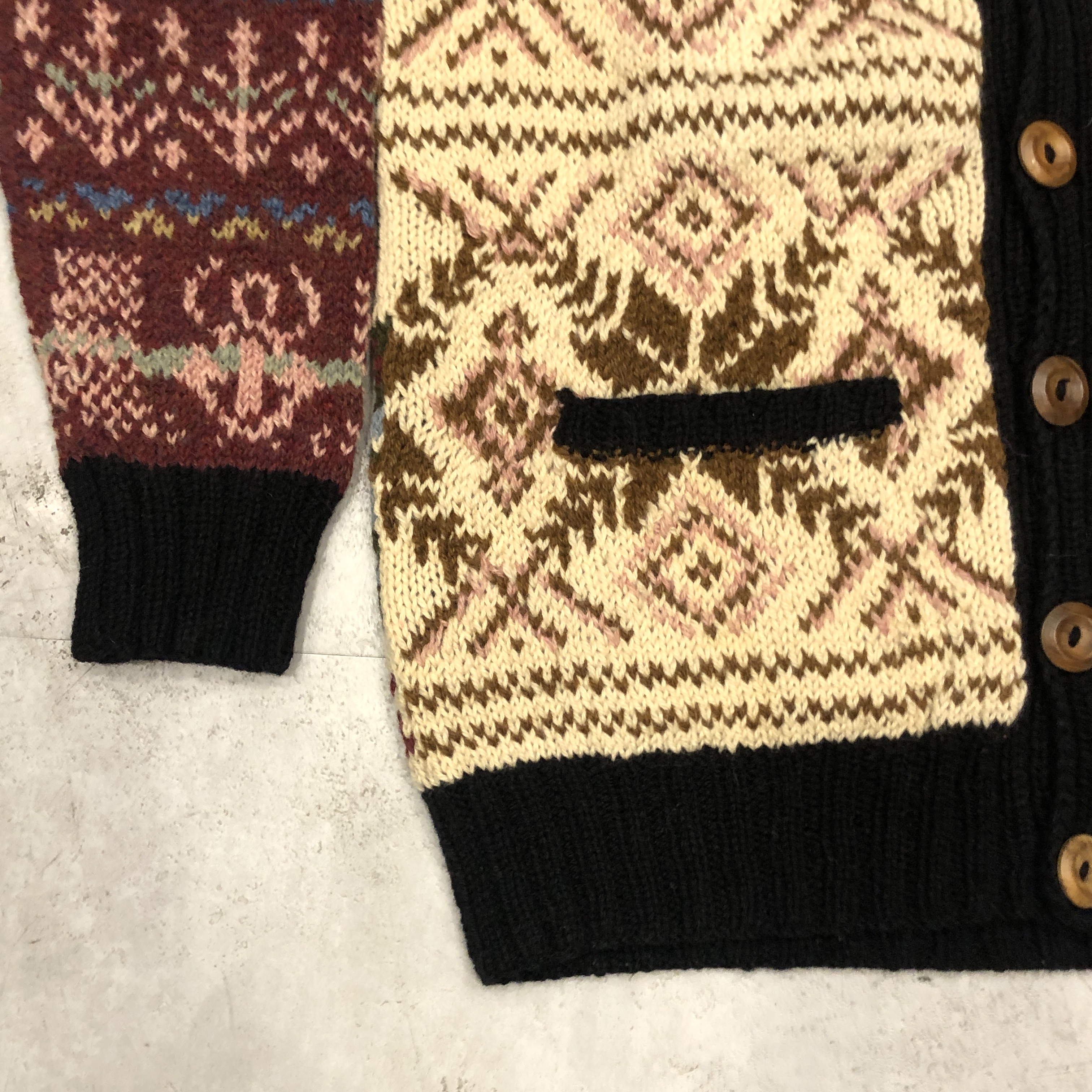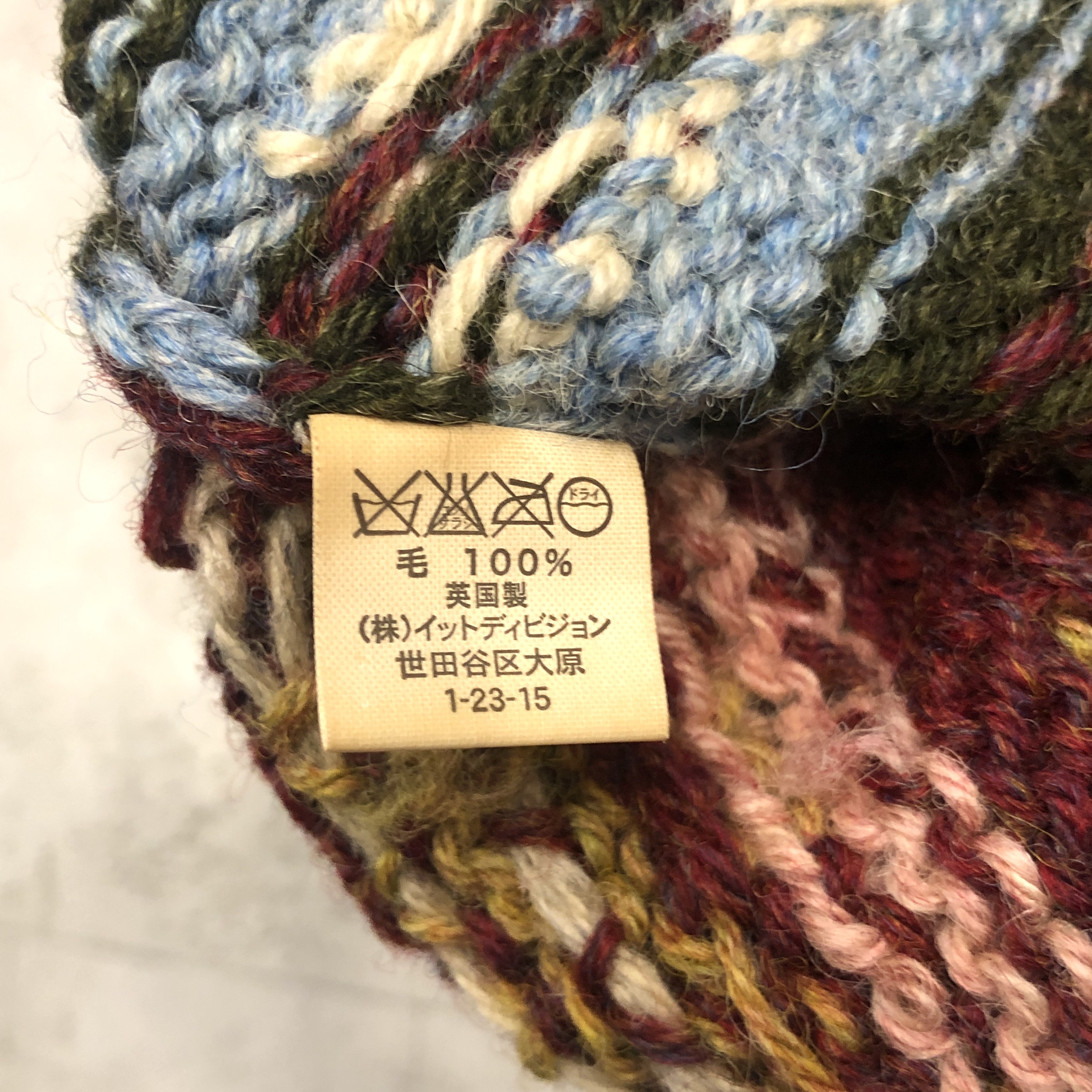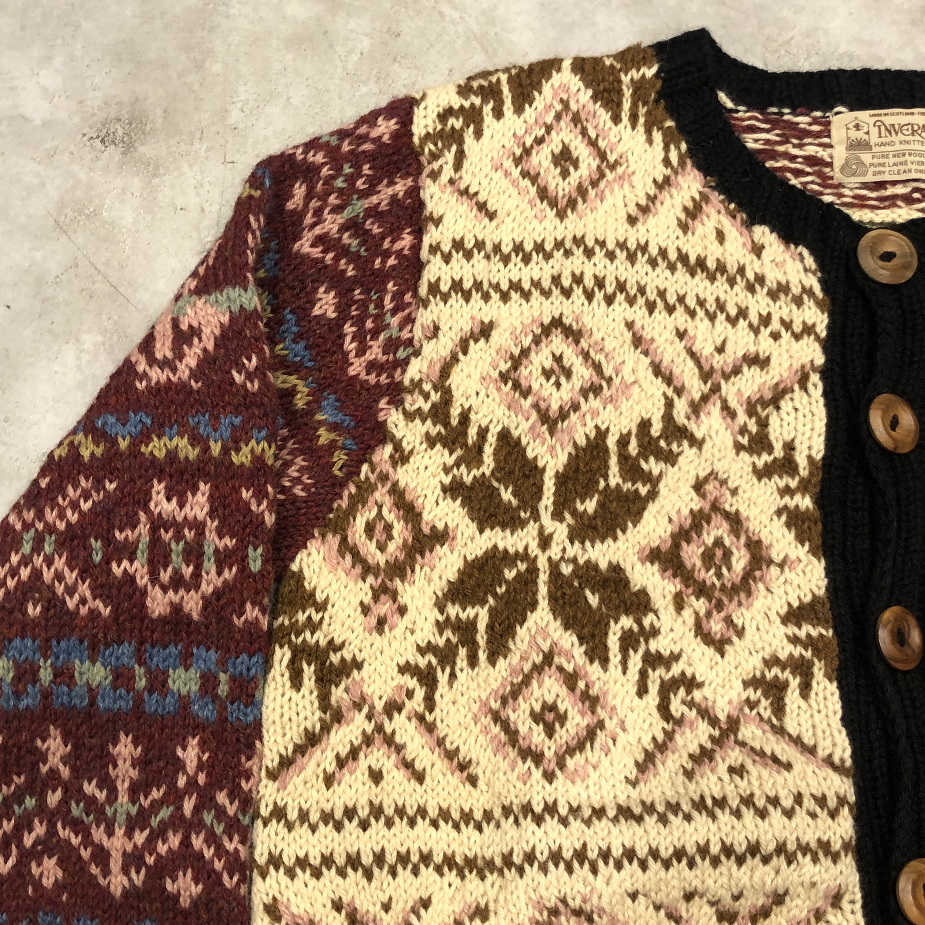 - スコットランドの名門〈INVERALLAN〉より、贅沢すぎるパターンワークが目を奪うフェアアイル・カーディガンのご紹介です。インバーアランといえば3Aのアランニットがあまりにも有名ですが、実はごく一部にこうした“フェアアイル編み”のモデルが存在します。しかもこちらは単なる総柄ではございません。右袖だけブルー系、左袖はボルドー〜オリーブ系、身頃にいたっては左右で柄も配色も全く異なるアシンメトリーデザイン。まるで熟練ニッターが遊び心のままに編み進め、そのまま製品化してしまったかのような、今では考えられない自由さ。もちろんハンドニット100%、肉厚なピュアウール特有の弾力感と保温性は言わずもがな。フロントの木製ボタンも良いアクセントです。柄ニットは好きだけれど“普通のフェアアイルでは物足りない”という方にこそ袖を通していただきたい逸品。このクラスの変化球インバーアランは、次にいつご紹介できるか全く読めませんので、ぜひこの機会にご検討ください。