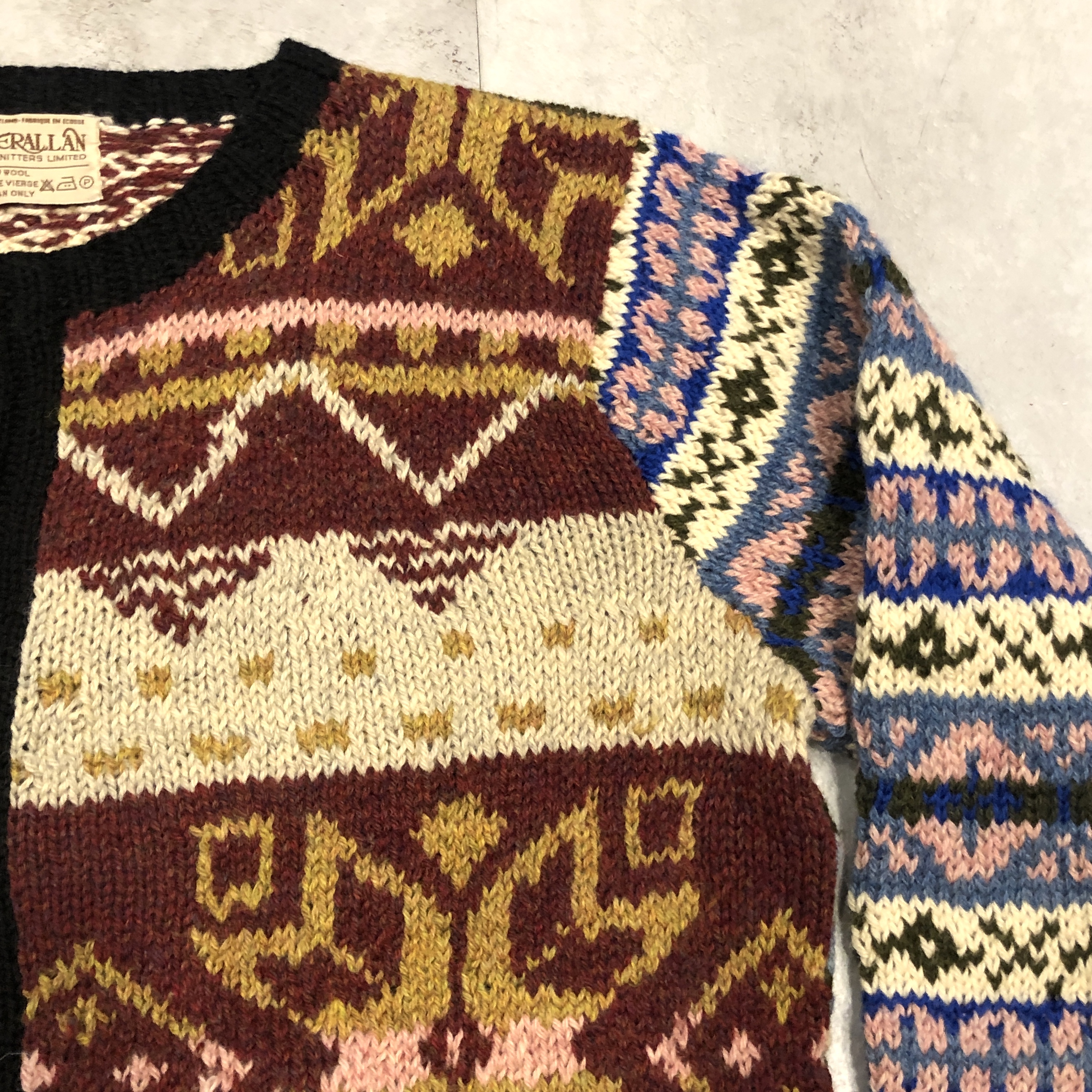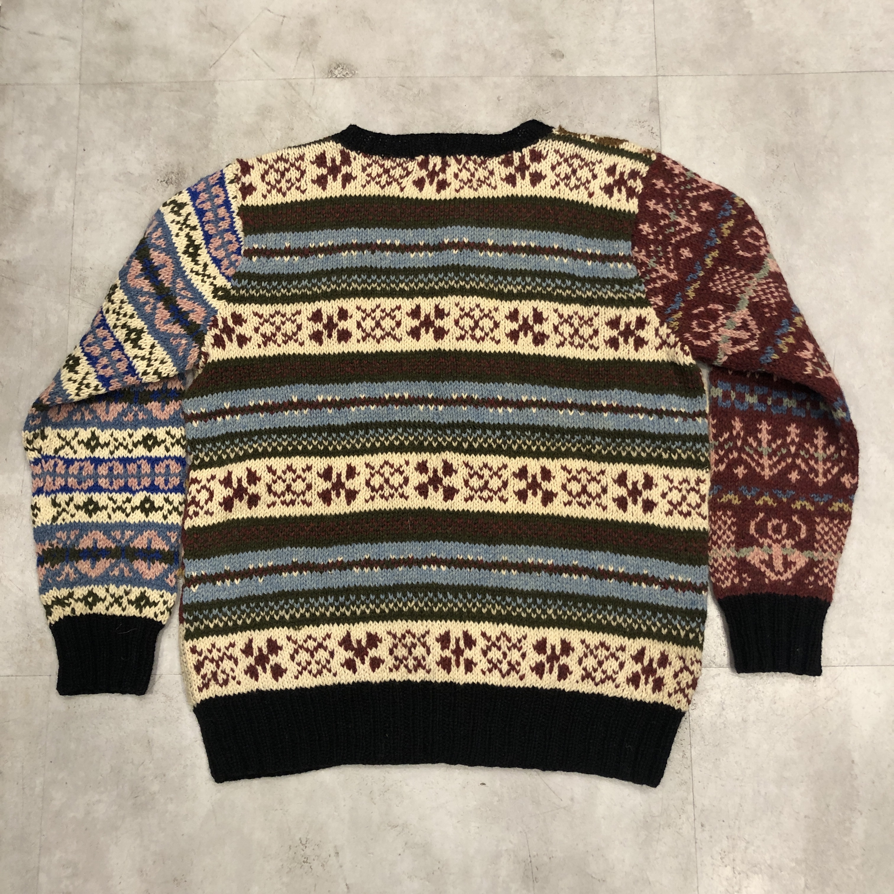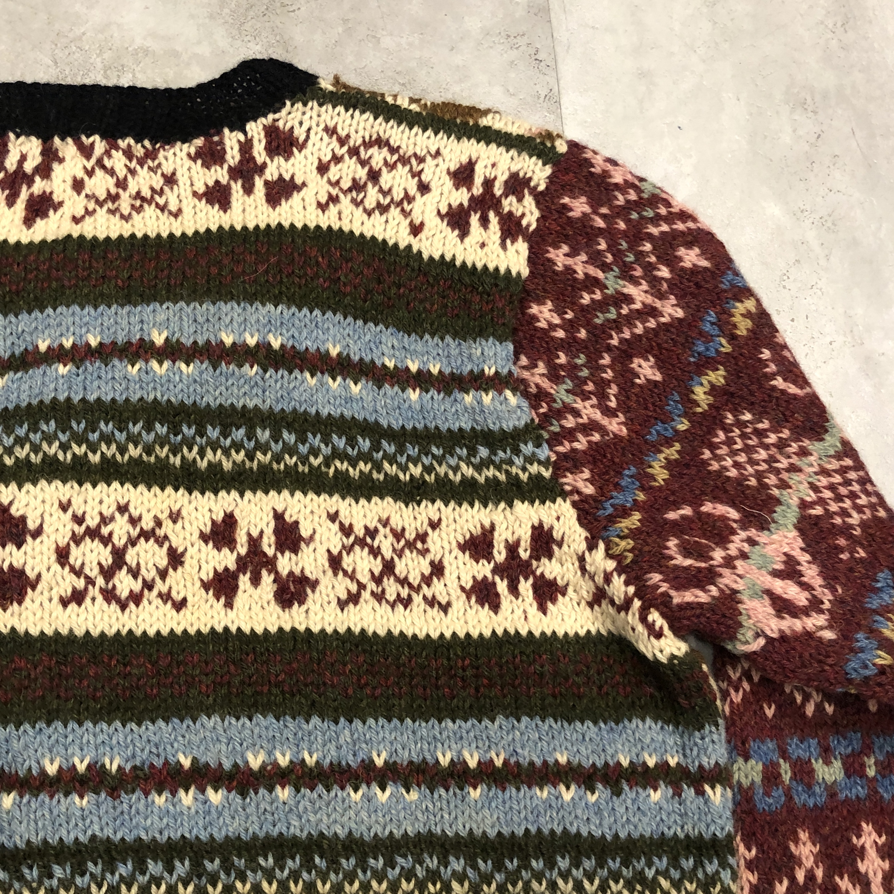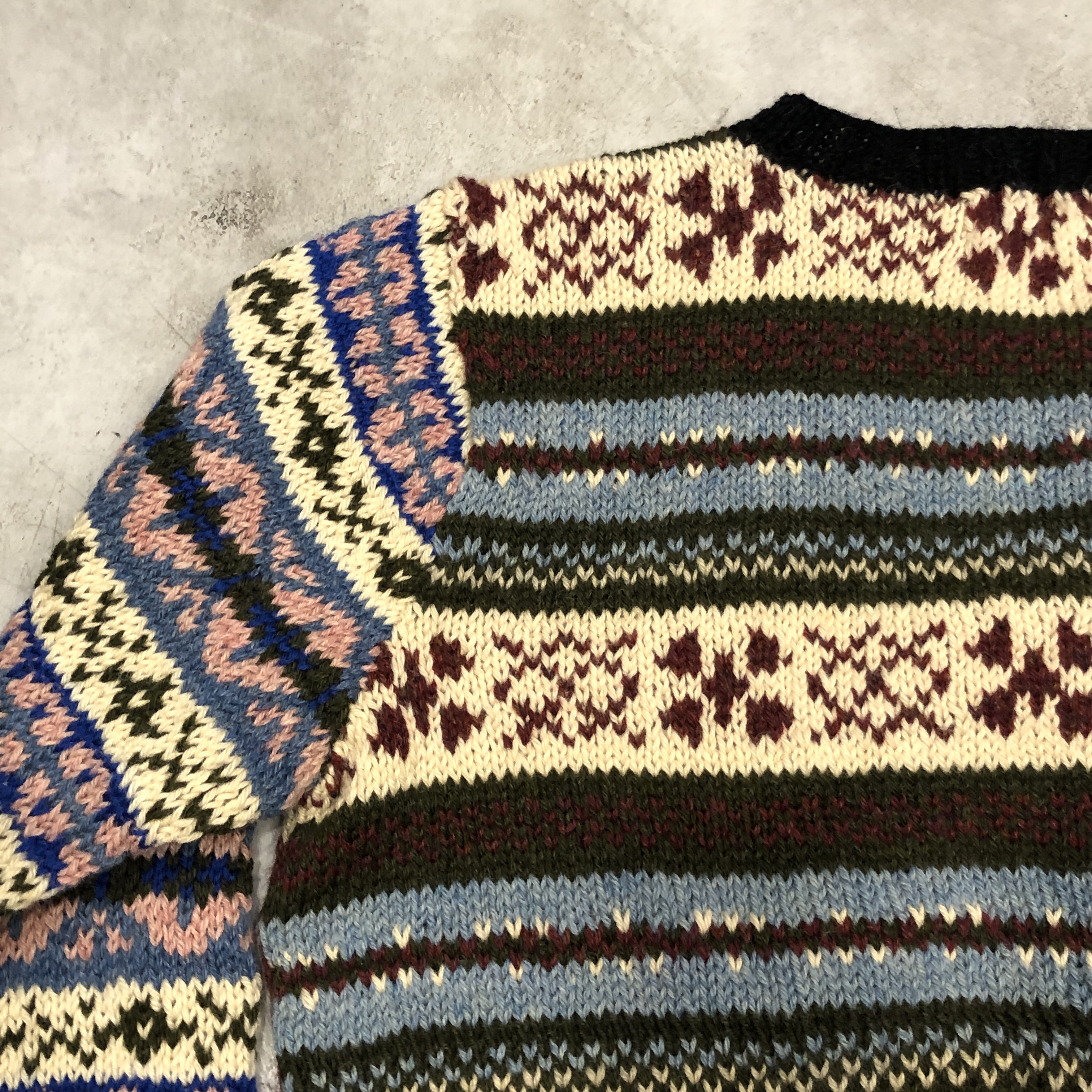 - スコットランドの名門〈INVERALLAN〉より、贅沢すぎるパターンワークが目を奪うフェアアイル・カーディガンのご紹介です。インバーアランといえば3Aのアランニットがあまりにも有名ですが、実はごく一部にこうした“フェアアイル編み”のモデルが存在します。しかもこちらは単なる総柄ではございません。右袖だけブルー系、左袖はボルドー〜オリーブ系、身頃にいたっては左右で柄も配色も全く異なるアシンメトリーデザイン。まるで熟練ニッターが遊び心のままに編み進め、そのまま製品化してしまったかのような、今では考えられない自由さ。もちろんハンドニット100%、肉厚なピュアウール特有の弾力感と保温性は言わずもがな。フロントの木製ボタンも良いアクセントです。柄ニットは好きだけれど“普通のフェアアイルでは物足りない”という方にこそ袖を通していただきたい逸品。このクラスの変化球インバーアランは、次にいつご紹介できるか全く読めませんので、ぜひこの機会にご検討ください。