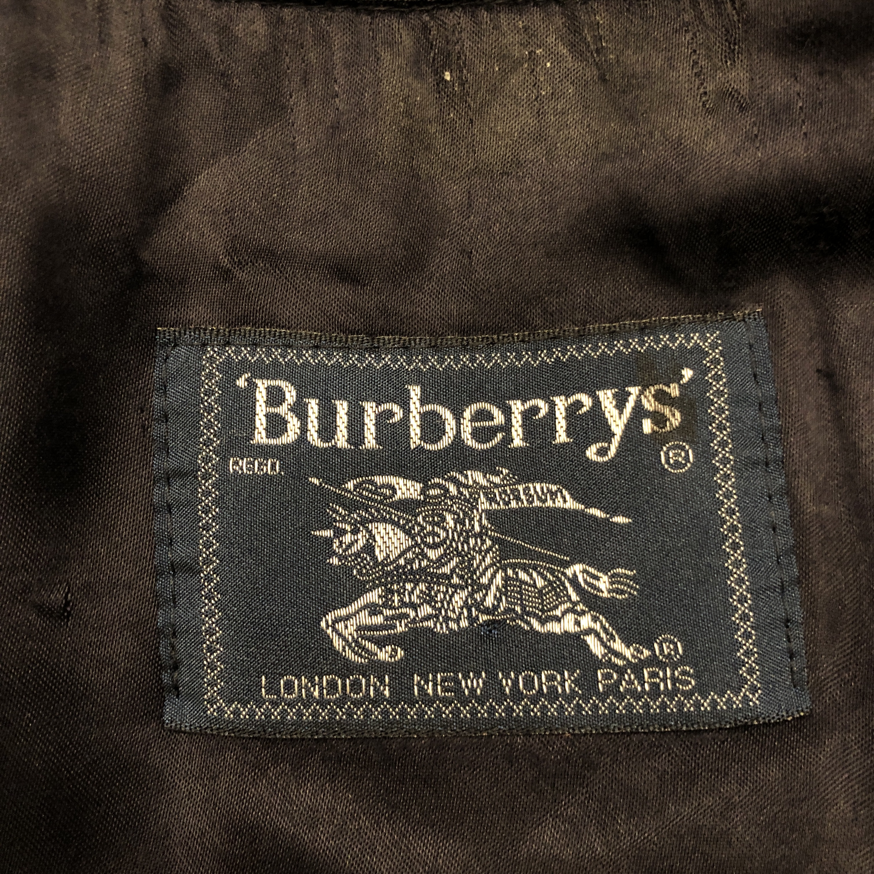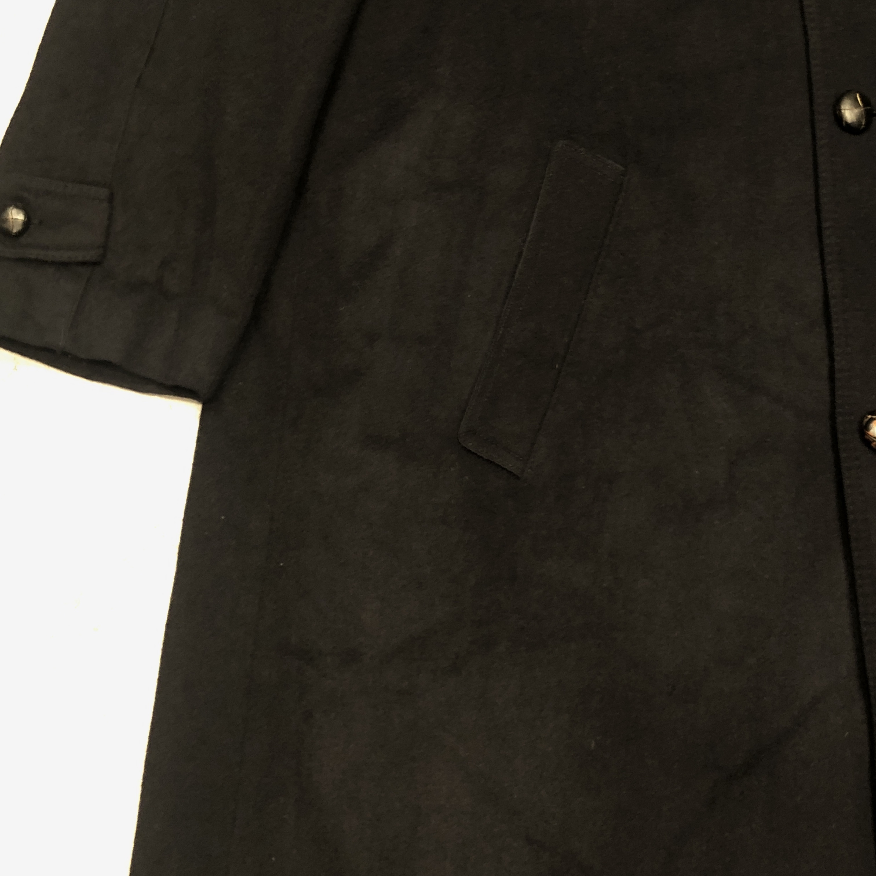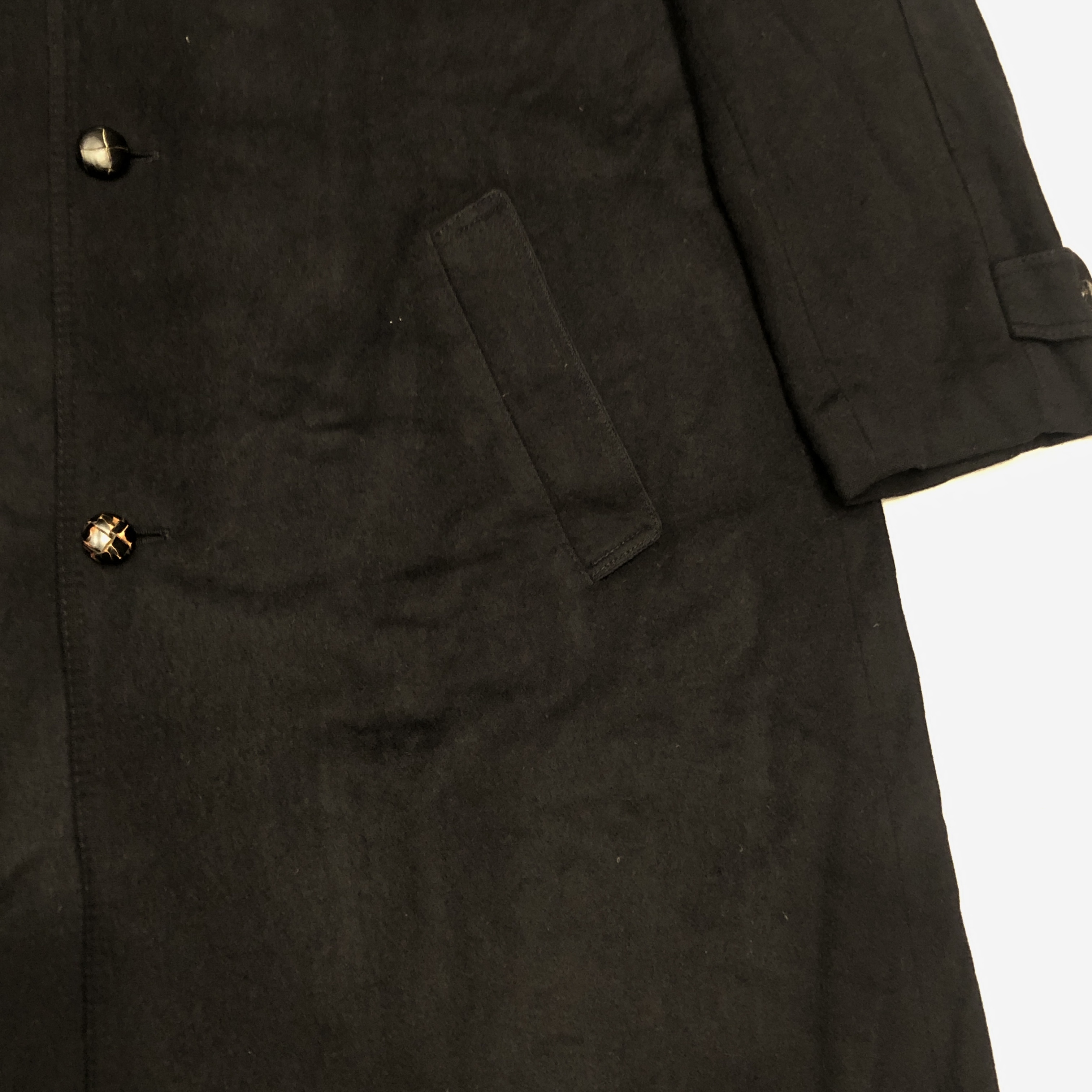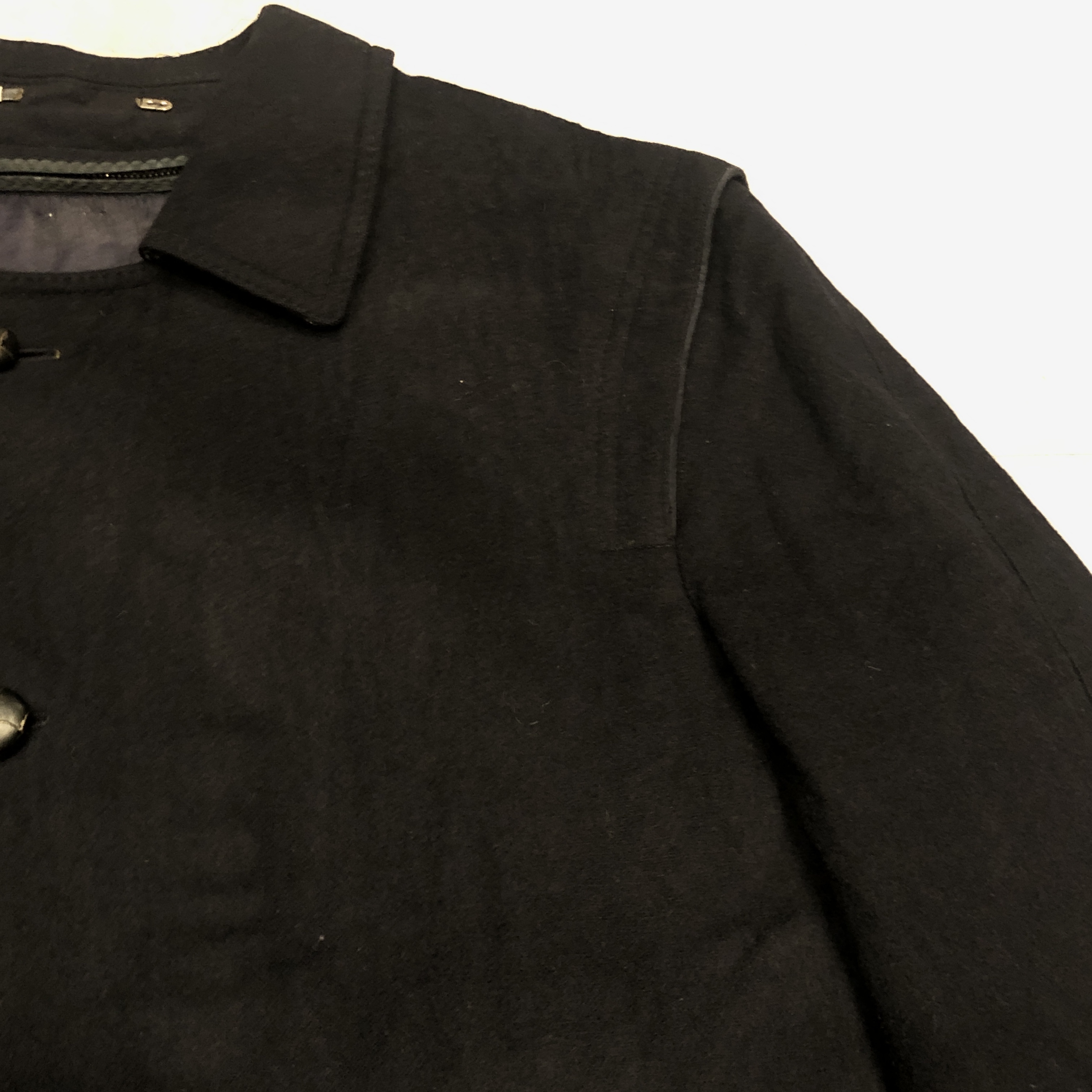 - オーストリア製のローデンクロスを贅沢に用いた、Burberrysによるオリジナル・ローデンコート。ローデンとは、オーストリア〜南ドイツの山岳地帯で狩猟や乗馬用に愛用されてきた伝統的なウール地で、雨雪を弾きながらも内部の湿気は逃がすという、ゴアテックスも顔負けの天然機能素材。本来グリーン系が主流ですが、こちらは漆黒に近いダークネイビーというのがまた洒落ています。背中には深いインバーテッドプリーツ、総裏にはブラックウォッチ系チェックのライニング、80%ヴァージンウール+20%アルパカ混。着るだけでウィーンの街角に立っているような気分にさせてくれる、風格と詩情を併せ持った一着です。バーバリーのトレンチとはまた別軸の、ヨーロッパ上流階級の休日服——その余裕を、現代の装いに取り入れてみませんか。