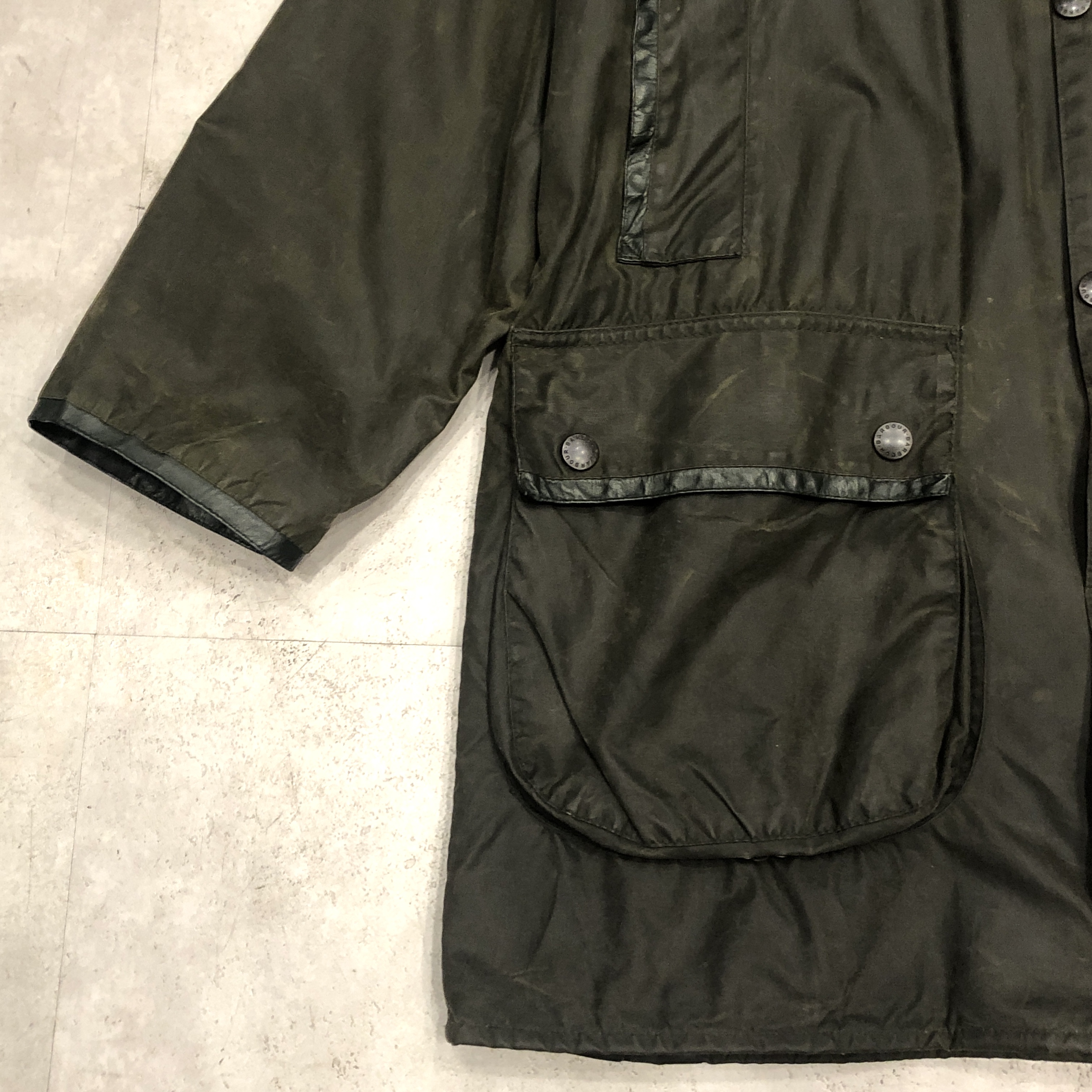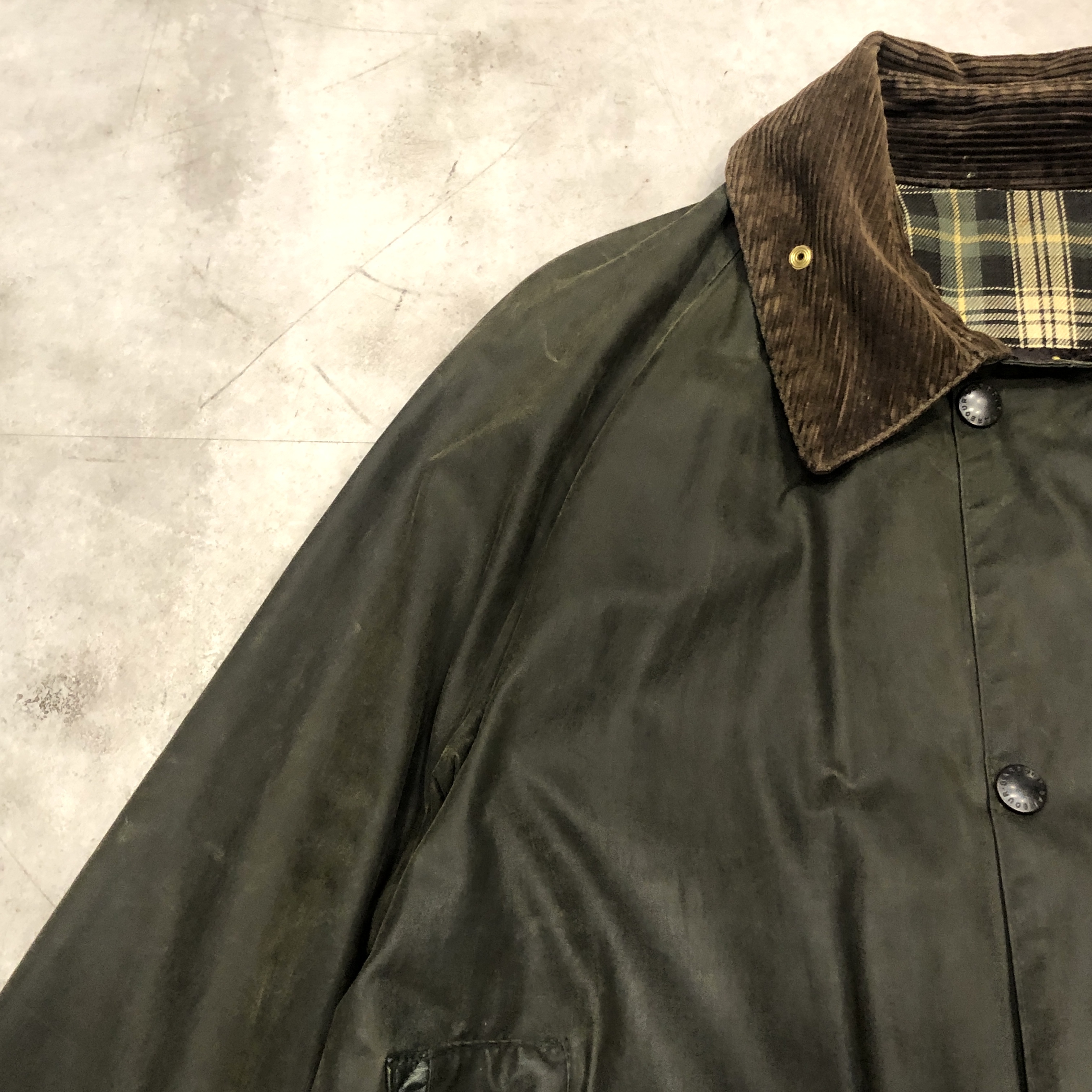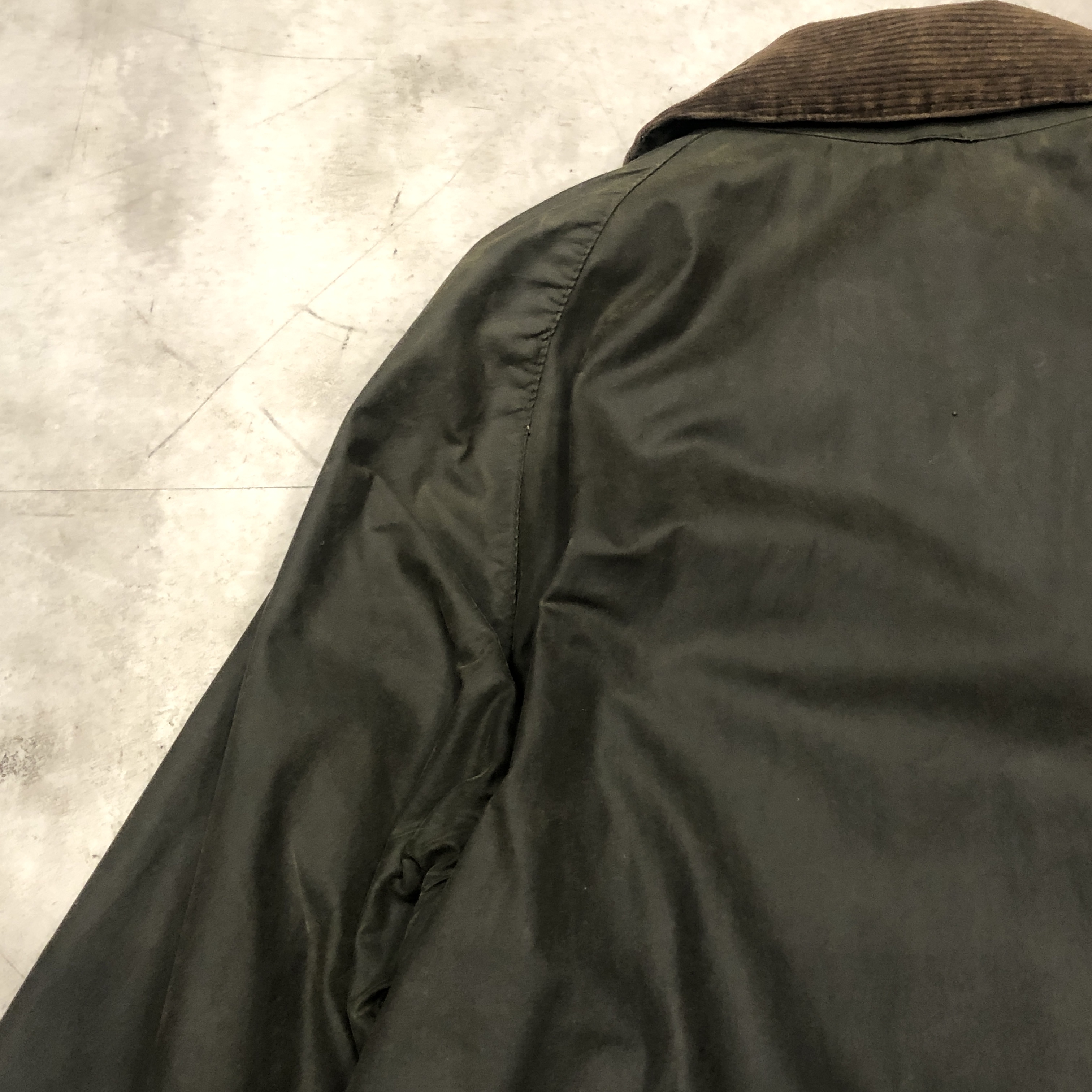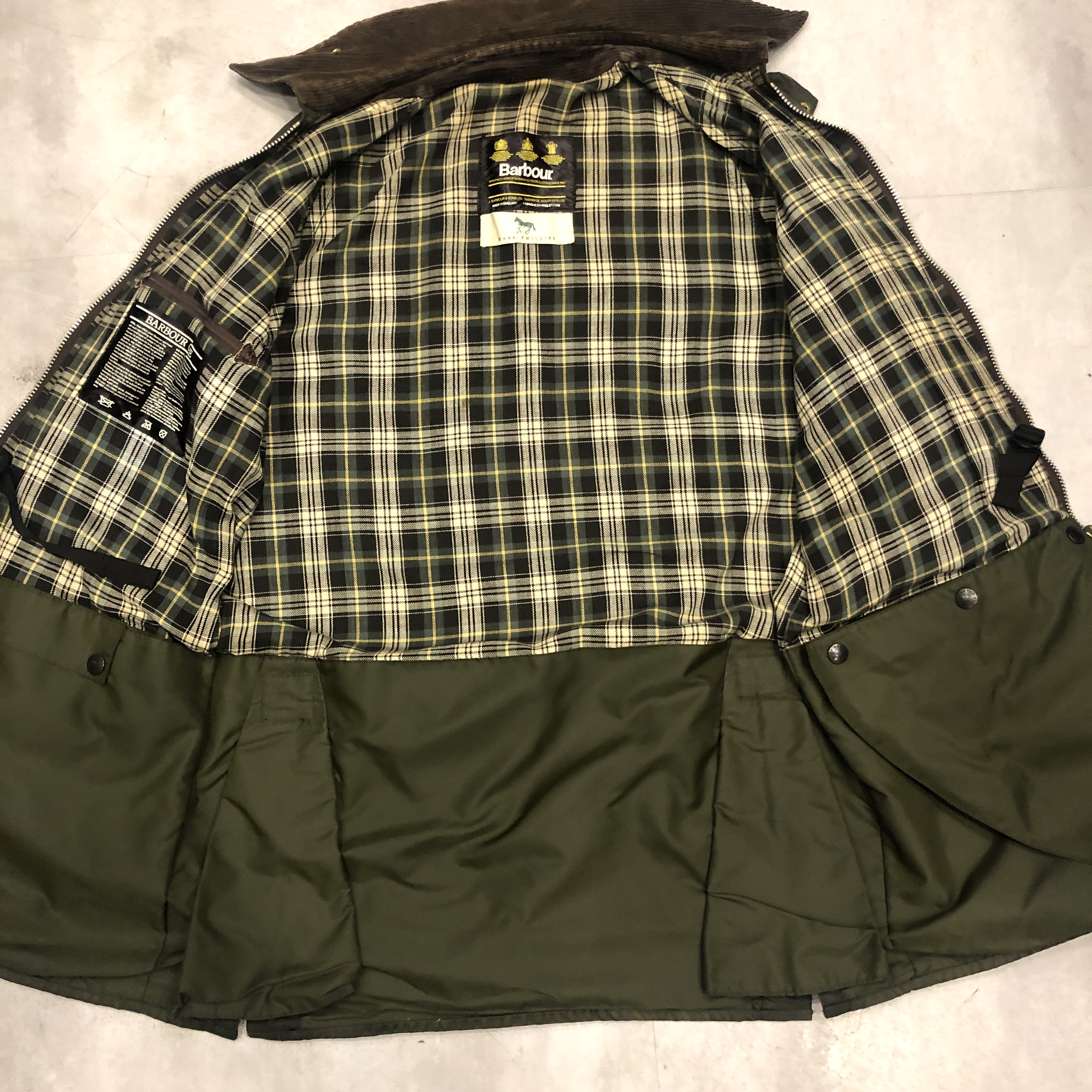 - バブアー好きなら誰もが通る王道ビデイルやボーダー。そのさらに奥にある“通好みの一枚”がこのMARK PHILLIPS(マーク・フィリップス)モデル。英国王室アン王女の元夫にしてオリンピック金メダリストの名を冠するだけあり、ただのフィッシング・ハンティング用ではなく馬術視点で設計された特別仕様。深く取られた後ろのベンチレーション、鞍に跨る前提のゆったりとしたアームと裾周り、そして胸元に光る馬のタグ。3ワラントの荘厳なパッチと並んで付くこのタグを見ただけでテンションが上がる人は、きっとかなりの“沼”の住人でしょう。色味は使い込むほどに鈍く艶を増すオリーブ。コーデュロイの襟もいい感じに焼けてきており、これからさらに仕上がる余地を残した熟成途中の一本です。定番を2周くらいした玄人の方、ぜひ次はここで遊んでみませんか?