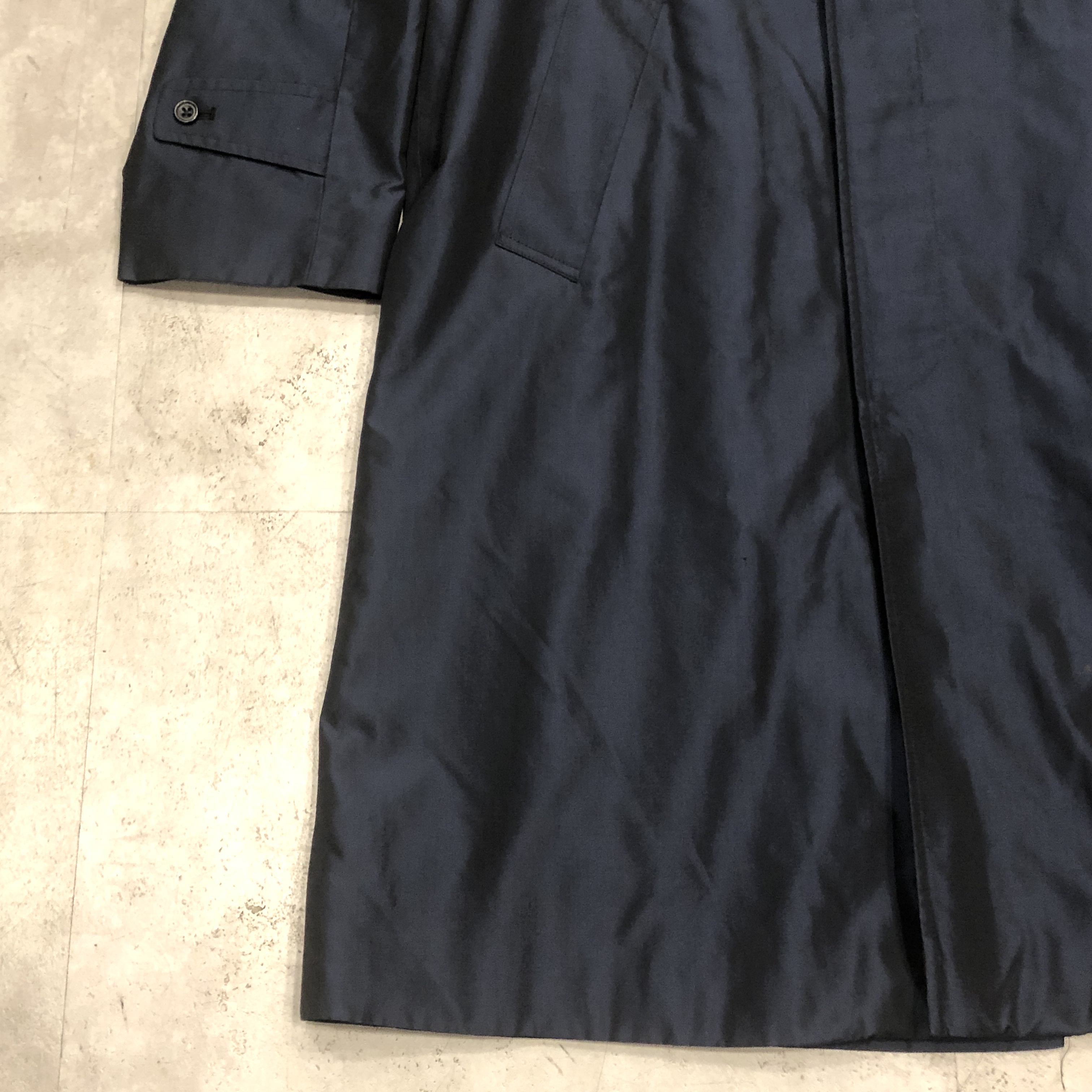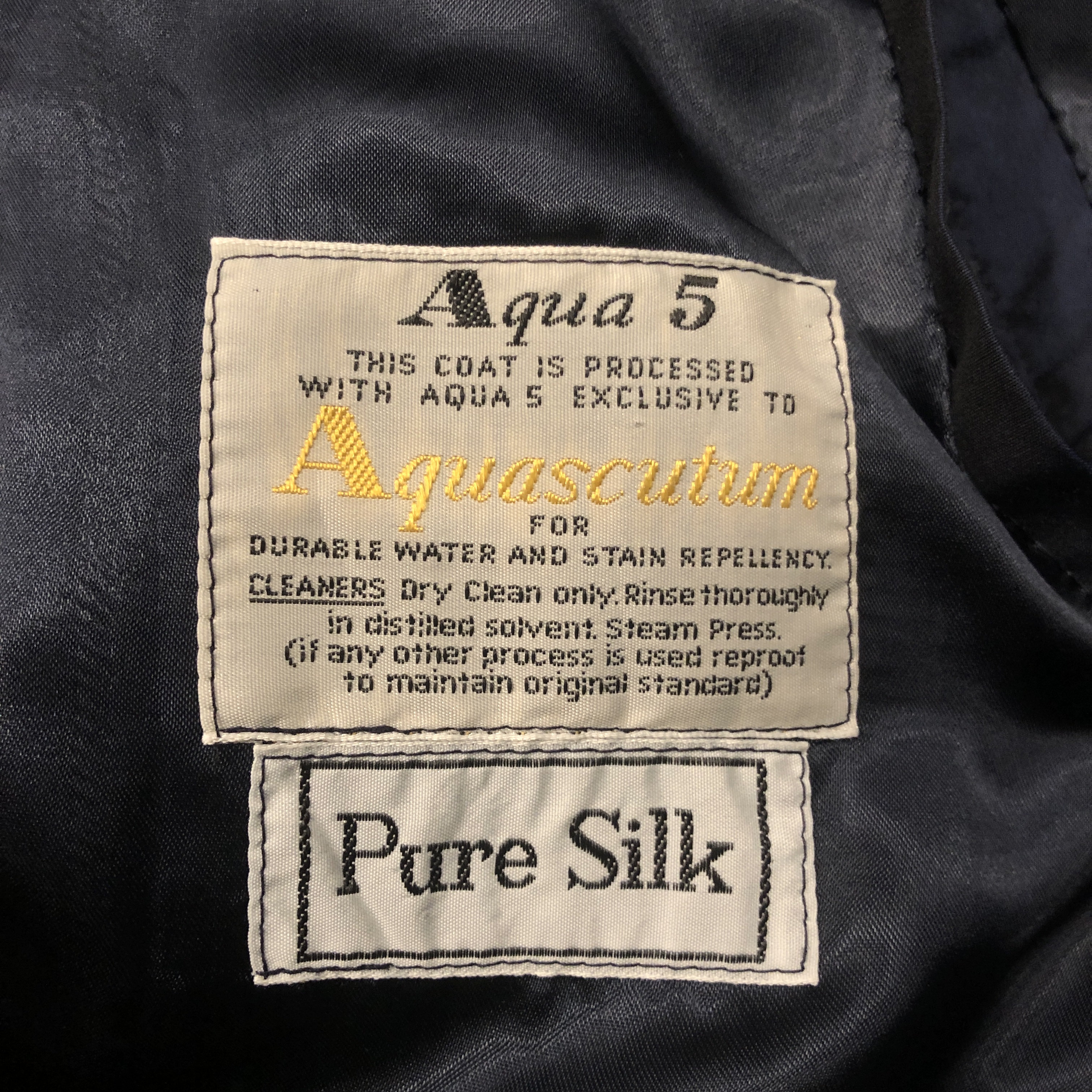 英国製ならではの端正な仕立てと、時代を超えて愛されるベーシックなバルマカーンシルエット。Aquascutumを象徴する“クラブチェック”のイメージとはまた異なる、シンプルでありながらも贅沢な存在感。タグには「Aqua 5」加工の記載があり、撥水性・防汚性を兼ね備えた実用面も見逃せません。
