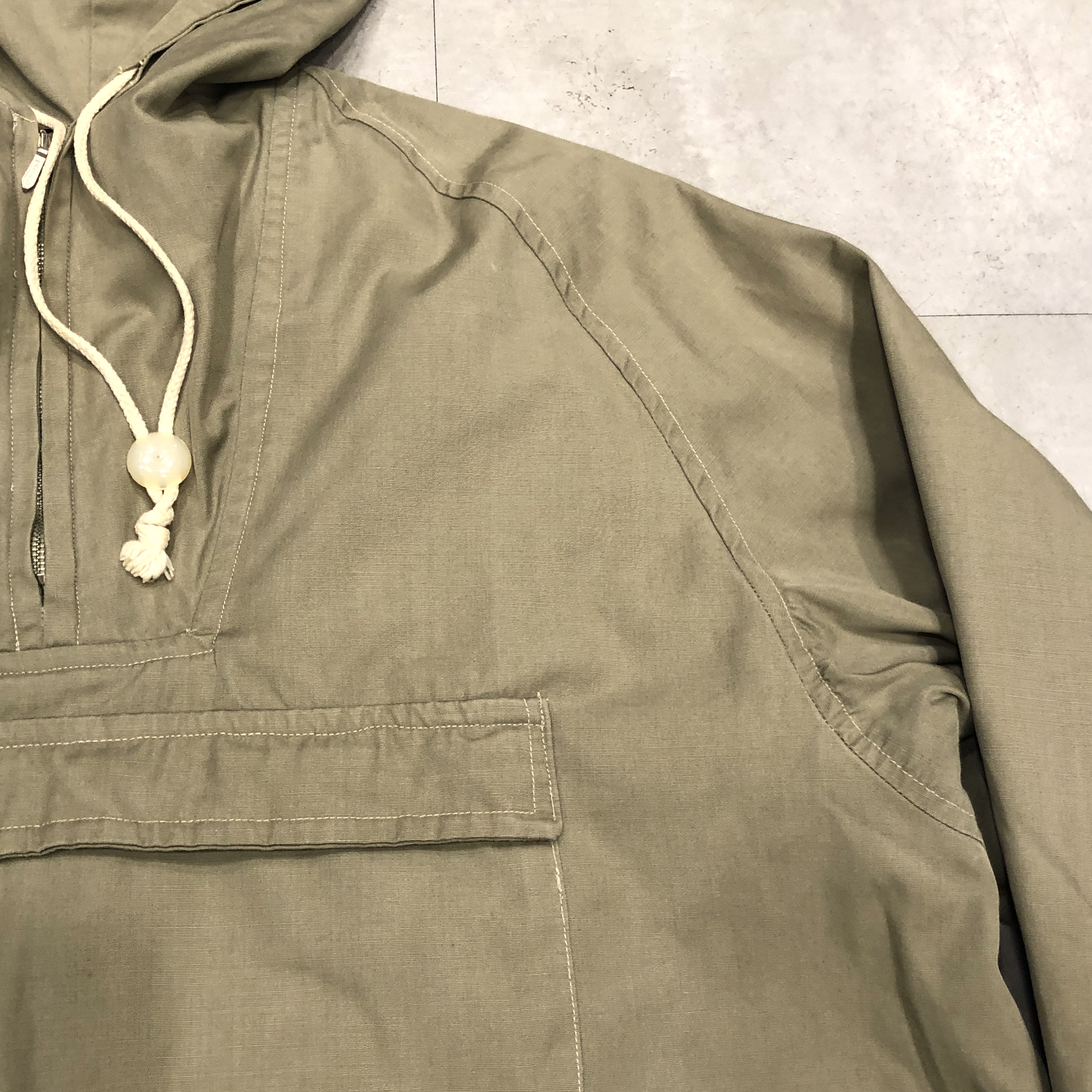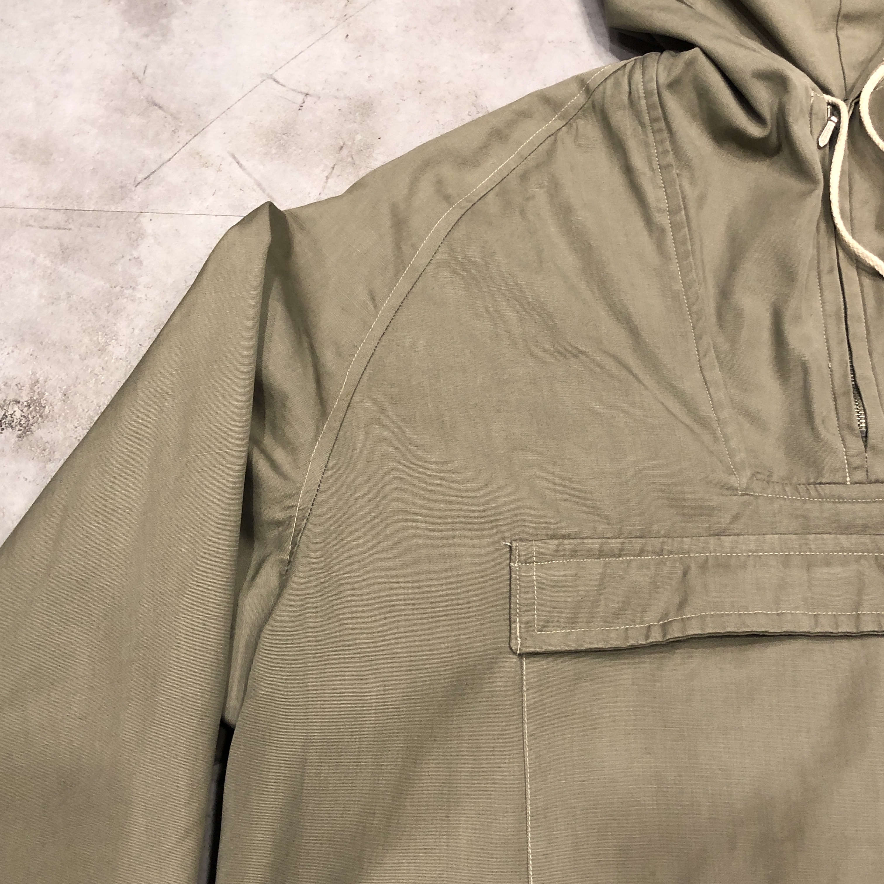 こちらは同ブランドが手掛けたプルオーバー型スモックジャケット。胸元のハーフジップにはAERO社製のメタルジップを採用し、ドローコードのディテール、二段構えのフラップポケット、そしてラグランスリーブの自然な落ち感。