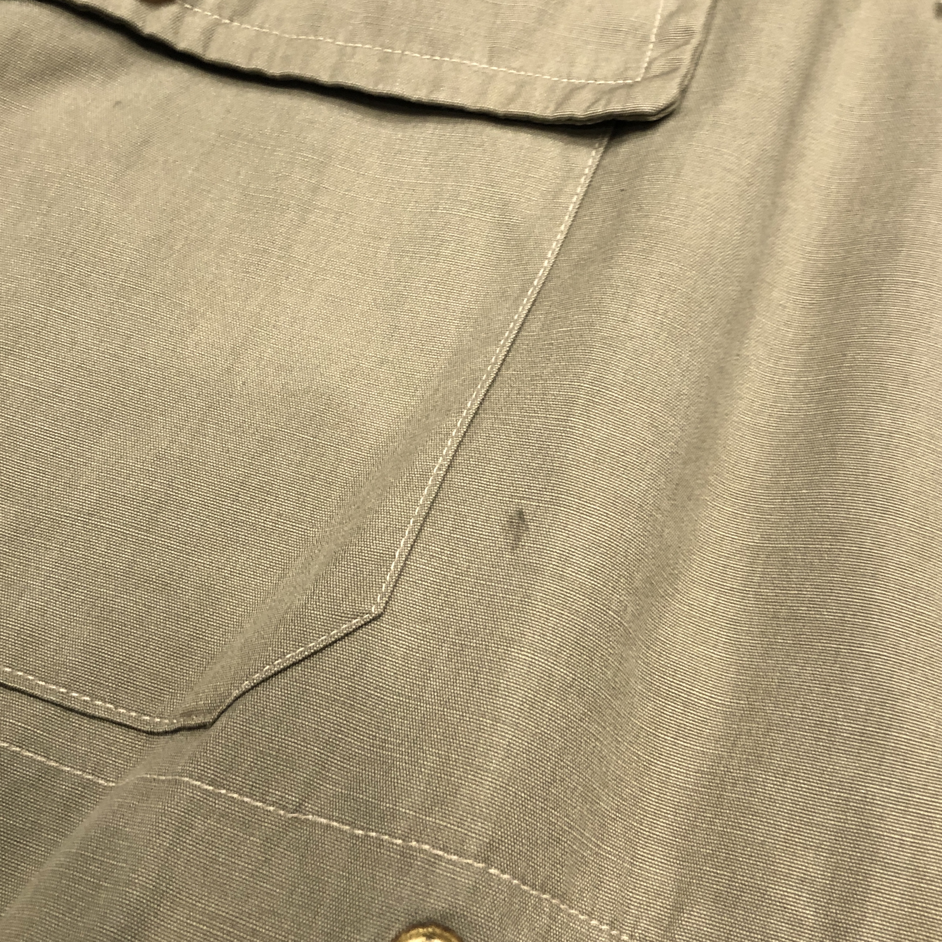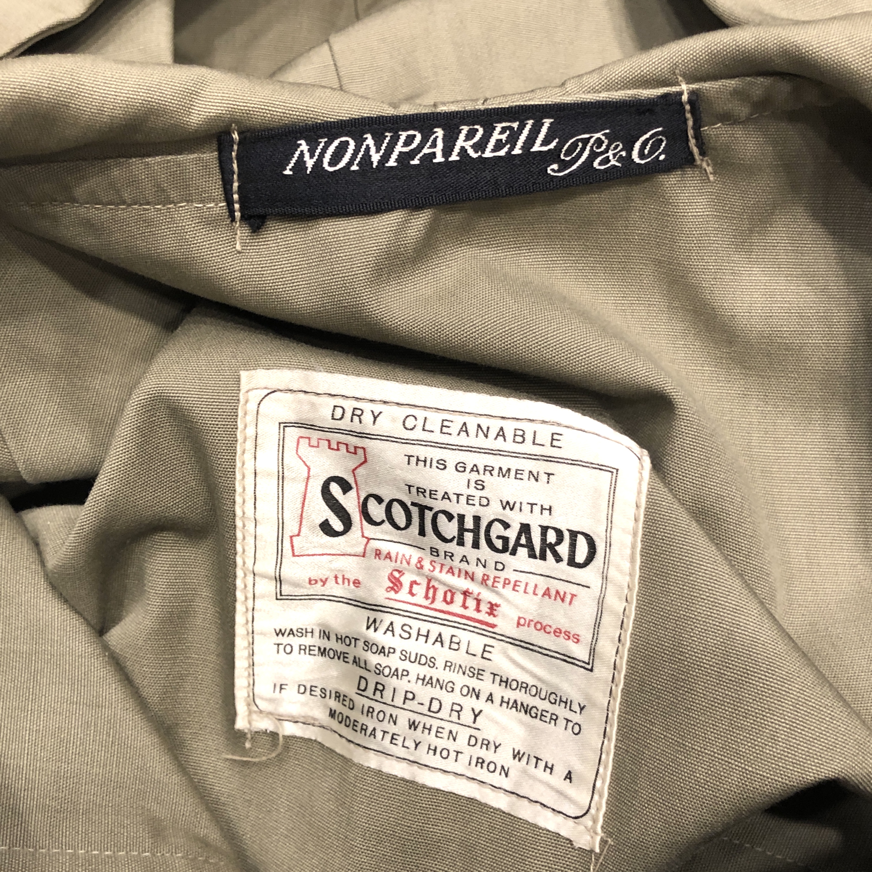 生地はScotchgard撥水加工コットン(by Schofix process)。英国特有の気候に合わせた高密度コットンクロスに撥水・防汚処理を施した、当時の最先端素材です。着込むほどに柔らかく馴染み、光の当たり方で微妙に色調が変化する独特のマットな質感は、まさにヴィンテージ・グレンフェルクロスを彷彿とさせます。