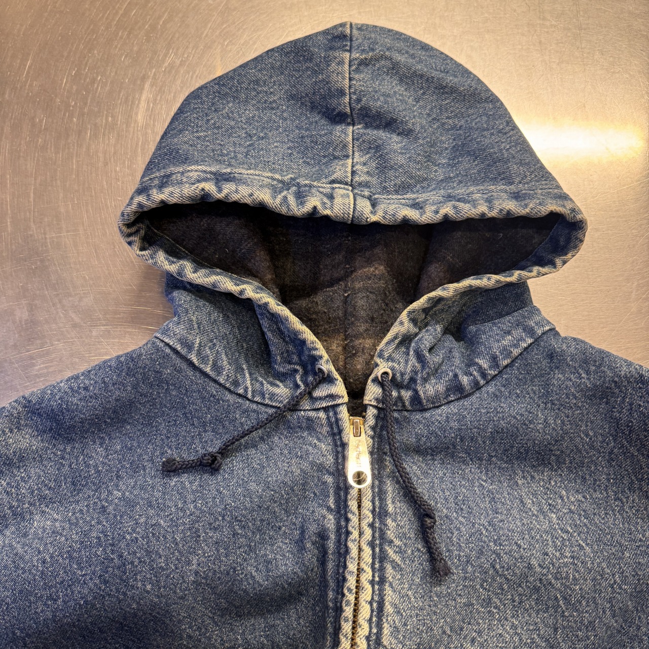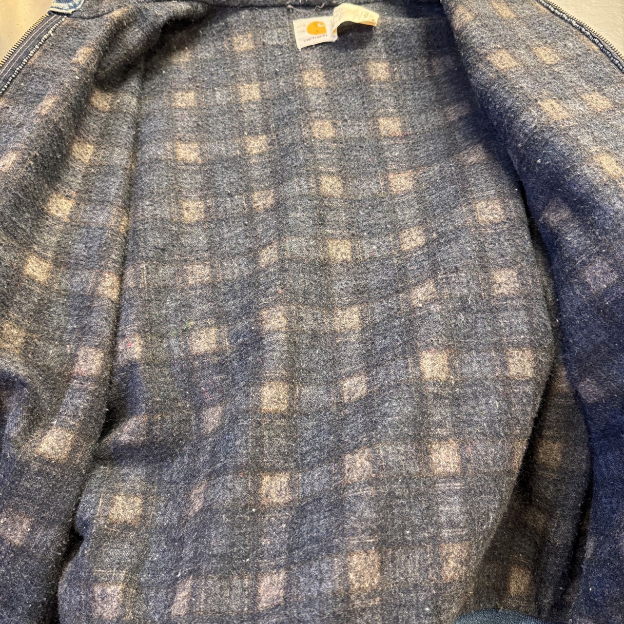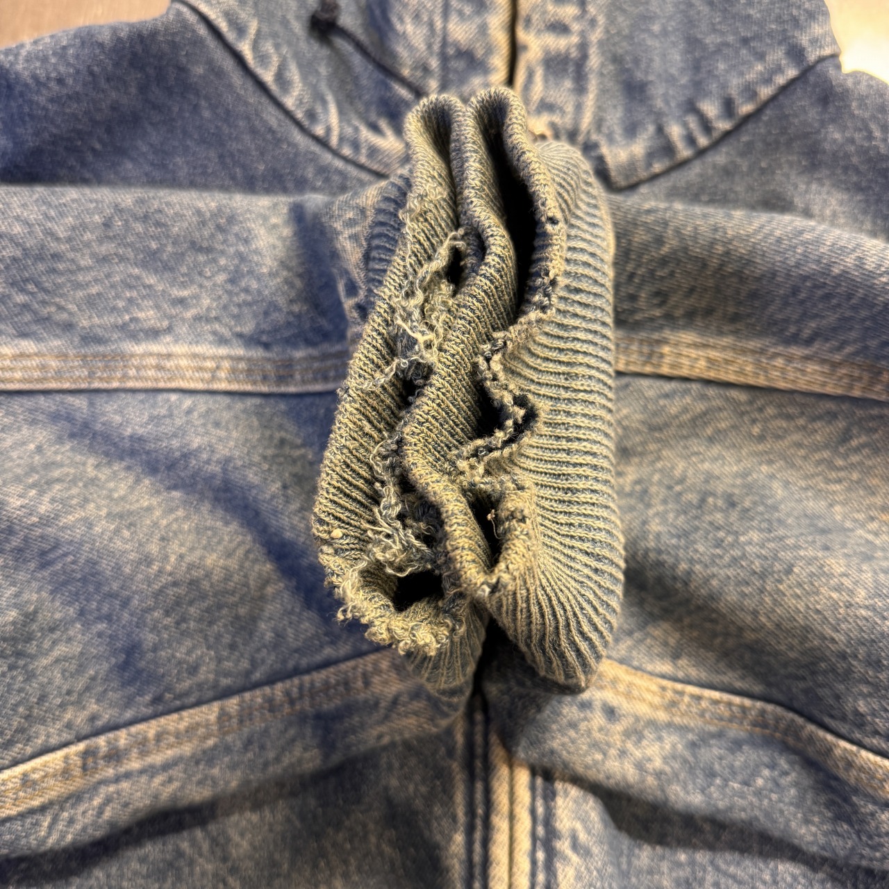 - 袖先ダメージ、袖リブの広がり、フロントにシミ、内部毛玉等の着用感がございますが、問題なく着用可能な状態です。