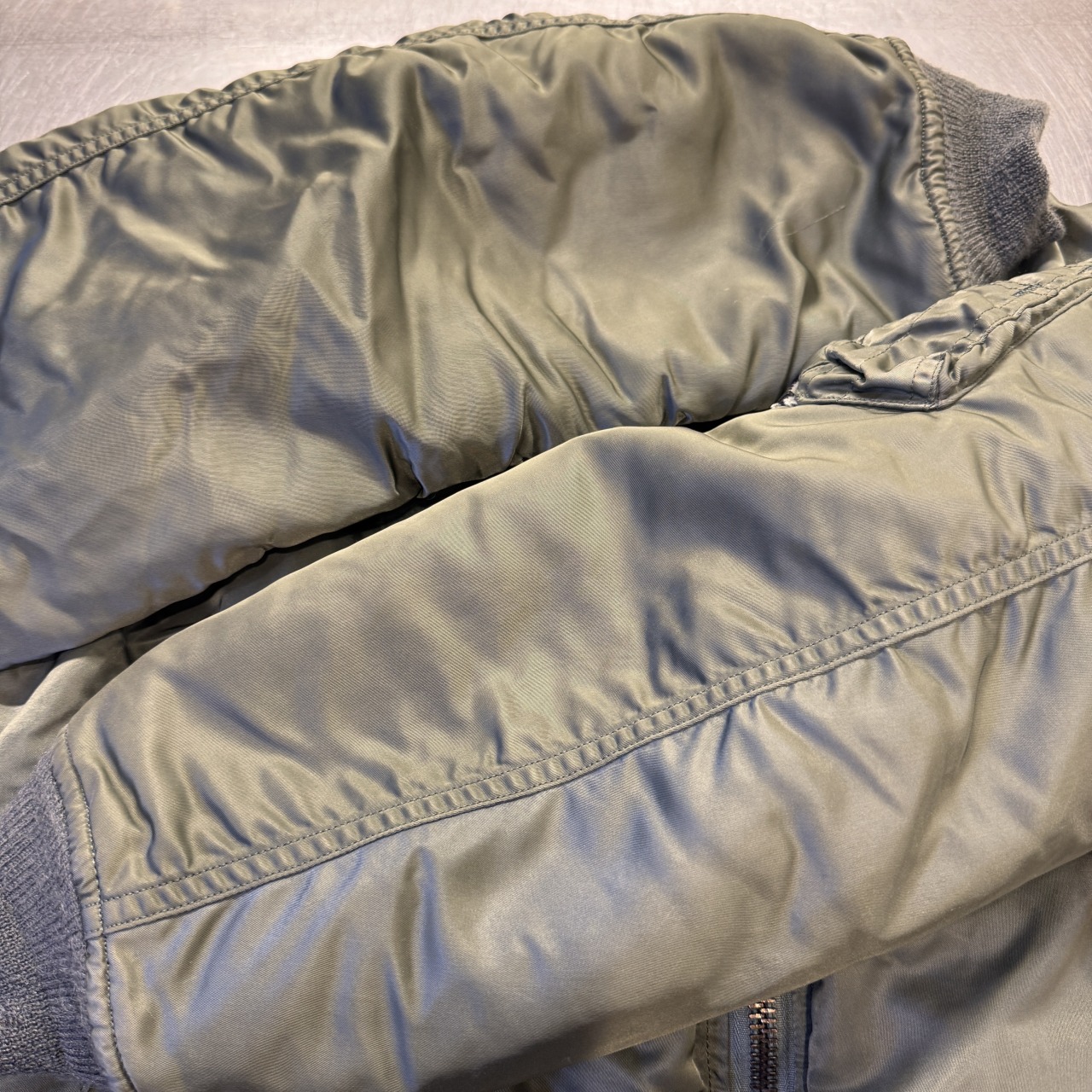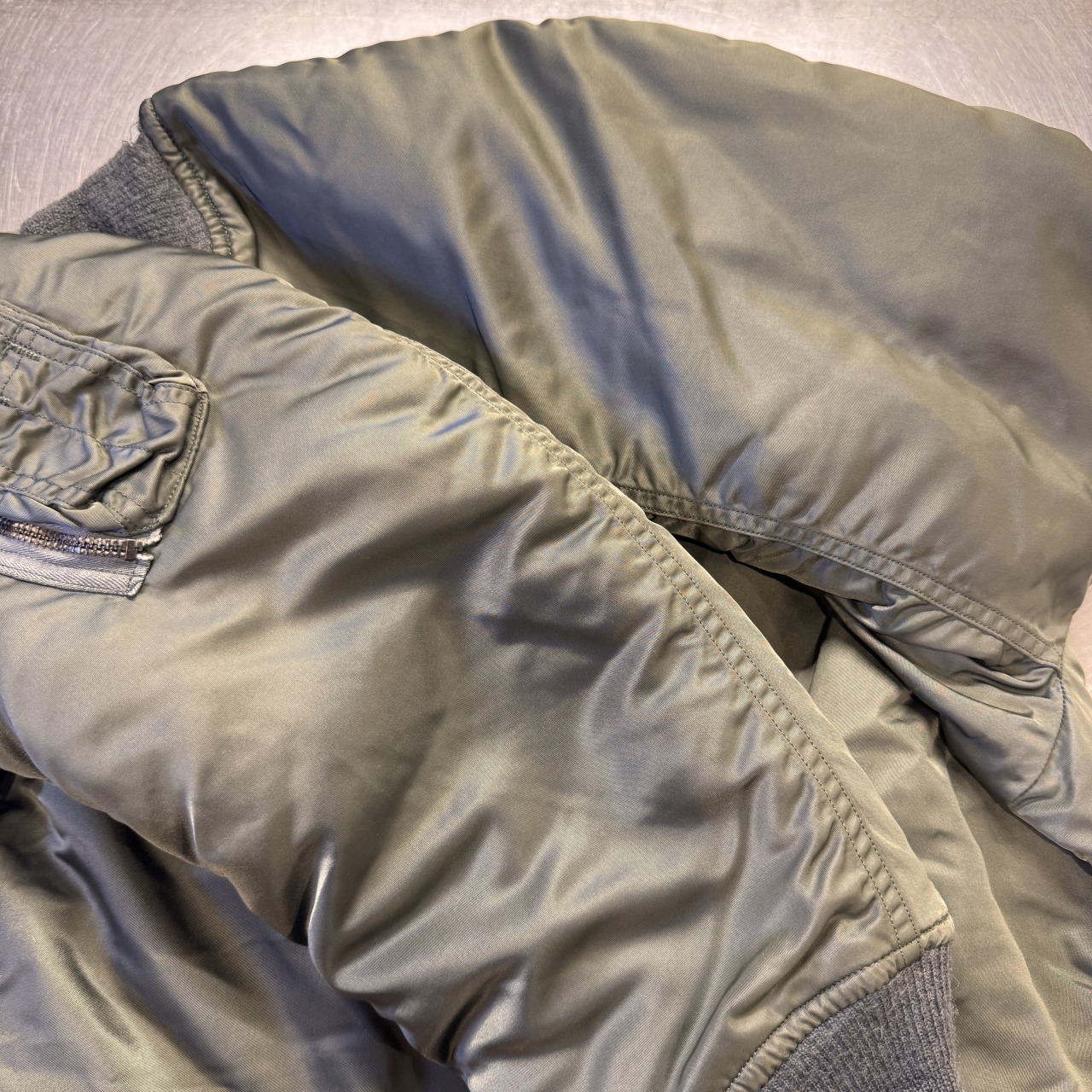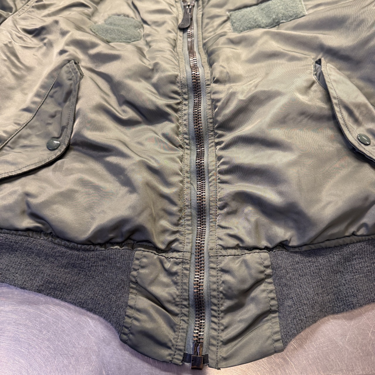 フライトジャケットといえば戦闘機搭乗員専用ですが、こちらは「グランドクルー」の文字通り地上作業を行う際に着用するモデル。表の生地と同じ色のキルティングライナーがこのモデルの最大の特徴になります!