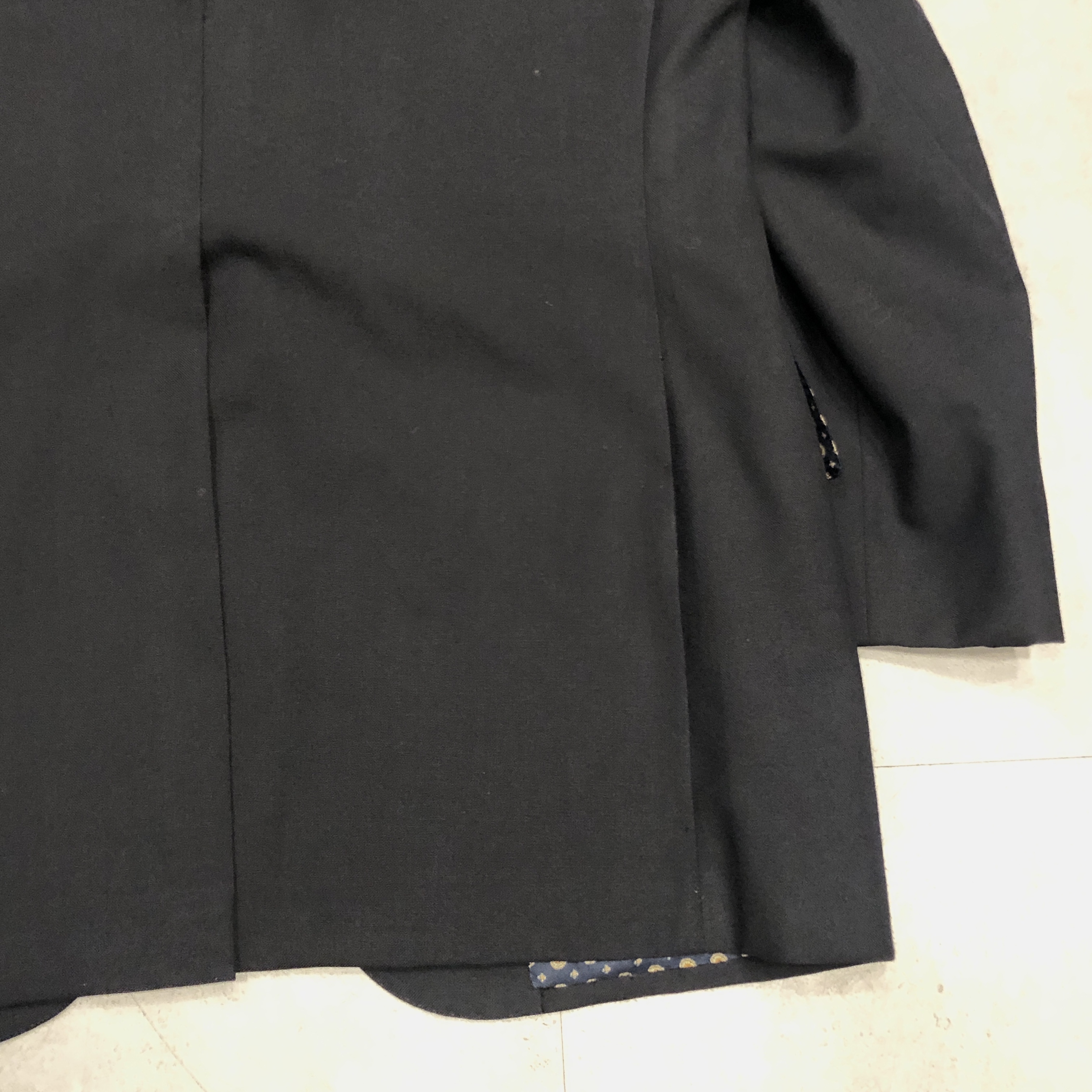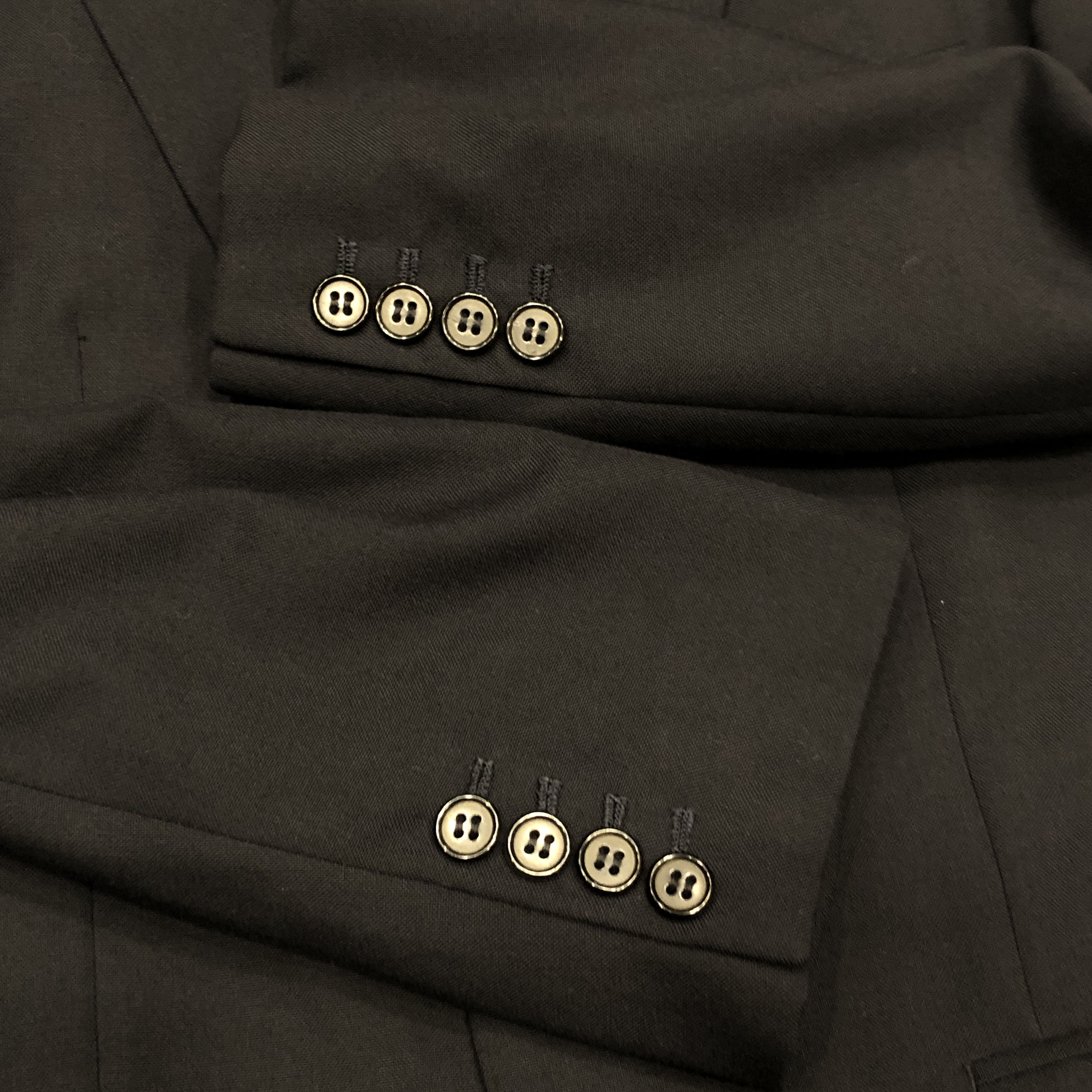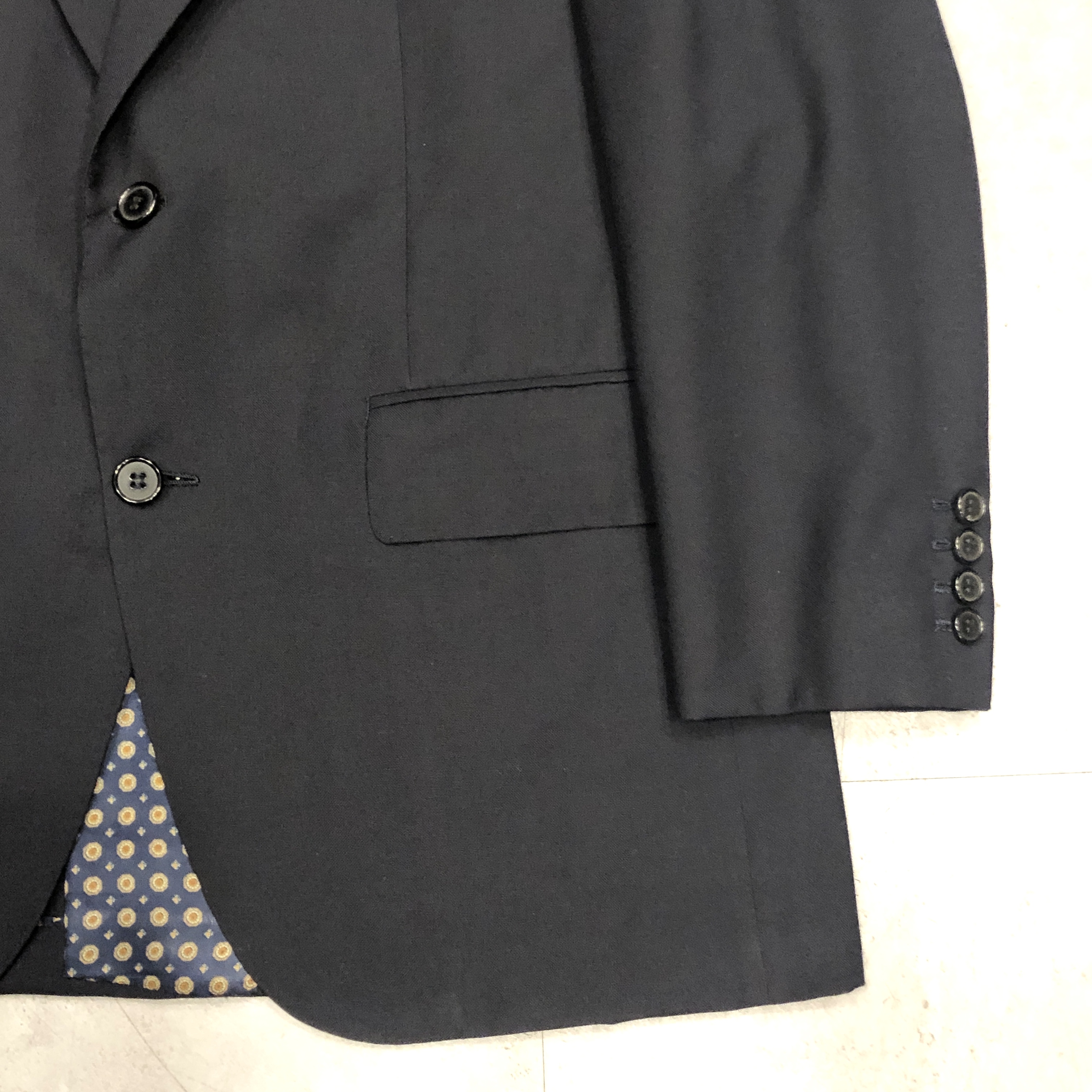 生地は英国製ピュア・ニューウール(PURE NEW WOOL)を使用。しなやかで張りのあるウール地が、構築的なショルダーラインと美しいドレープを描きます。クラシックな2ボタンのフロント、わずかにワイド気味のラペル、そしてウエストの自然なシェイプ。すべてが英国テーラリングの王道を体現しています。