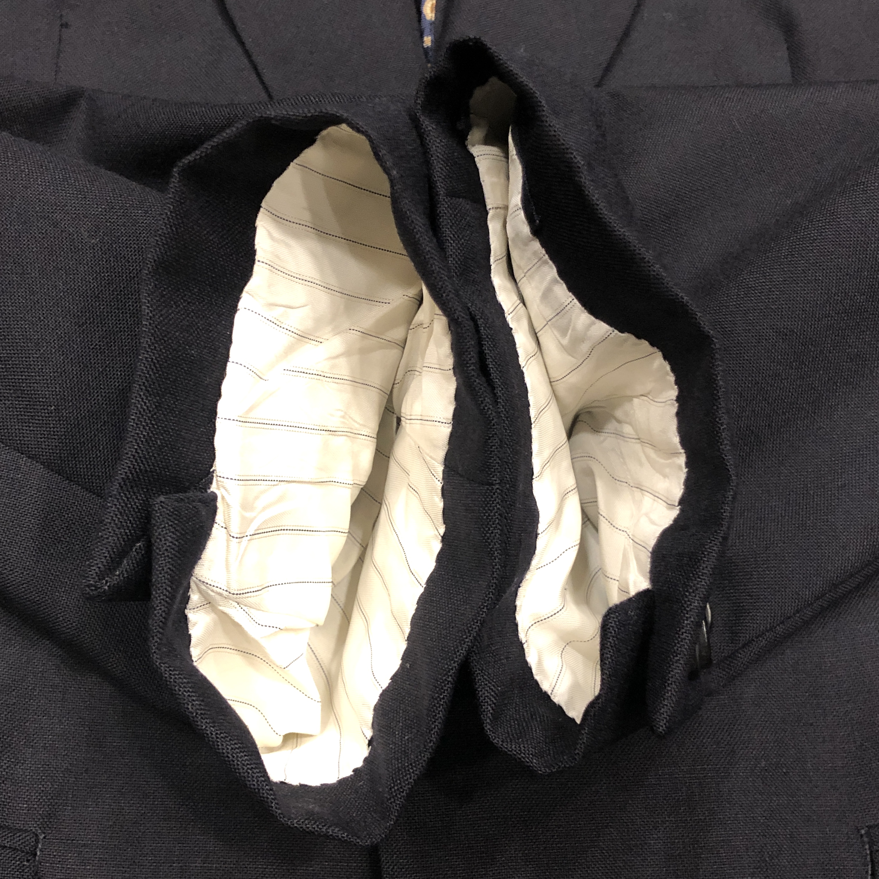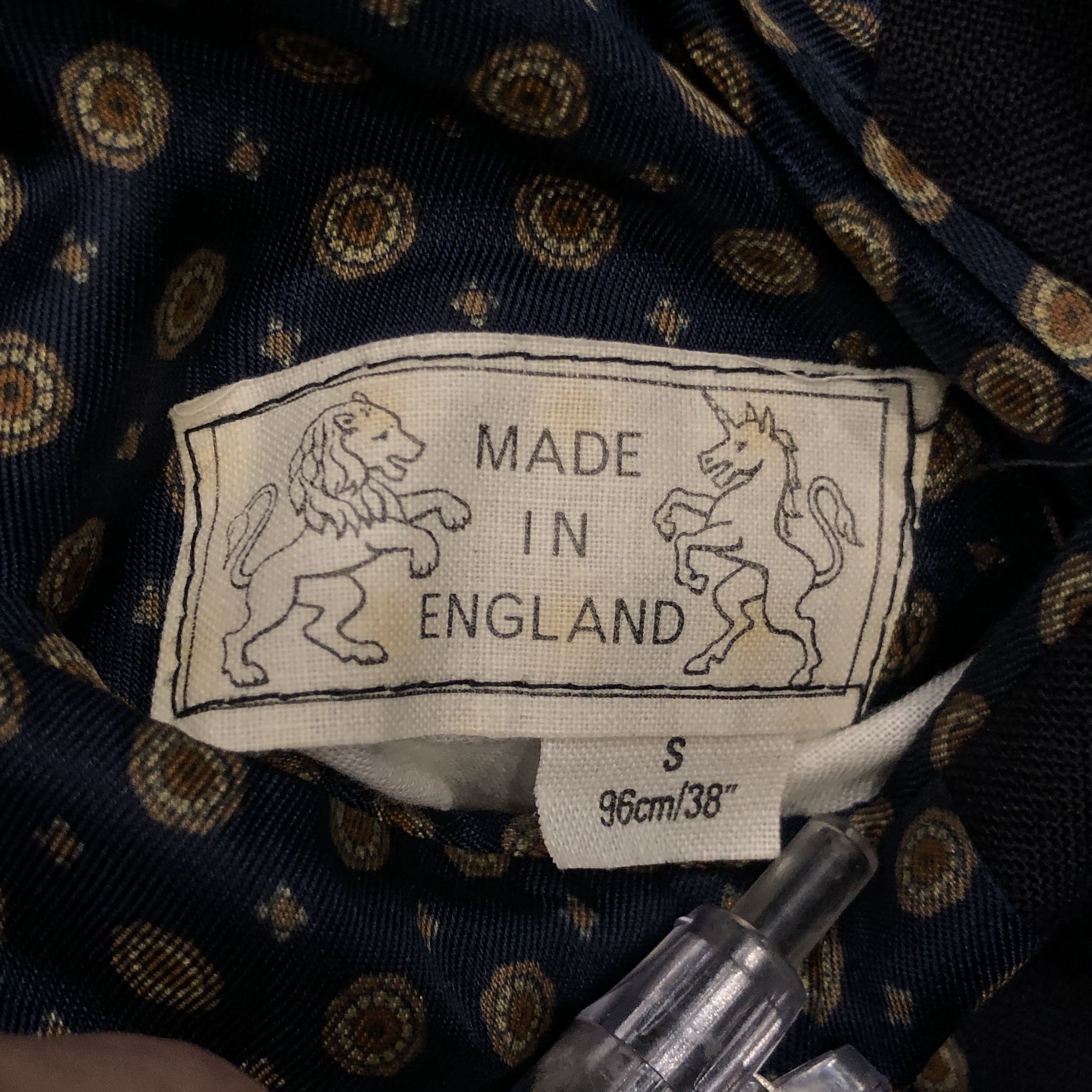 裏地には目を惹く幾何学模様の総柄サテンを配し、チェスター・バリーらしい遊び心と格式の共存を感じさせるデザイン。内側の手まつり仕上げや、ベント裏の丁寧な縫製にも、当時の職人技の粋が宿ります。