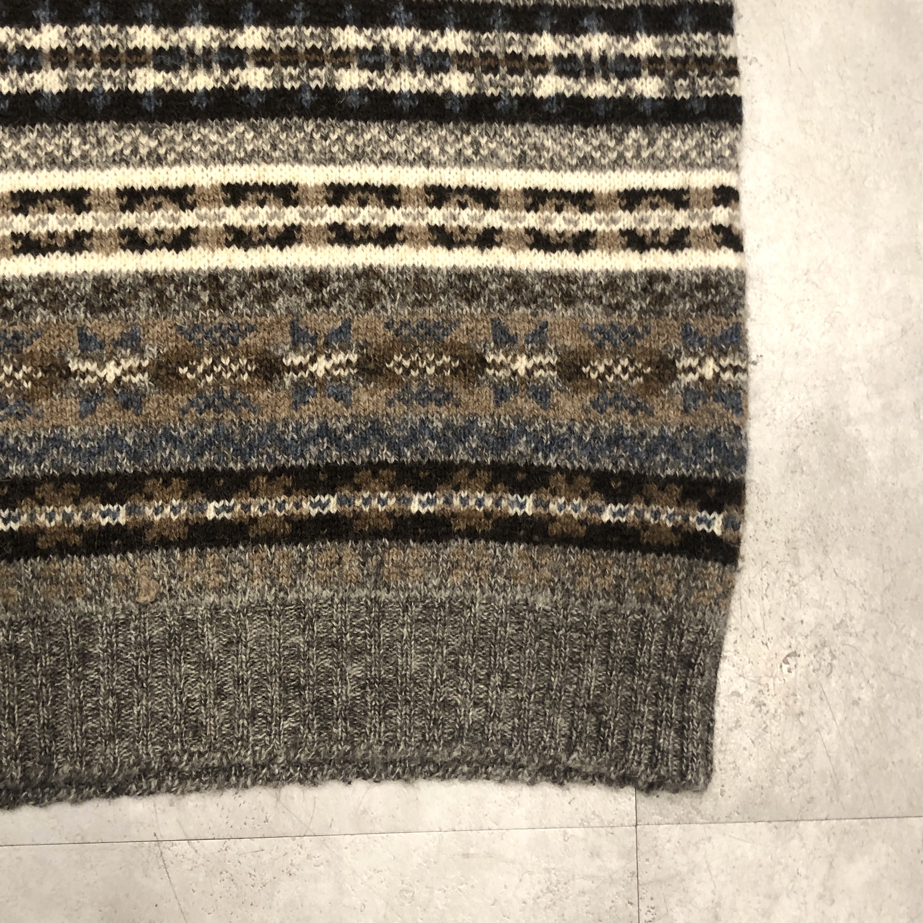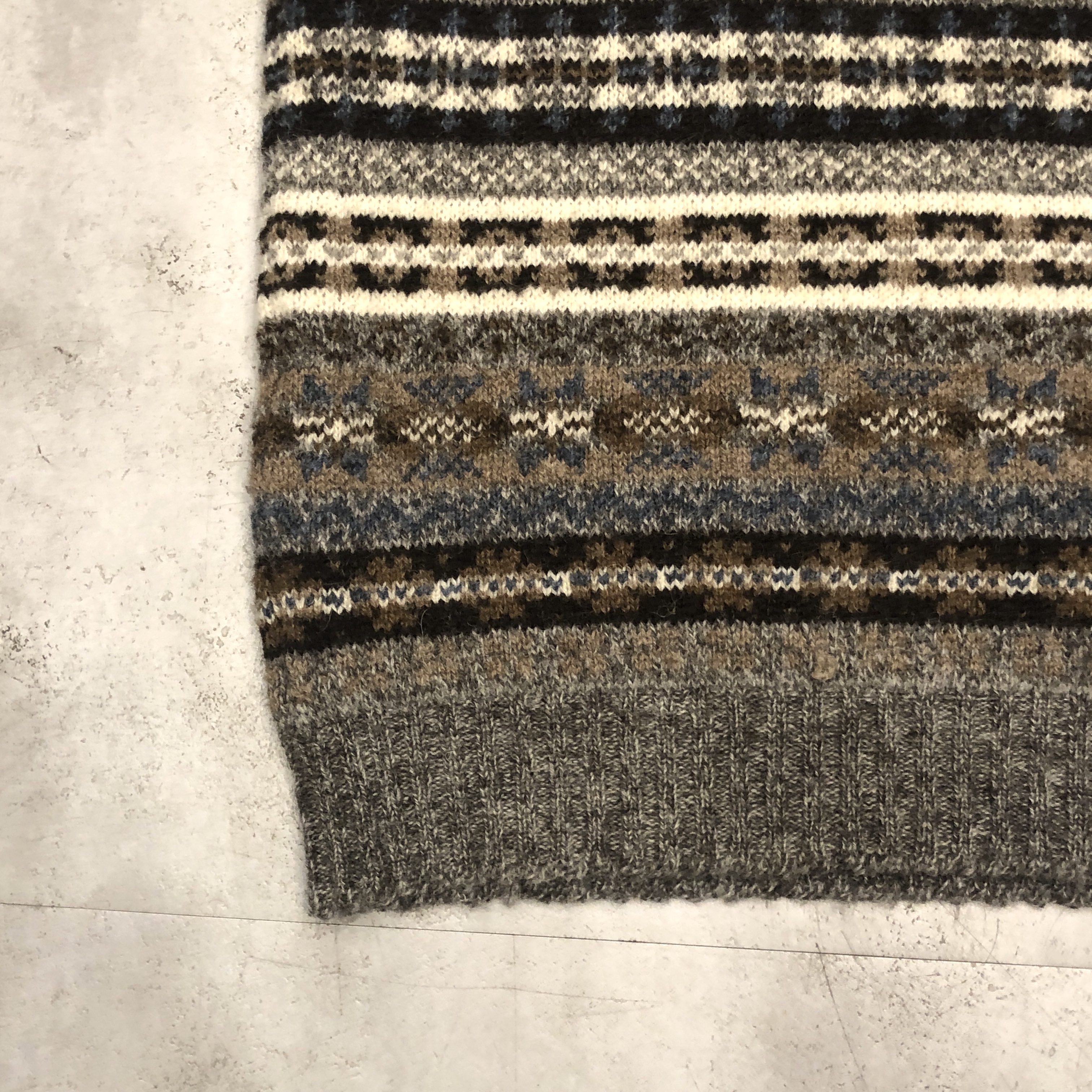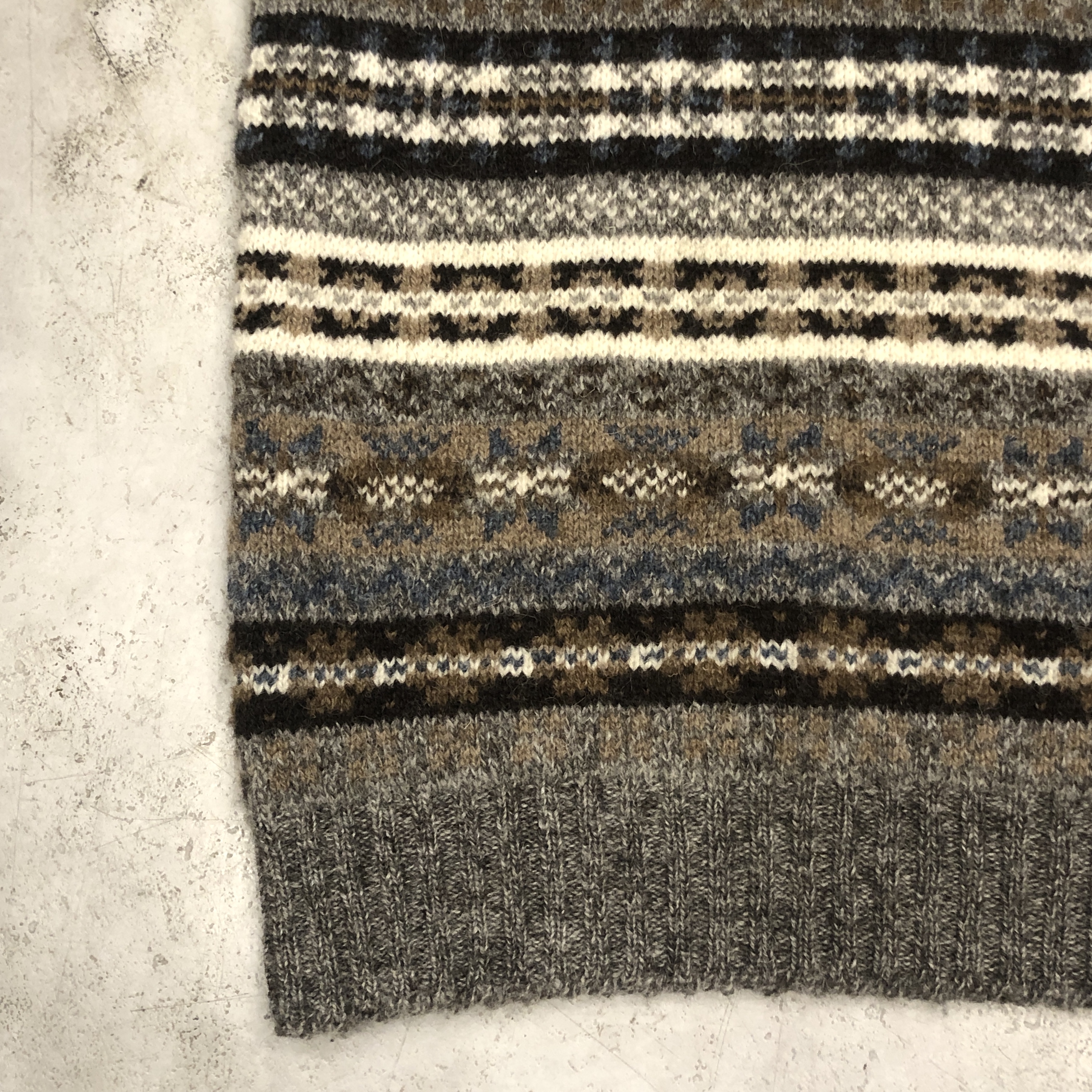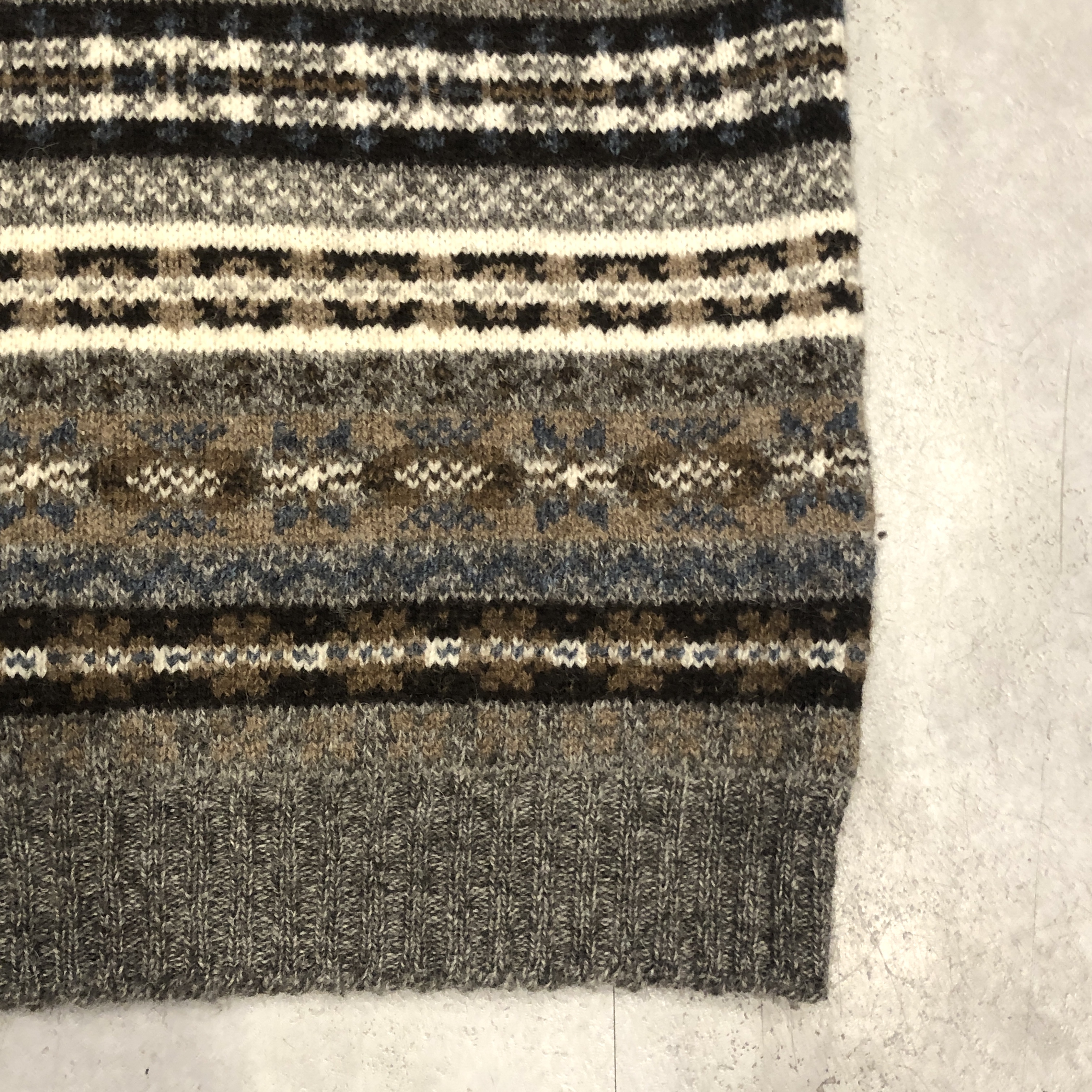 ブラウン、ベージュ、アイスグレー、ネイビーを基調にした多段のフェアアイルパターンは、自然の大地や岩肌、海霧を思わせる落ち着いたトーンで構成。派手さを抑えながらも、深い奥行きをもつ色の重なりが見事です。