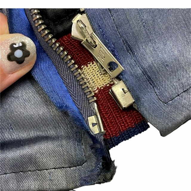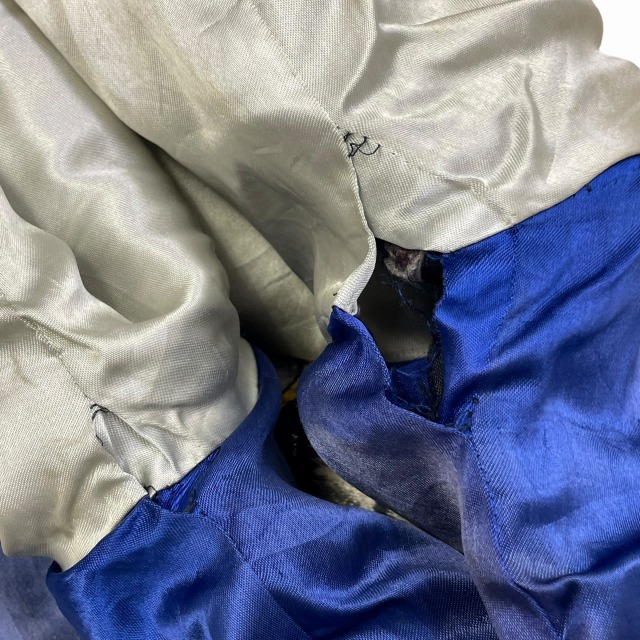 両脇、袖切替部分、ポケットスレーキ等の縫製部分にホツレがございます。