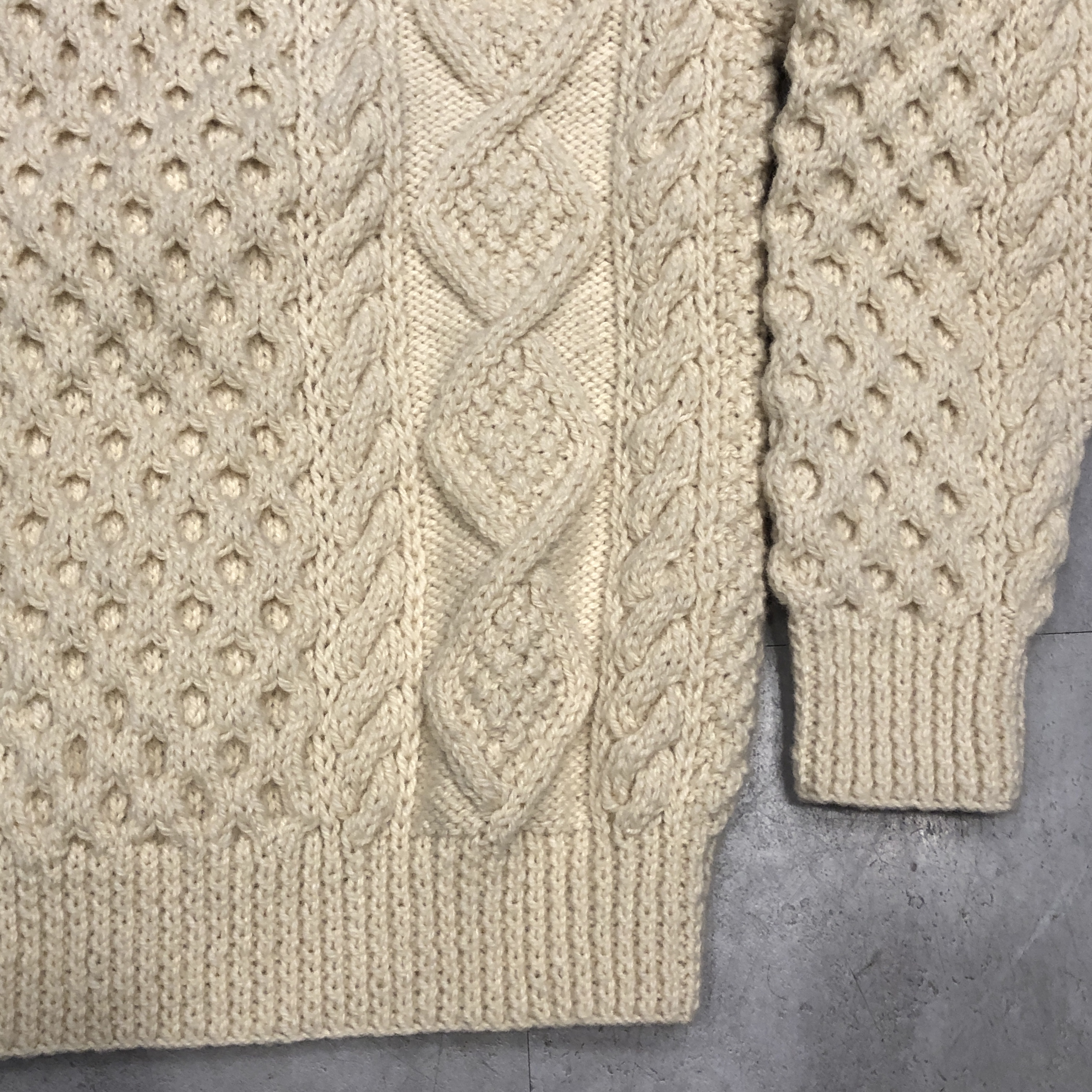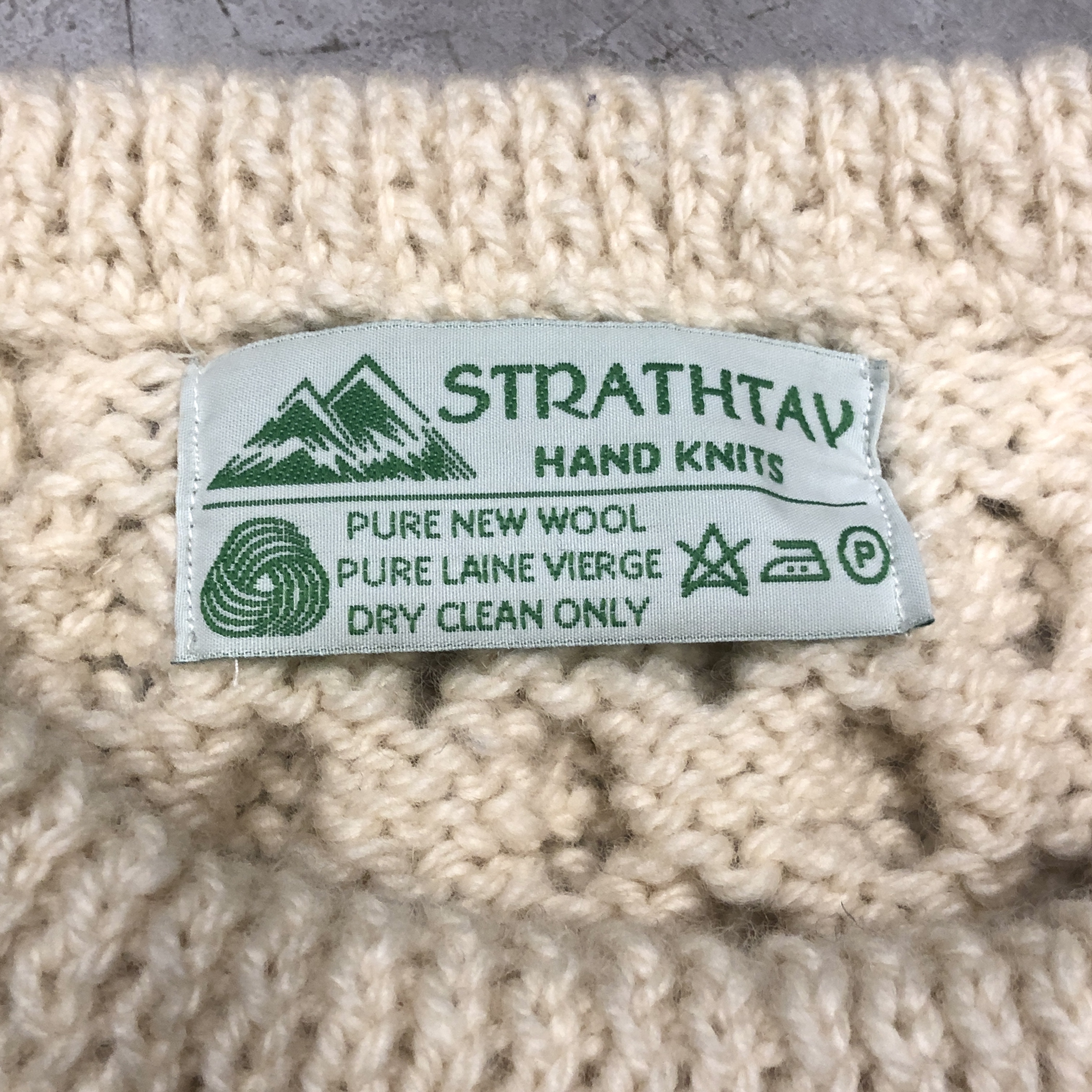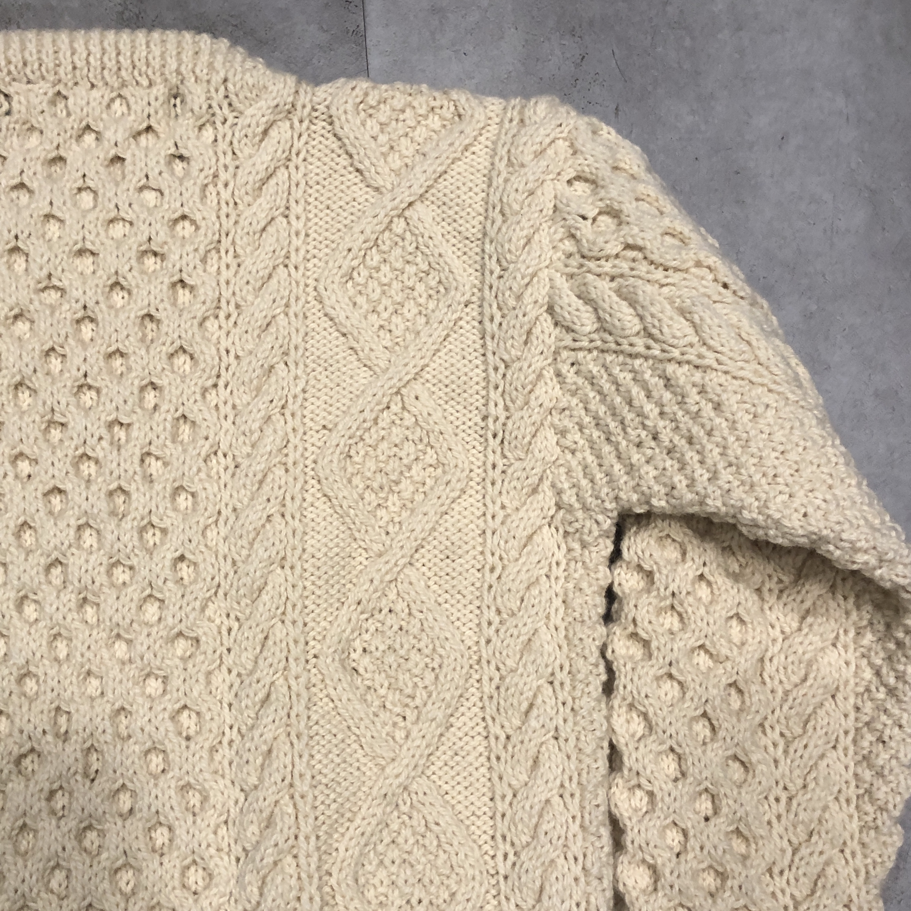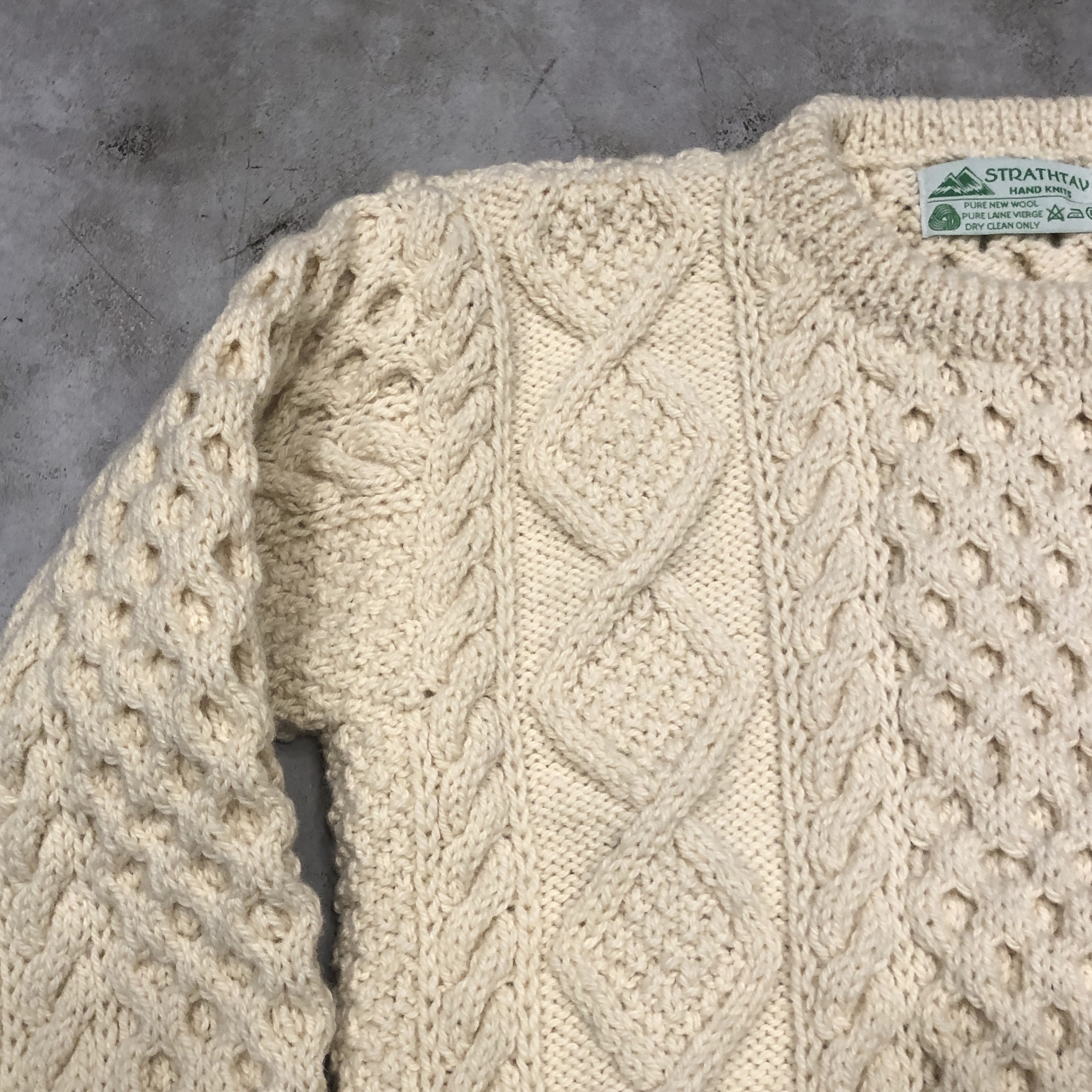 名門INVERALLANの別ラインとしてご存知の方も多い“STRATHTAY”より、ハンドニットのクルーネックセーターのご紹介です。タグからも分かる通りPURE NEW WOOLを贅沢に使用した手編み仕様で、現行のローゲージニットとは根本的に異なる、どこか素朴で原始的な温かみのある表情が魅力の一着。特筆すべきはこの密度の高いケーブル編み。前面に施されたフィッシャーマンズパターン、袖にも惜しみなく同様のパターンが入る贅沢仕様です。ふっくらと膨らむ袖のシルエットが絶妙で、アウターの中に忍ばせても存在感を発揮してくれる頼れる一枚。カラーはナチュラルな生成り色で、デニムや軍パンはもちろん、スラックスの上から合わせても上品にまとまります。このボリューム感と雰囲気をお探しだった方は是非ご検討ください。