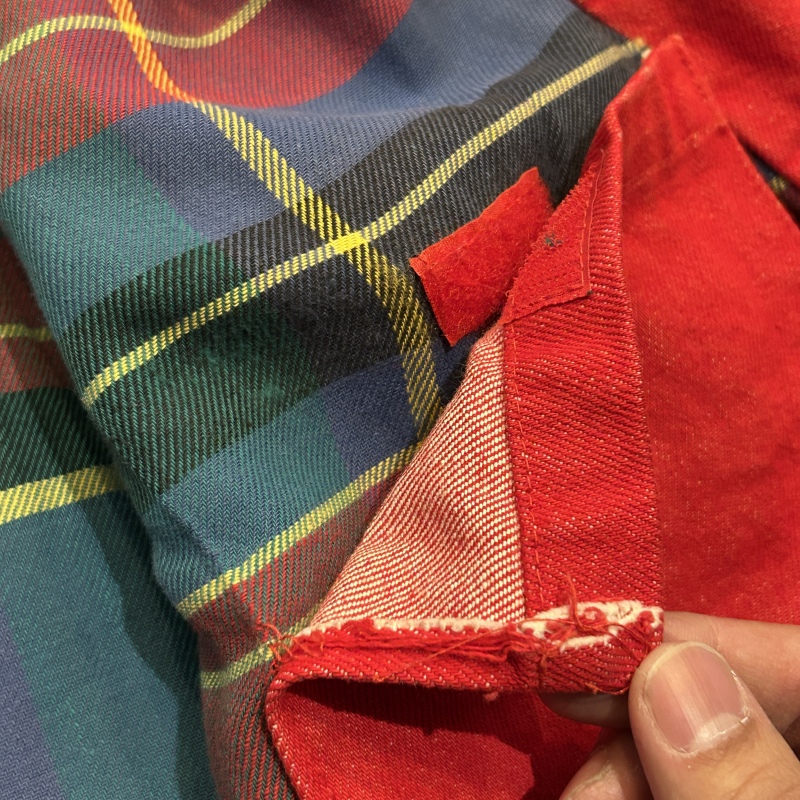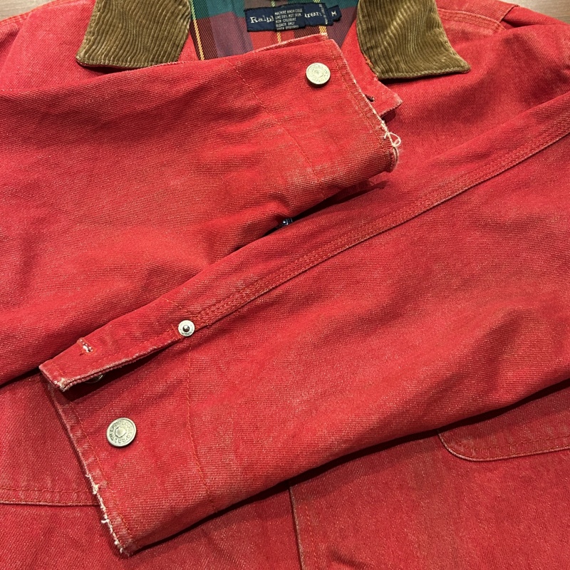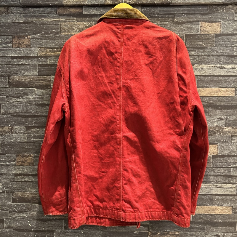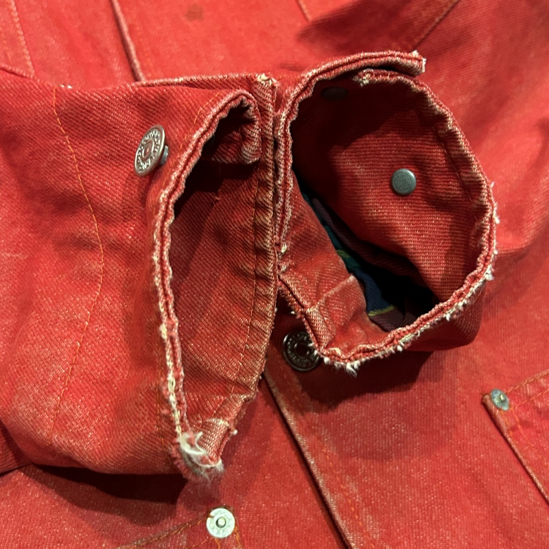 - デニム特有の色落ちやアタリ、スレ、前身頃や袖に汚れ、内ポケットのステッチ抜け等の着用感がございます。着用には問題無く古着慣れされた方におすすめです。