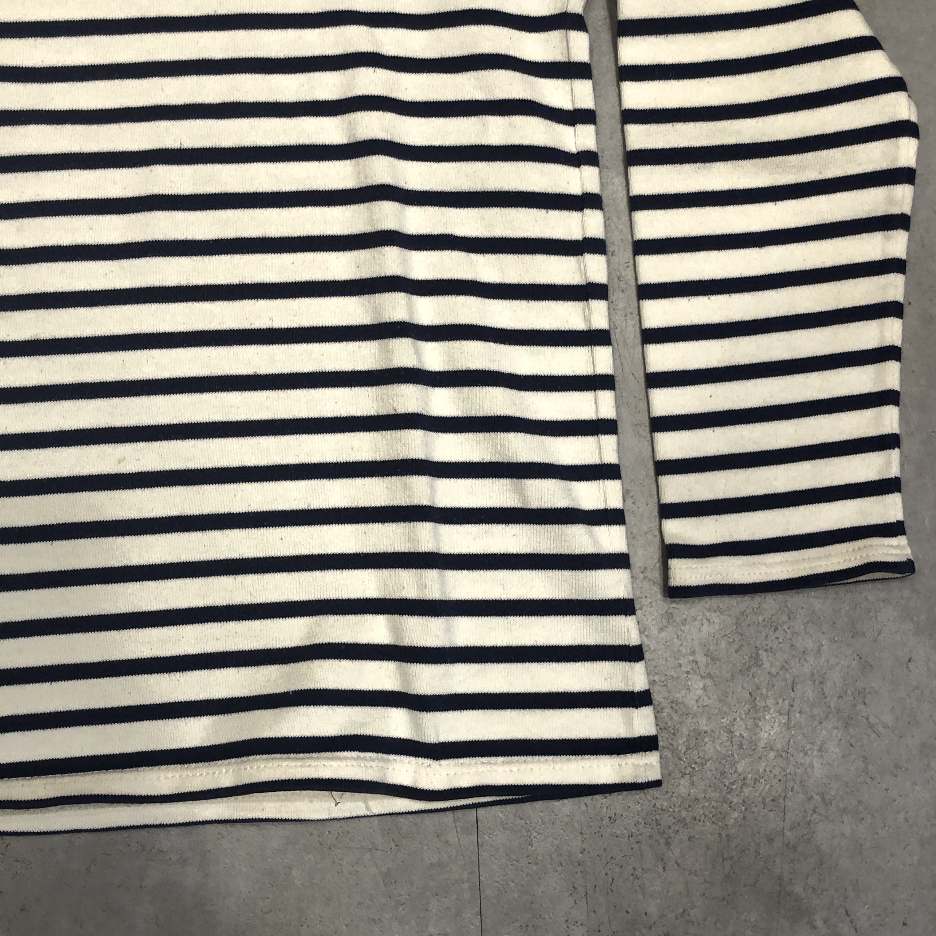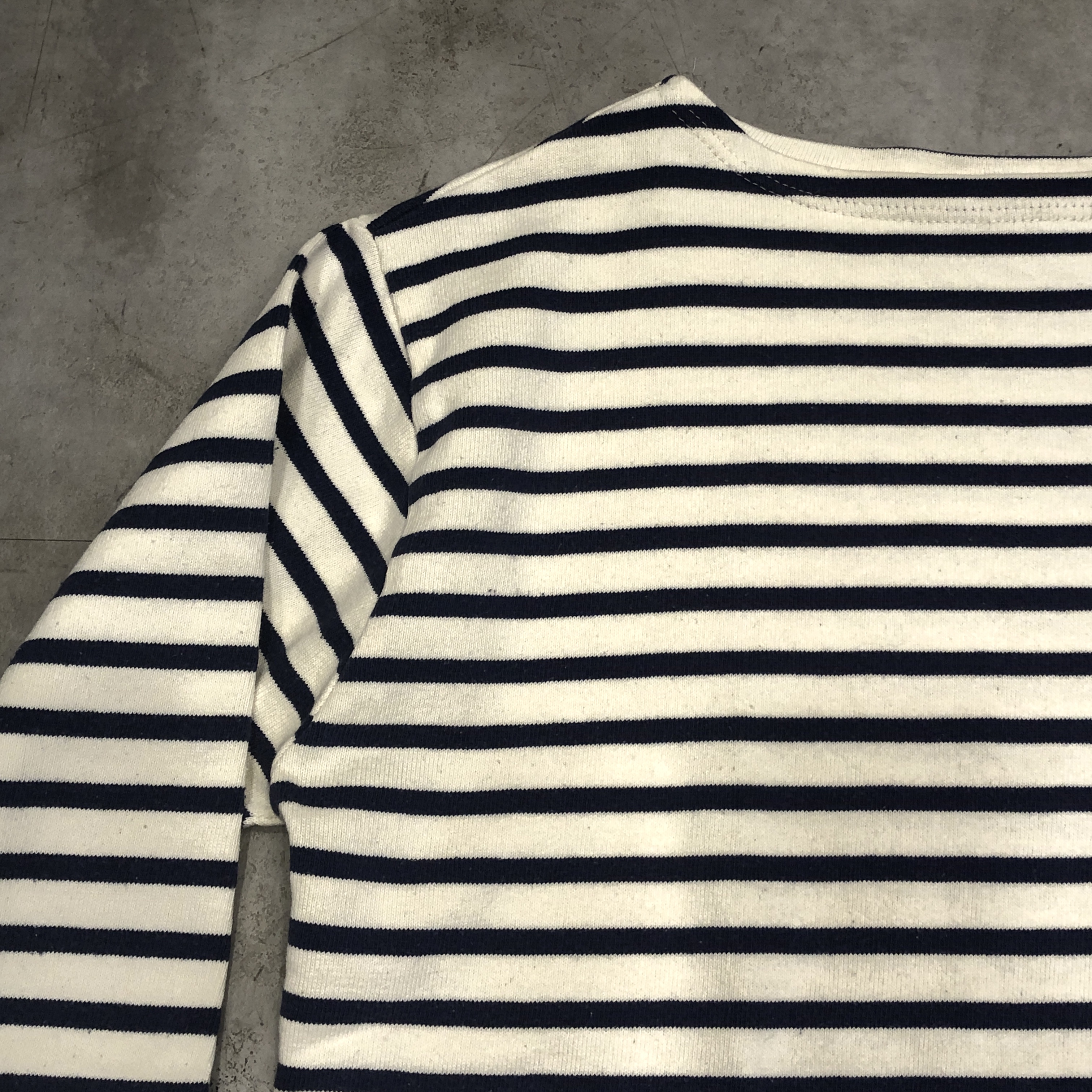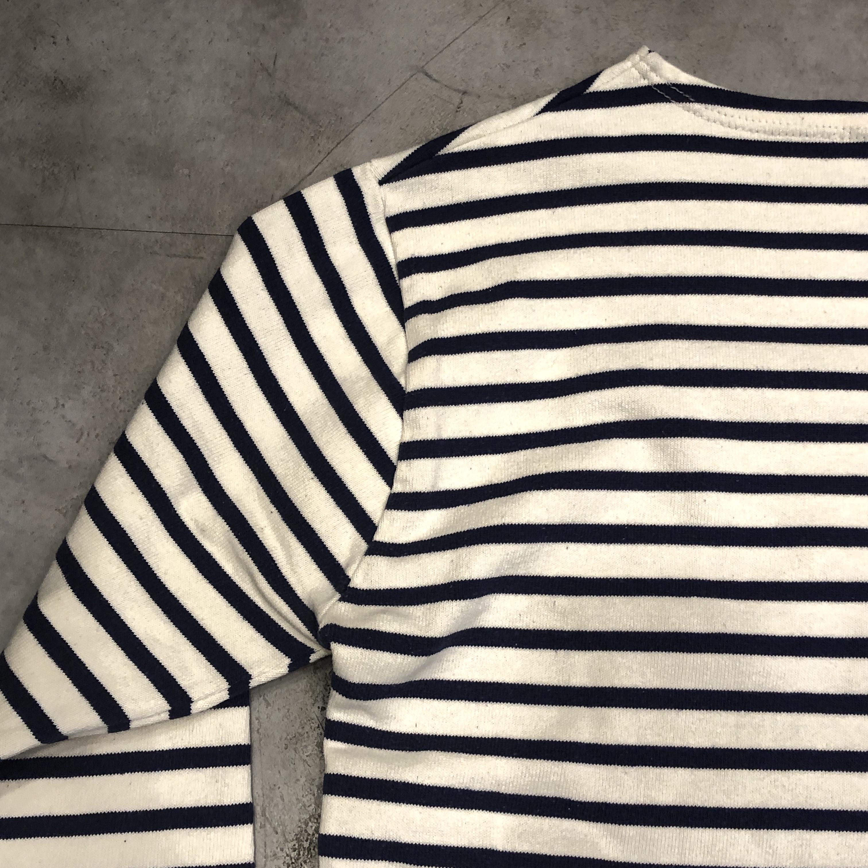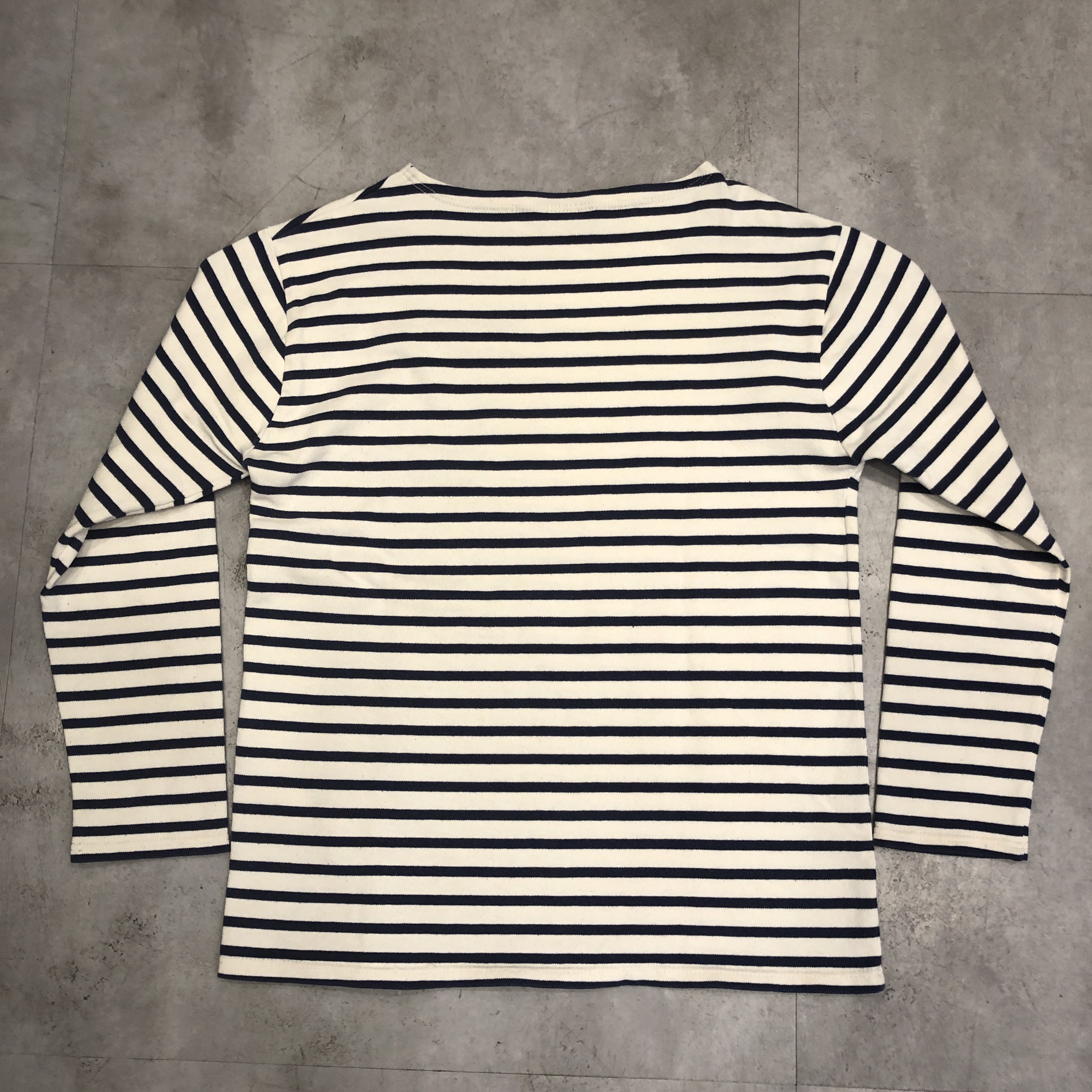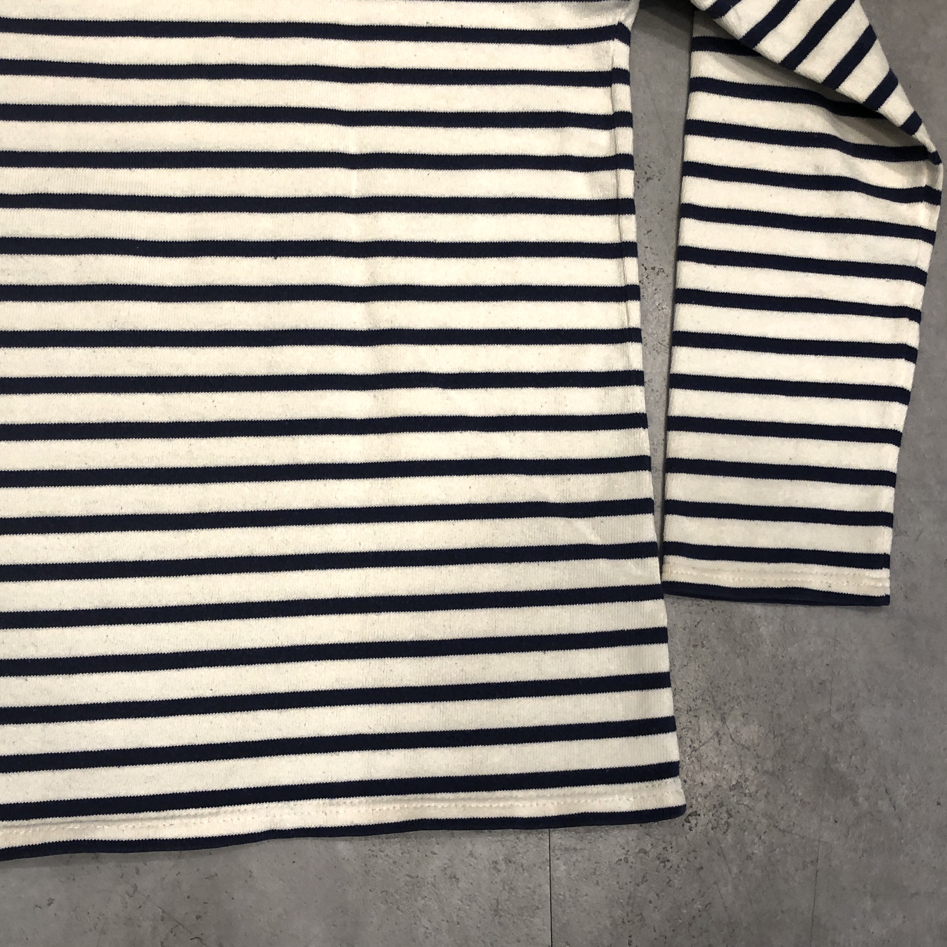 クラシックなボートネックと肩線の落ちたストレートなパターンは、重ね着にも最適。袖口にはブランドロゴのネームパッチを控えめに配置。製造はもちろんフランス自社工場で行われ、サイズはフランス表記4(国際サイズM)で、男女問わずゆとりあるシルエットを楽しめます。