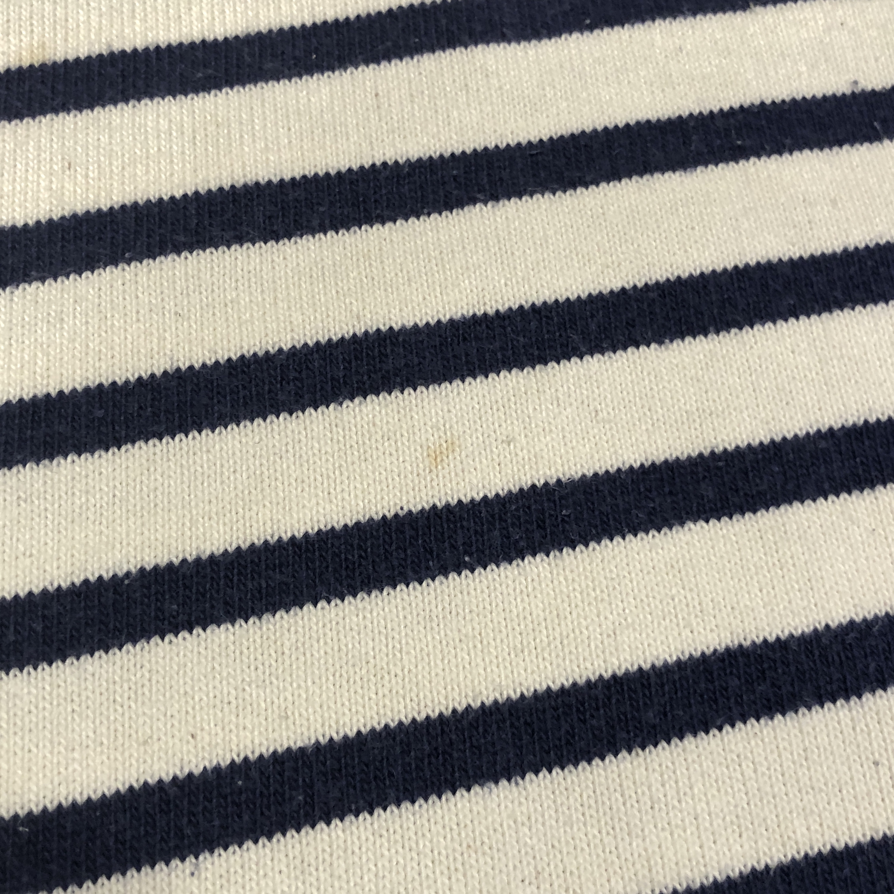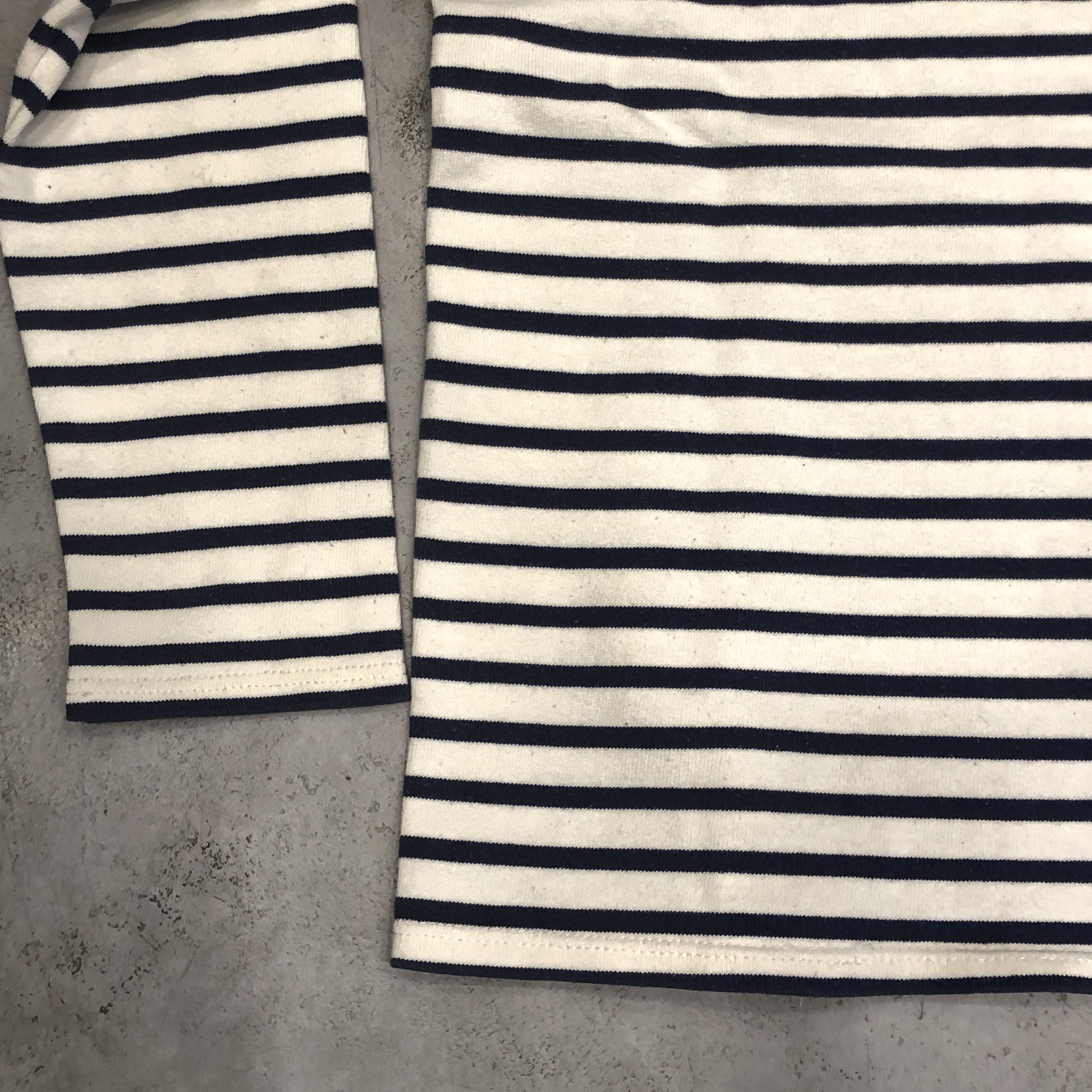 今回ご紹介するのは、落ち着いたネイビー/ ホワイトのボーダーカラー。ミリタリーやワークスタイルにも馴染み、カジュアルからシックまで幅広く対応します。素材は100%コットンの目の詰まった天竺生地。着始めはしっかりとした張り感があり、洗い込むことで徐々に柔らかく、肌馴染みの良い風合いへと育っていきます。