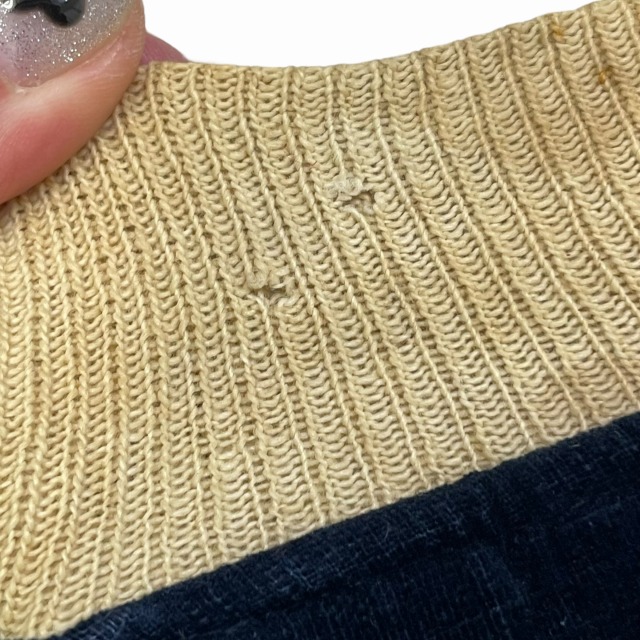 - 画像のように、汚れ、キズ、ステッチ抜けがあり、リブ部分に穴がございます。