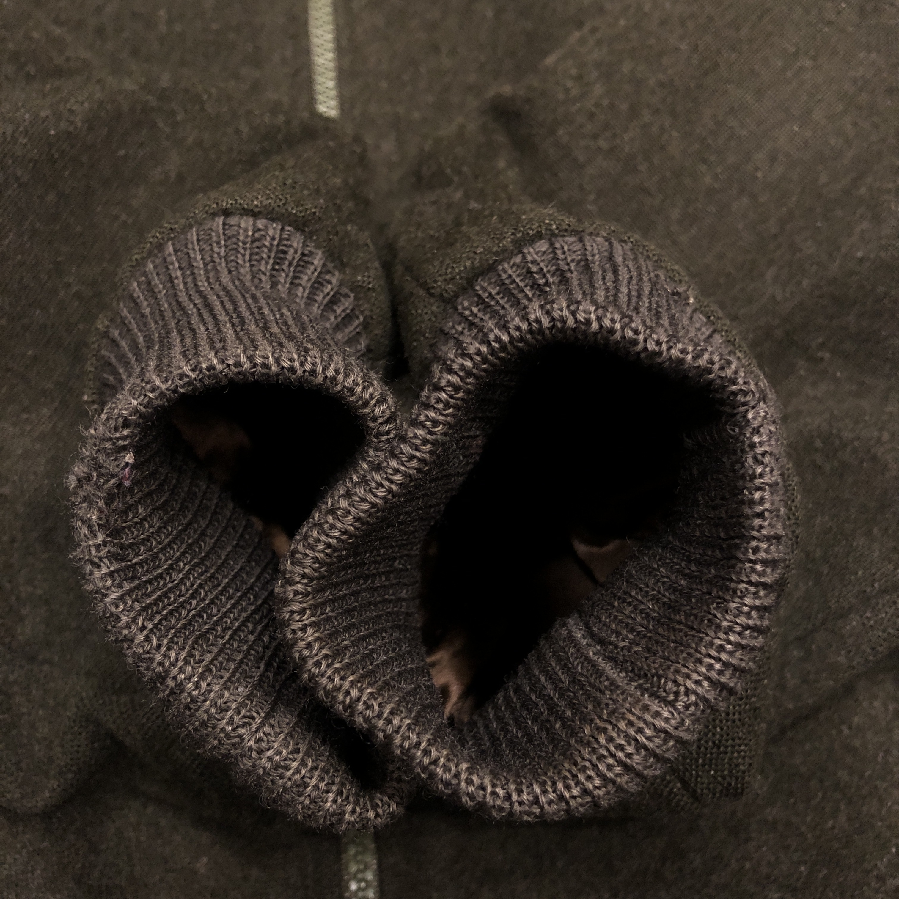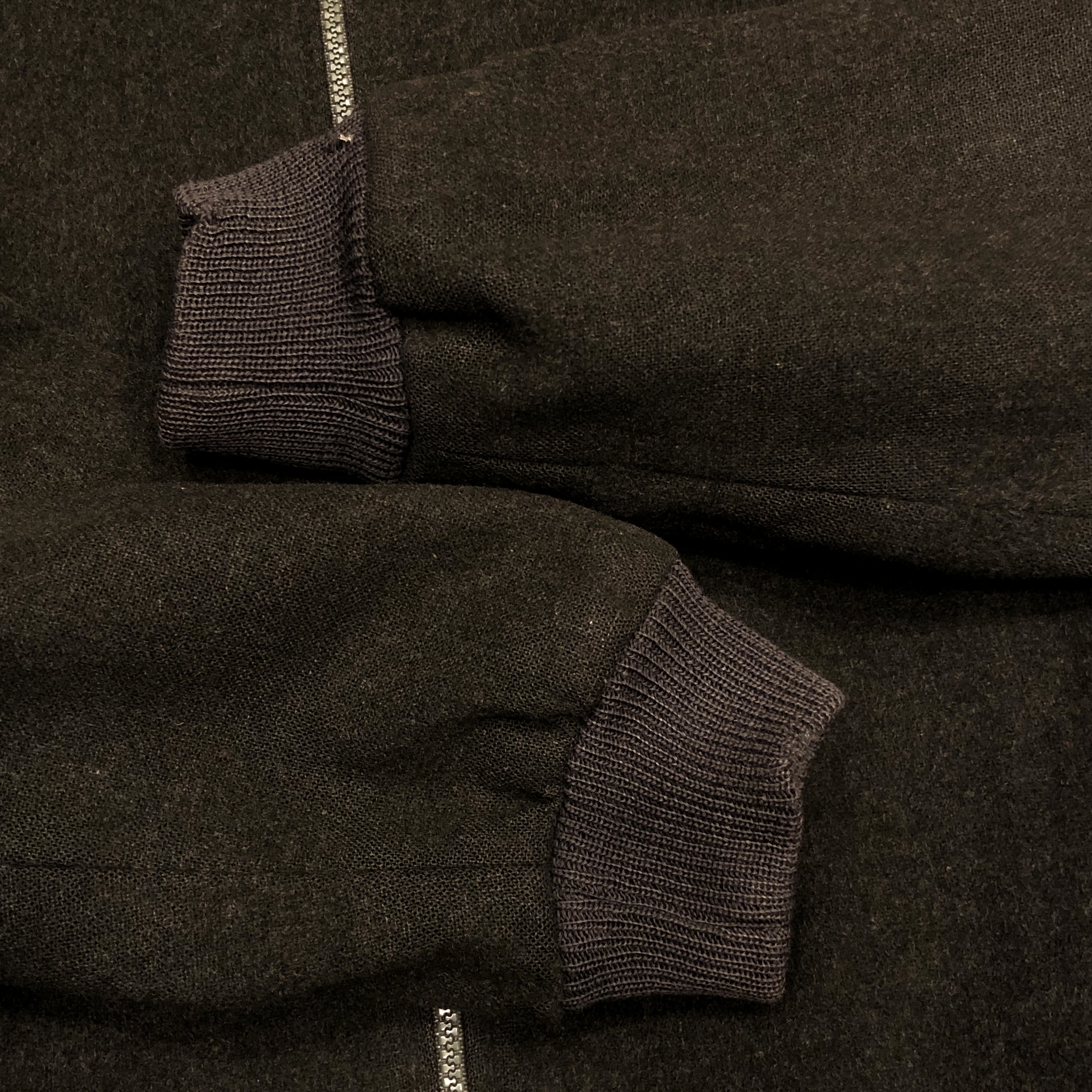 形はMA-1を思わせるリブ仕様のショートブルゾン型。しかしながら全体のシルエットは、テーラード由来の構築的なラインを描き、ミリタリーではなく“シティ・スポーツ”としての気品を宿しています。ジップにはYKK製を採用し、堅牢で無骨なアクセントを添えています。