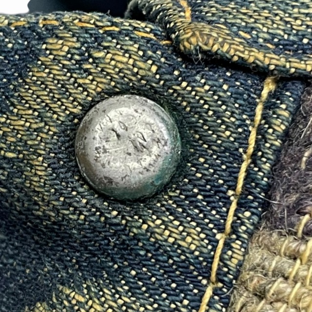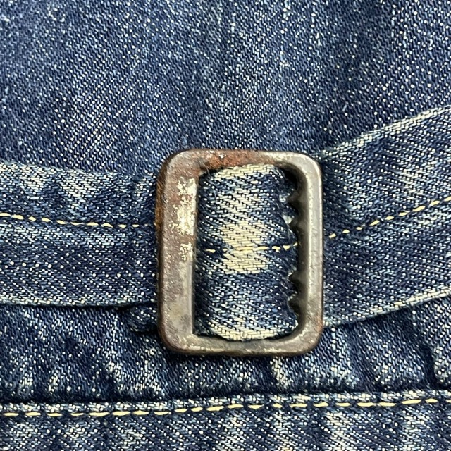 片面タブ、レザーパッチ、胸ポケット裏 ライトオンスデニム、スライド式バックル