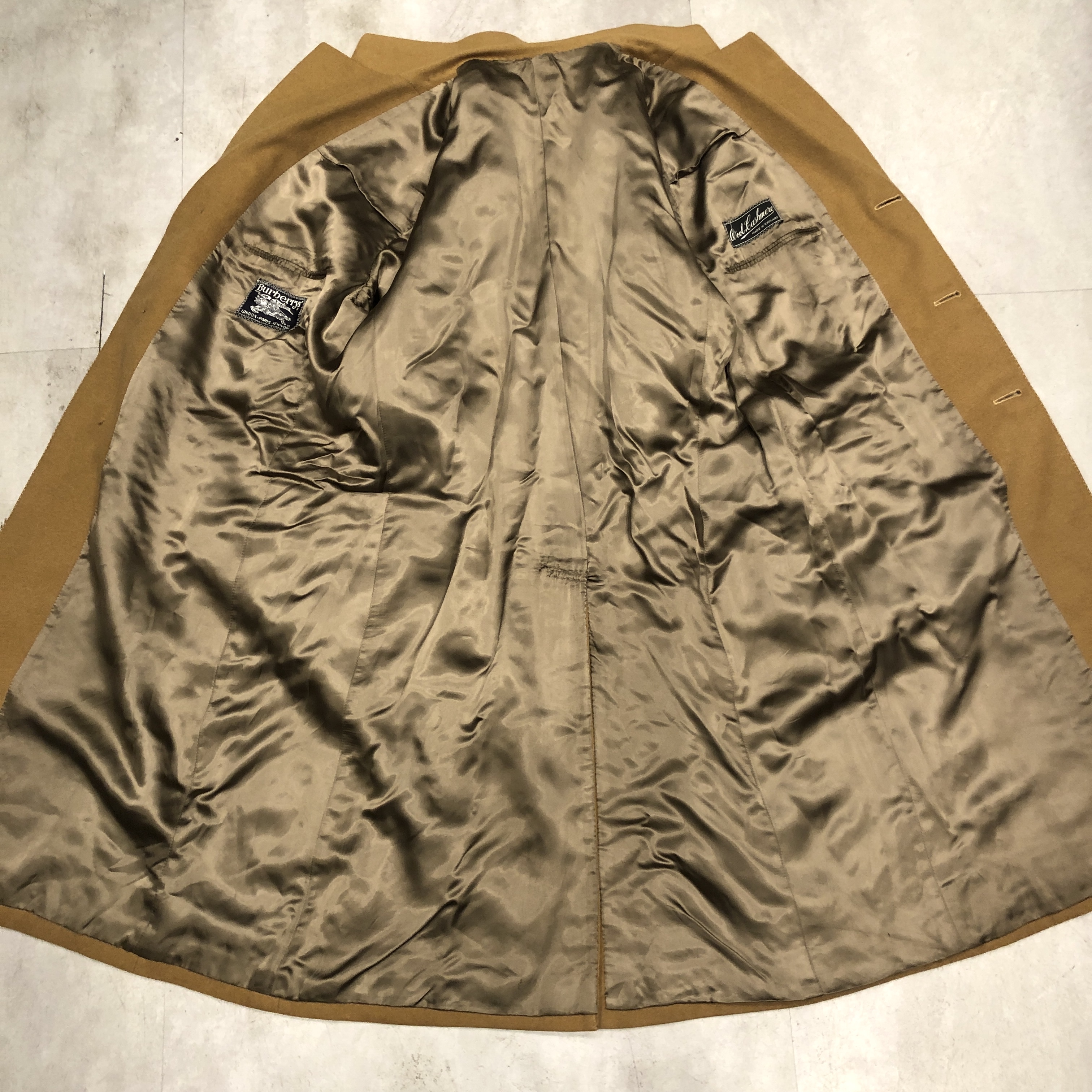 キャメル〜キャラメルに近い深みのあるブラウンカラーが美しく、シングルブレストの3ボタン仕様、ノッチドラペル、そしてチェスターコート特有の膝あたりまで届くミドル〜ロング丈のフォルムが、クラシックな佇まいを醸し出しています。