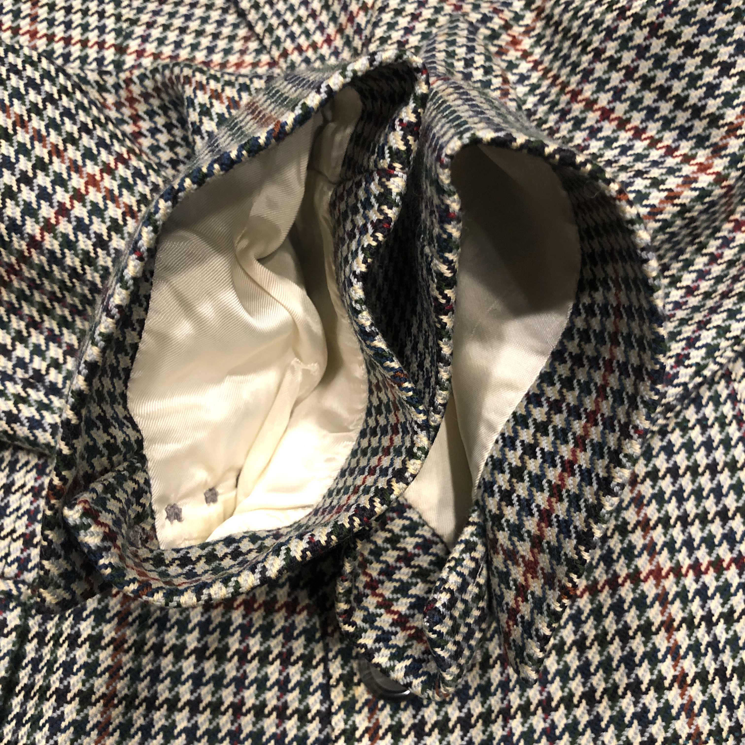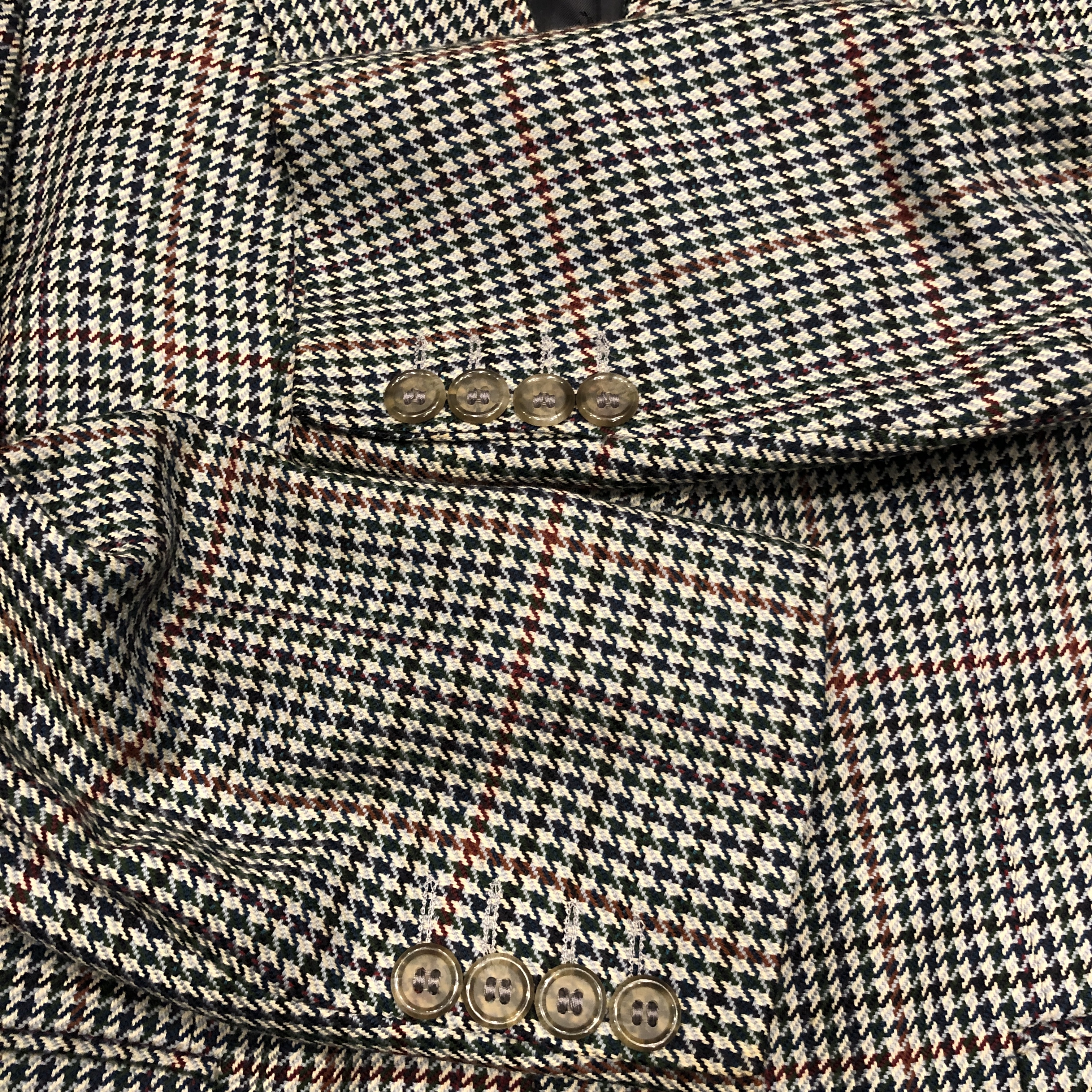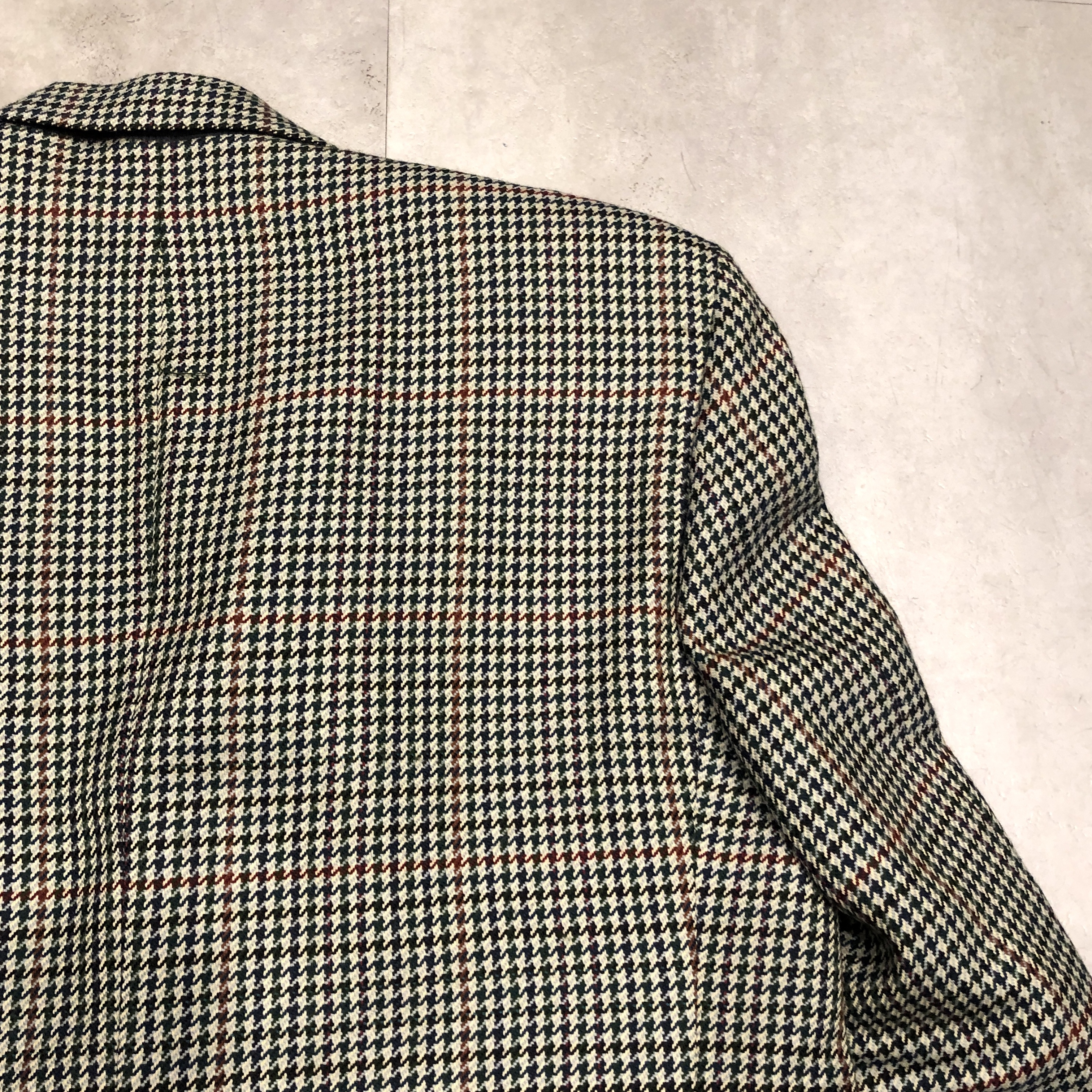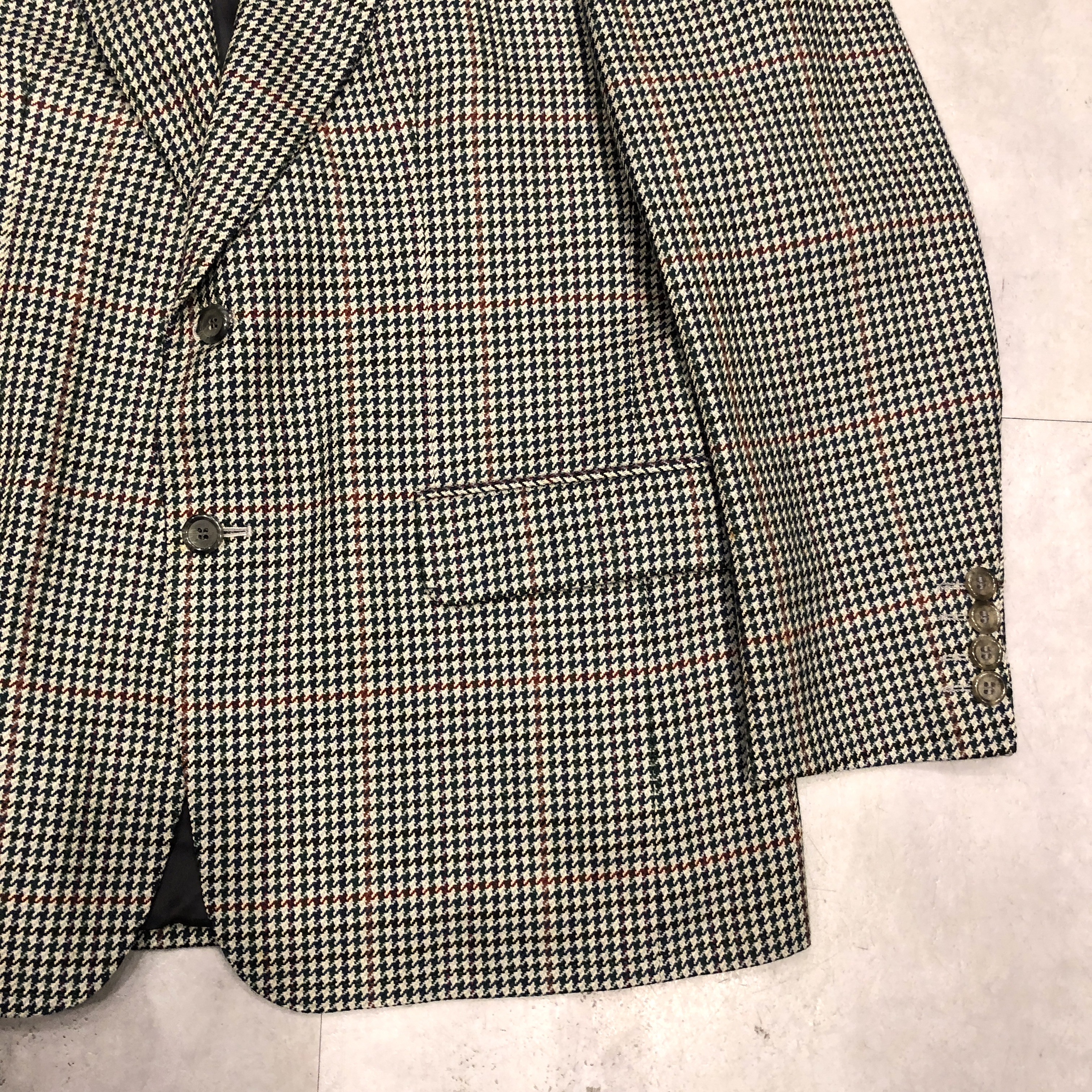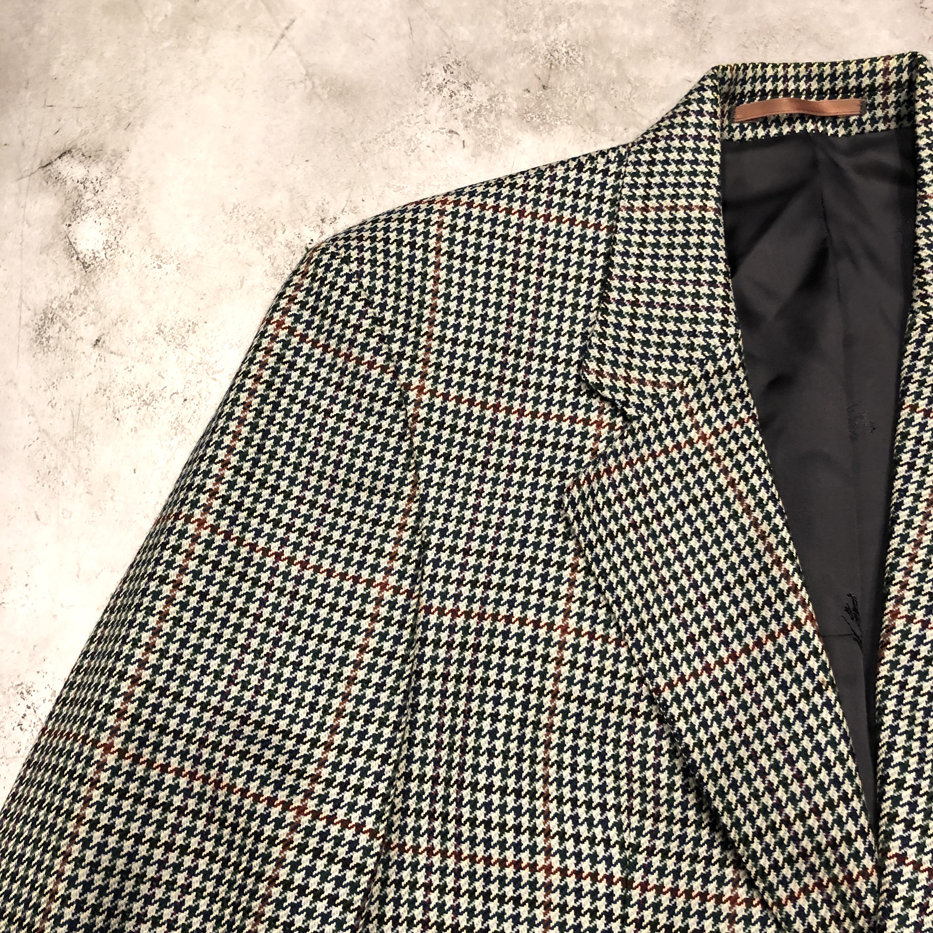 それぞれの色糸が細かく織り込まれ、遠目には落ち着きのあるトーン、近くで見ると実はとても表情豊かな柄で、英国ジャケットらしい奥行きがあります。