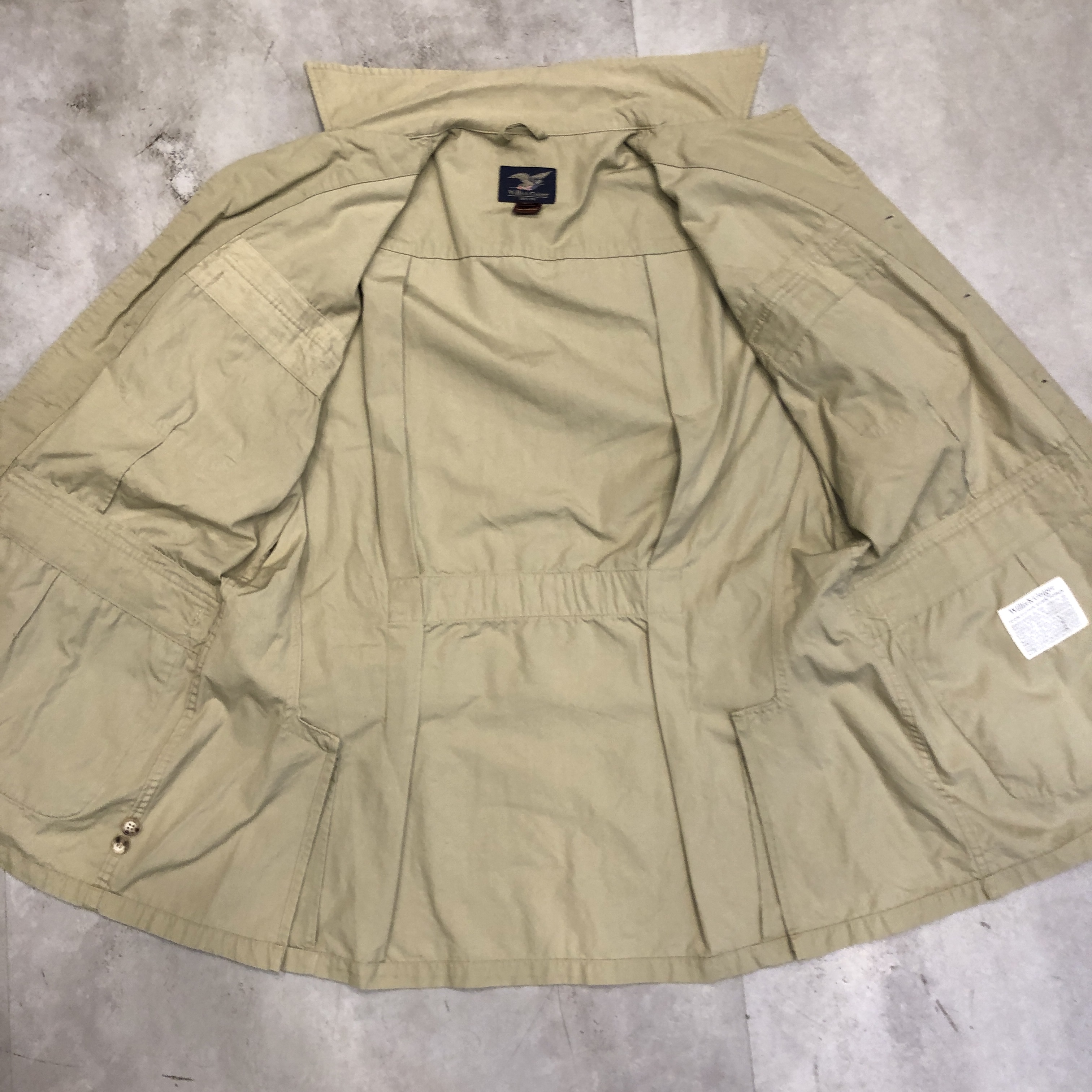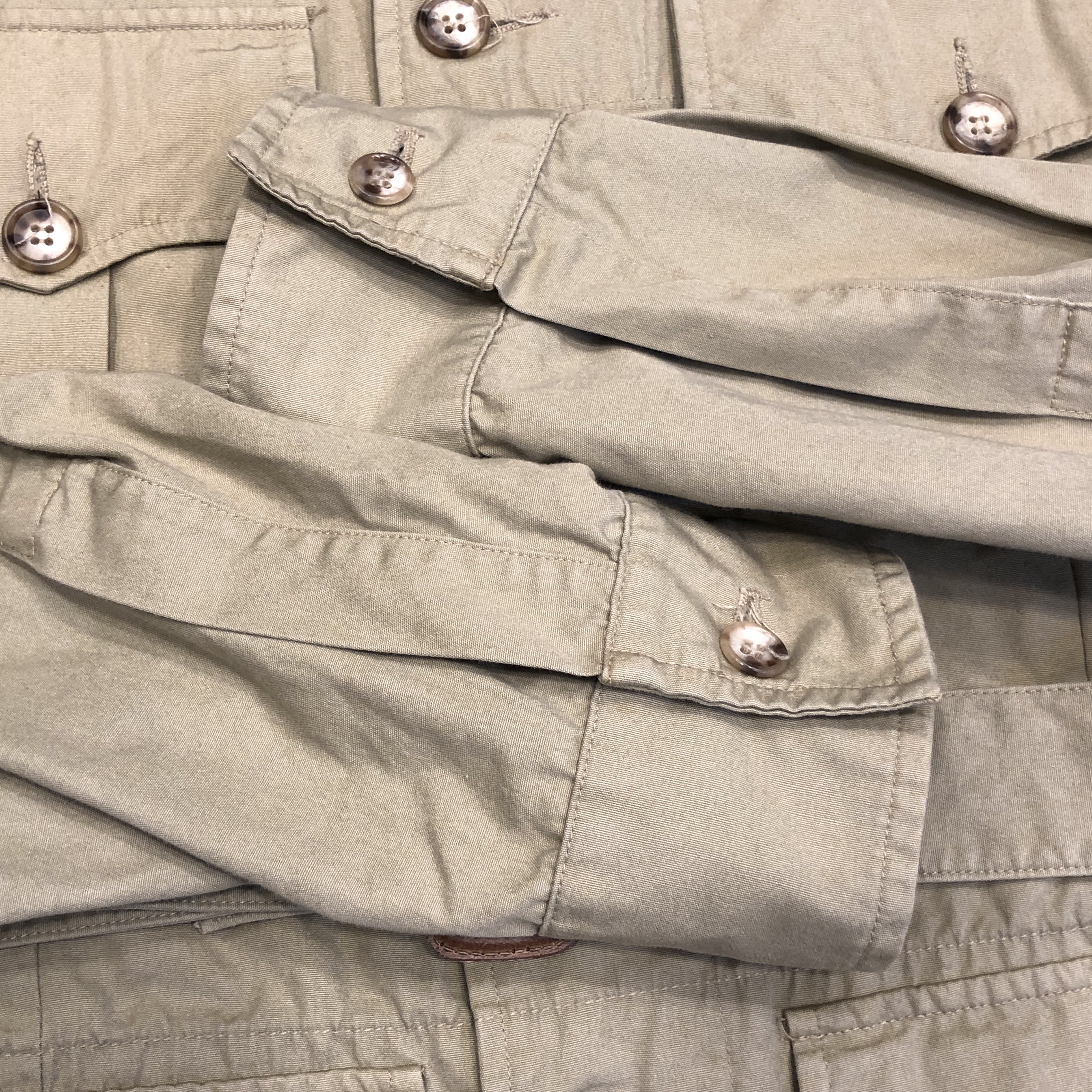 フロントと腰ポケットにはフラップ付きの大型ポケットを備え、ベルト仕様やエポレット、しっかりとしたカフスディテールなど、冒険服としての機能美が光ります。特にこの“Gable”モデルは、伝説の俳優クラーク・ゲーブルが愛用したとされるサファリジャケットをモチーフにしており、実用とエレガンスが絶妙に同居。現代のタウンユースでも映える洗練されたシルエットと上品なカラーは、アメカジファンはもちろん、アウトドアやトラッドスタイルにも格別の存在感を放ちます。