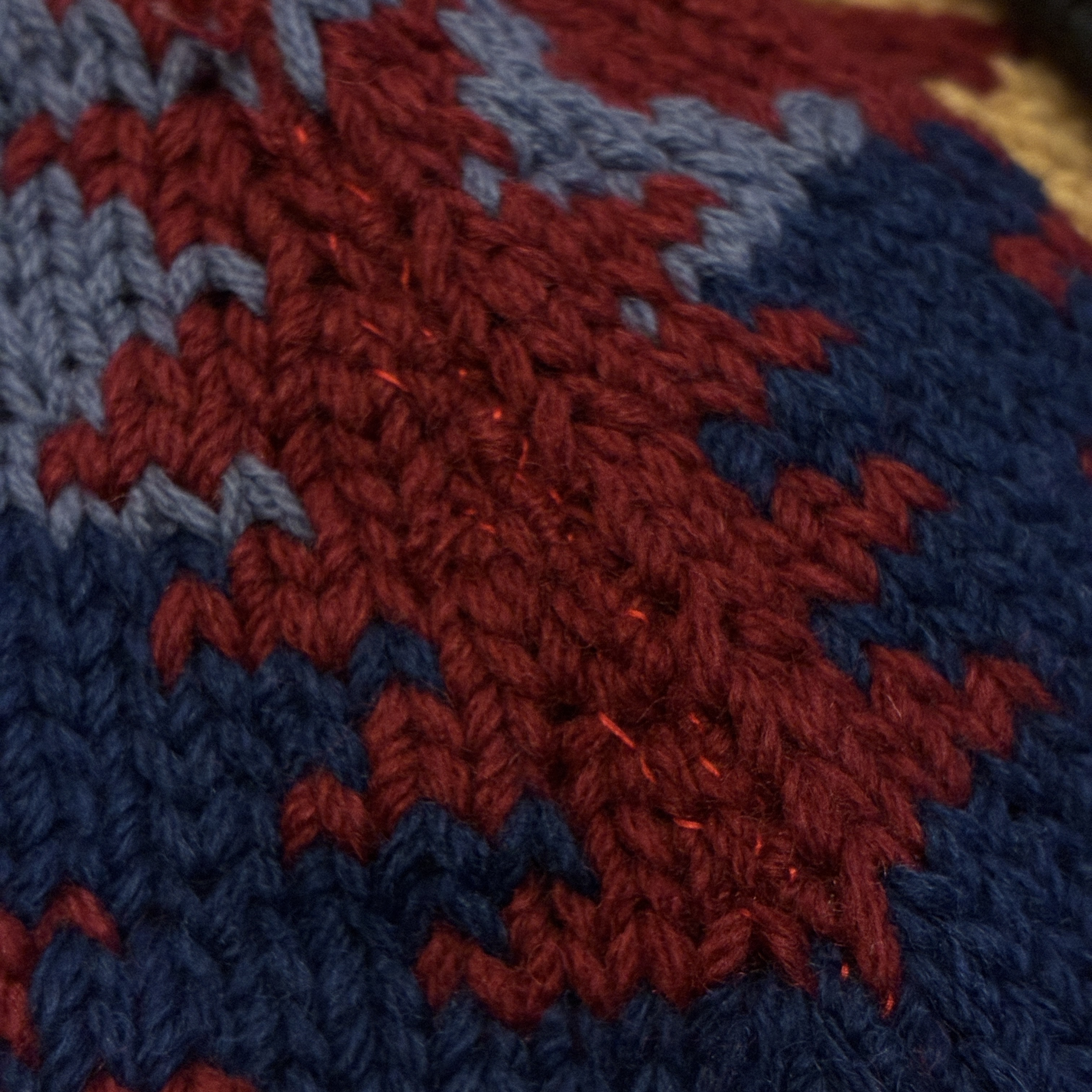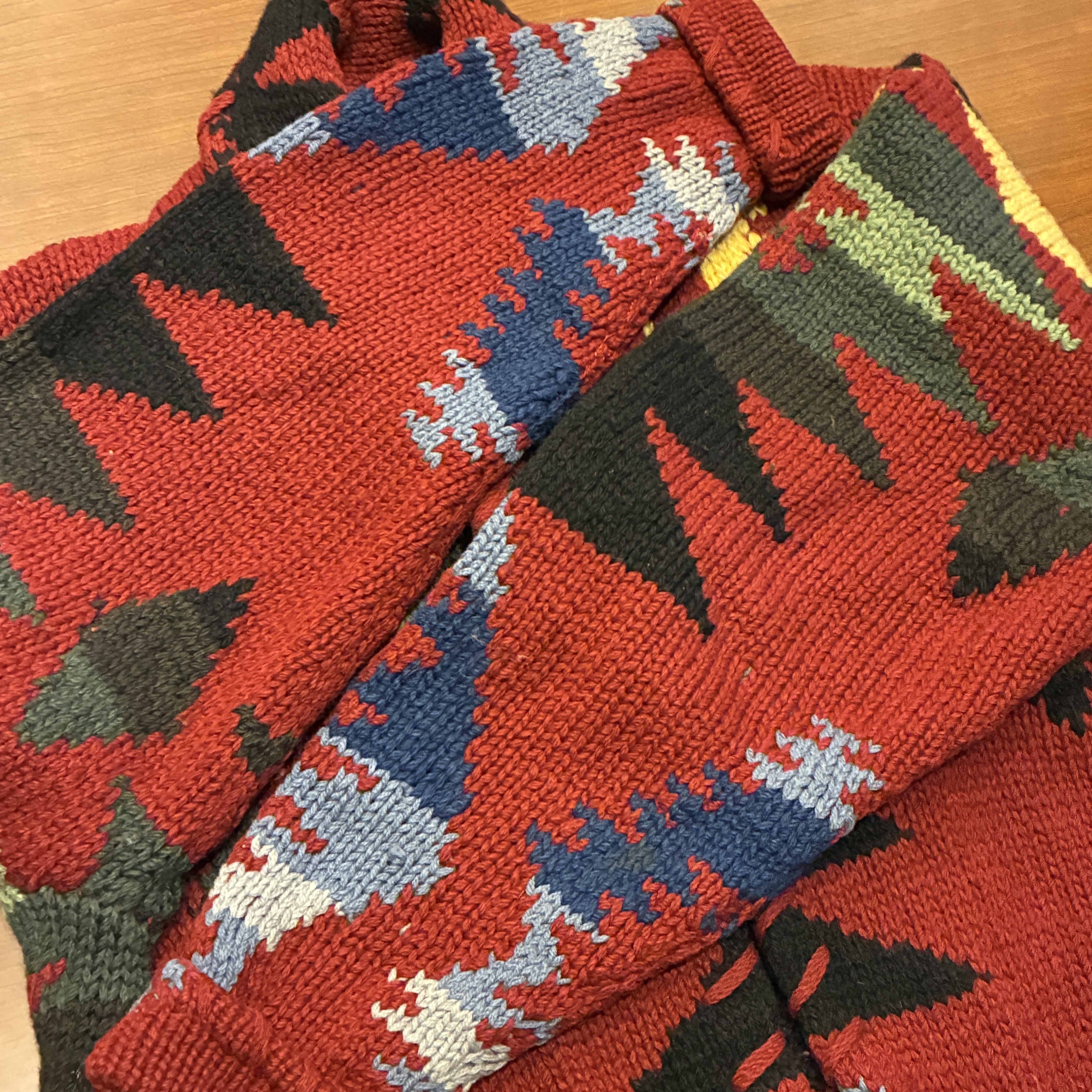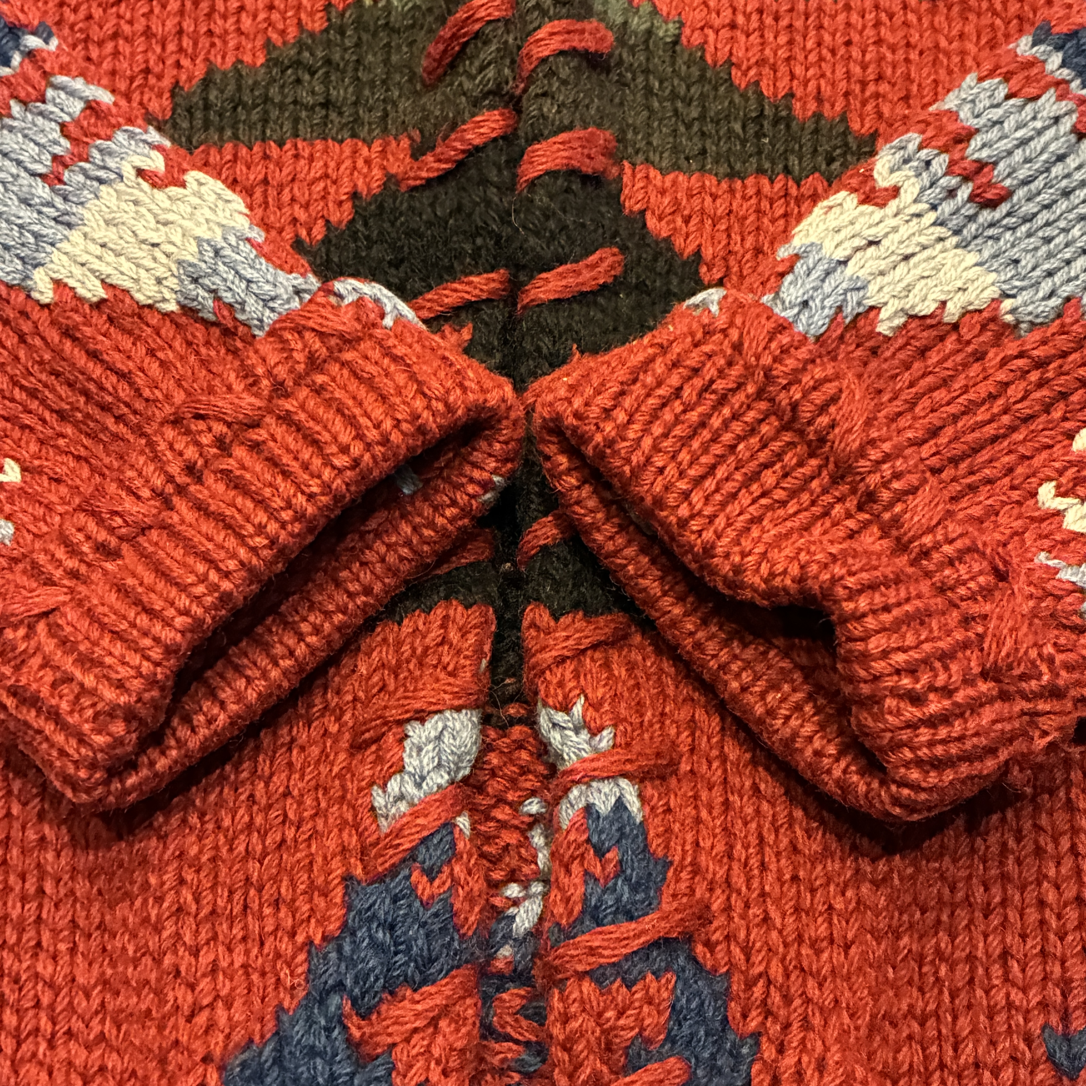 - 毛羽立ちやハンドニット特有の網目の荒い箇所、一部右袖に補修跡がございます。