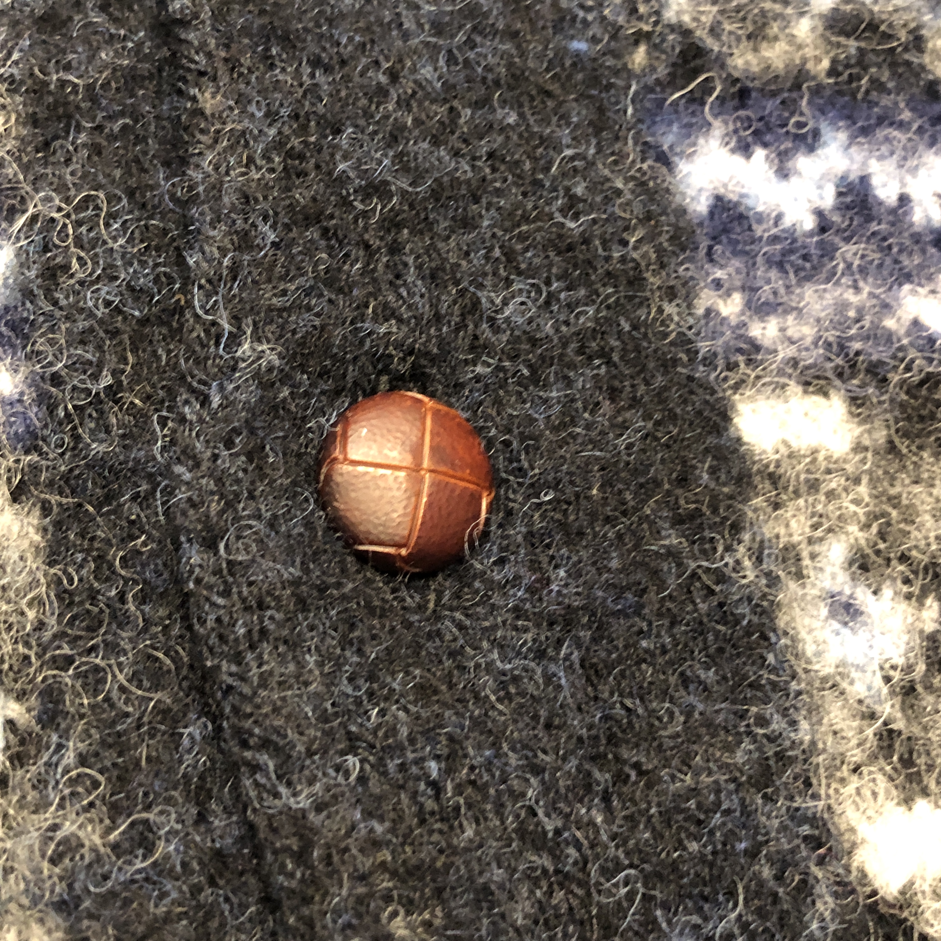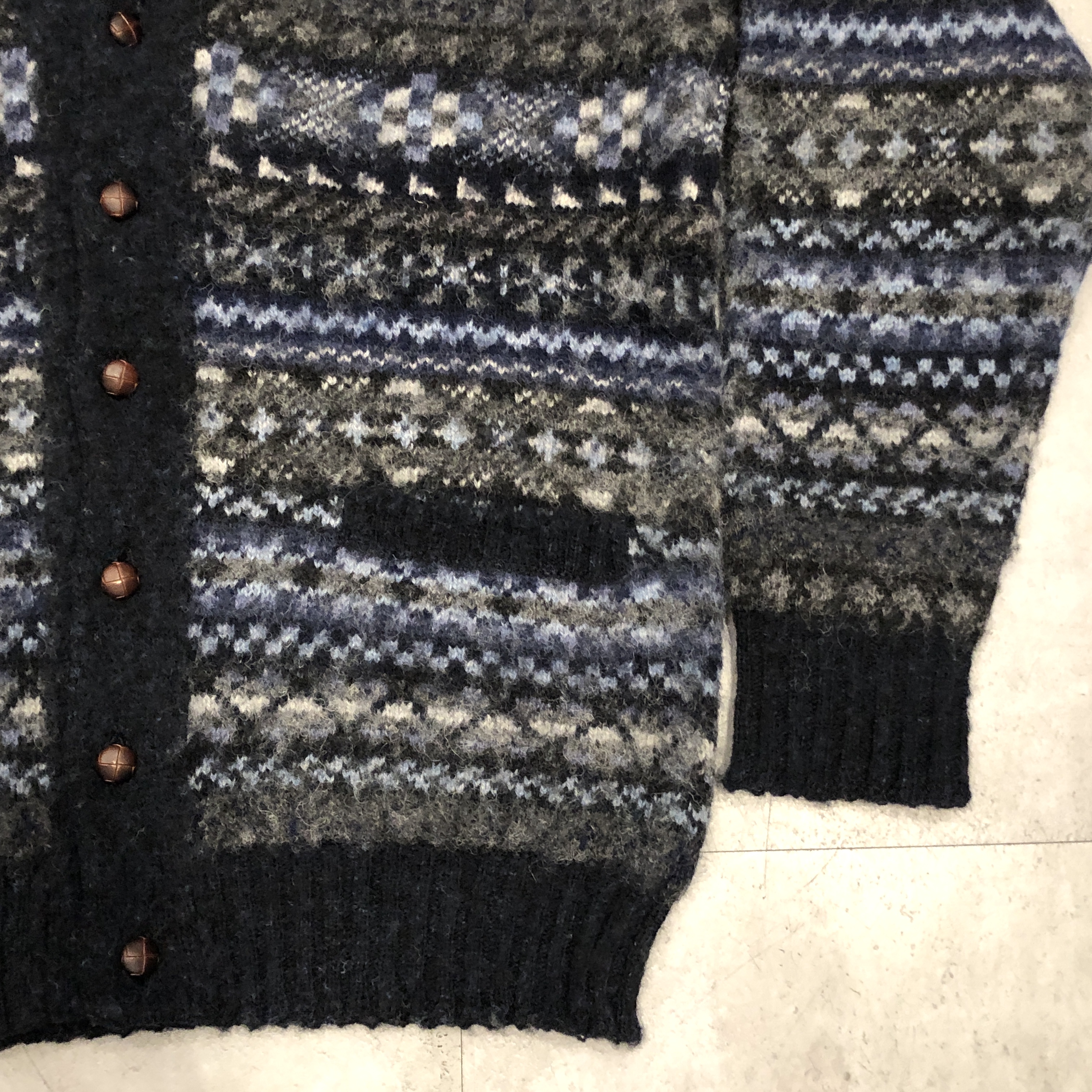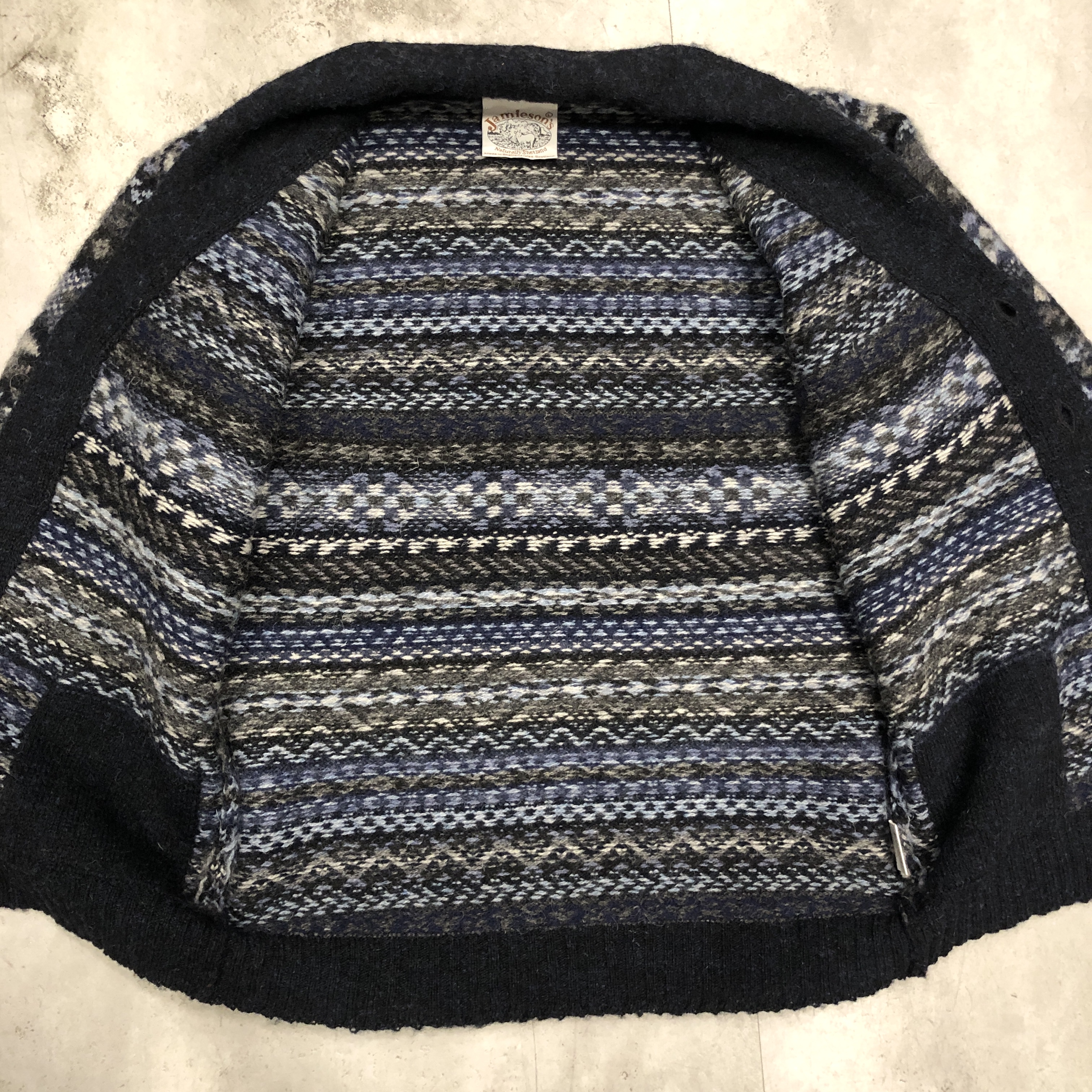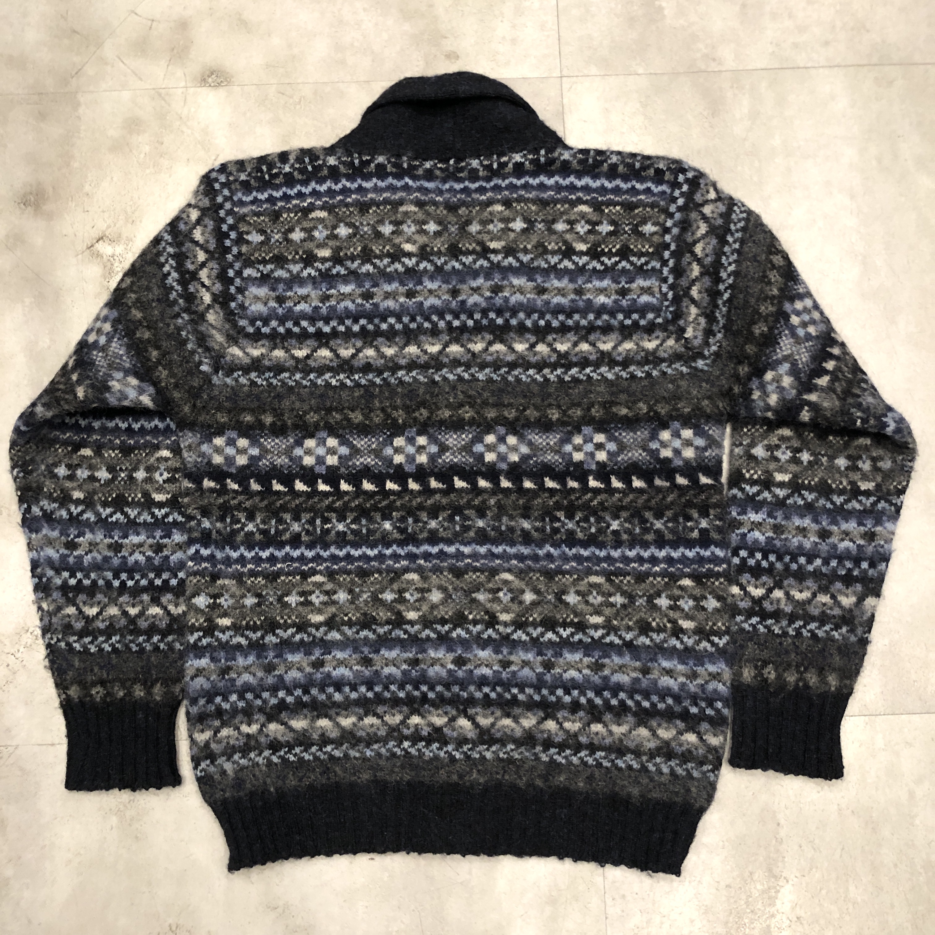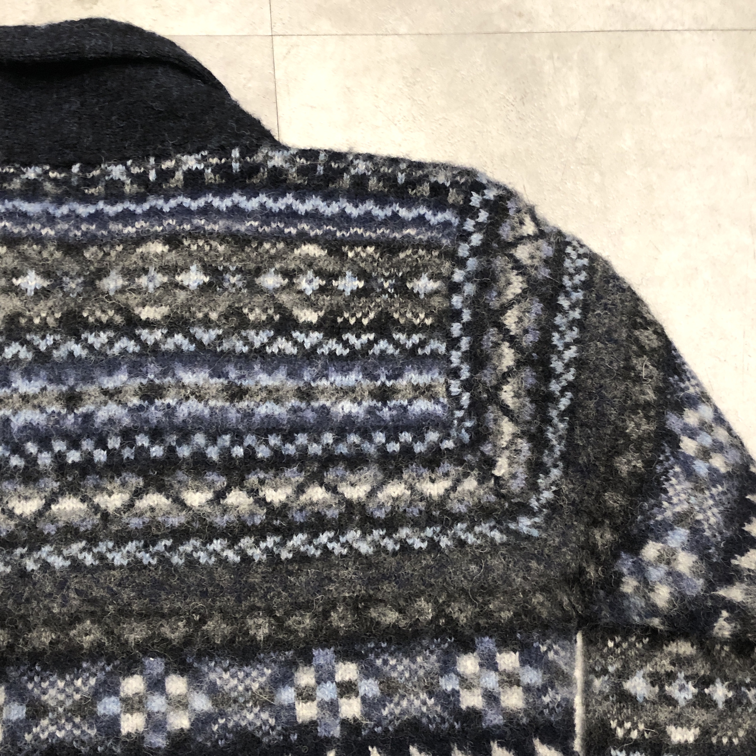 今回の一着は、ネイビー × グレーを基調にしたフェアアイル柄が全体に美しく配され、非常に落ち着いたトーンながら、奥行きある表情を持った逸品。ショールカラーの柔らかな曲線と、クルミボタンの温かみが相まって、クラシックな佇まいの中にどこか上品な気品を感じさせます。