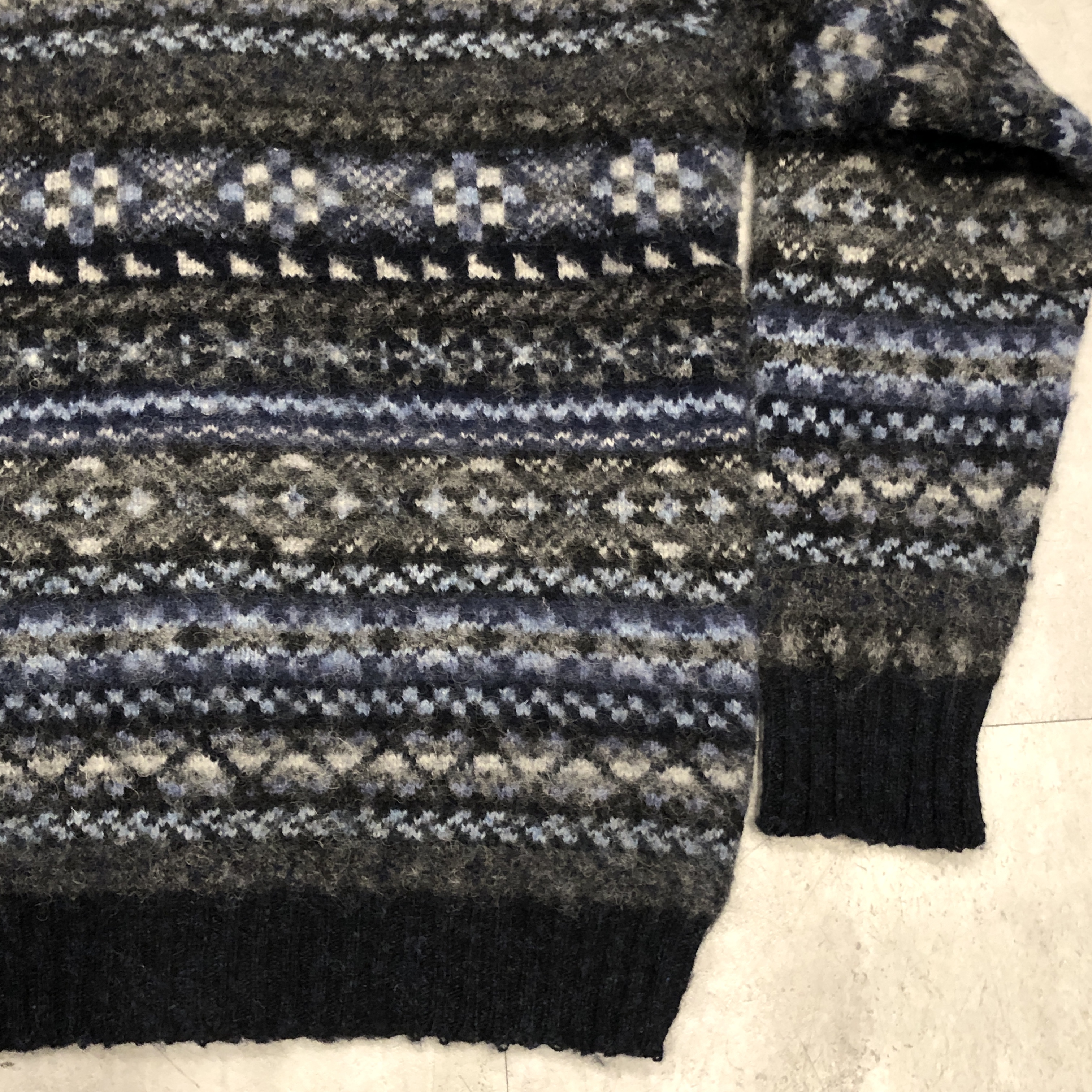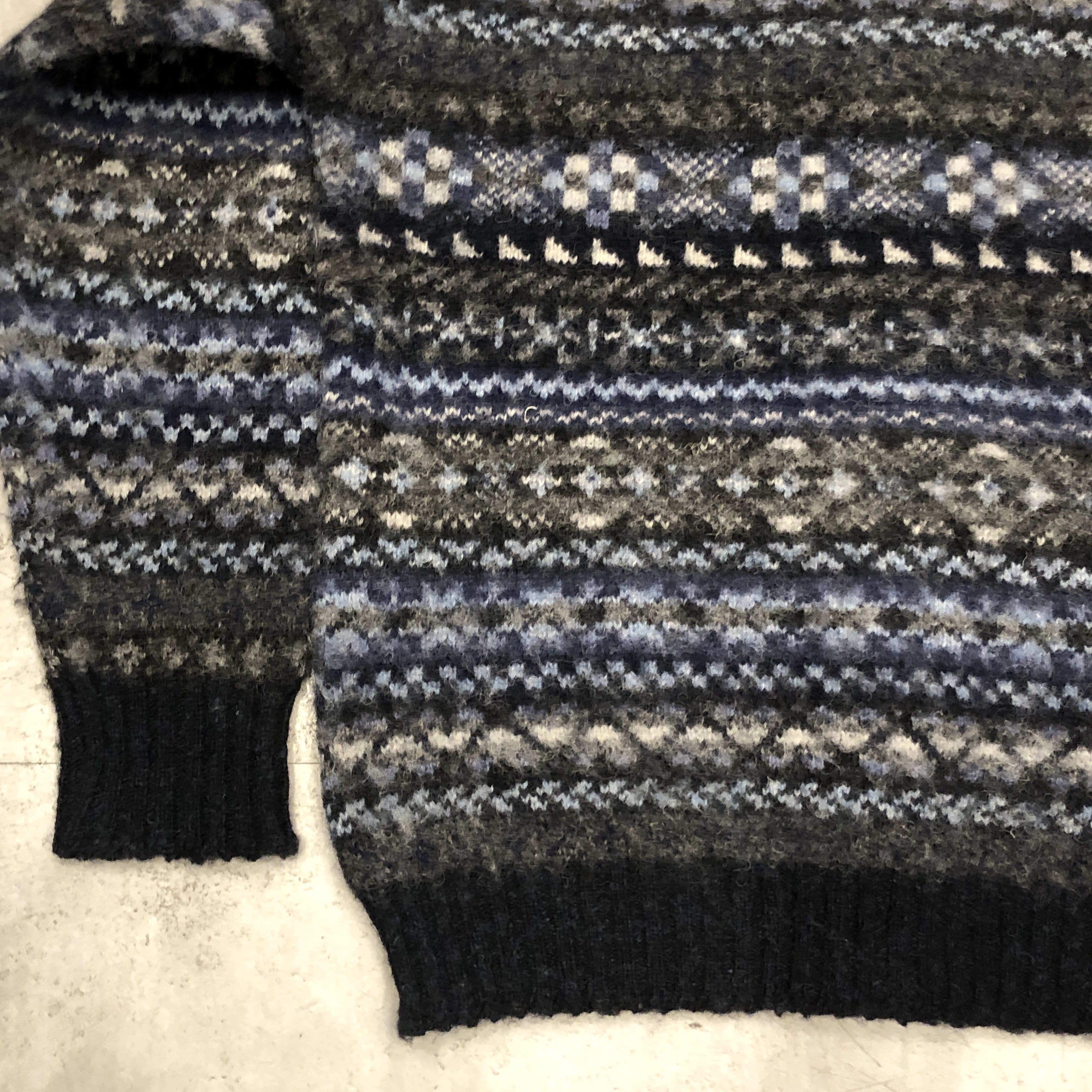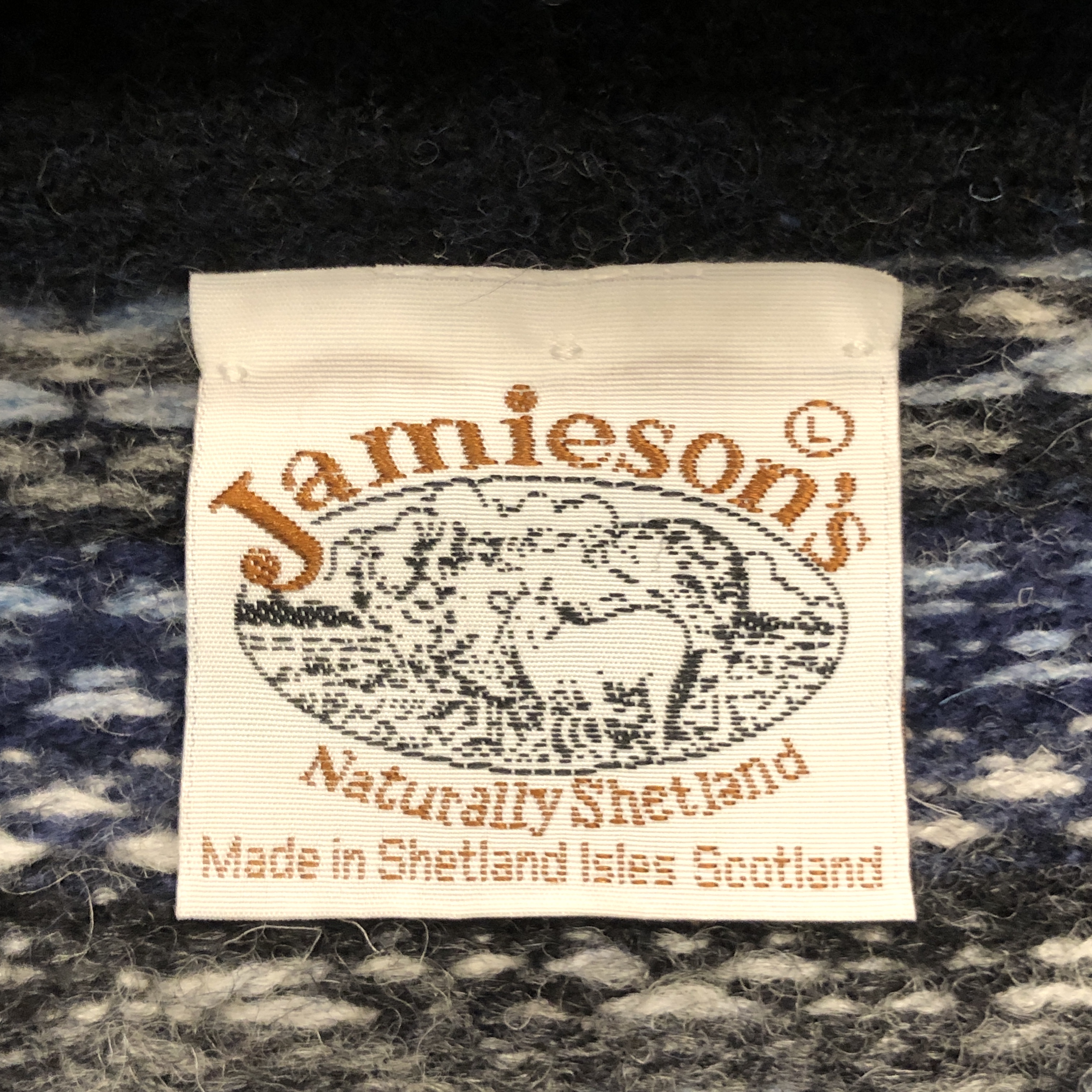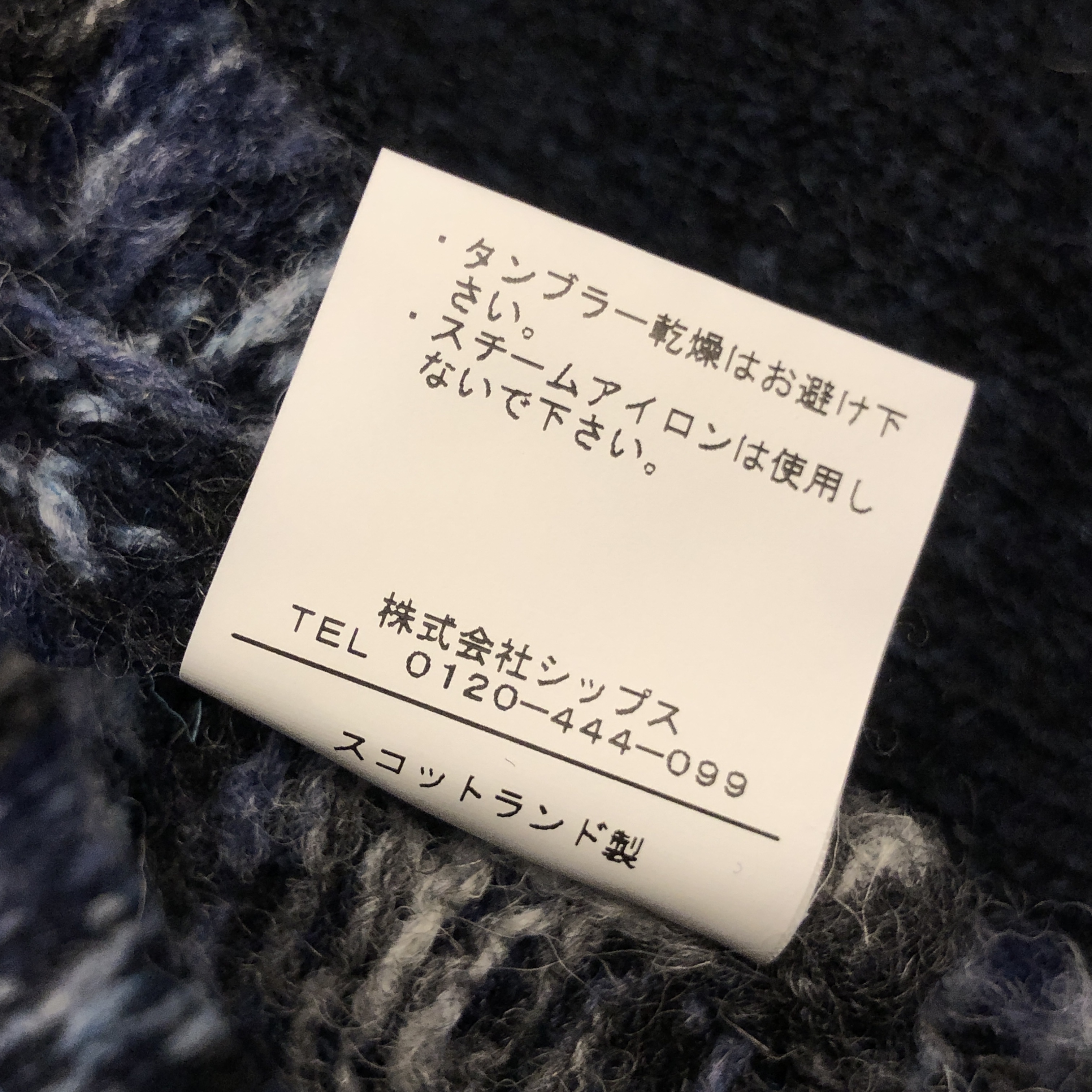 また、こちらはスコットランド製・Lサイズ表記の個体で、「ships」取り扱いの安心感ある一着。コンディションも良好で、シェットランドウール特有の起毛感が風合いとしてしっかり生きています。
