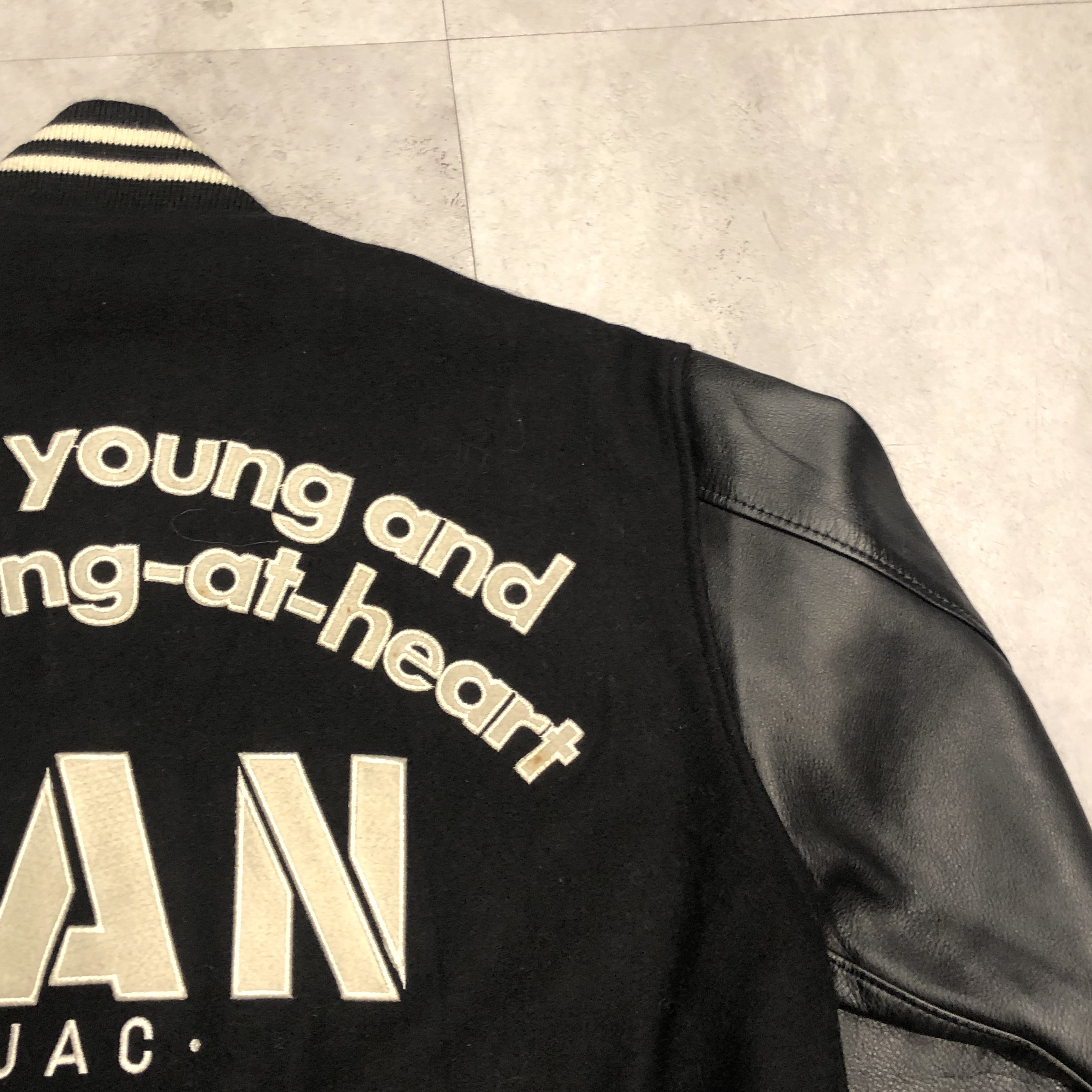まず目を惹くのは、胸に大きく配された “Vanguards” のフエルトワッペン。アメフトをモチーフにしたクラシックな意匠は、当時の IVY & アメリカンカジュアルへの強い憧れをそのまま映したような存在感です。背面にはブランドの象徴的なスローガン “for the young and the young-at-heart” のステッチ。VAN がただのブランドではなく “カルチャー” だったことを改めて感じさせてくれる、非常に良いディテール。