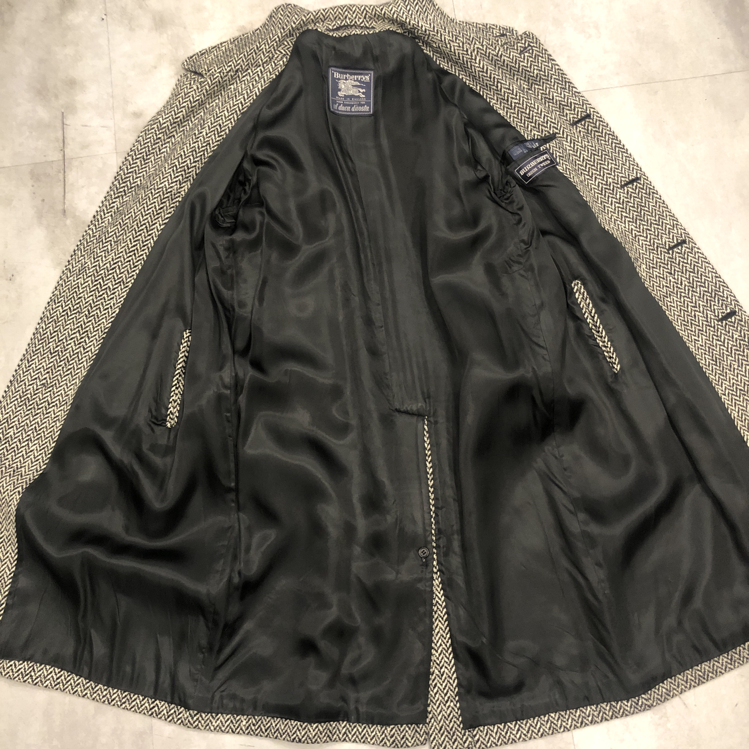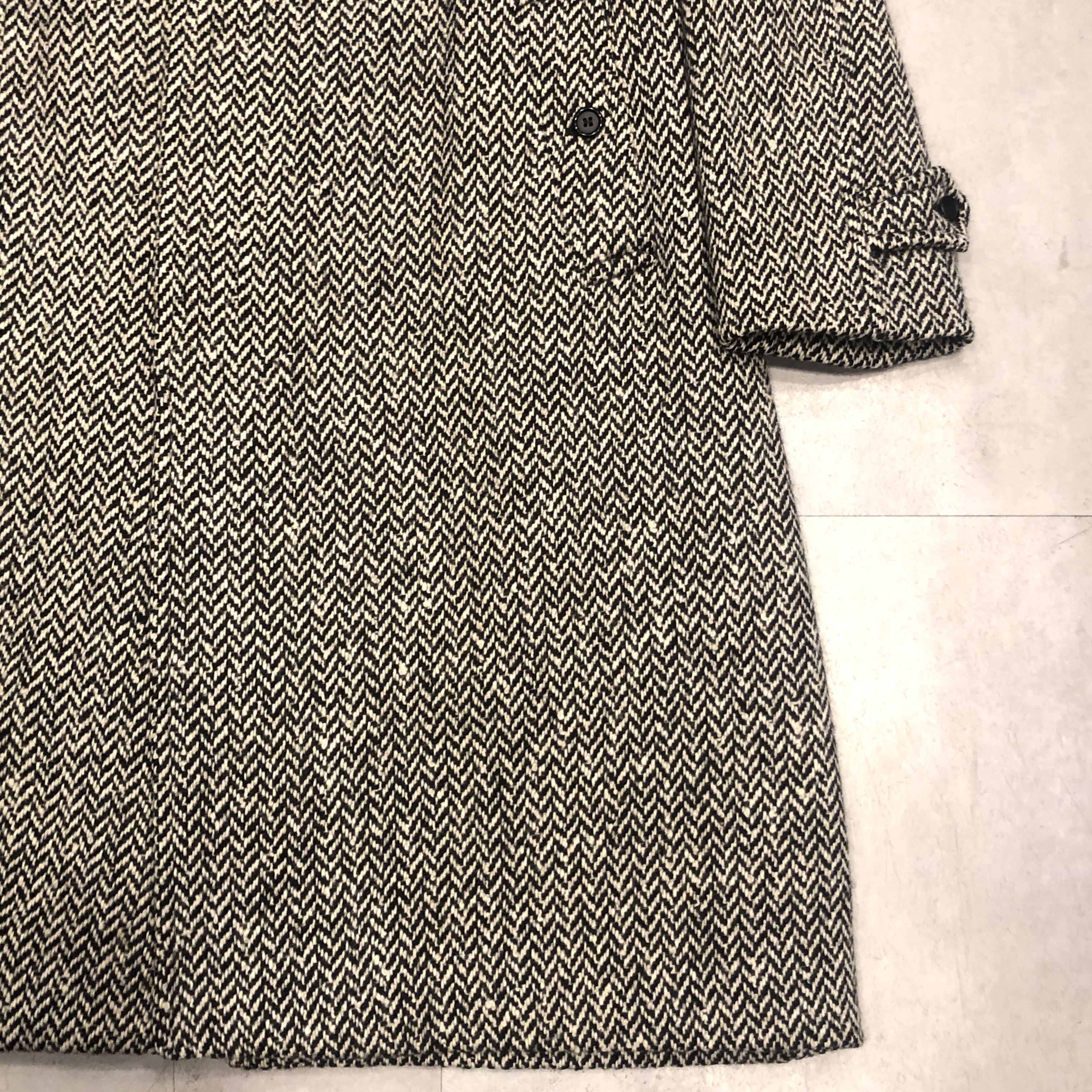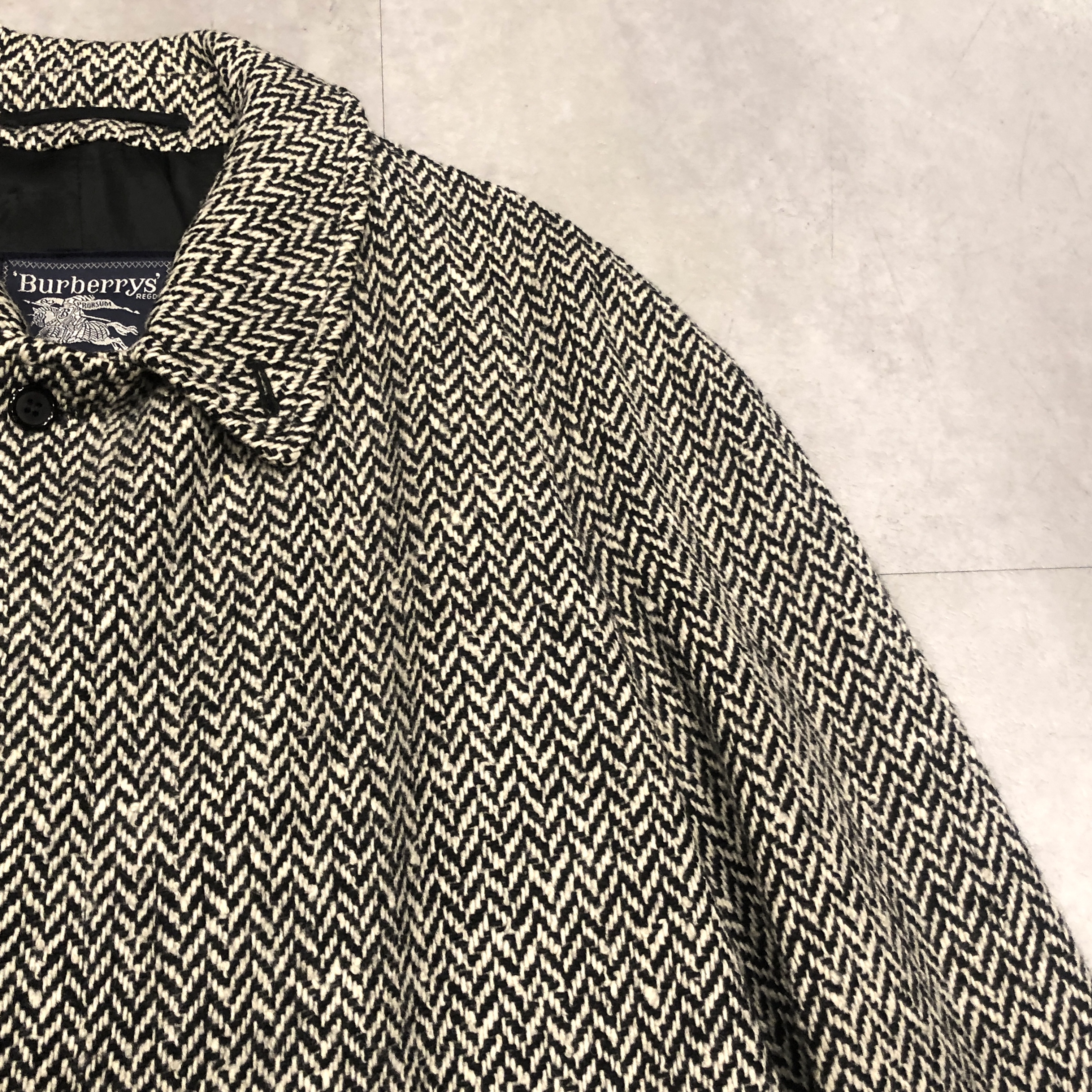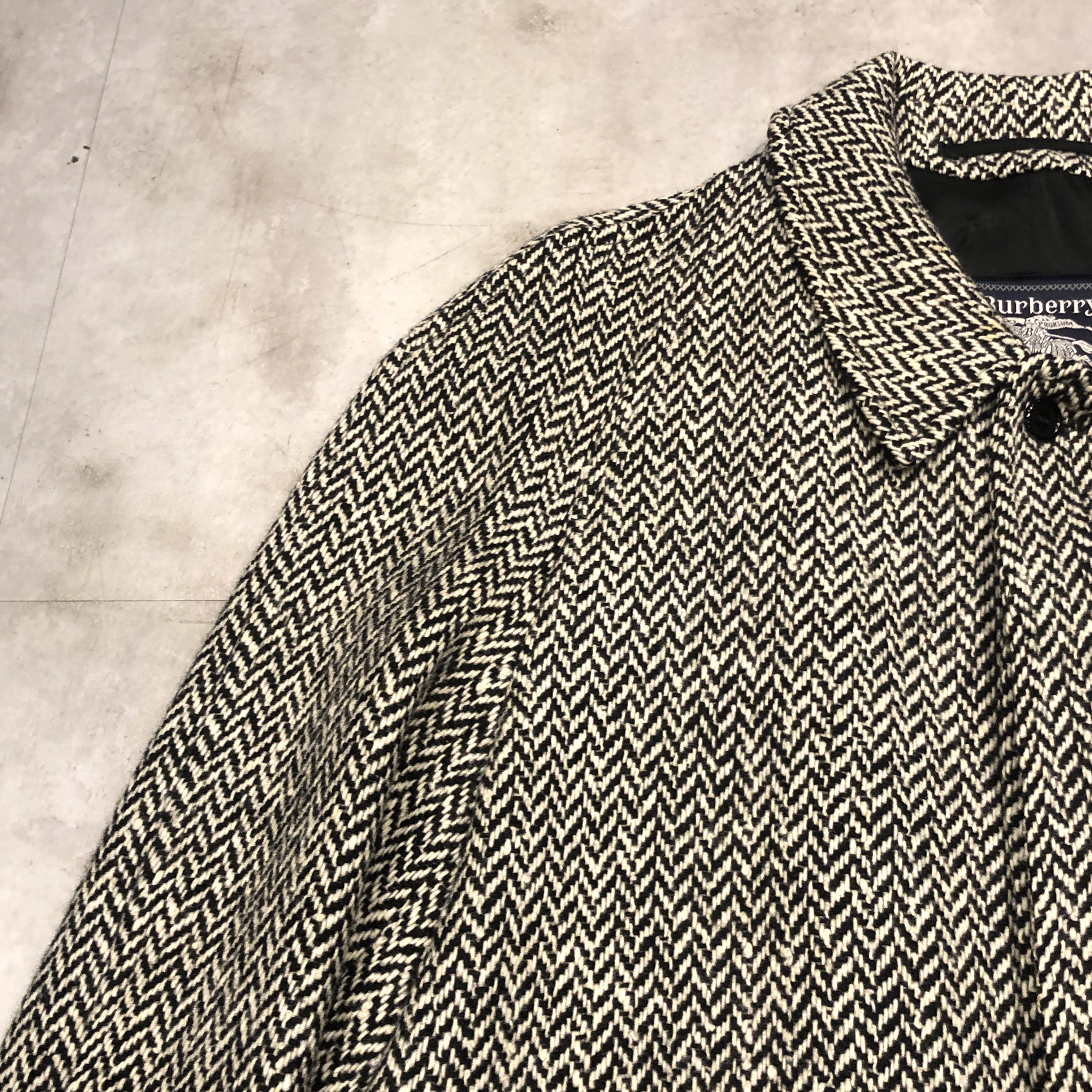 バルマカーンコートの最高峰といえば英国製Burberrys、その中でも流通数が比較的少ない“IRISH TWEED”仕様が入荷しました。タグにはMade in England 、生地は名前の通り本場アイルランド産のヘリンボーンツイードを使用しており、一般的なバルマカーンの無地ウールとは一線を画す表情豊かな佇まい。ブラック×ホワイトのシンプルかつシックな配色です。シルエットは王道のラグランスリーブで、サイズ表記は54 REG。たっぷりとしたAラインに落ちる美しいドレープは、スーツの上から羽織っても、太めの軍パンにざっくり合わせてもサマになる万能さ。裏地は総裏仕様で滑りも良く丁寧な仕立て。Burberrysの中でも“コート屋”としての矜持が最も色濃く出るのがこの手のバルマカーンですが、さらにアイリッシュツイードという付加価値が付くことでワンランク上の存在感に昇華しています。今後ここまで雰囲気の良い個体にはなかなか出会えないと思いますので、お探しだった方は是非この機会に。