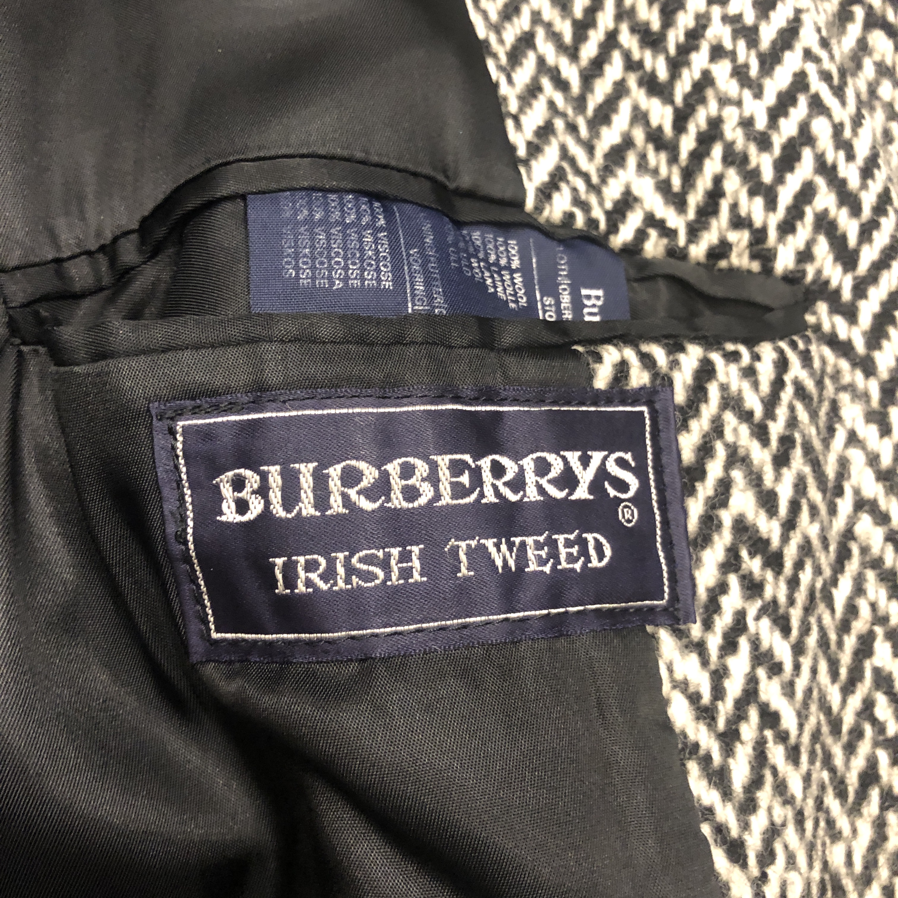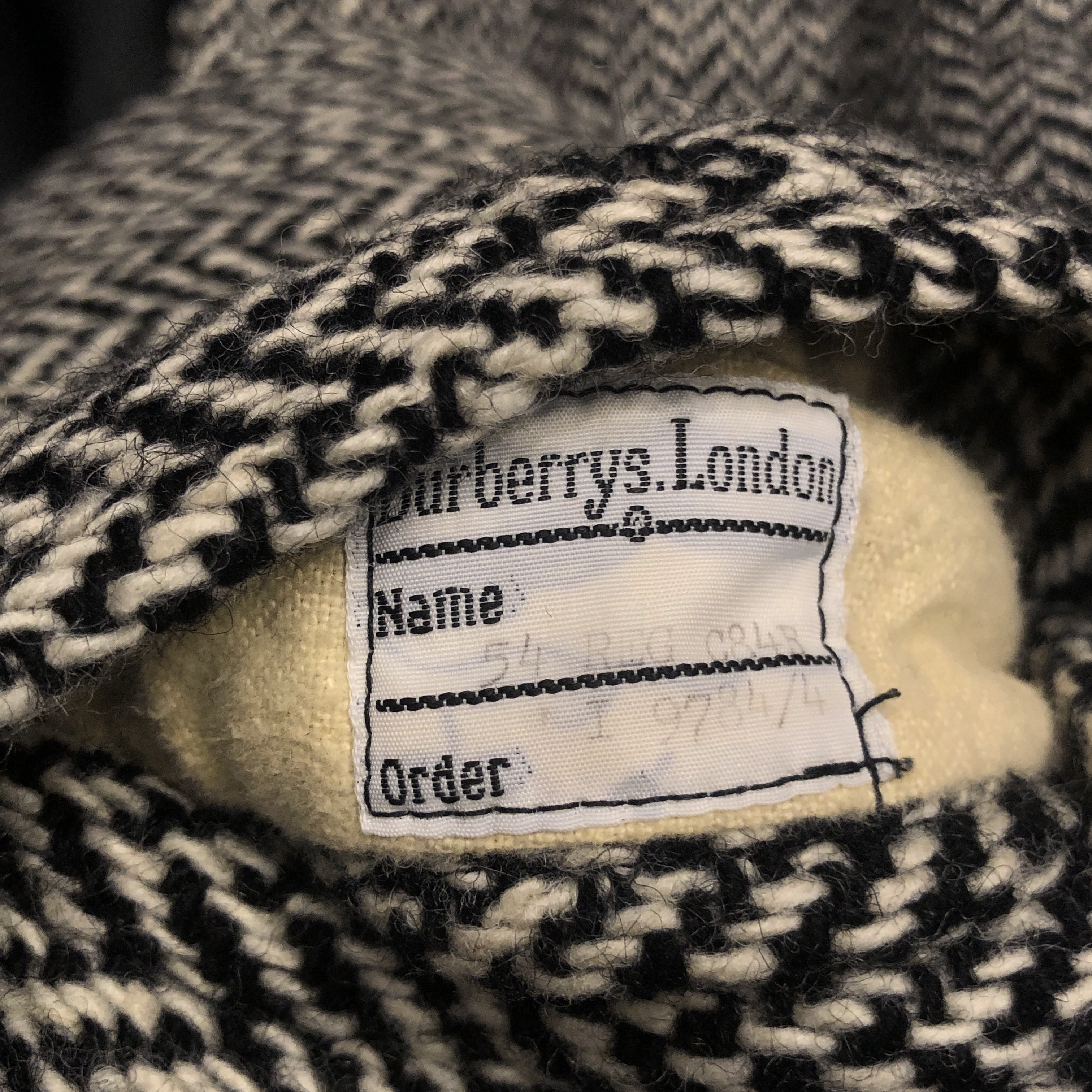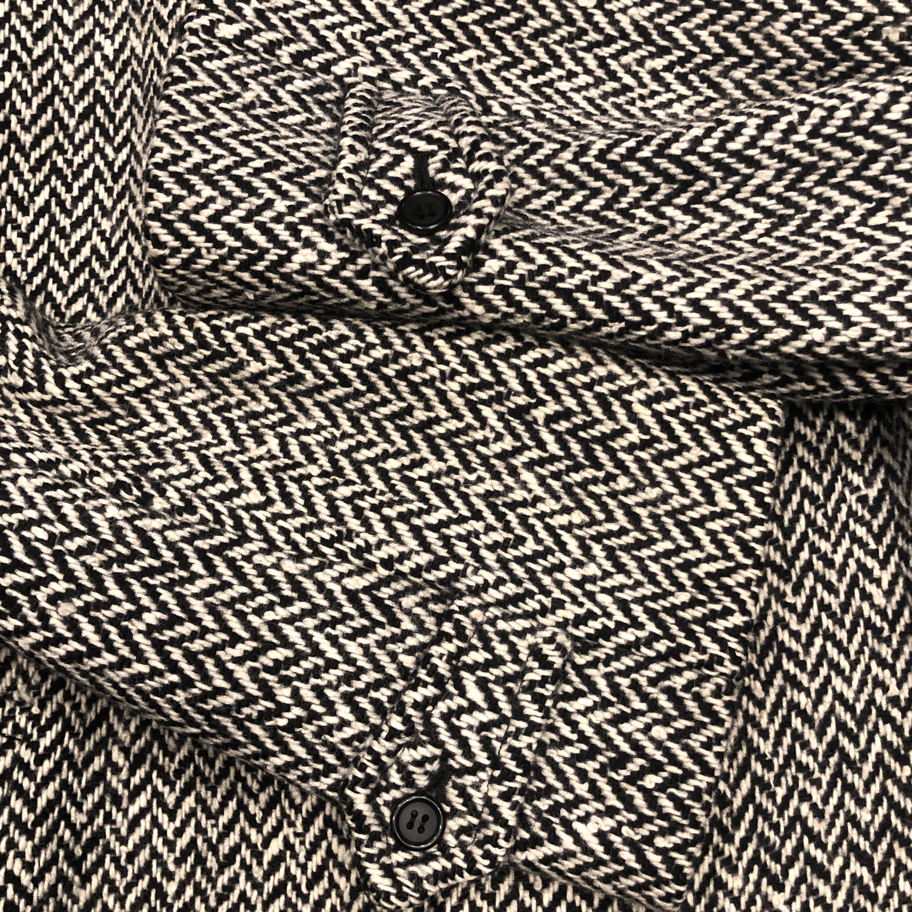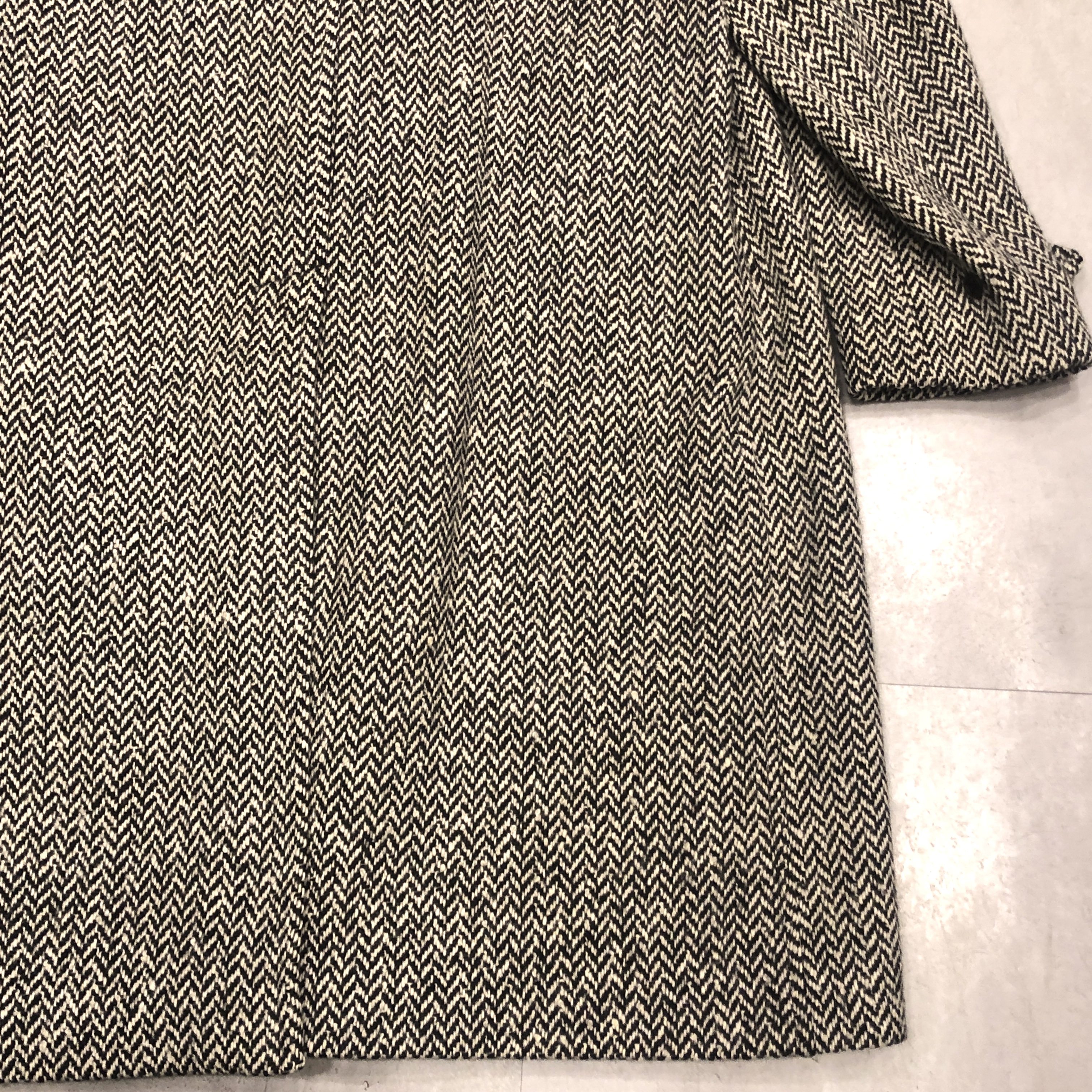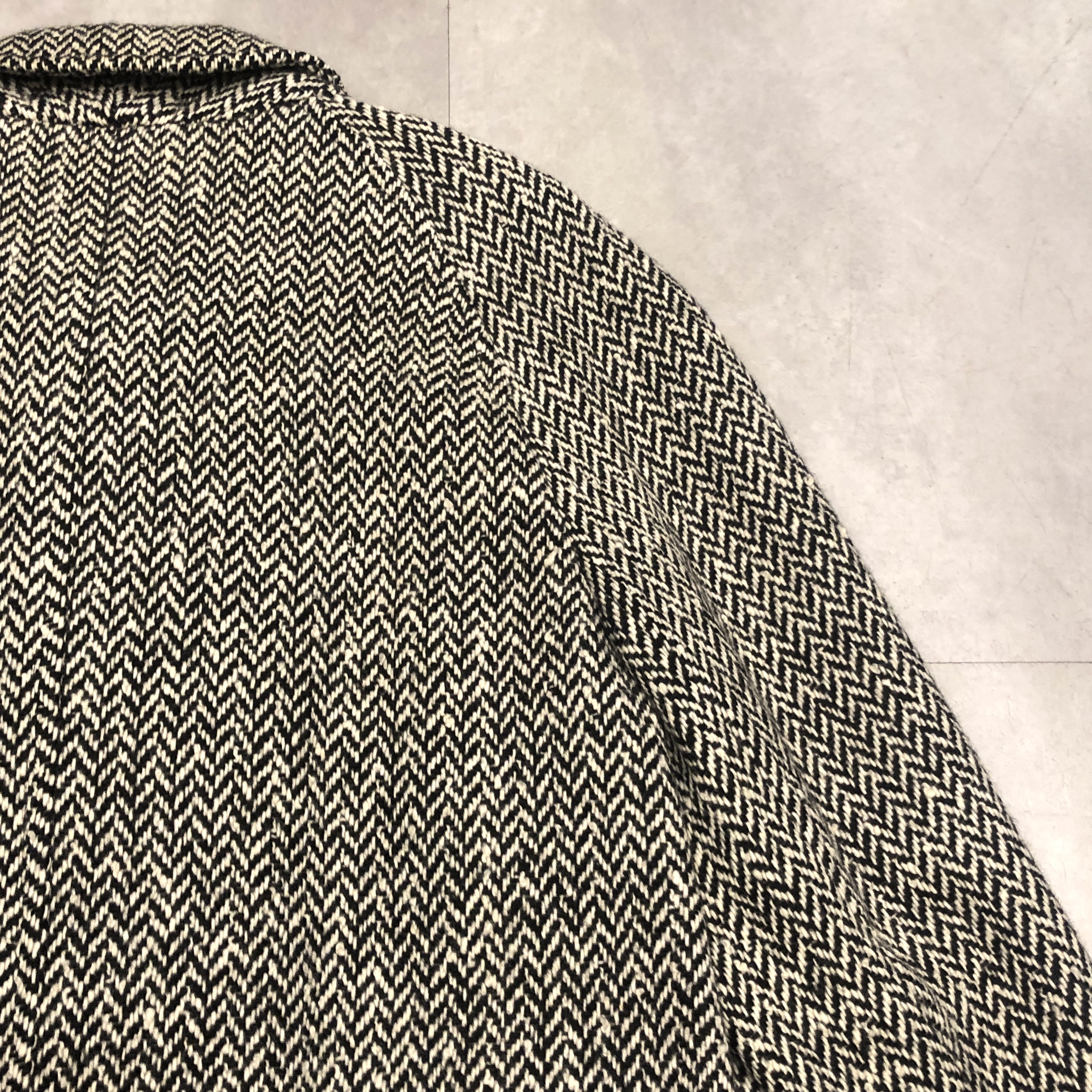 バルマカーンコートの最高峰といえば英国製Burberrys、その中でも流通数が比較的少ない“IRISH TWEED”仕様が入荷しました。タグにはMade in England 、生地は名前の通り本場アイルランド産のヘリンボーンツイードを使用しており、一般的なバルマカーンの無地ウールとは一線を画す表情豊かな佇まい。ブラック×ホワイトのシンプルかつシックな配色です。シルエットは王道のラグランスリーブで、サイズ表記は54 REG。たっぷりとしたAラインに落ちる美しいドレープは、スーツの上から羽織っても、太めの軍パンにざっくり合わせてもサマになる万能さ。裏地は総裏仕様で滑りも良く丁寧な仕立て。Burberrysの中でも“コート屋”としての矜持が最も色濃く出るのがこの手のバルマカーンですが、さらにアイリッシュツイードという付加価値が付くことでワンランク上の存在感に昇華しています。今後ここまで雰囲気の良い個体にはなかなか出会えないと思いますので、お探しだった方は是非この機会に。