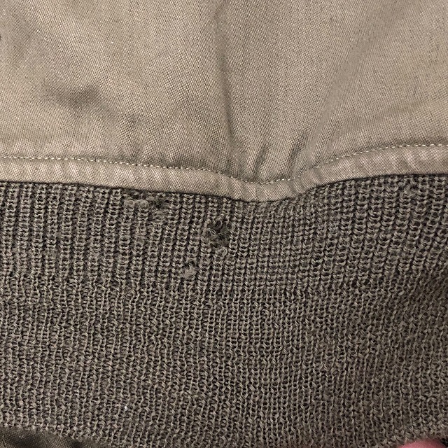 右袖、背中に傷、袖リブ、裾リブに破れがございます。