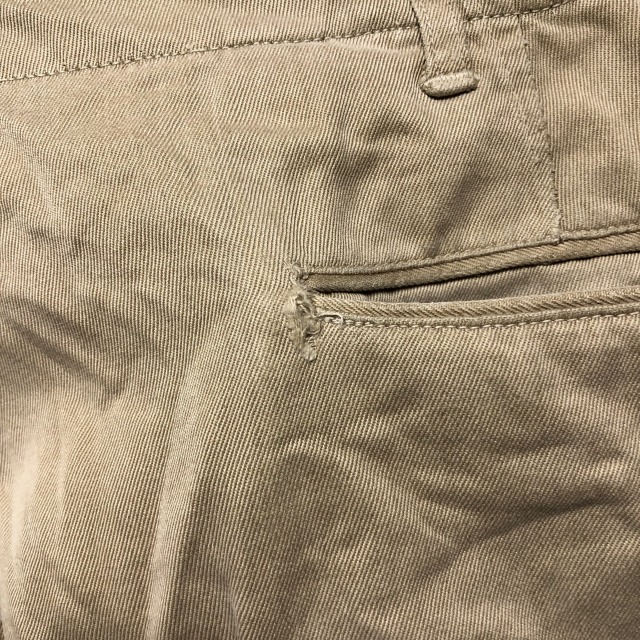 ポケットは両玉縁、センターループオフセット、縫製はダブルステッチです。
