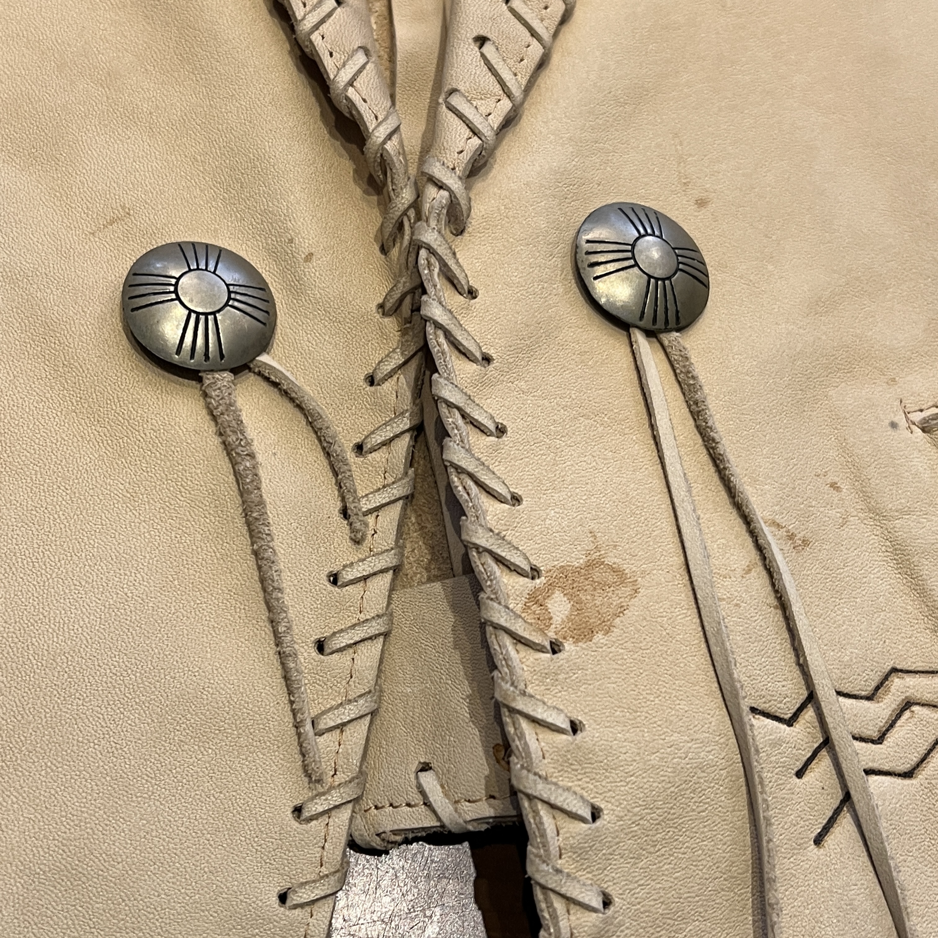 - レザー汚れやヤケ、傷や多少の硬化とコンチョボタンの紐が片方切られております。