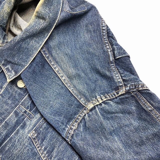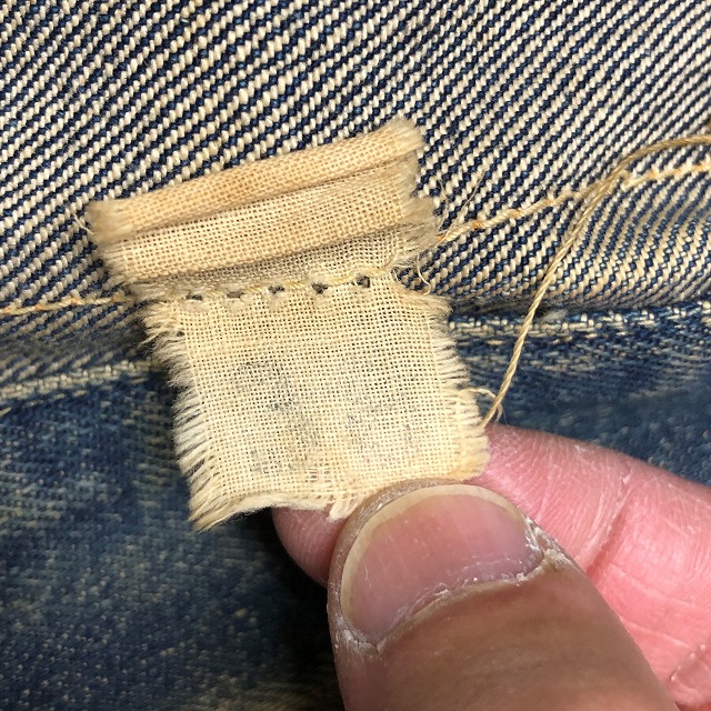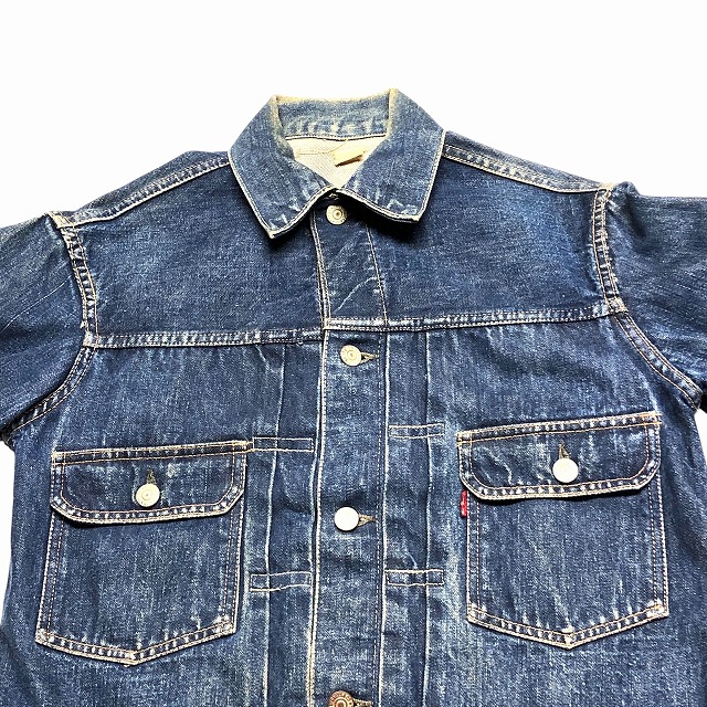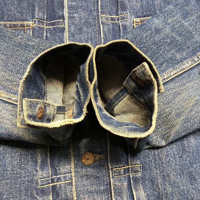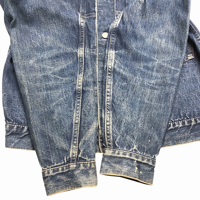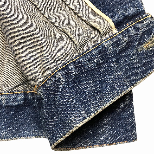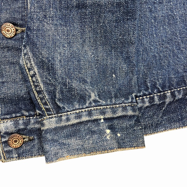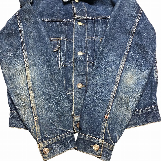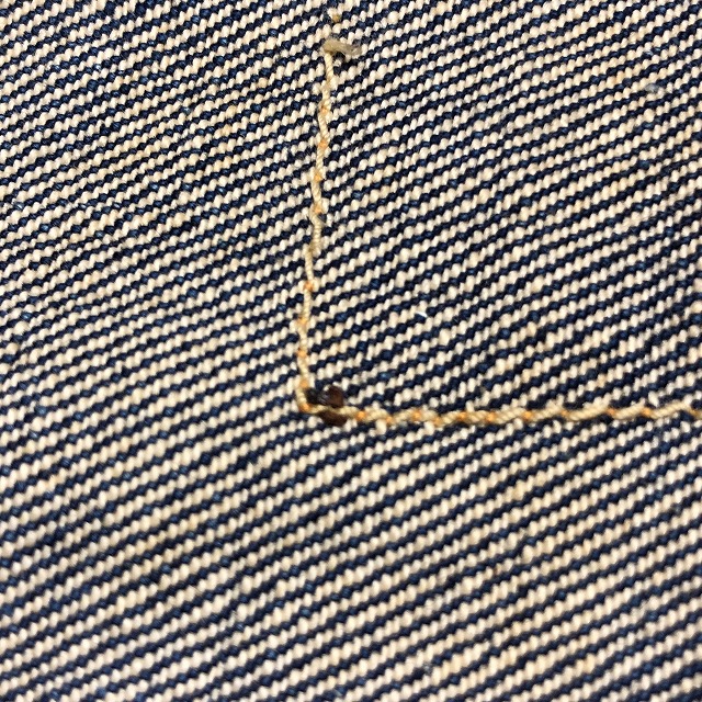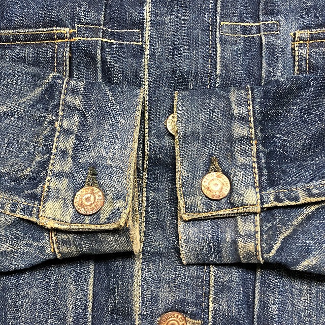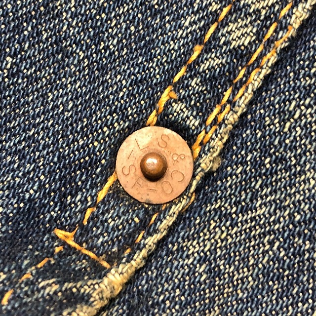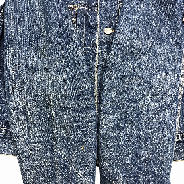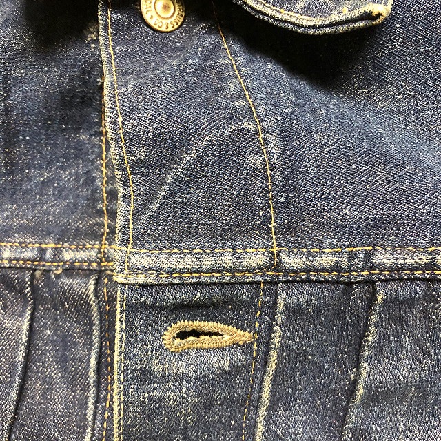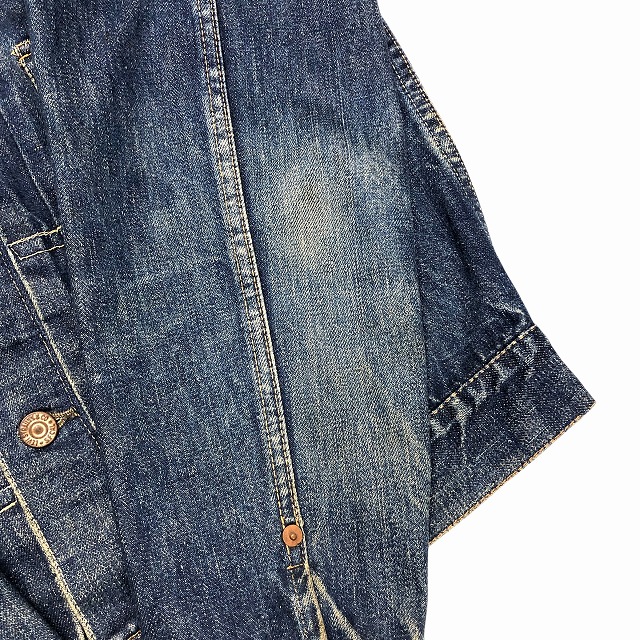均等V、ボタン裏刻印『ツブツブ』、胸ポケット裏 ライトオンスデニム、フロント折り返しステッチ、