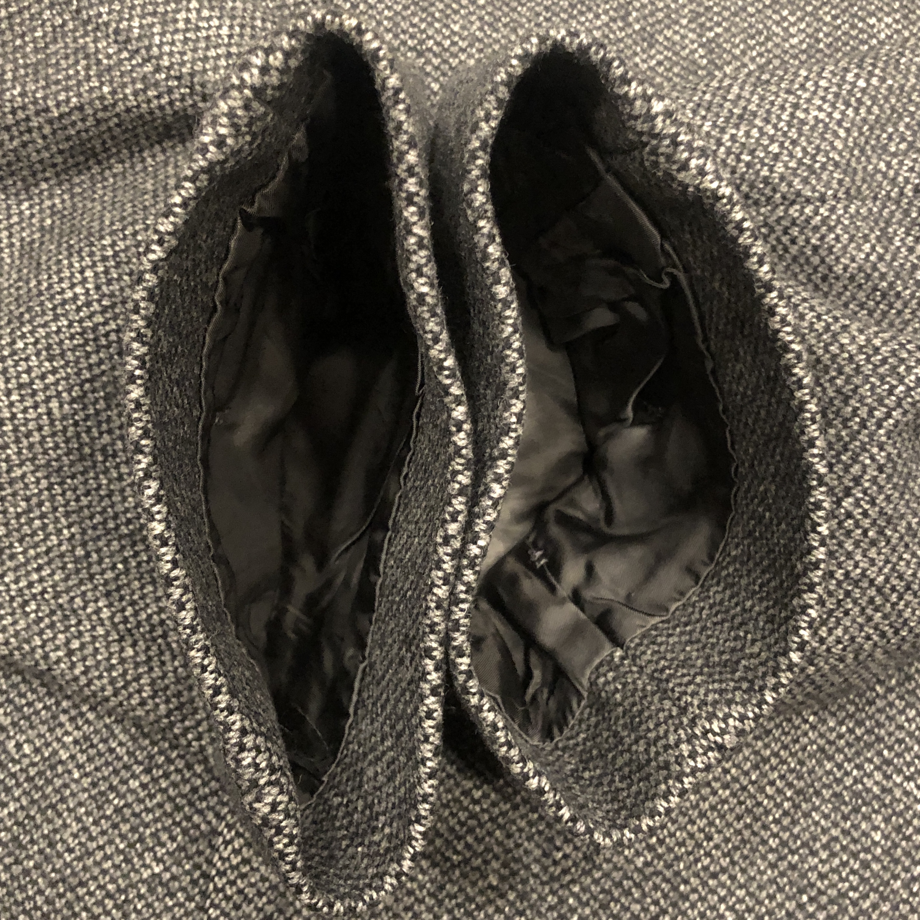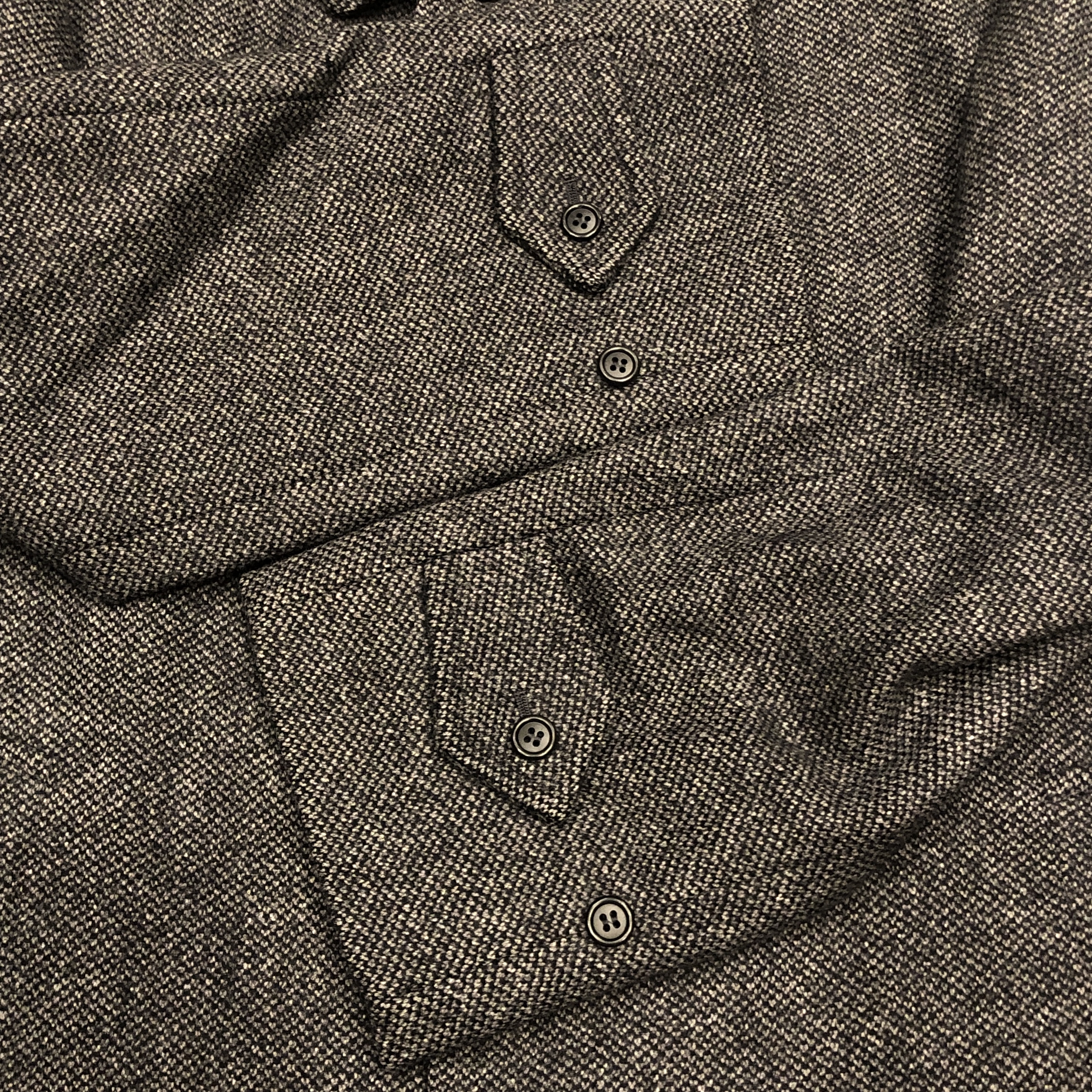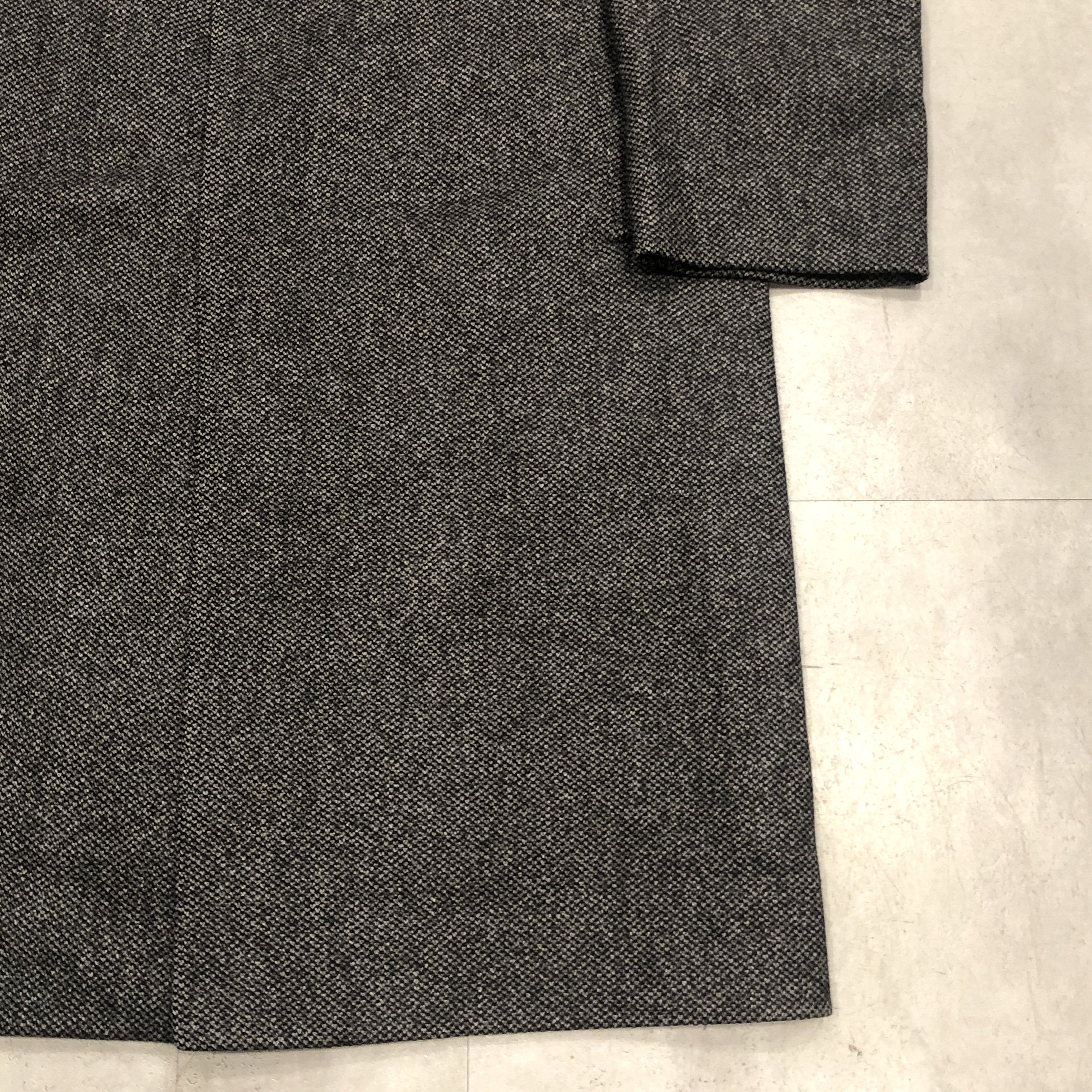 BURBERRYのスコティッシュサクソニーのサドルショルダーコートのご紹介です。グレーベースの細かなミックスツイードは、スコットランド製サクソニーウール(タグ表記100%WOOL)ならではのふくらみと柔らかさがありつつ、ぎゅっと目が詰まっていて冬場のアウターとしてとても心強い質感。肩は所謂サドルショルダーで、シルエットが実にエレガントです。フロントは比翼仕立てで、余計な装飾を削ぎ落としたミニマルな表情ですが、裏側には「MADE EXPRESSLY FOR Maurice Gladek, METZ」と入るスペシャルタグが付き、ヨーロッパの高級紳士服店別注で仕立てられたグレードの高さがうかがえます。ライニングは100%ビスコースで袖通しなめらか、サイズは表記46 REGのゆったりとしたフィッティング。スーツの上からガバッと羽織ってもシルエットが崩れにくく、ニット+デニムに合わせて少しラフに着崩してもサマになる、まさに“上質な日常着”としてのバーバリーの真骨頂を味わっていただけるコートだと思います。