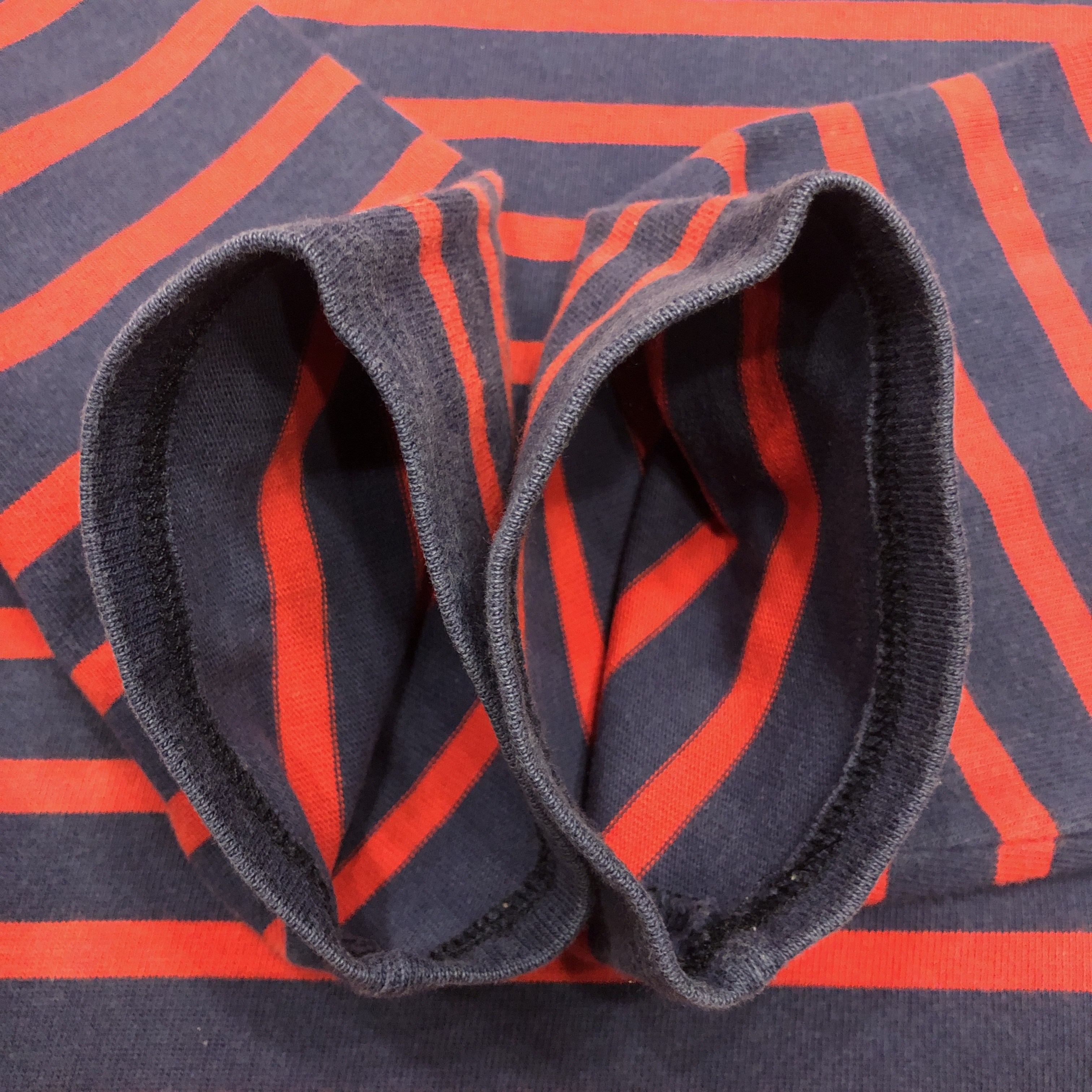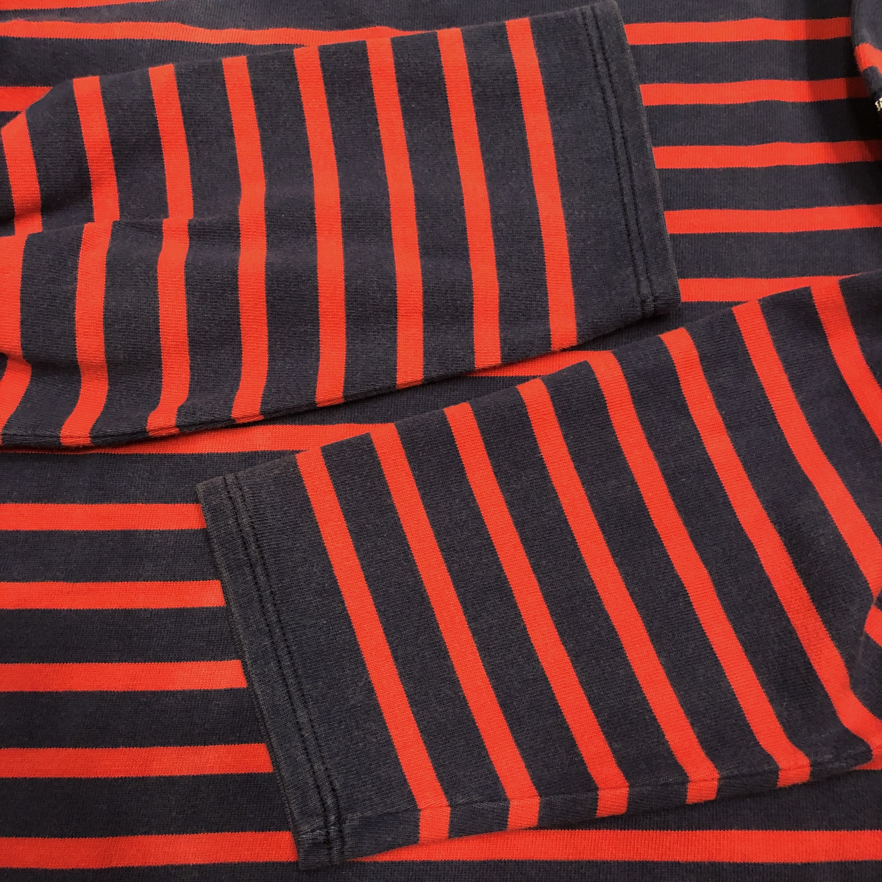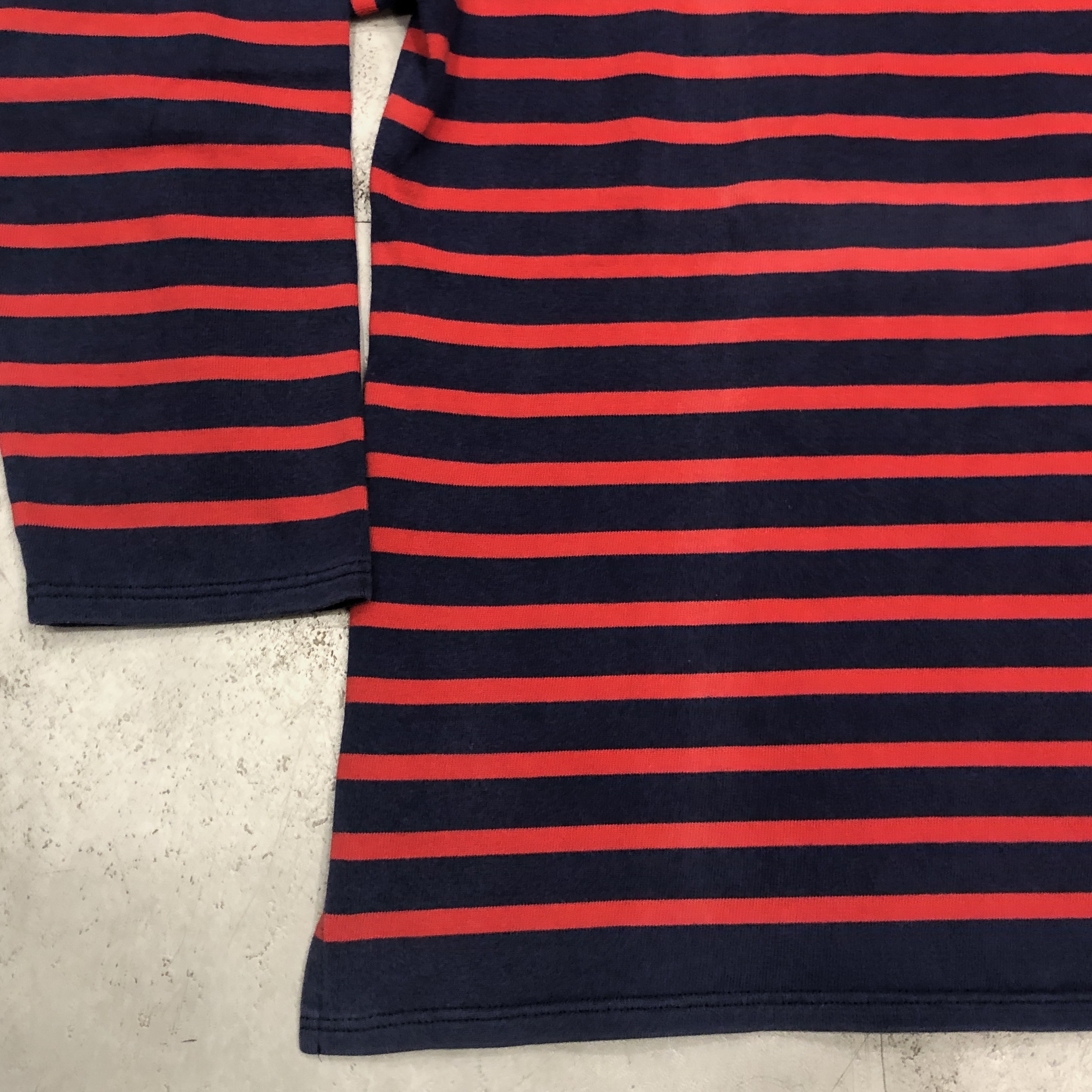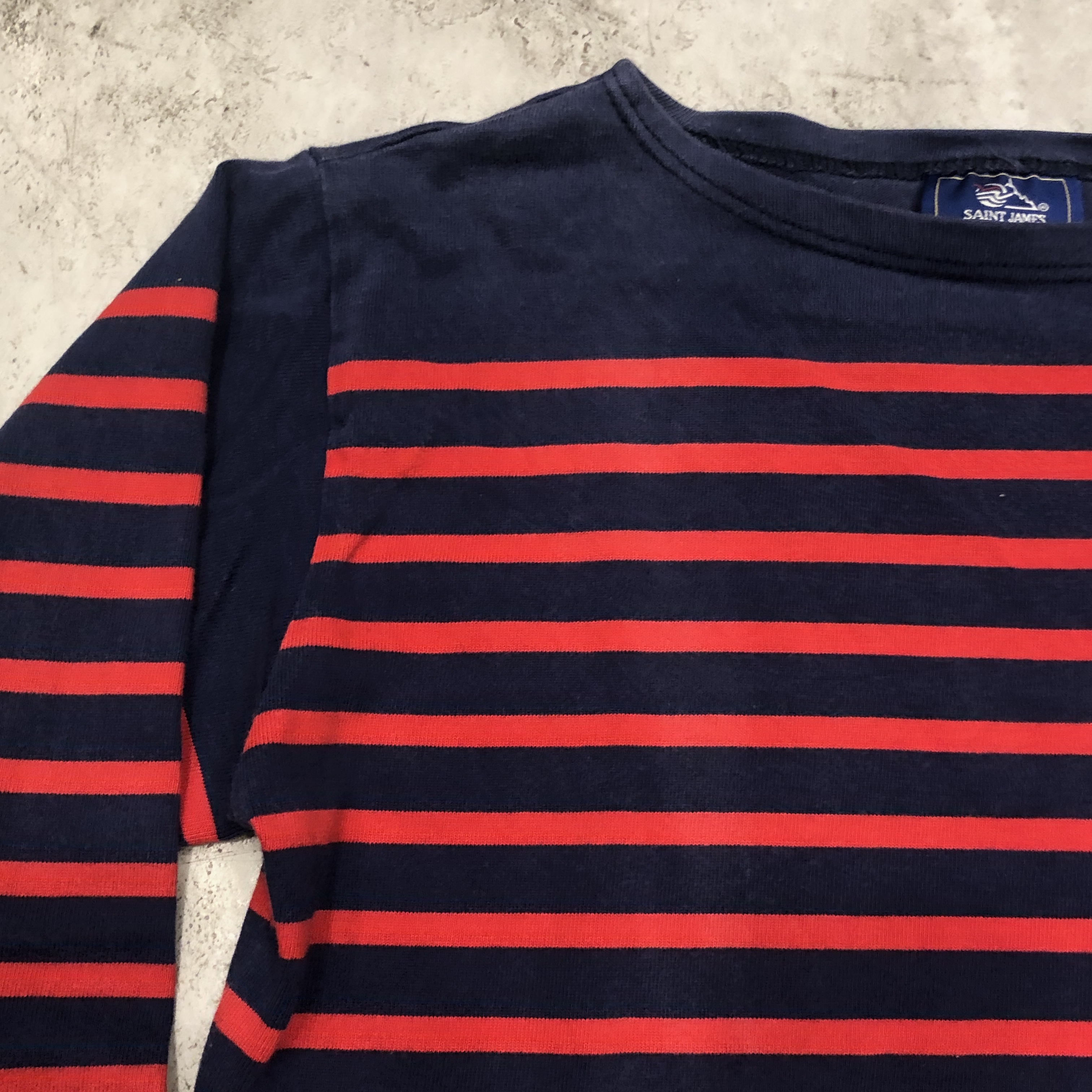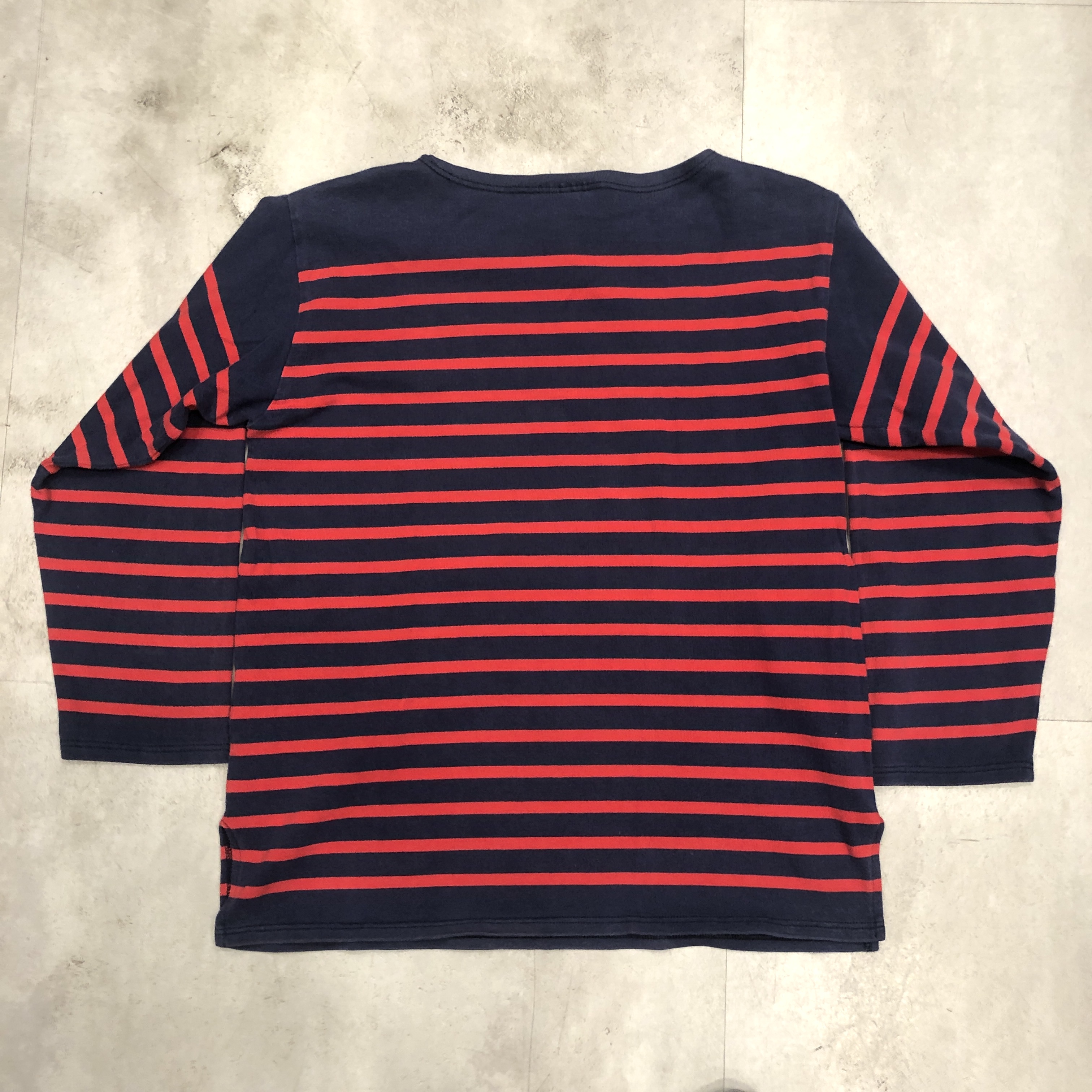 サイズ ML 実寸 肩幅 47.5cm 身幅 53.5cm 袖丈 50cm 着丈 63cm ※多少の誤差はご容赦ください。 状態 年代相応の着用感、スレ等が画像の様にございますが、古着慣れされた方でしたら問題なく着用していただける範囲です。 ※弊社の取扱商品は基本的には中古品の為、写真に写しきれない細かな汚れや擦れ、アタリ等は全て記載しきれない場合がございます。また撮影環境により、実際の色味に若干の誤差が生じる場合がございます。採寸値の±2.5cm内は誤差とさせていただき、誤差内での採寸違いやイメージの相違、細かなダメージの有無等による返品、返金、交換等は一切承れませんのでご了承下さい。ヴィンテージ、古着にご理解のある方のみご購入ください。 ※弊社のオンラインショップ掲載商品は店頭での販売も行っています。 そのため同時に注文がなされた場合には、全て店頭販売を優先させて頂きますので、予めご了承ください。 商品詳細 SAINT JAMESの中でも海を色濃く感じるモデル「NAVAL」。 定番の「OUESSANT」とは一味違い、薄手のコットン生地を採用。軽やかな着心地と、スッキリと長めの着丈、そして裾のスリットがシルエットに動きを生み出します。ネイビーとレッドの絶妙な配色も使い勝手抜群。季節を問わずインナーとしても一枚でも活躍してくれます。そして本個体は80年代後半から90年代の希少な一品。 お探しの方はぜひこの機会に。