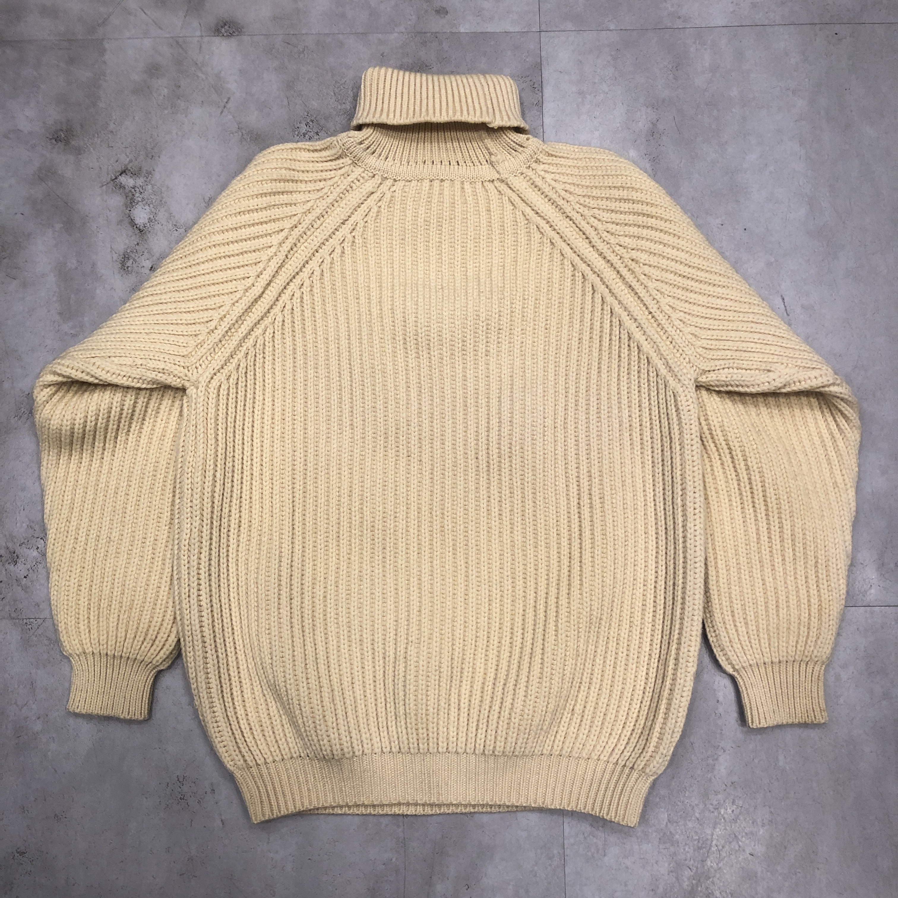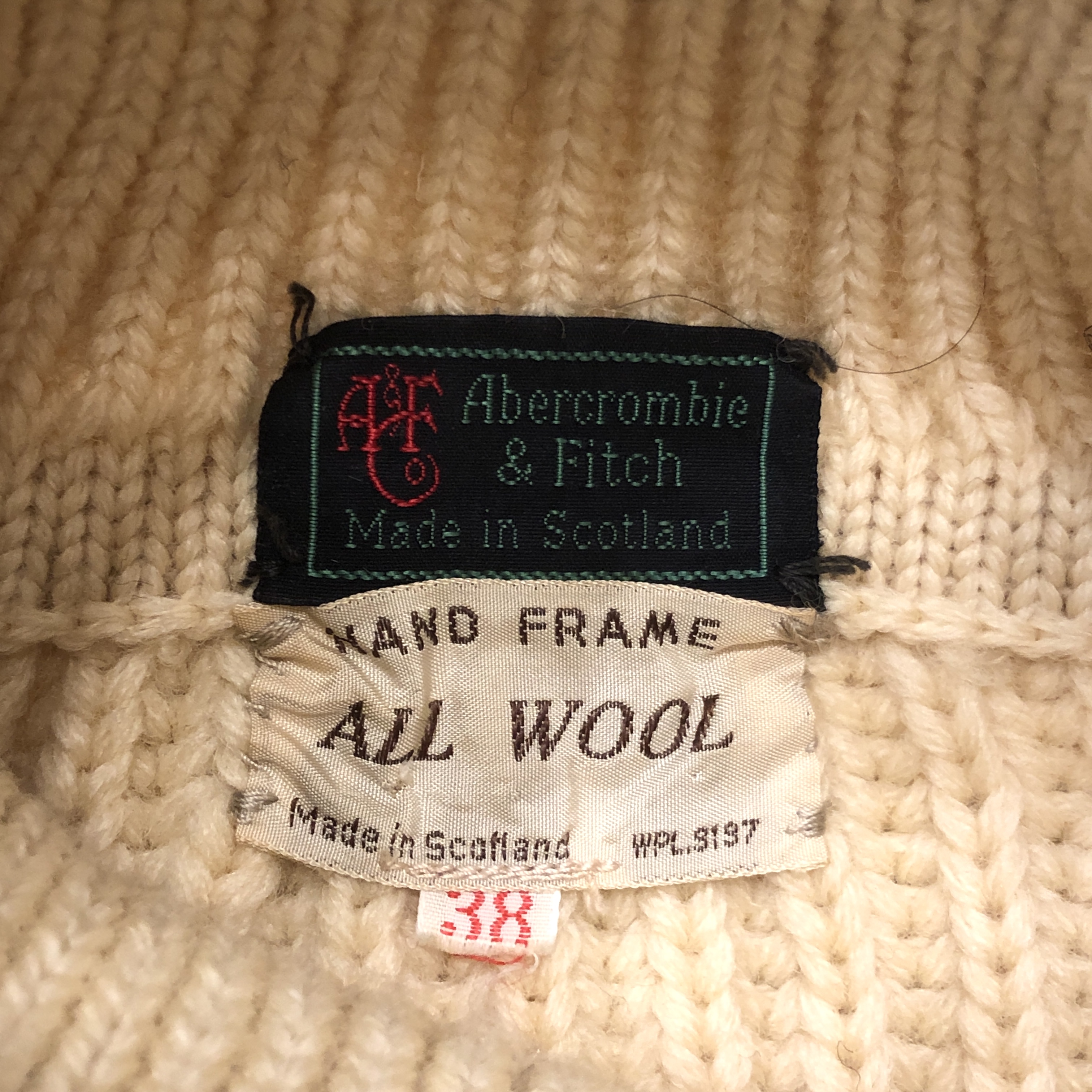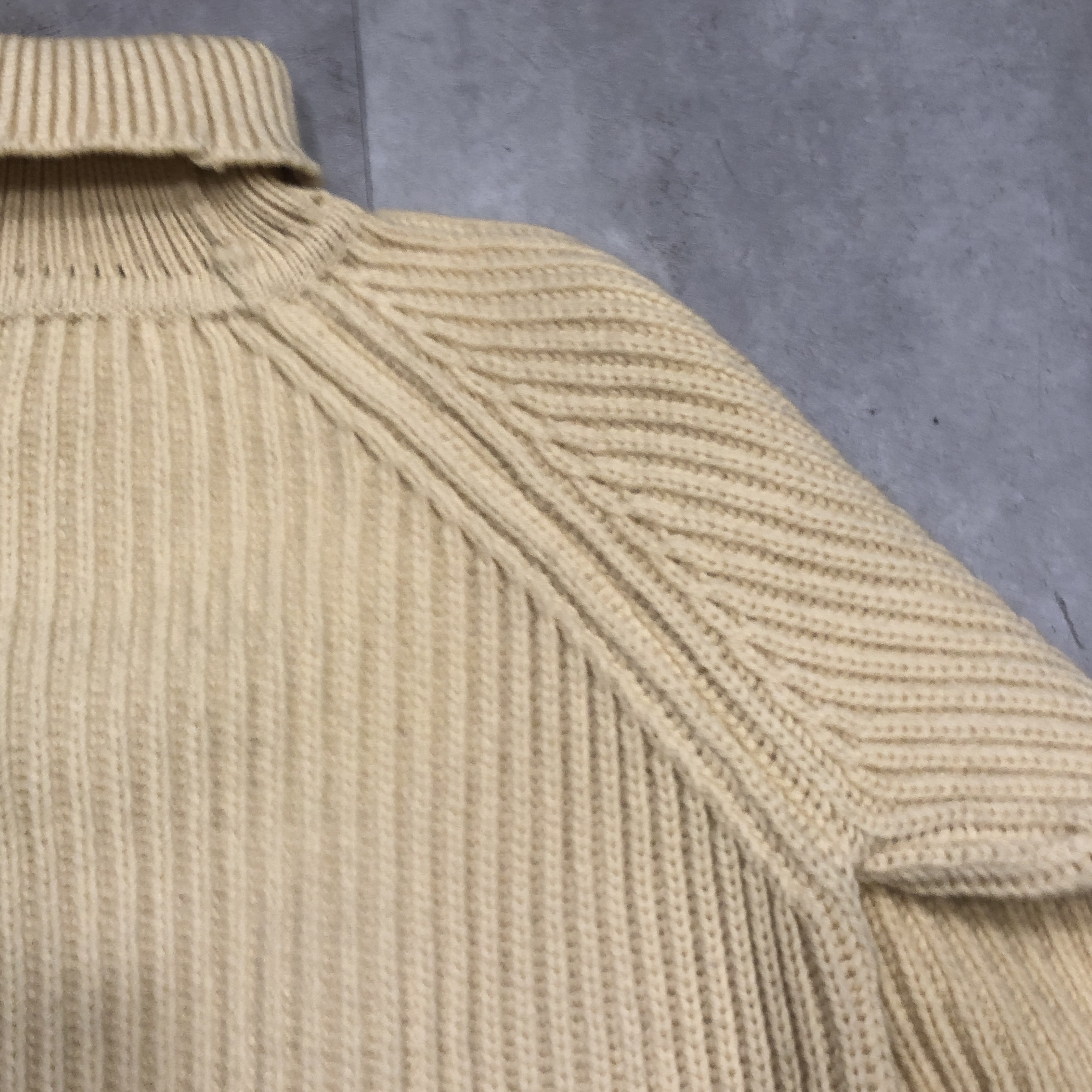 - アバクロ黄金期—— その誇り高きスコットランド製ウールリブ・タートルネックが入荷しました。肉厚で空気をふくんだ凹凸あるリブ、ぎゅっと目が詰まりながらも驚くほど柔らかい触り心地は、現行ではほとんど味わえないクラシックニットの魅力をそのまま留めています。淡いバタークリームのようなオートミールカラーがまた秀逸で、北欧の漁師ニットを思わせる無骨さと、スコットランドニット特有の上品さが絶妙に同居。ヴィンテージアバクロらしく、ラグランスリーブによる丸みのある肩線が美しいシルエットをつくり、冬のスタイルに静かな存在感を与えてくれます。アウトドア、ミリタリー、クラシックのどれにも自然に馴染み、ニット好きなら一度は手にしておきたい完成度の高い一着です。