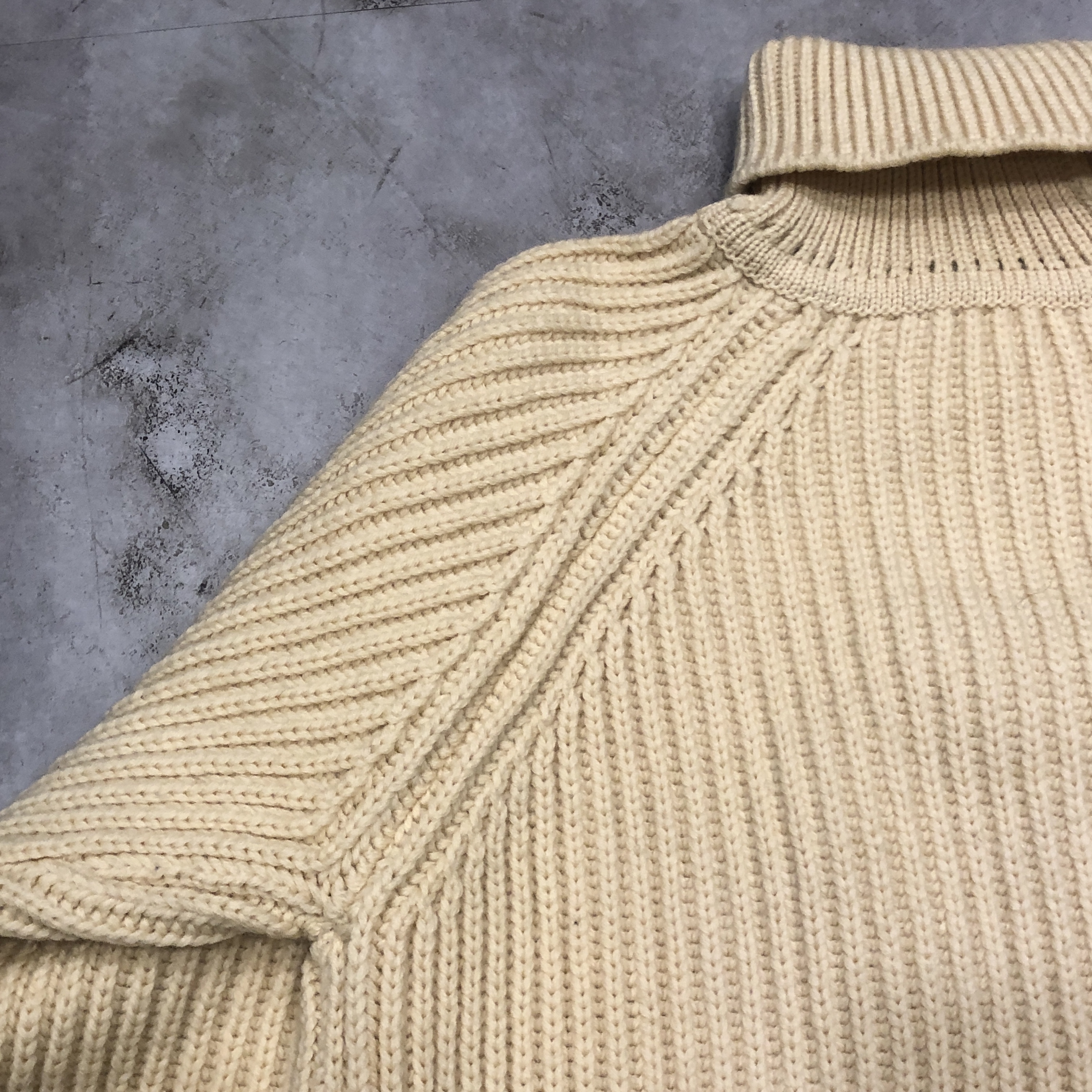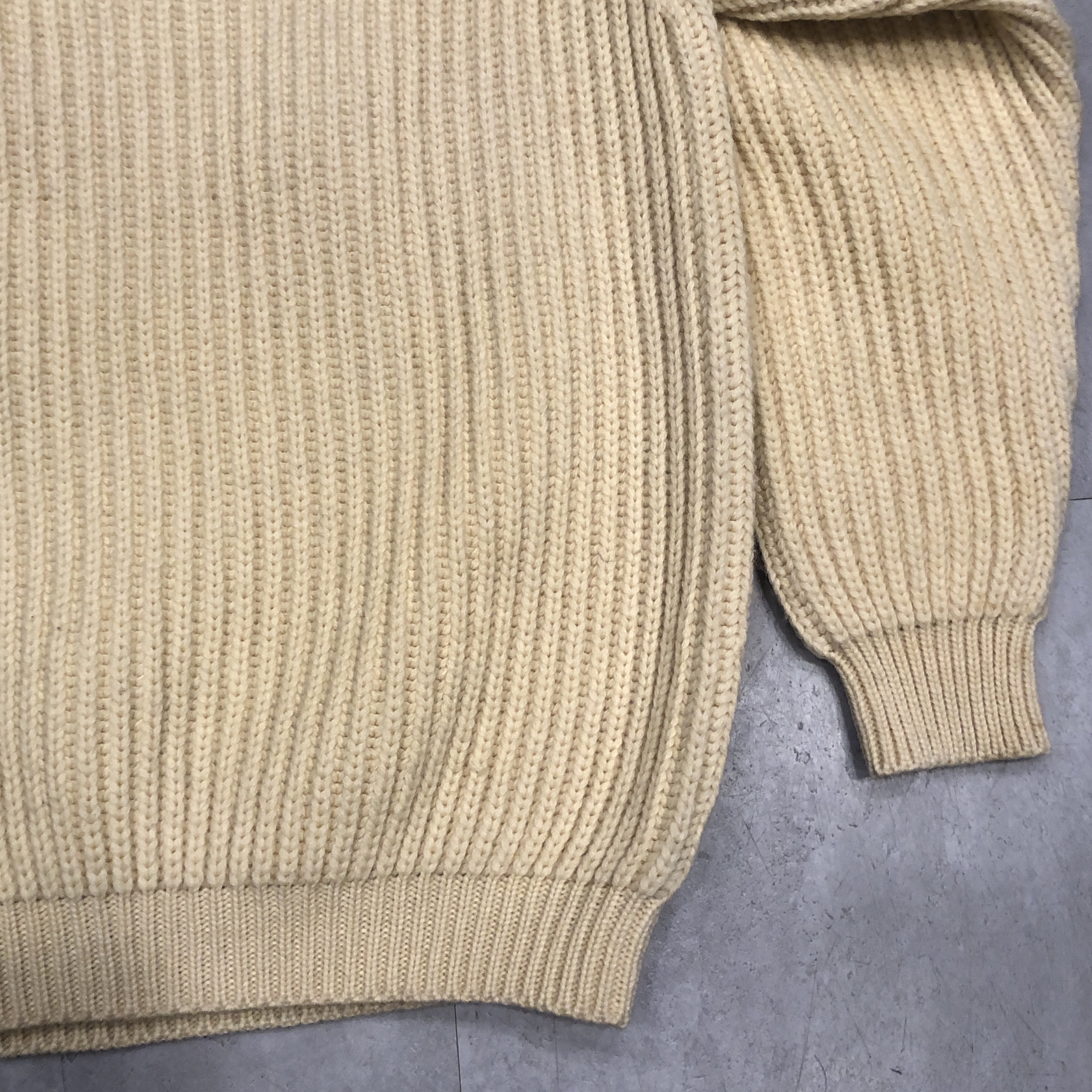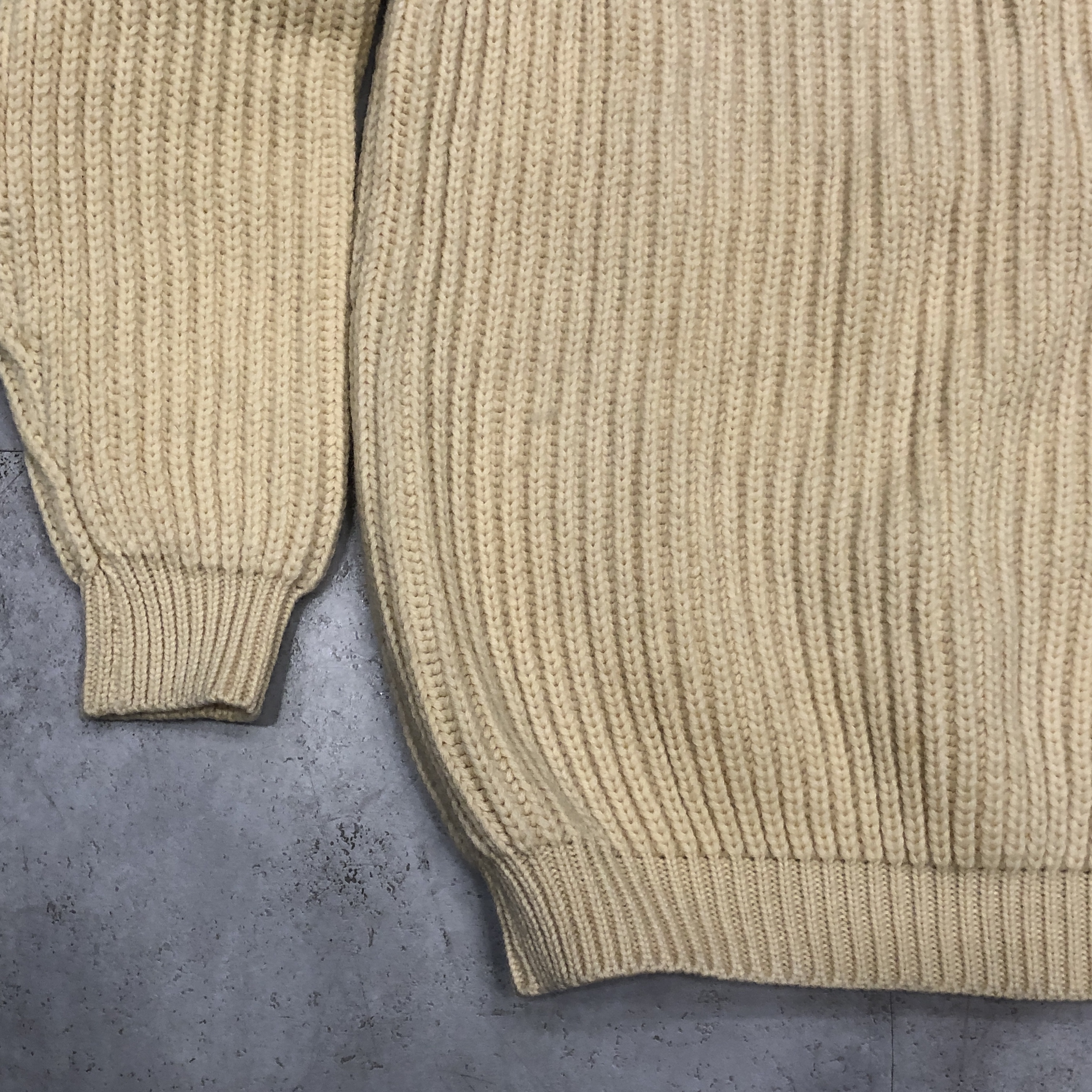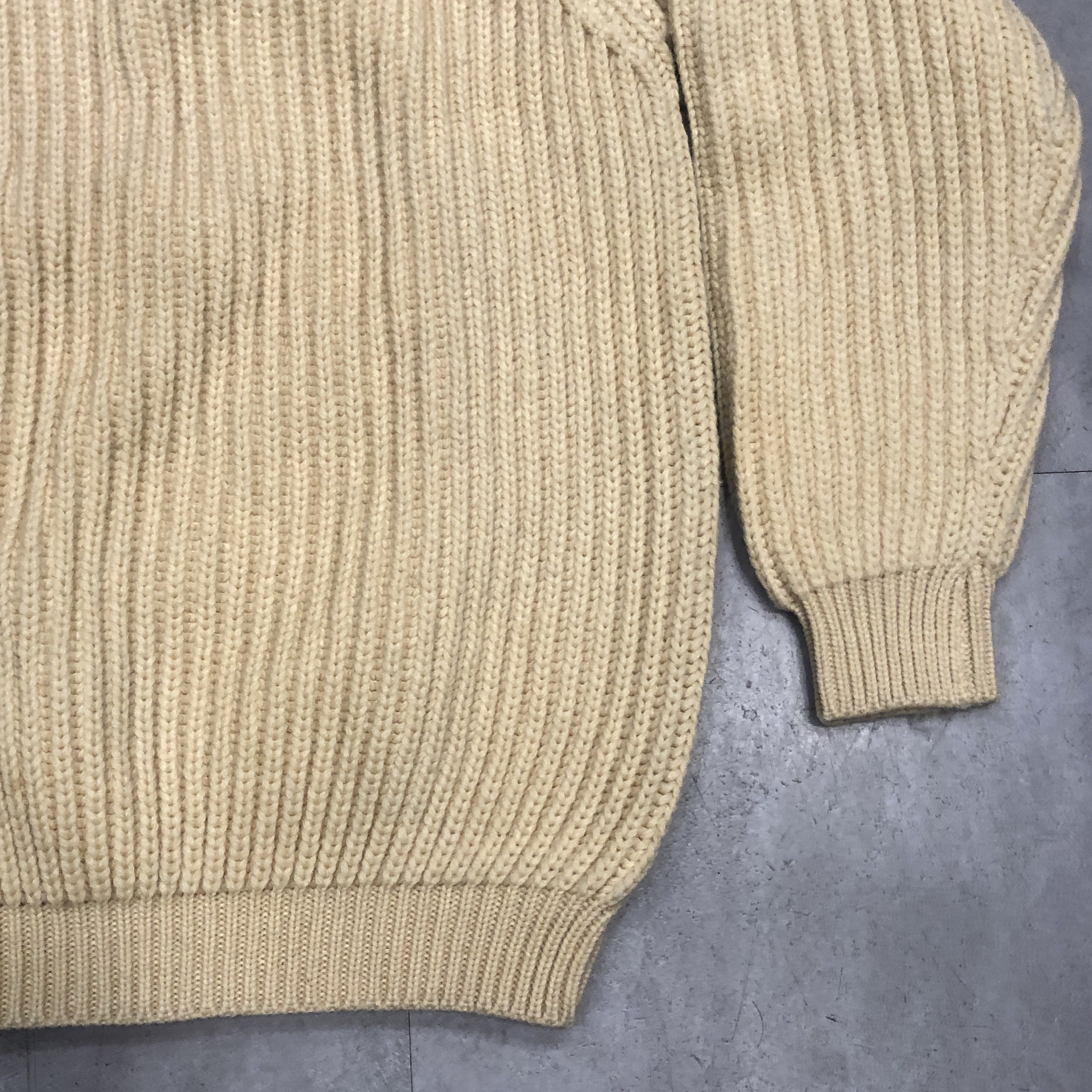 - アバクロ黄金期—— その誇り高きスコットランド製ウールリブ・タートルネックが入荷しました。肉厚で空気をふくんだ凹凸あるリブ、ぎゅっと目が詰まりながらも驚くほど柔らかい触り心地は、現行ではほとんど味わえないクラシックニットの魅力をそのまま留めています。淡いバタークリームのようなオートミールカラーがまた秀逸で、北欧の漁師ニットを思わせる無骨さと、スコットランドニット特有の上品さが絶妙に同居。ヴィンテージアバクロらしく、ラグランスリーブによる丸みのある肩線が美しいシルエットをつくり、冬のスタイルに静かな存在感を与えてくれます。アウトドア、ミリタリー、クラシックのどれにも自然に馴染み、ニット好きなら一度は手にしておきたい完成度の高い一着です。