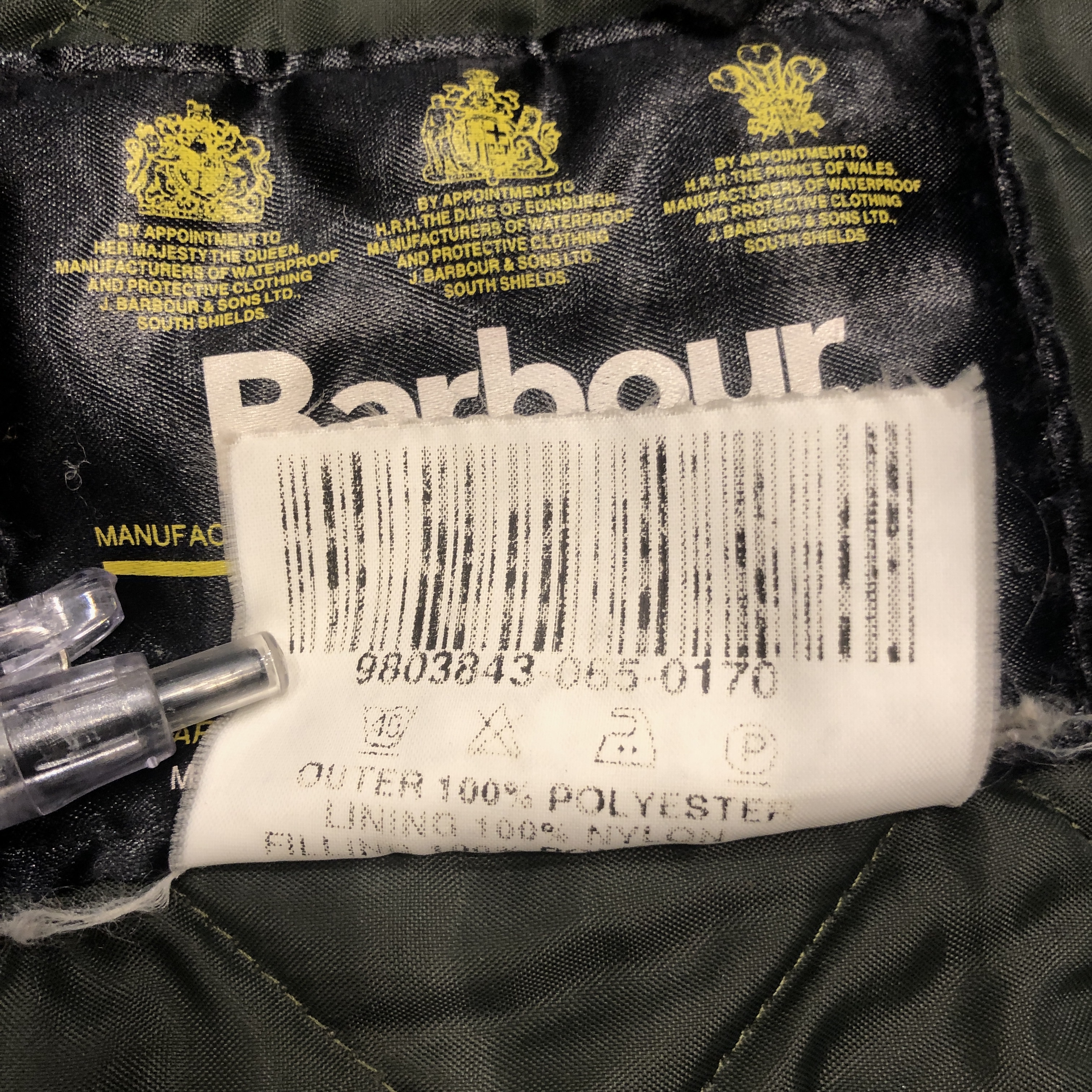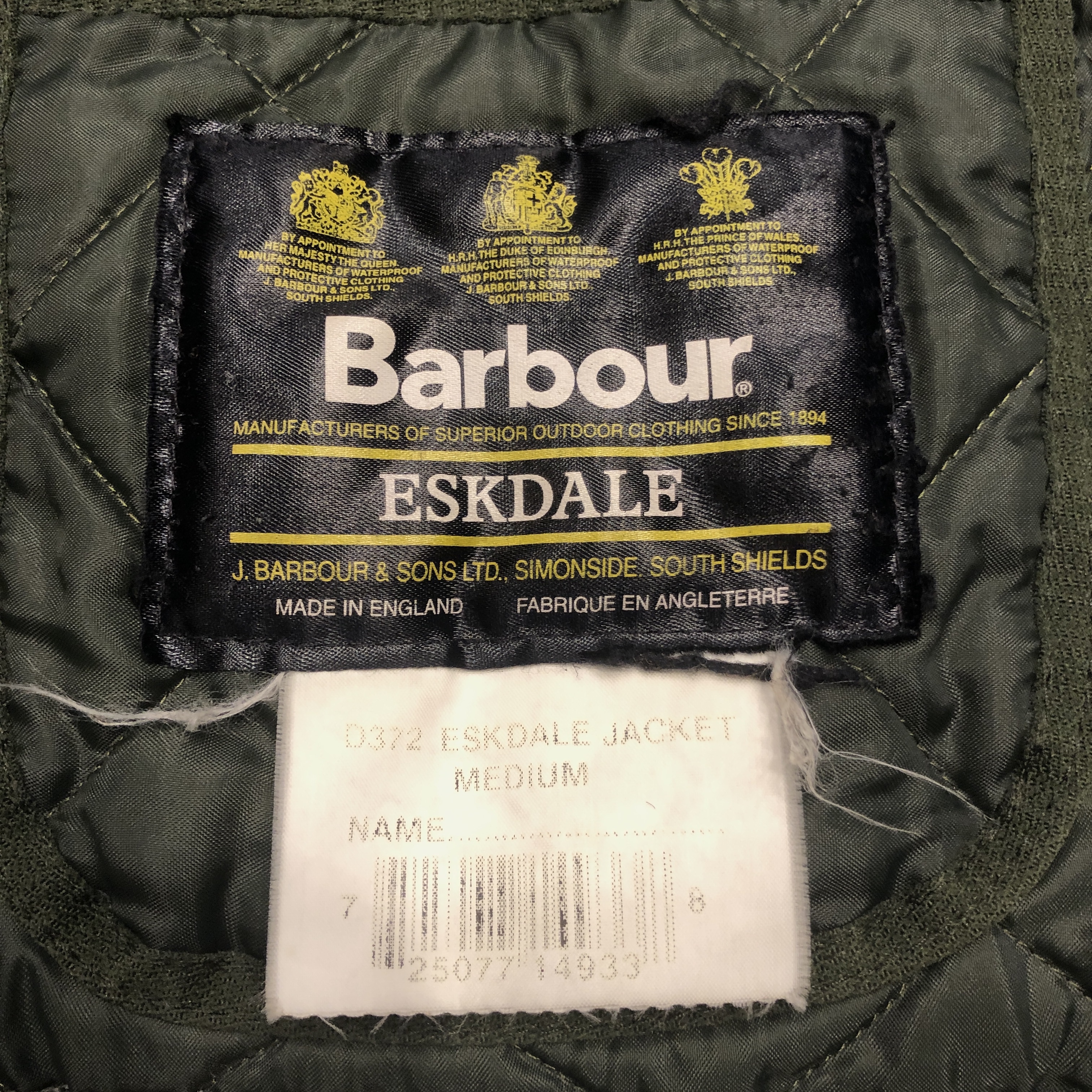 タグには 3ワラント(Royal Warrants) が並び、英国王室御用達が揃った時代の Barbour を象徴する仕様。