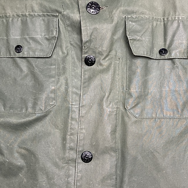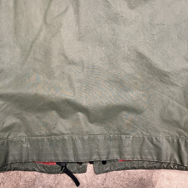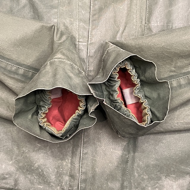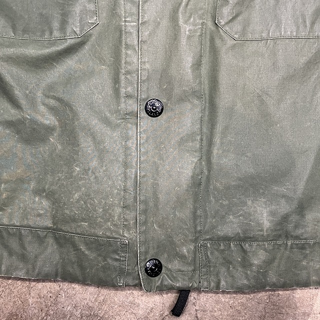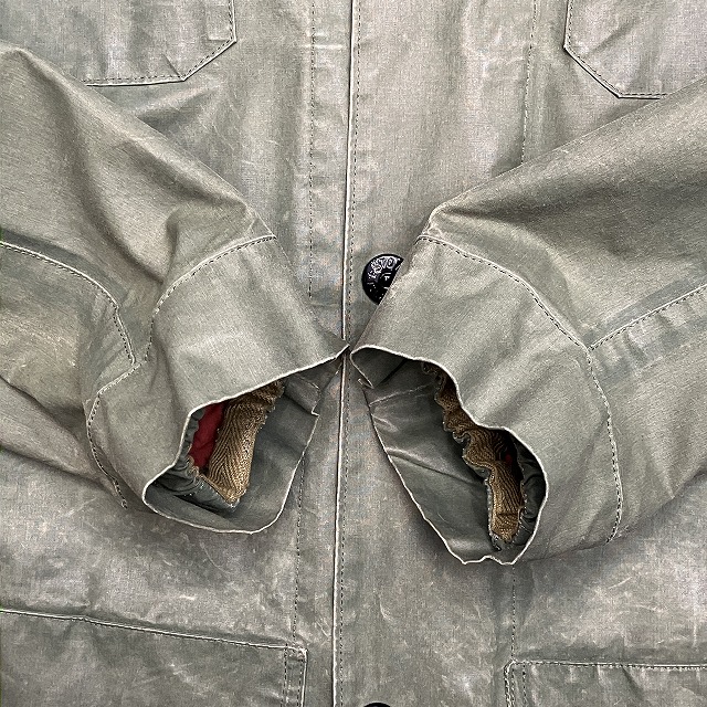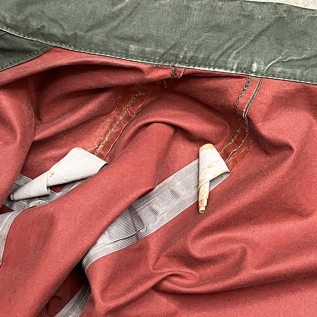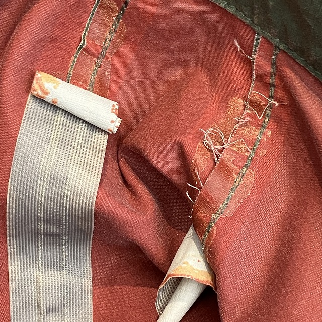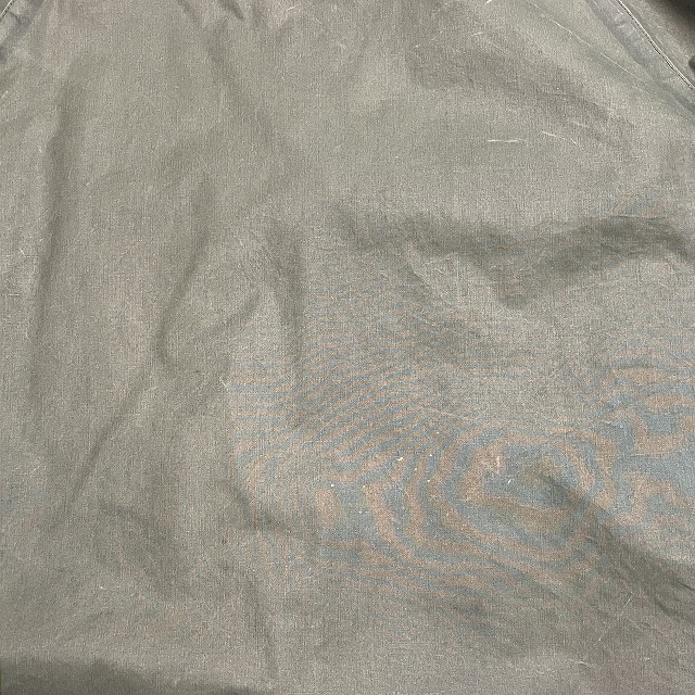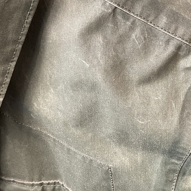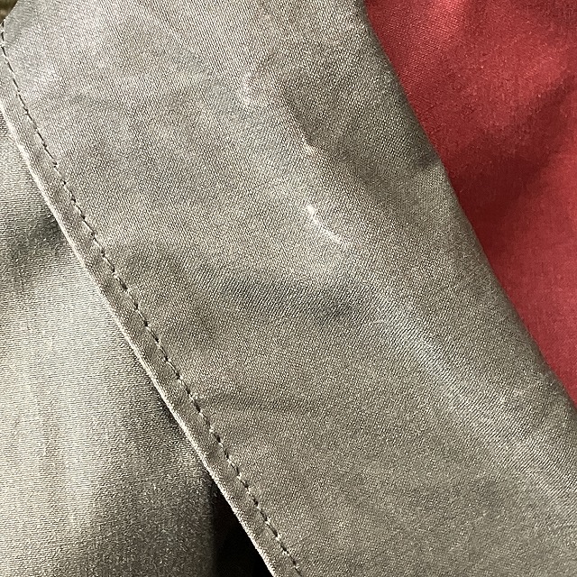 - 全体的に生地特有のスレ、アタリ、テカリが見られます。その他、所々に汚れ、内側部分のシームテープの剥がれが見られます。