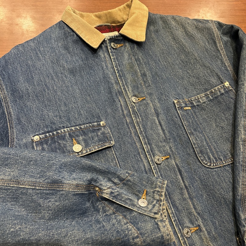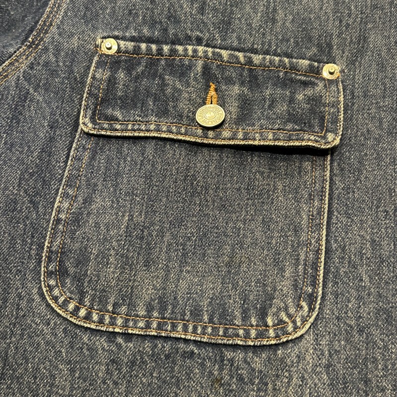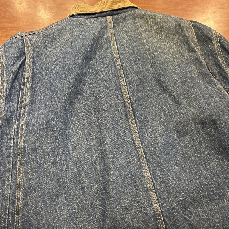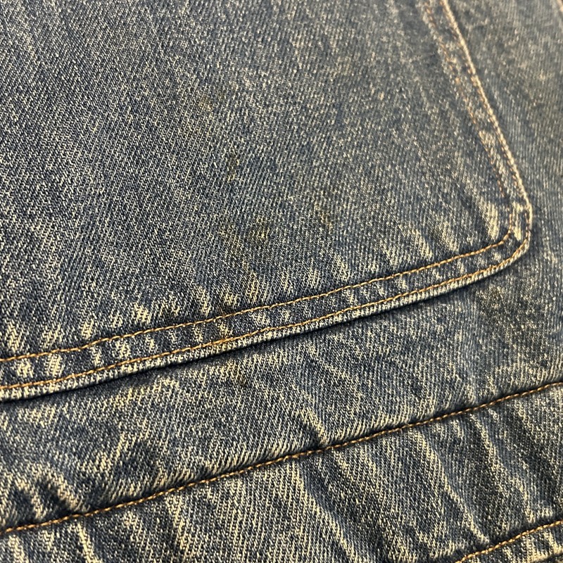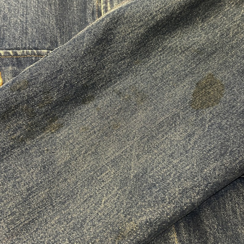 - 袖や裾など複数箇所にシミ、袖裏地のステッチ抜け、デニム特有の色落ちやアタリ等の着用感がございます。その他に目立つ汚れやダメージ等は無く、古着慣れされた方におすすめです。