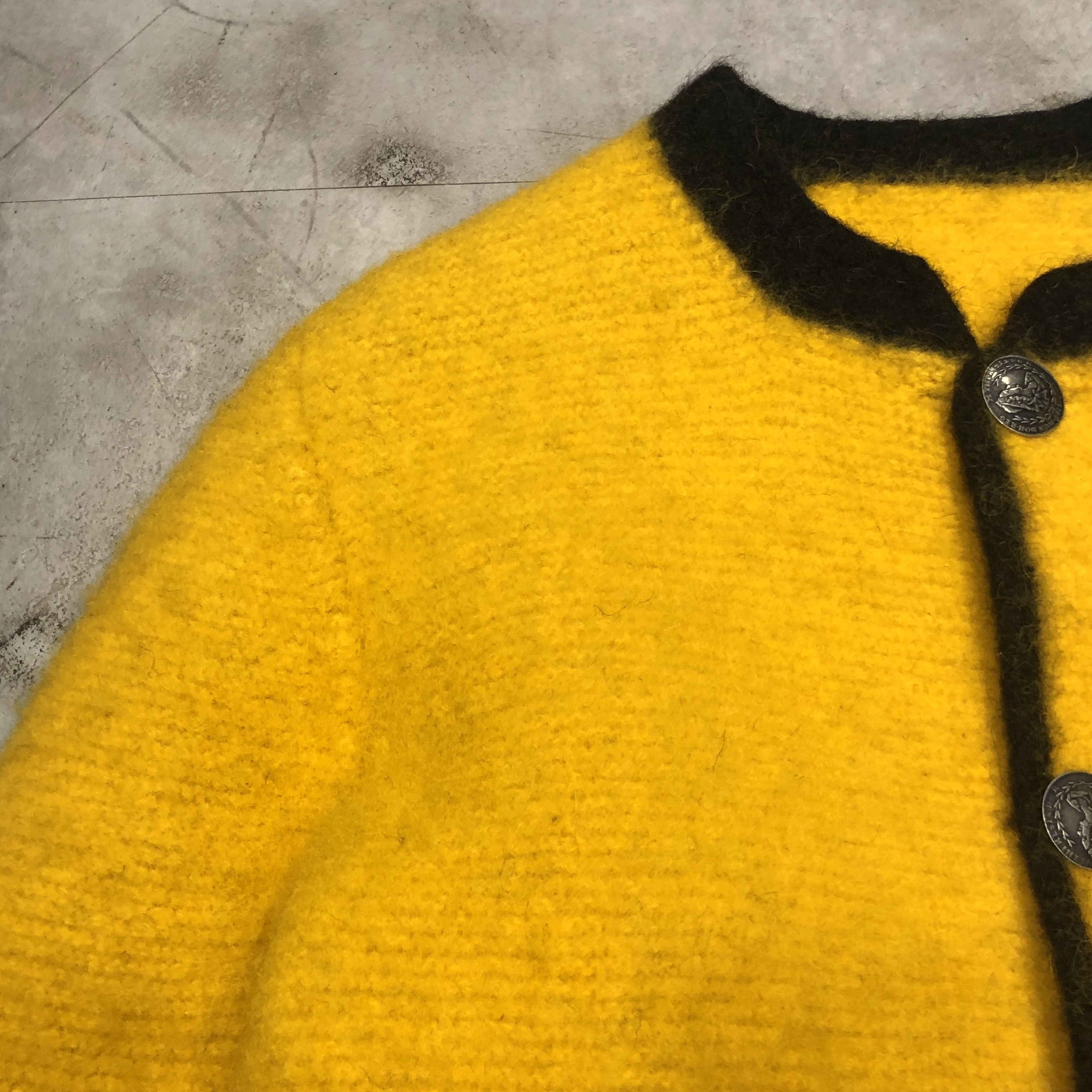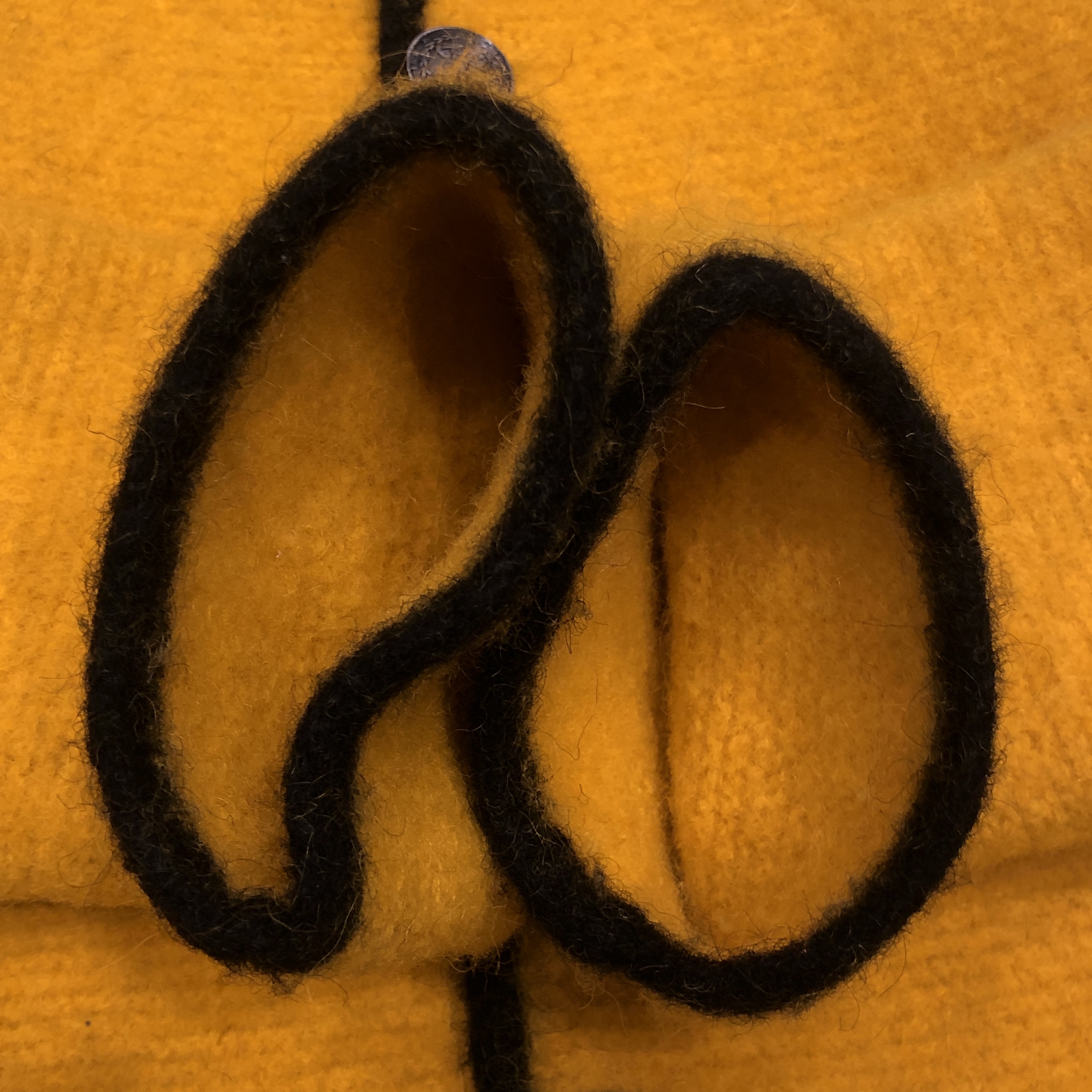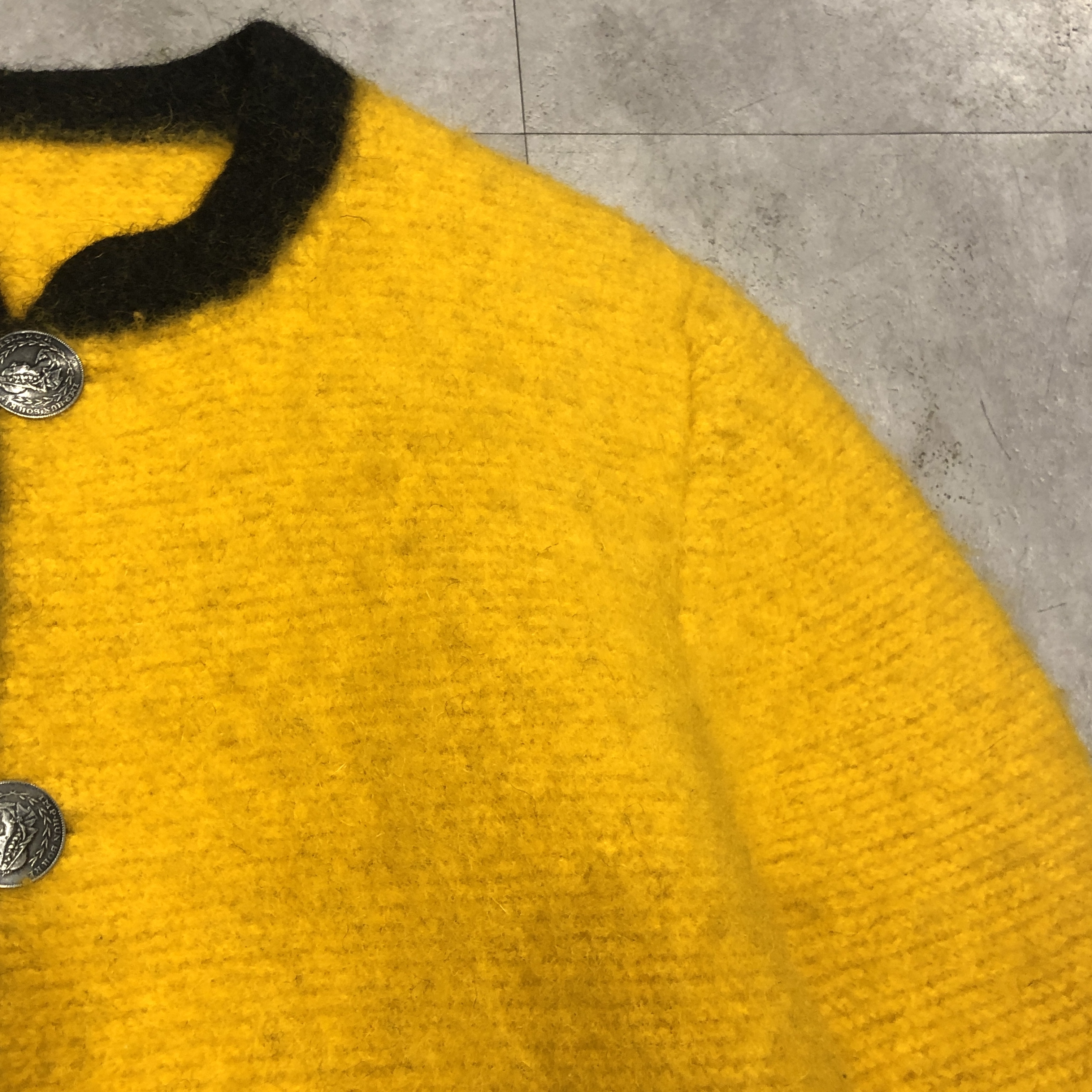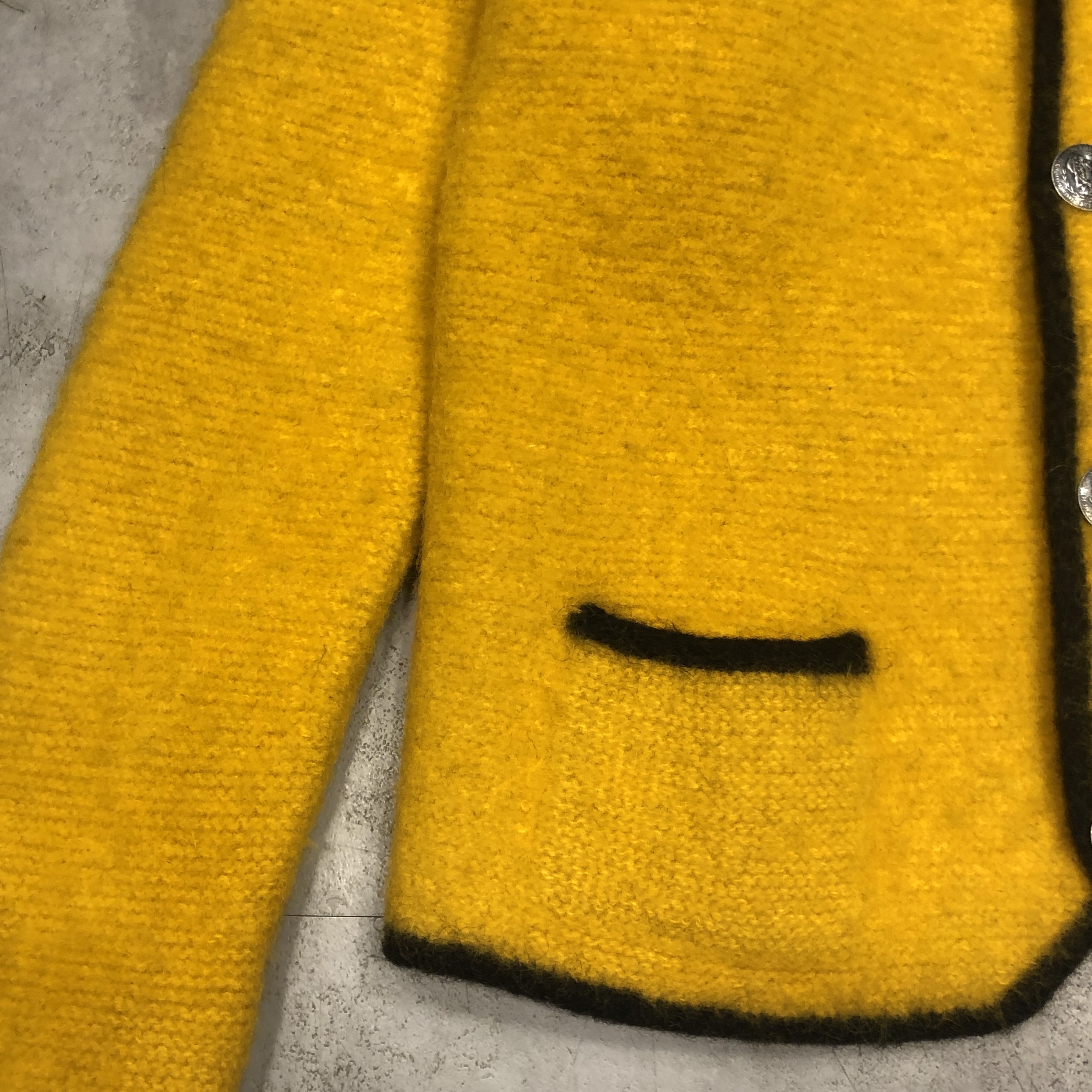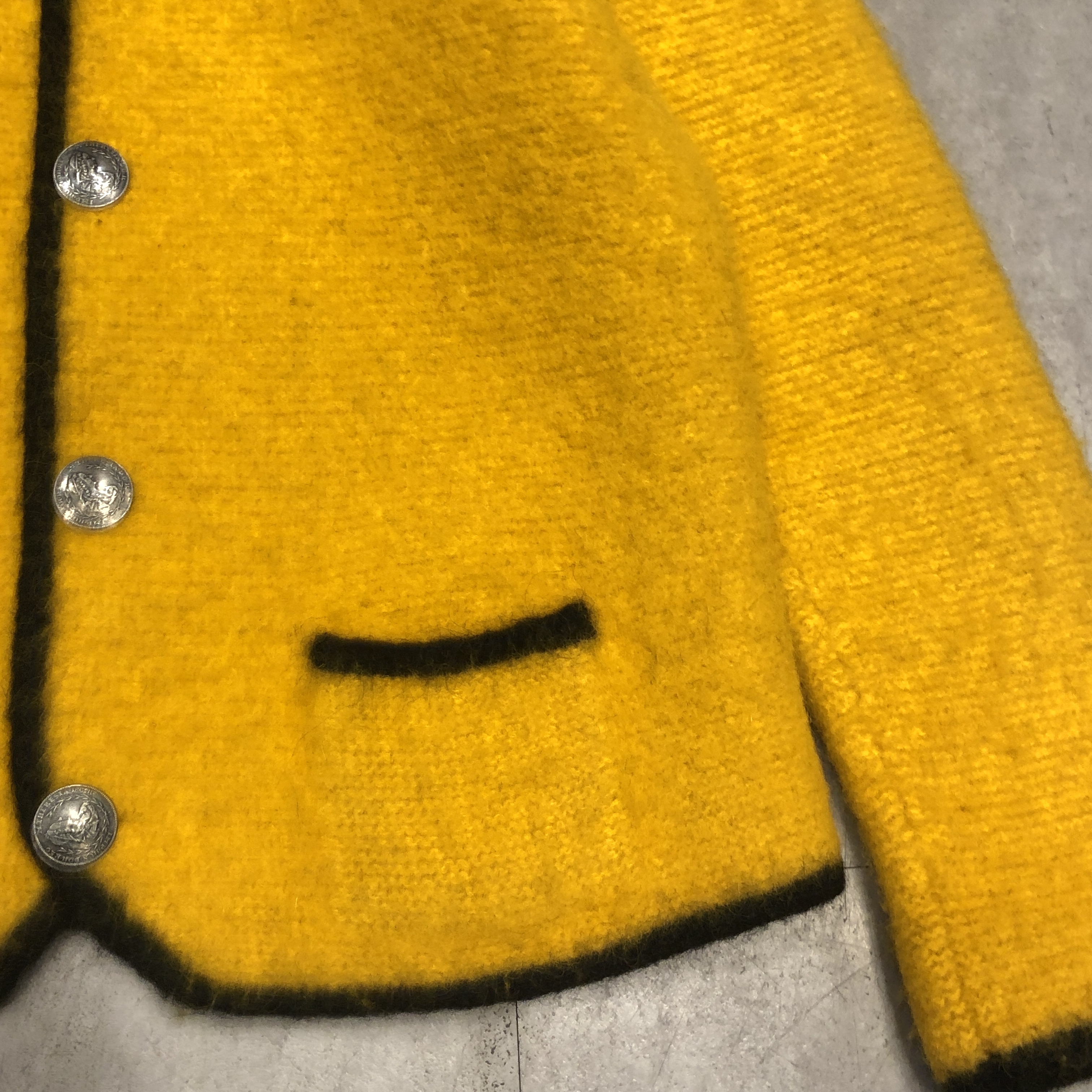 ざっくりとしたハンドメイド感のある暗めのイエローの毛足に、ブラックのパイピングが効いたコントラスト。シルバーのメタルボタンには、マリア・テレジアが刻印され、細部まで文化と歴史が息づいています。