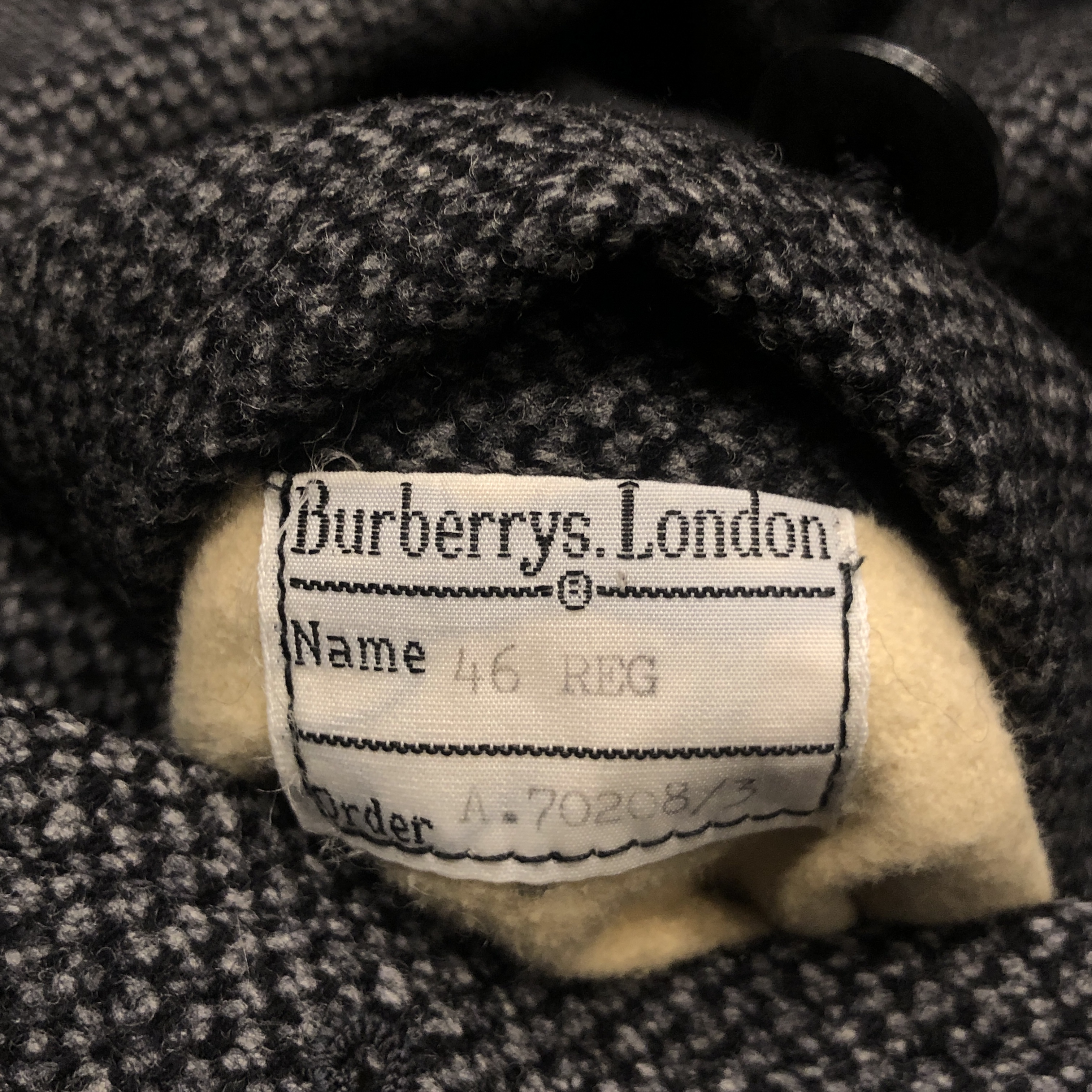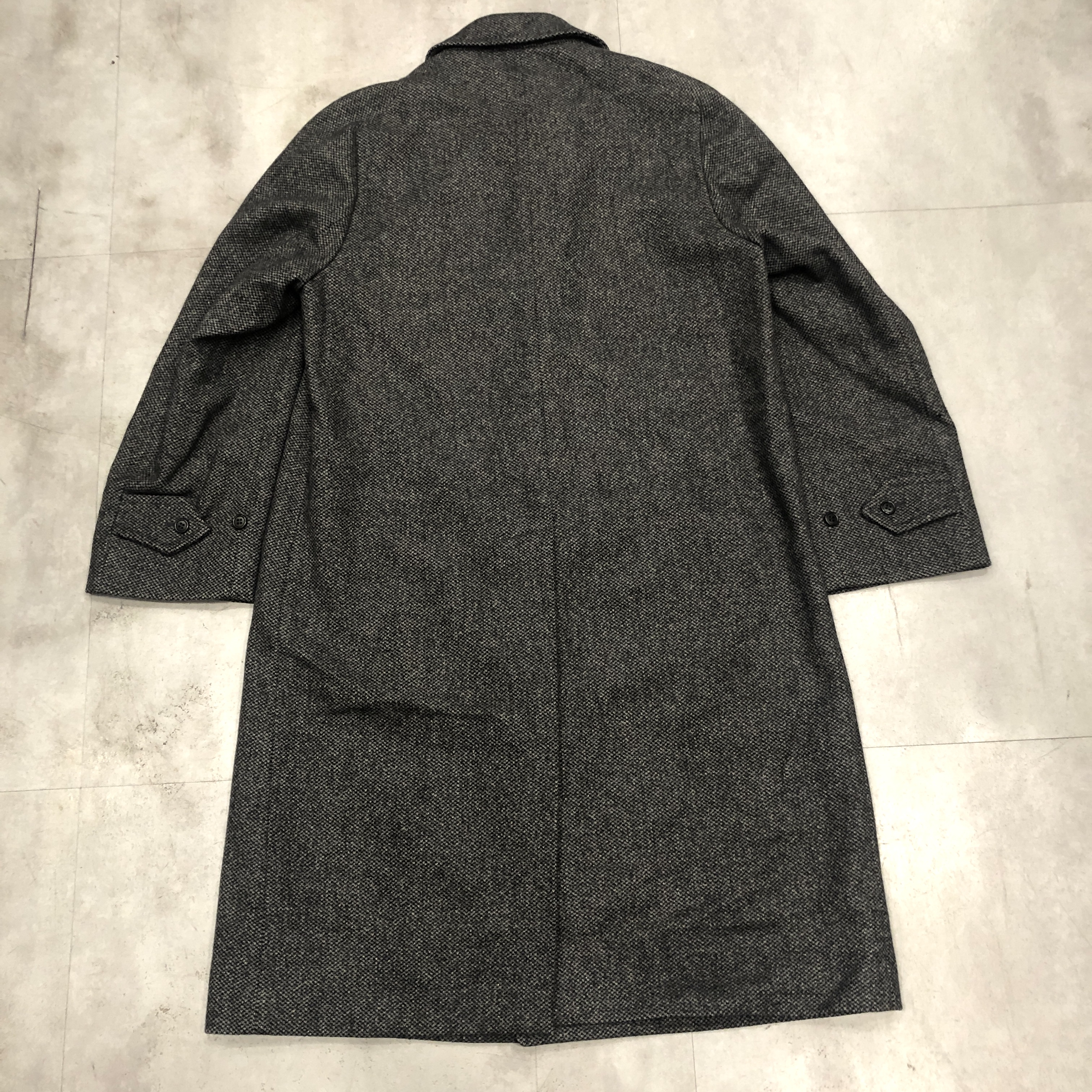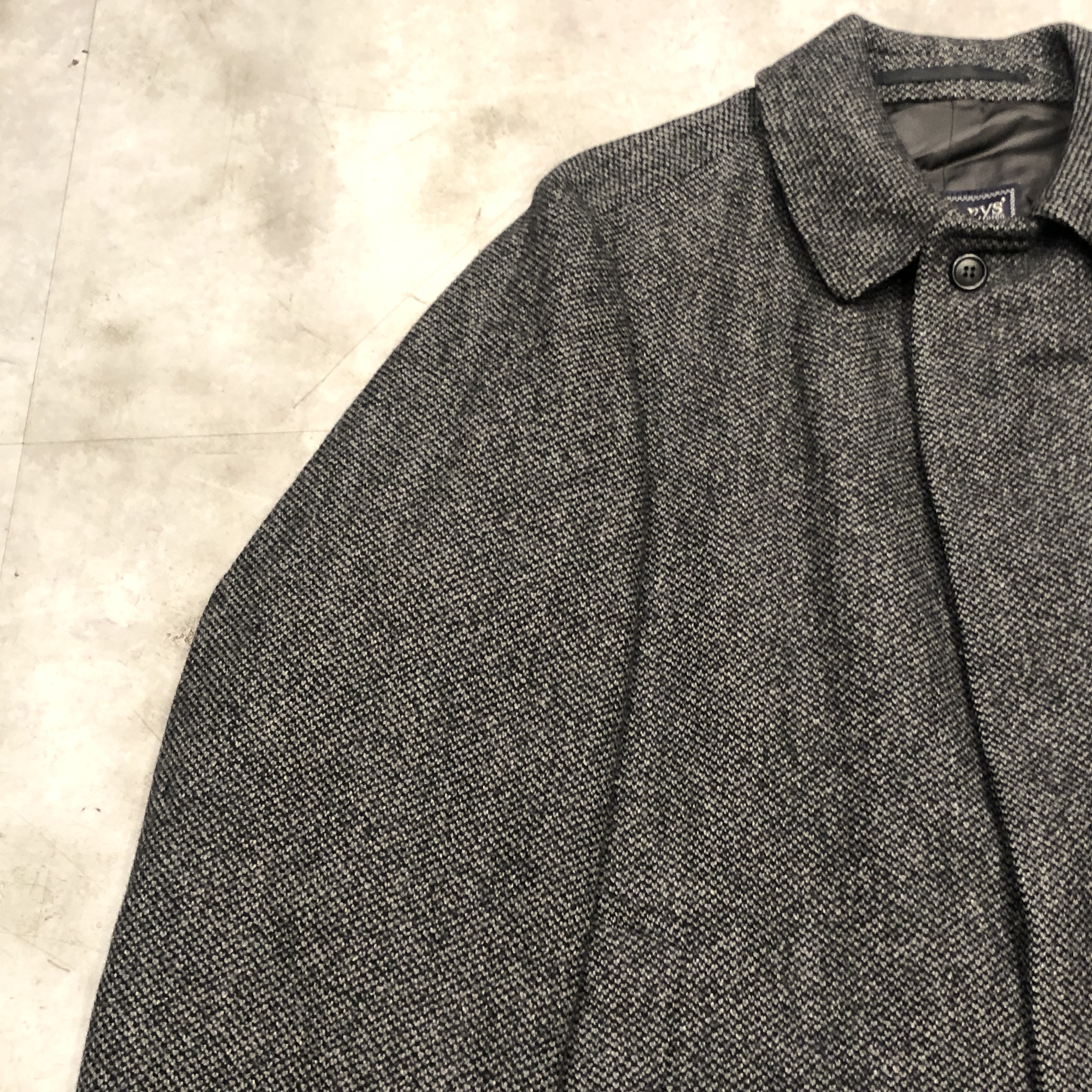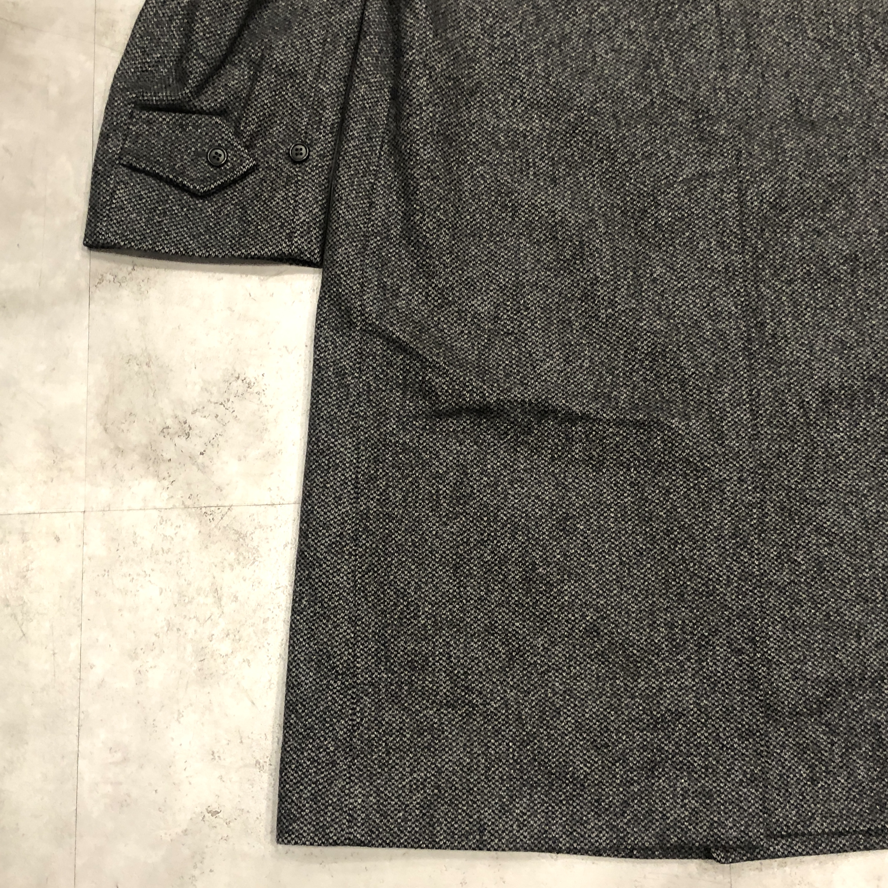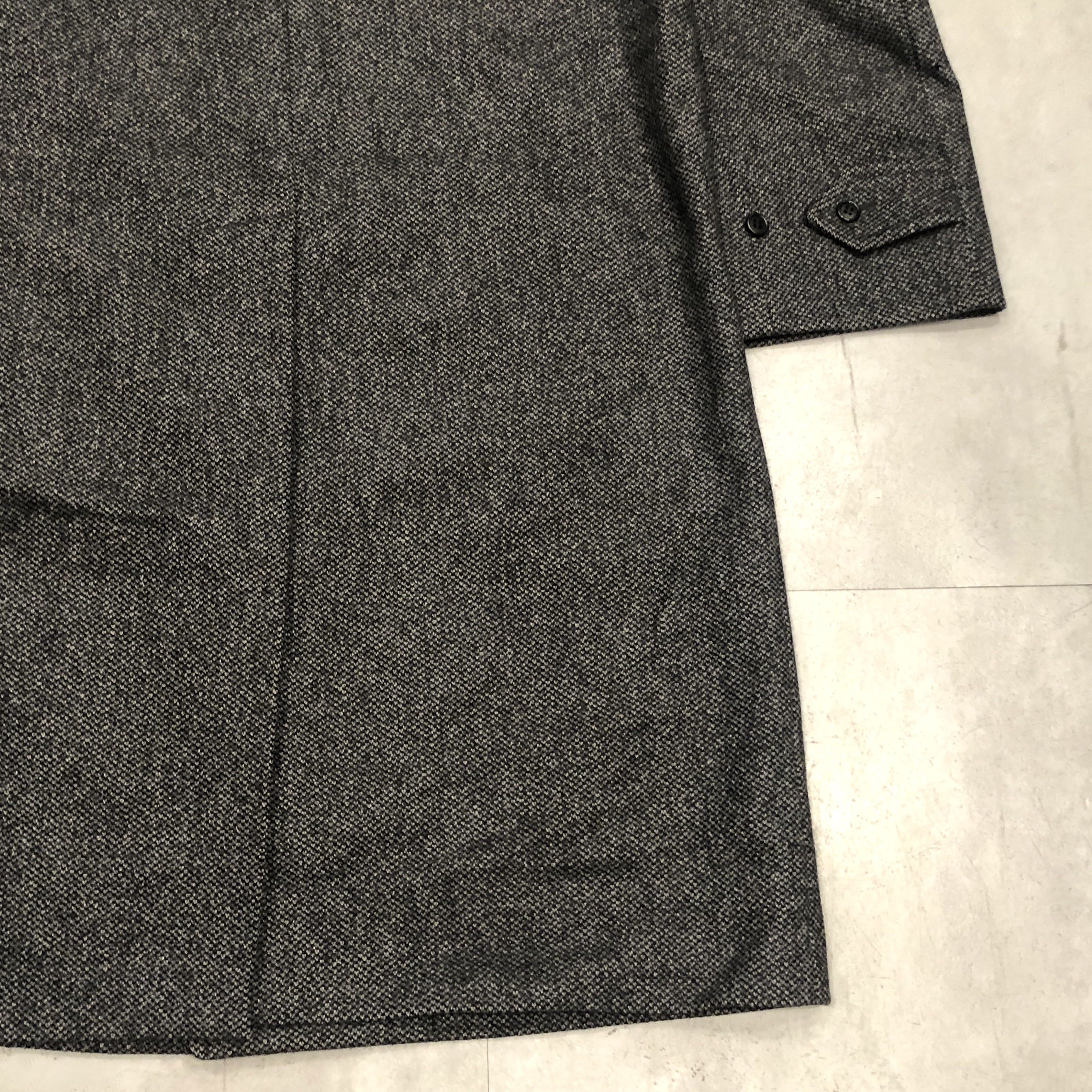BURBERRYのスコティッシュサクソニーのサドルショルダーコートのご紹介です。グレーベースの細かなミックスツイードは、スコットランド製サクソニーウール(タグ表記100%WOOL)ならではのふくらみと柔らかさがありつつ、ぎゅっと目が詰まっていて冬場のアウターとしてとても心強い質感。肩は所謂サドルショルダーで、シルエットが実にエレガントです。フロントは比翼仕立てで、余計な装飾を削ぎ落としたミニマルな表情ですが、裏側には「MADE EXPRESSLY FOR Maurice Gladek, METZ」と入るスペシャルタグが付き、ヨーロッパの高級紳士服店別注で仕立てられたグレードの高さがうかがえます。ライニングは100%ビスコースで袖通しなめらか、サイズは表記46 REGのゆったりとしたフィッティング。スーツの上からガバッと羽織ってもシルエットが崩れにくく、ニット+デニムに合わせて少しラフに着崩してもサマになる、まさに“上質な日常着”としてのバーバリーの真骨頂を味わっていただけるコートだと思います。