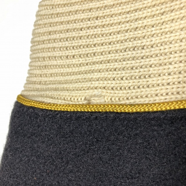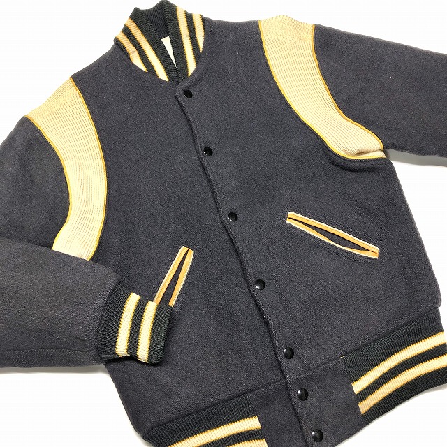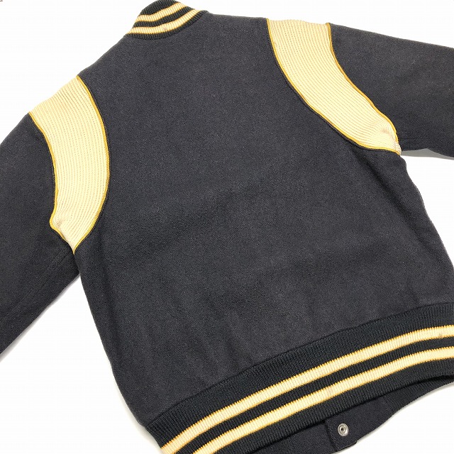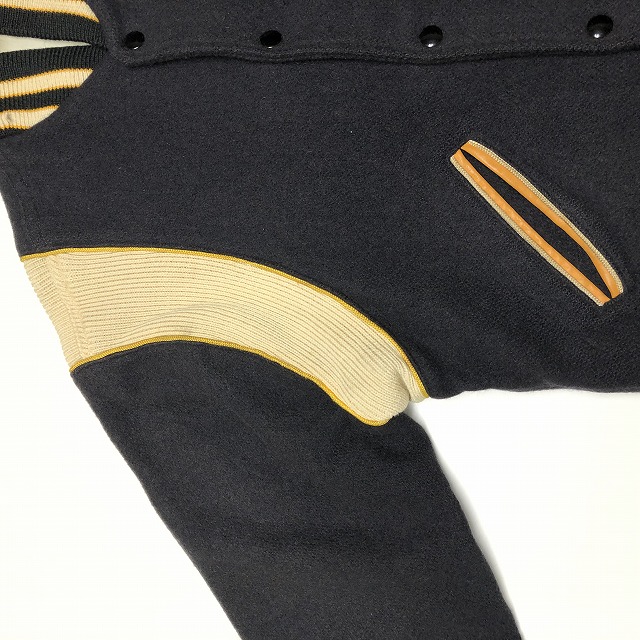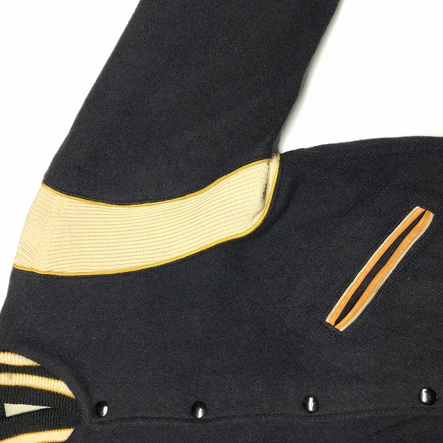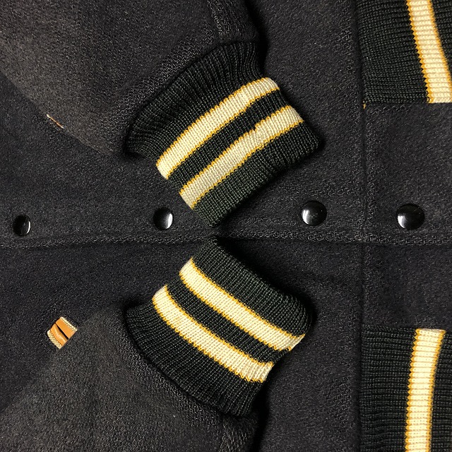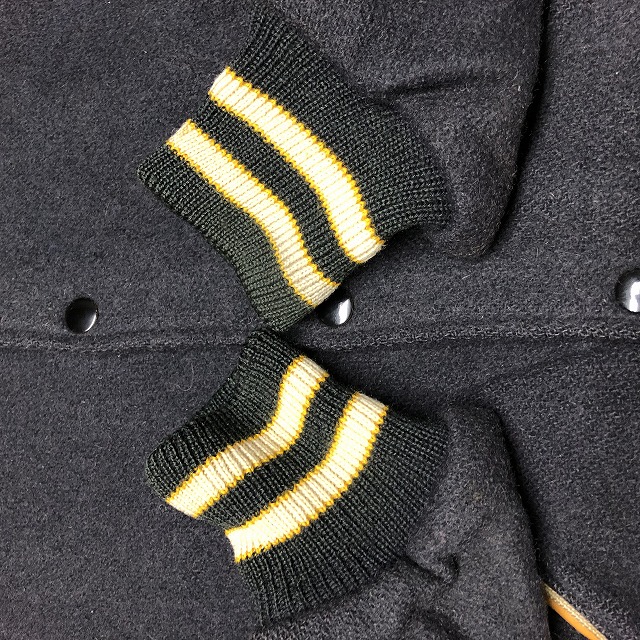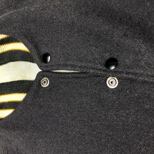肩にリブの切り替え、黒のスナップボタン、各リブは黄色×白×黒のボーダーです。