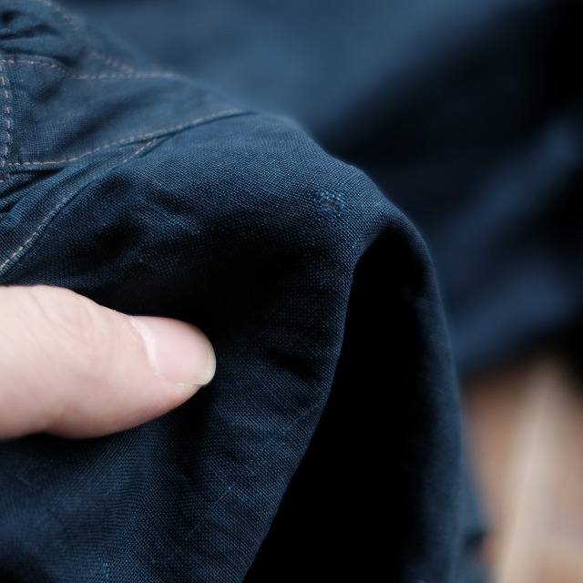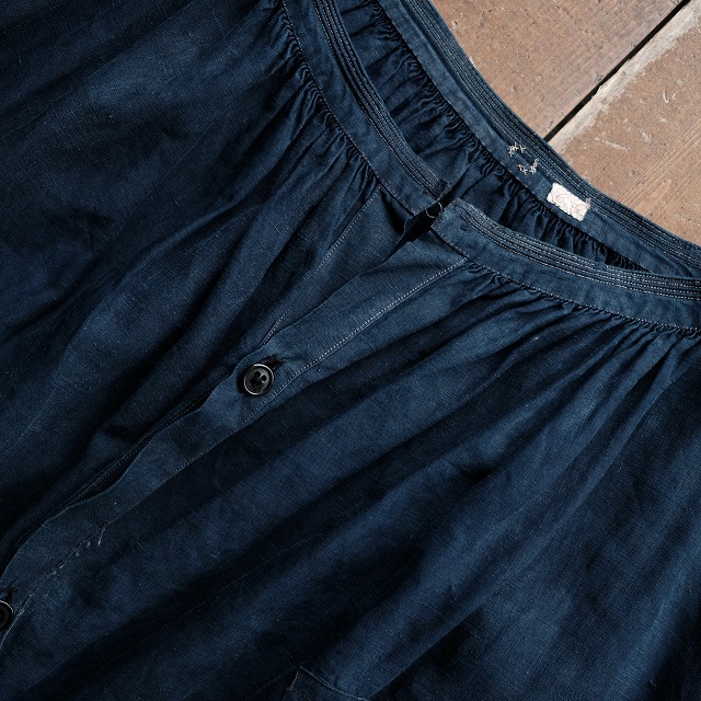 - 1800年代から1900年代迄フランスで労働着として長く使用されてきたインディゴリネンスモック。現代では再現不可能な特徴的なプルプルとしたリネン生地。インディゴの染料がエイジングにより芸術的に美しい表情を作り出します。