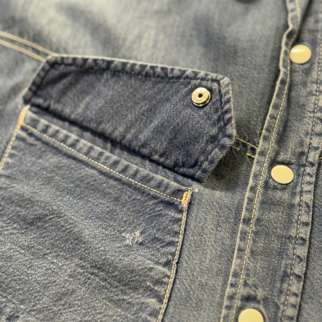 - 全体的に着用感、画像の様に袖部分にリペア、ポケット部分のスナップボタンの破損が見られます。