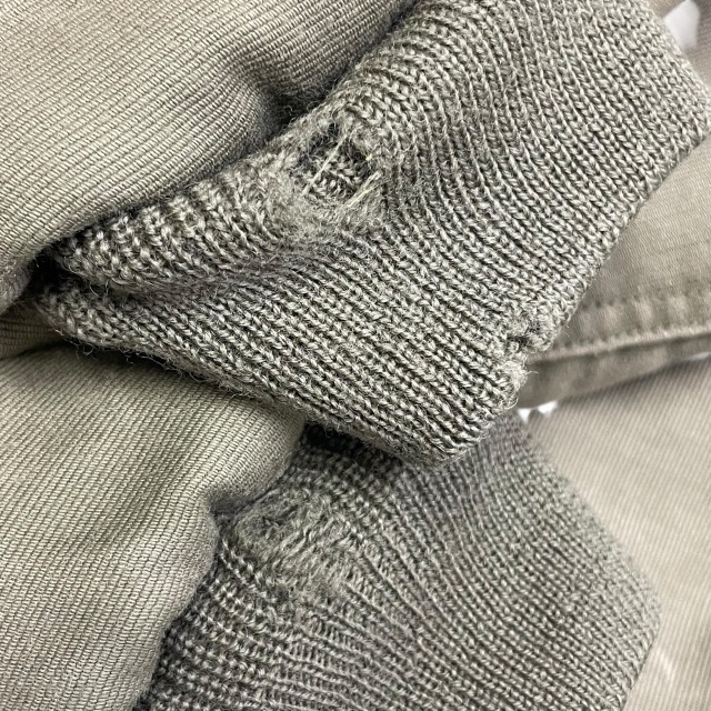 襟のボアにハゲがあり、袖リブ部分に穴等のダメージがございます。